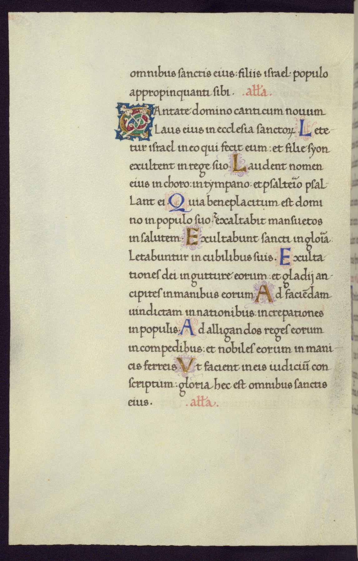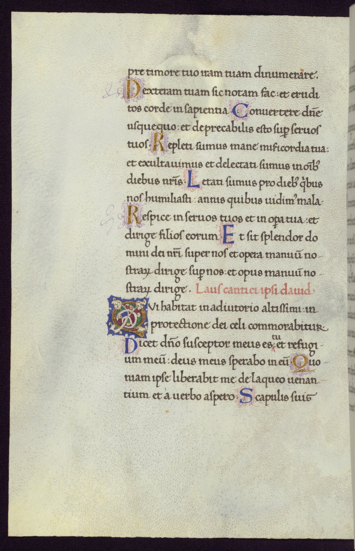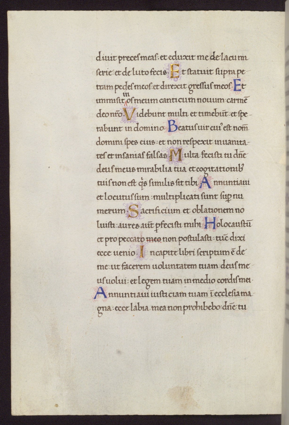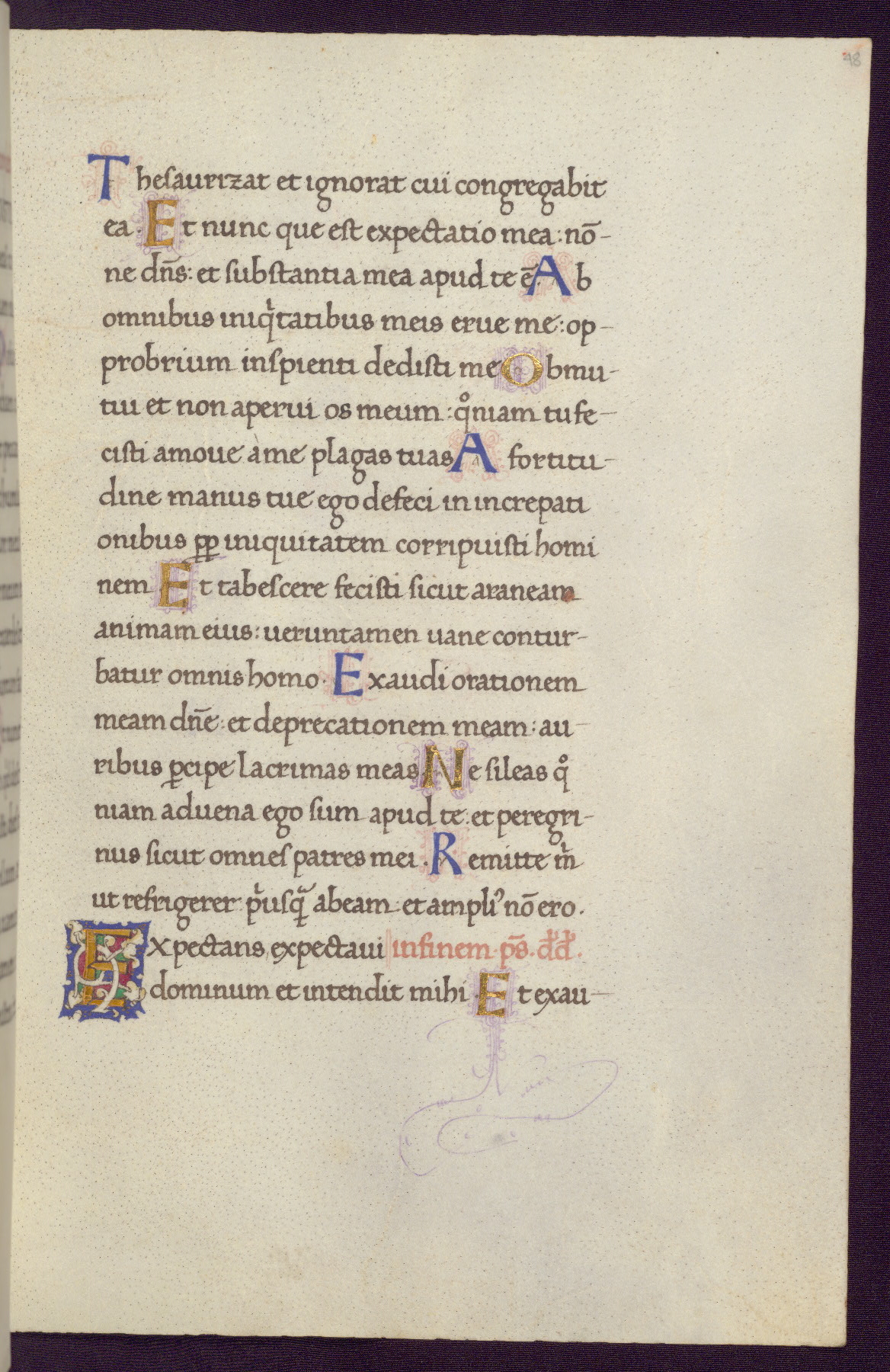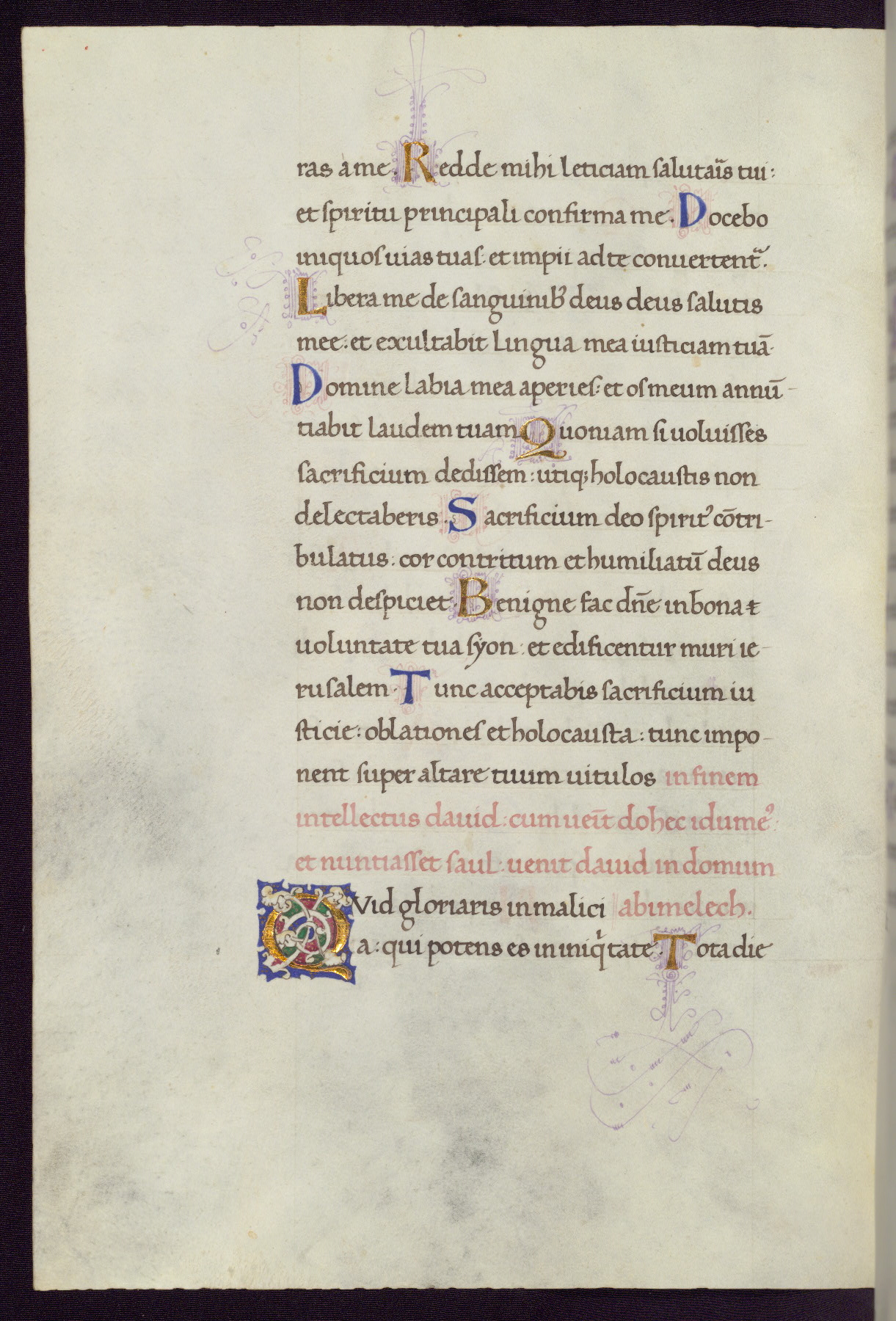 This Psalter was created in Southern Italy, likely Naples, in the last quarter of the fifteenth century. The litany (fols. 158v - 161r) suggests it was for Cistercian use. It contains six high-quality miniatures attributed to the Neopolitan illuminator Cristoforo Magorana (though the historiated initial of David playing a psaltry on fol. 15r may have been done by another hand), who from 1480-1492 worked at the court of Ferdinand I of Aragon. To date, almost forty manuscripts have been attributed to the artist. The Walters manuscript contains two full-page miniatures, one showing the Tree of Jesse and the other the Man of Sorrows. The Tree of Jesse (described in Isaiah 1:11) shows the ancestry of Christ rising from Jesse of Bethlehem, the father of King David who is depicted on the facing folio (171r). In this depiction Jesse is shown on the trunk of the tree, but it actually rises from Abraham. Surrounding Abraham is a crowd of Prophets each with scrolls with verses believed to prophecy the coming of Christ. The miniature with the Man of Sorrows shows Christ standing in his tomb and surrounded by the objects associated with the Passion (arma Christi). The miniature follows a specific Man of Sorrows iconography that originated in an early-fourteenth century mosaic icon from Constantinople that most likely arrived in Italy ca. 1380. The mosaic panel was believed to be an authentic representation of St. Gregory's vision of Christ as the Man of Sorrows, and this type of image encouraged the viewer to meditate on the suffering of Christ while reading the Passion narratives that follow. The humanist script and white-vine initials place the Walters Psalter firmly within the Humanist tradition of the late fifteenth century. Remnants of black velvet suggest this book once had a chemise binding, comparable to W.294 and W.480. Peter Kidd has suggested that the manuscript may have been written by Pietro Ursuleo of Capua (d. 1483).