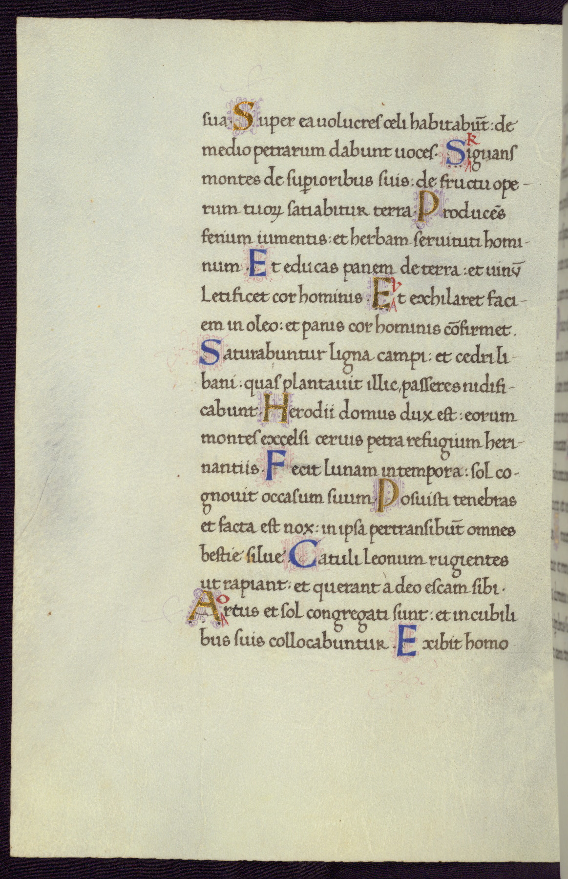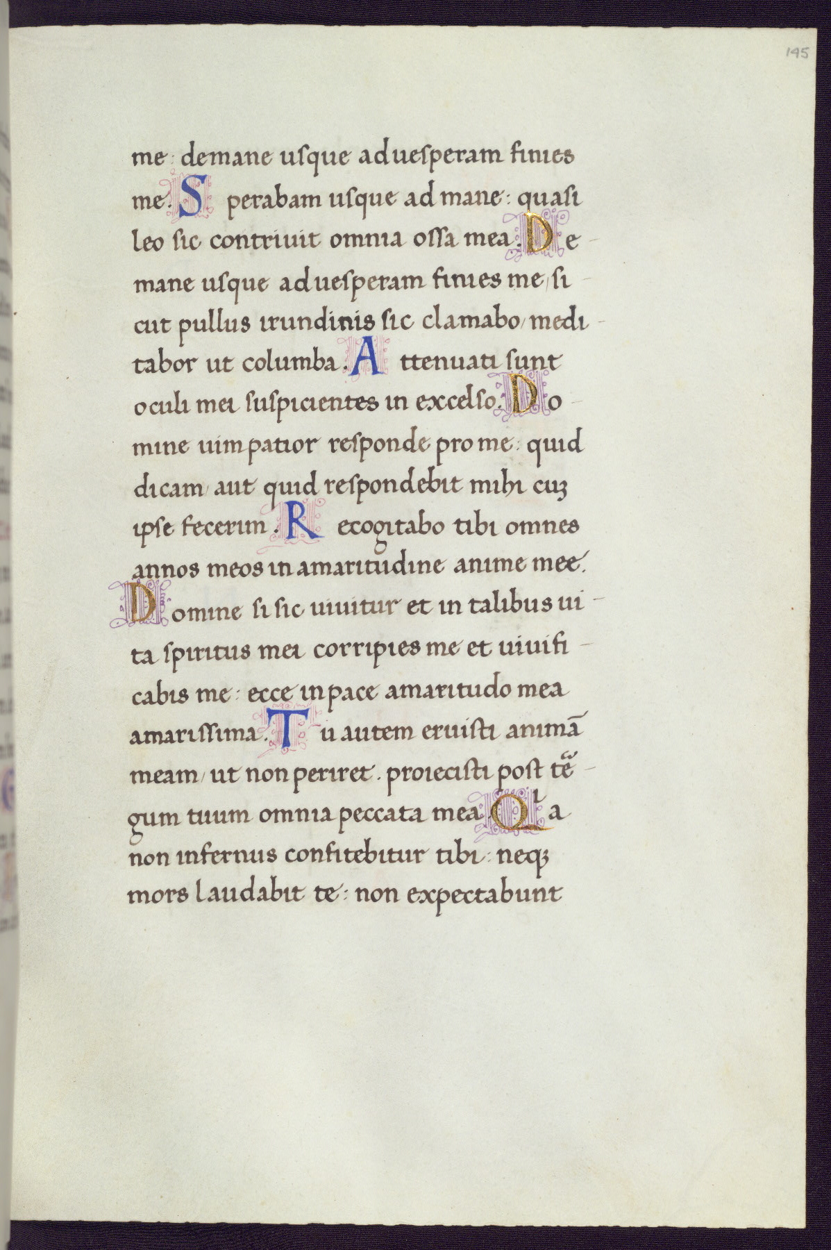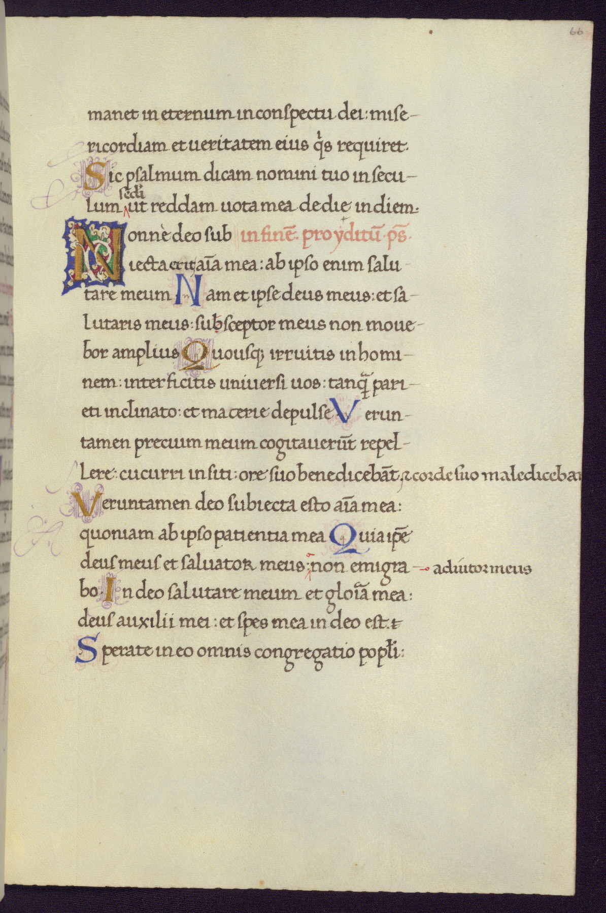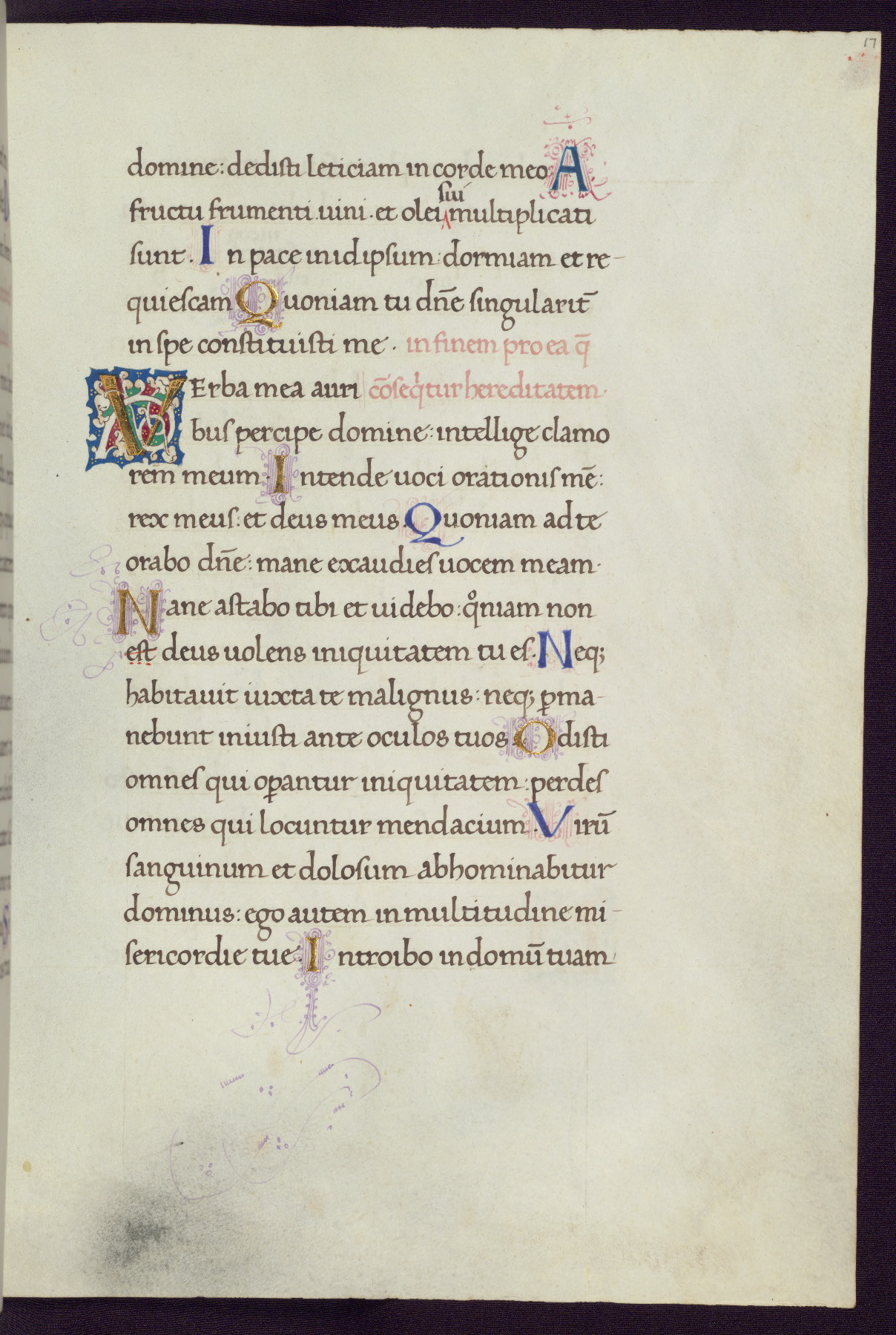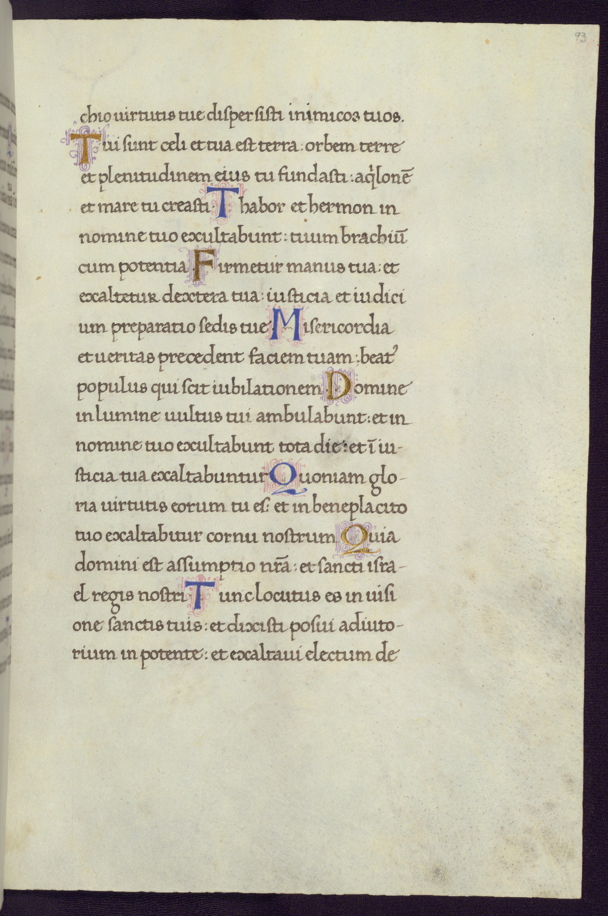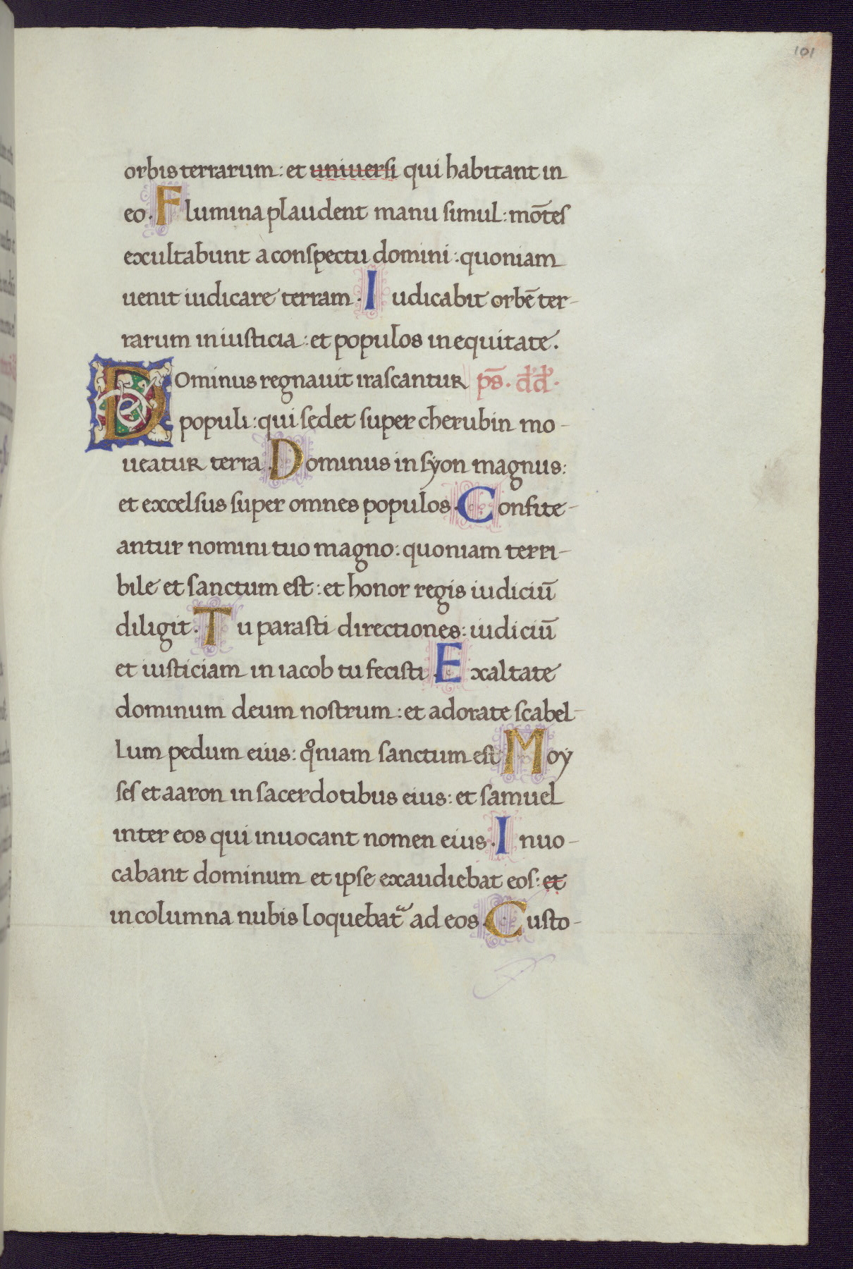 This Psalter was created in Southern Italy, likely Naples, in the last quarter of the fifteenth century. The litany (fols. 158v - 161r) suggests it was for Cistercian use. It contains six high-quality miniatures attributed to the Neopolitan illuminator Cristoforo Magorana (though the historiated initial of David playing a psaltry on fol. 15r may have been done by another hand), who from 1480-1492 worked at the court of Ferdinand I of Aragon. To date, almost forty manuscripts have been attributed to the artist. The Walters manuscript contains two full-page miniatures, one showing the Tree of Jesse and the other the Man of Sorrows. The Tree of Jesse (described in Isaiah 1:11) shows the ancestry of Christ rising from Jesse of Bethlehem, the father of King David who is depicted on the facing folio (171r). In this depiction Jesse is shown on the trunk of the tree, but it actually rises from Abraham. Surrounding Abraham is a crowd of Prophets each with scrolls with verses believed to prophecy the coming of Christ. The miniature with the Man of Sorrows shows Christ standing in his tomb and surrounded by the objects associated with the Passion (arma Christi). The miniature follows a specific Man of Sorrows iconography that originated in an early-fourteenth century mosaic icon from Constantinople that most likely arrived in Italy ca. 1380. The mosaic panel was believed to be an authentic representation of St. Gregory's vision of Christ as the Man of Sorrows, and this type of image encouraged the viewer to meditate on the suffering of Christ while reading the Passion narratives that follow. The humanist script and white-vine initials place the Walters Psalter firmly within the Humanist tradition of the late fifteenth century. Remnants of black velvet suggest this book once had a chemise binding, comparable to W.294 and W.480. Peter Kidd has suggested that the manuscript may have been written by Pietro Ursuleo of Capua (d. 1483).