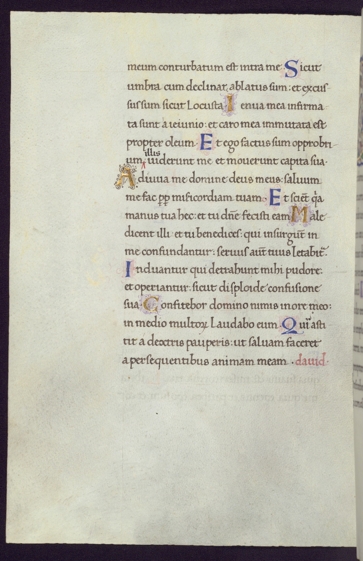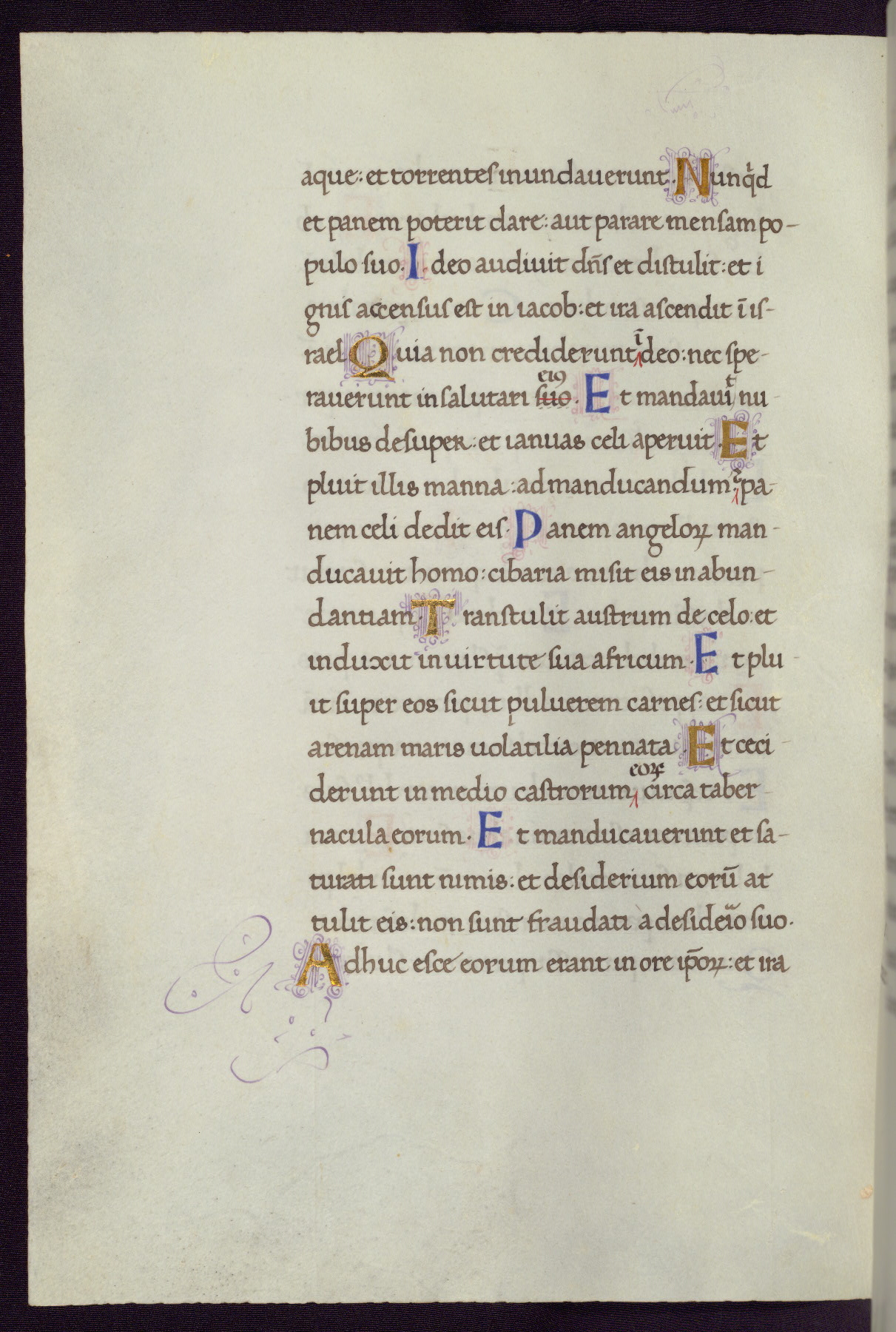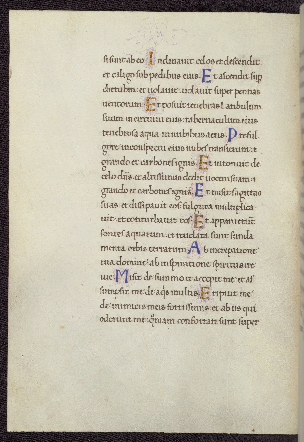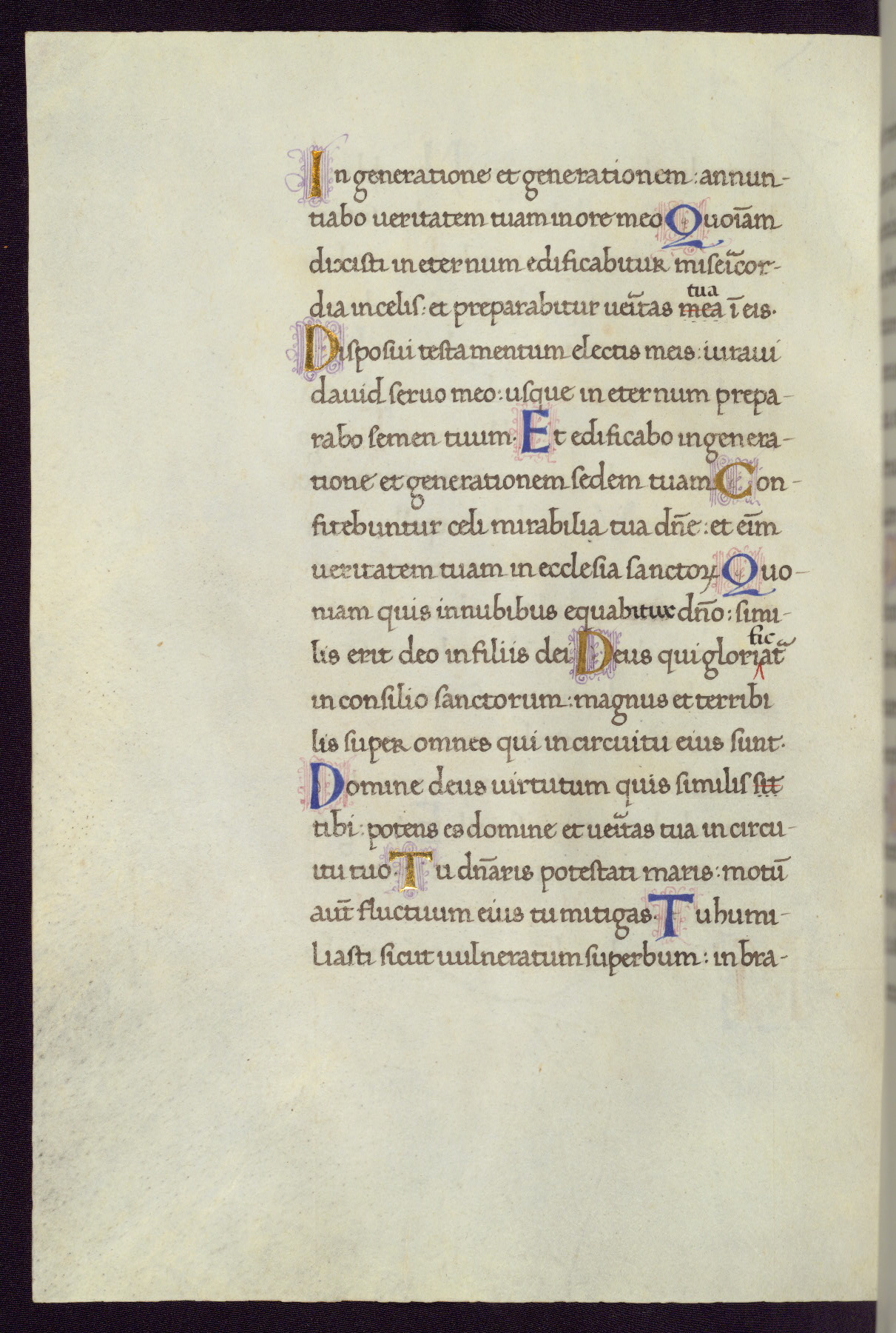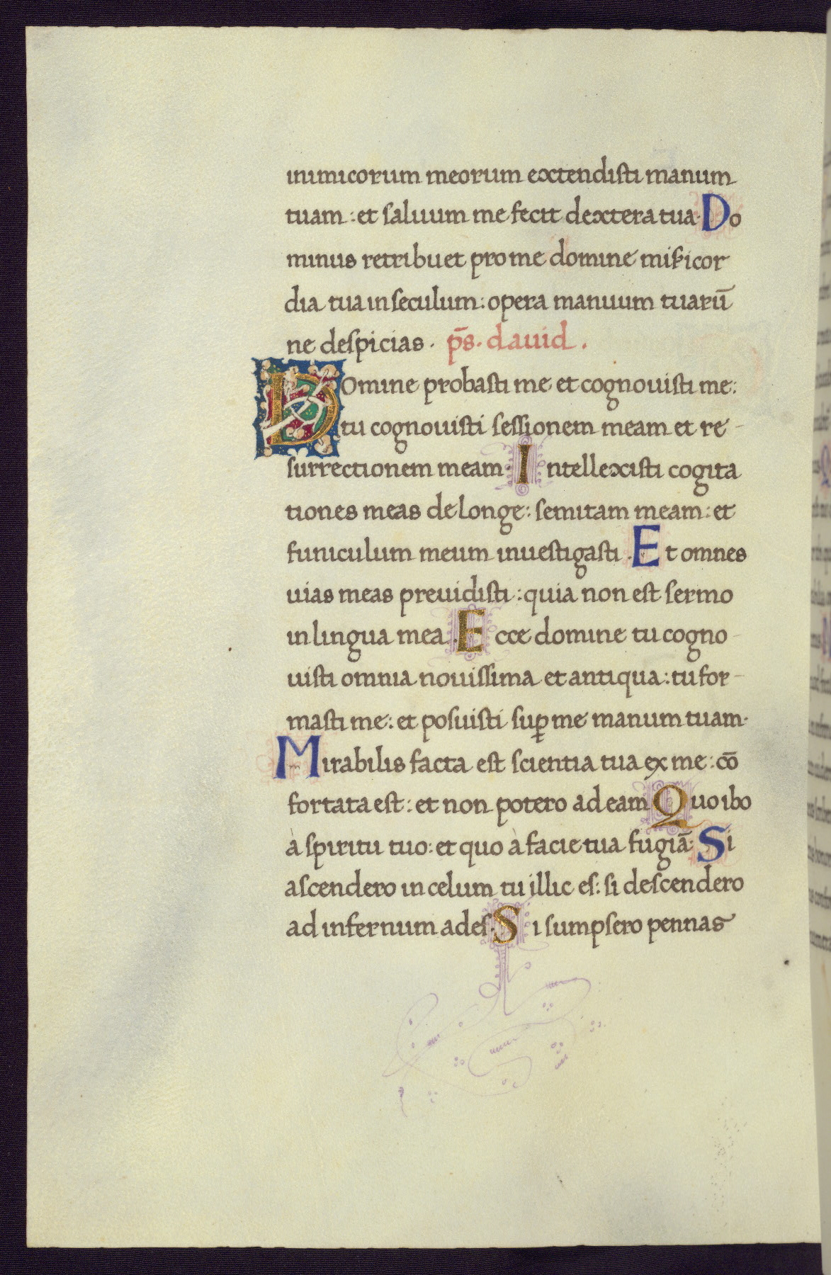 This Psalter was created in Southern Italy, likely Naples, in the last quarter of the fifteenth century. The litany (fols. 158v - 161r) suggests it was for Cistercian use. It contains six high-quality miniatures attributed to the Neopolitan illuminator Cristoforo Magorana (though the historiated initial of David playing a psaltry on fol. 15r may have been done by another hand), who from 1480-1492 worked at the court of Ferdinand I of Aragon. To date, almost forty manuscripts have been attributed to the artist. The Walters manuscript contains two full-page miniatures, one showing the Tree of Jesse and the other the Man of Sorrows. The Tree of Jesse (described in Isaiah 1:11) shows the ancestry of Christ rising from Jesse of Bethlehem, the father of King David who is depicted on the facing folio (171r). In this depiction Jesse is shown on the trunk of the tree, but it actually rises from Abraham. Surrounding Abraham is a crowd of Prophets each with scrolls with verses believed to prophecy the coming of Christ. The miniature with the Man of Sorrows shows Christ standing in his tomb and surrounded by the objects associated with the Passion (arma Christi). The miniature follows a specific Man of Sorrows iconography that originated in an early-fourteenth century mosaic icon from Constantinople that most likely arrived in Italy ca. 1380. The mosaic panel was believed to be an authentic representation of St. Gregory's vision of Christ as the Man of Sorrows, and this type of image encouraged the viewer to meditate on the suffering of Christ while reading the Passion narratives that follow. The humanist script and white-vine initials place the Walters Psalter firmly within the Humanist tradition of the late fifteenth century. Remnants of black velvet suggest this book once had a chemise binding, comparable to W.294 and W.480. Peter Kidd has suggested that the manuscript may have been written by Pietro Ursuleo of Capua (d. 1483).