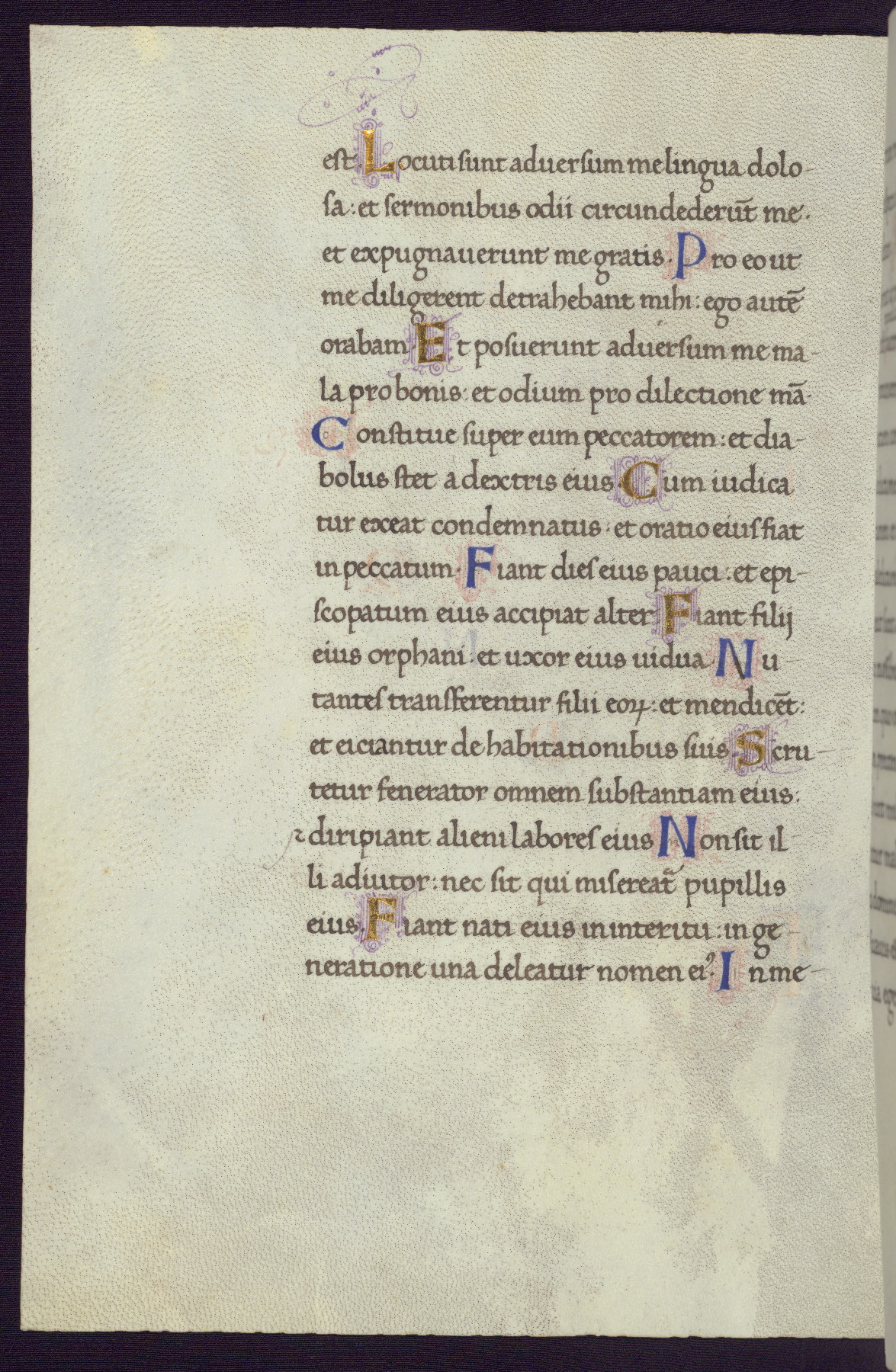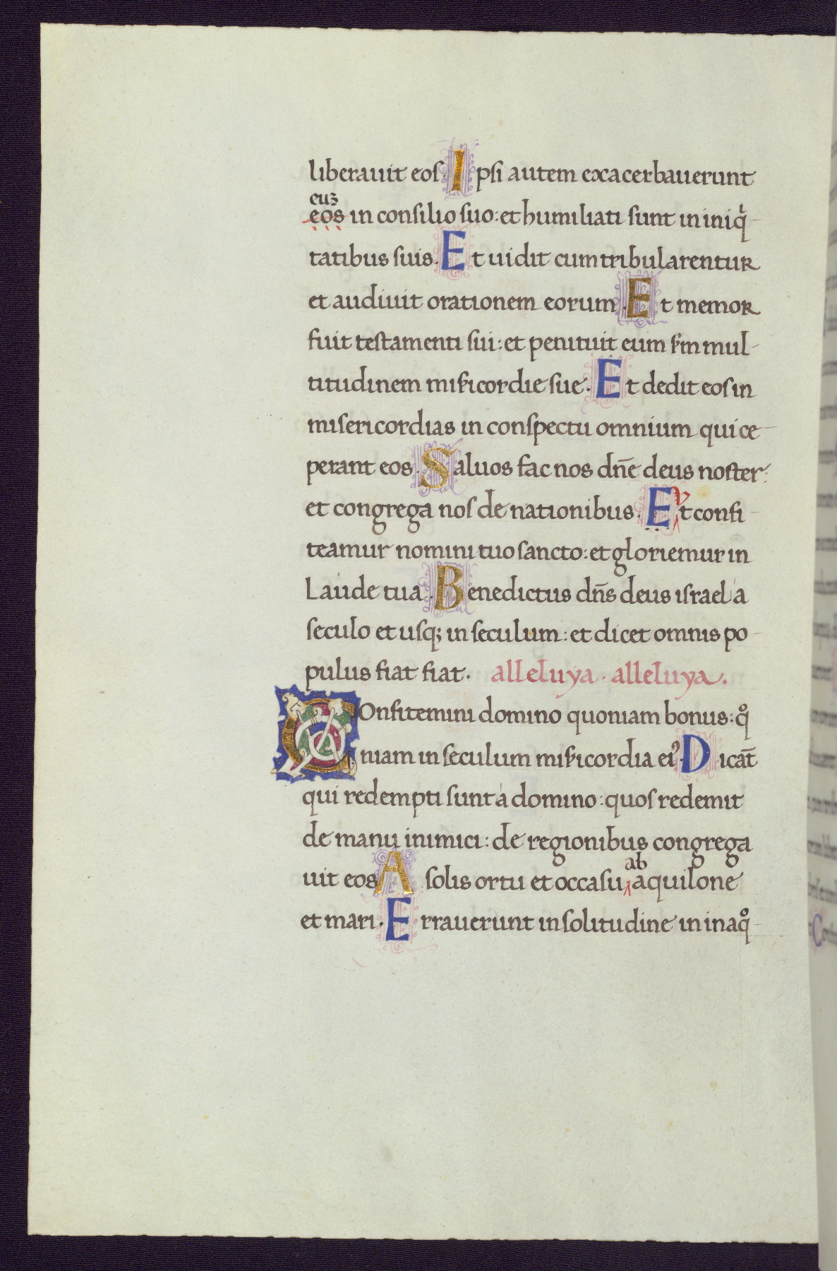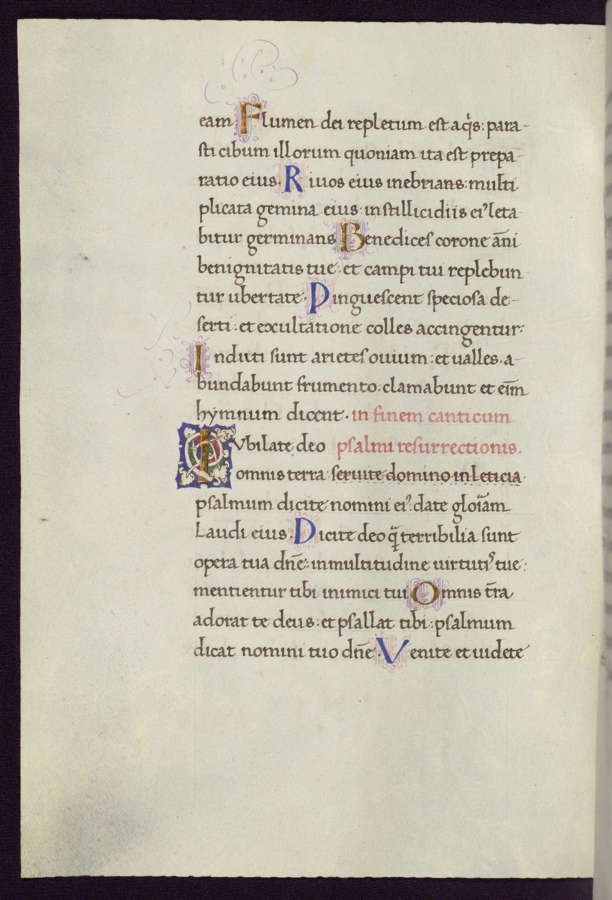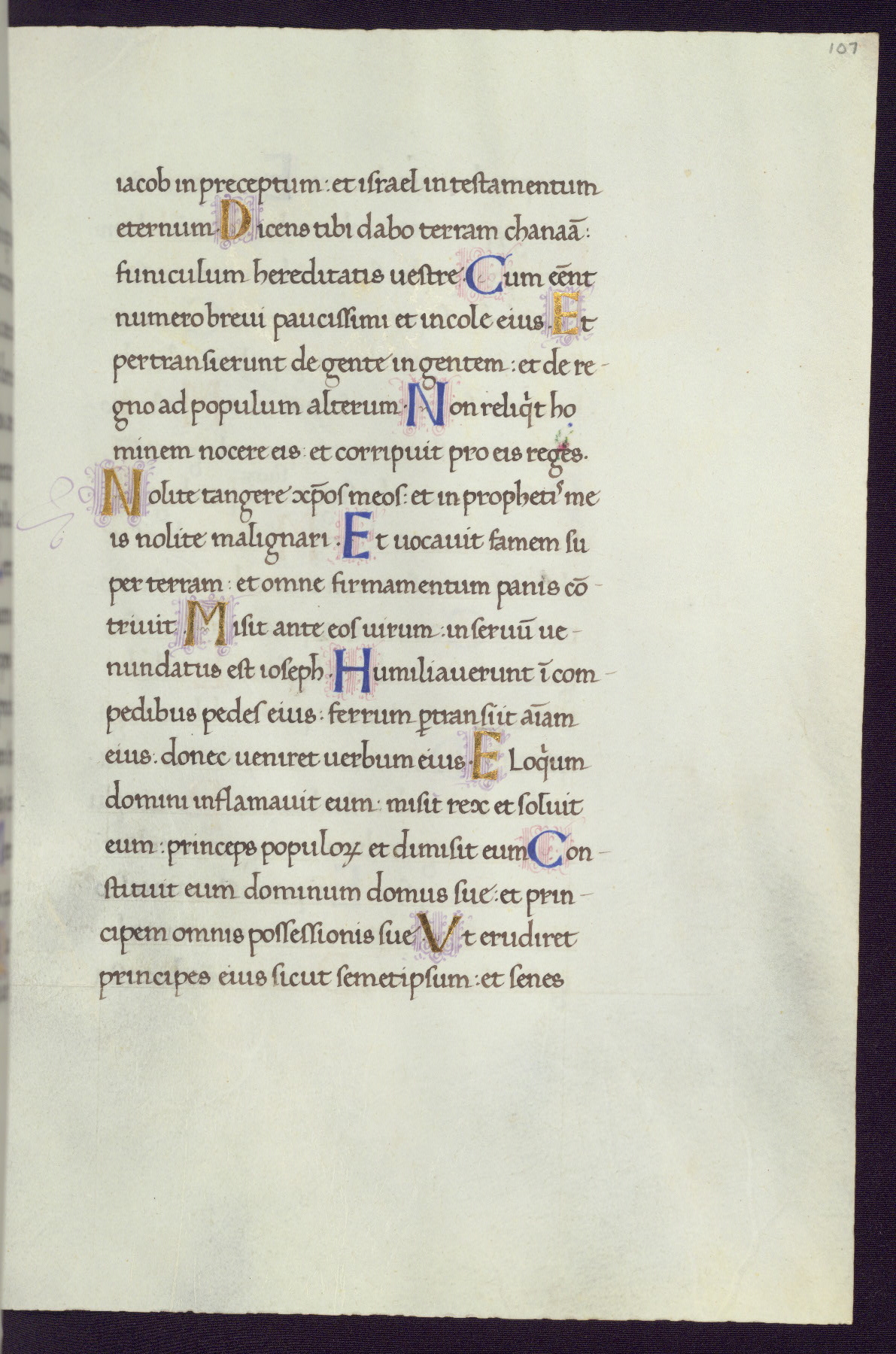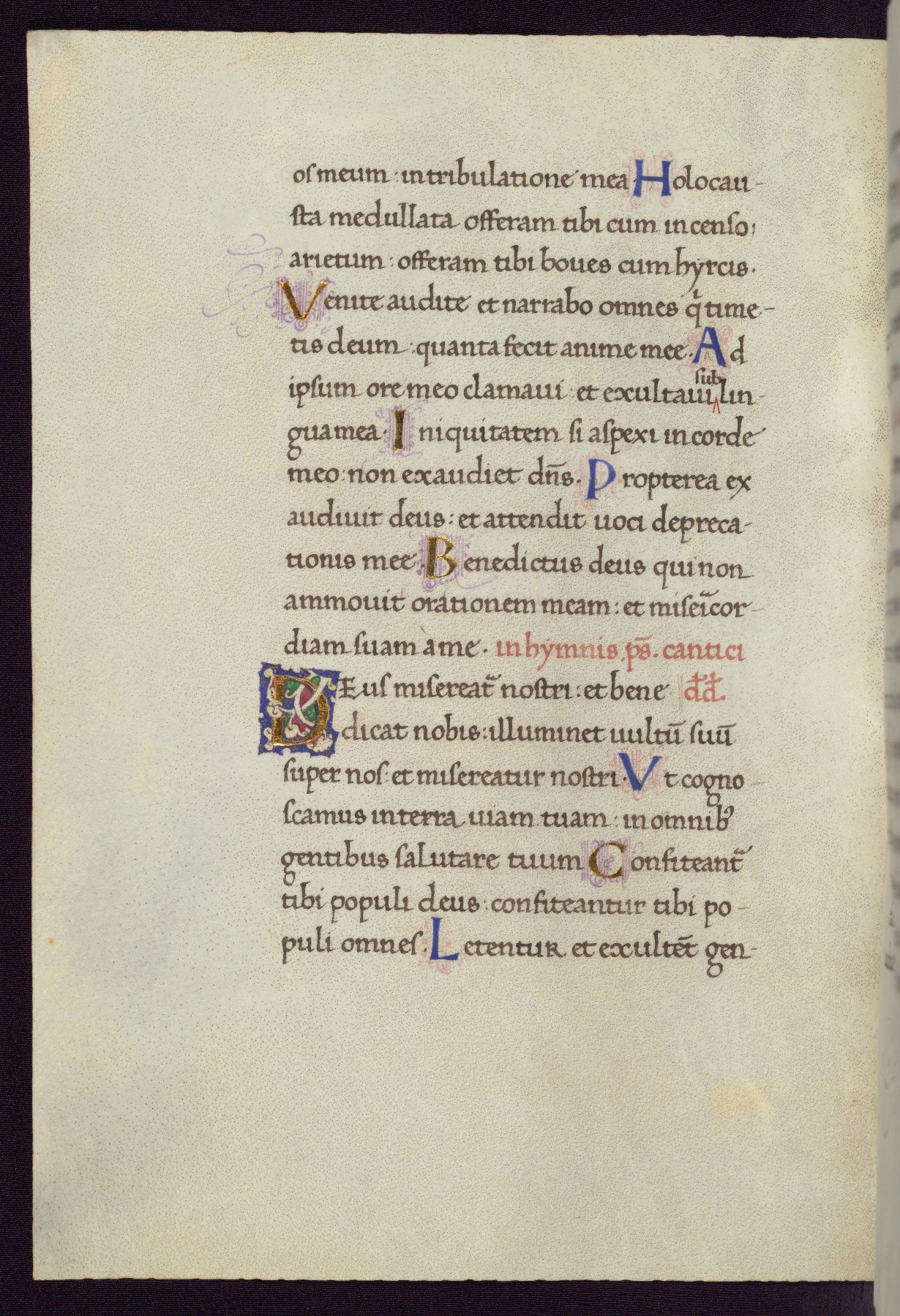 This Psalter was created in Southern Italy, likely Naples, in the last quarter of the fifteenth century. The litany (fols. 158v - 161r) suggests it was for Cistercian use. It contains six high-quality miniatures attributed to the Neopolitan illuminator Cristoforo Magorana (though the historiated initial of David playing a psaltry on fol. 15r may have been done by another hand), who from 1480-1492 worked at the court of Ferdinand I of Aragon. To date, almost forty manuscripts have been attributed to the artist. The Walters manuscript contains two full-page miniatures, one showing the Tree of Jesse and the other the Man of Sorrows. The Tree of Jesse (described in Isaiah 1:11) shows the ancestry of Christ rising from Jesse of Bethlehem, the father of King David who is depicted on the facing folio (171r). In this depiction Jesse is shown on the trunk of the tree, but it actually rises from Abraham. Surrounding Abraham is a crowd of Prophets each with scrolls with verses believed to prophecy the coming of Christ. The miniature with the Man of Sorrows shows Christ standing in his tomb and surrounded by the objects associated with the Passion (arma Christi). The miniature follows a specific Man of Sorrows iconography that originated in an early-fourteenth century mosaic icon from Constantinople that most likely arrived in Italy ca. 1380. The mosaic panel was believed to be an authentic representation of St. Gregory's vision of Christ as the Man of Sorrows, and this type of image encouraged the viewer to meditate on the suffering of Christ while reading the Passion narratives that follow. The humanist script and white-vine initials place the Walters Psalter firmly within the Humanist tradition of the late fifteenth century. Remnants of black velvet suggest this book once had a chemise binding, comparable to W.294 and W.480. Peter Kidd has suggested that the manuscript may have been written by Pietro Ursuleo of Capua (d. 1483).