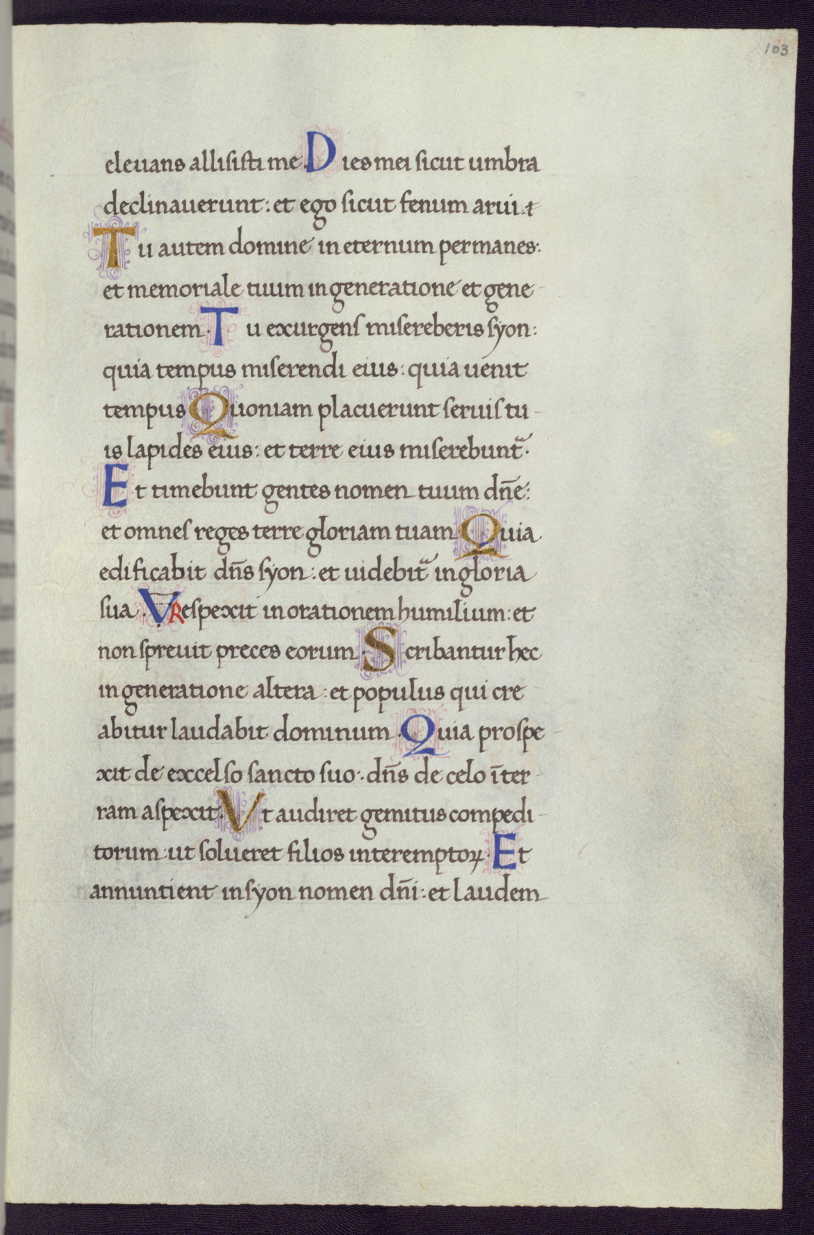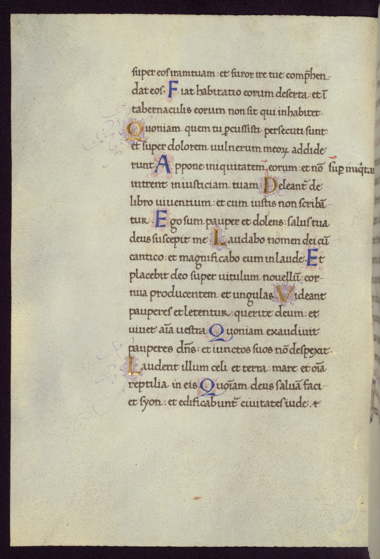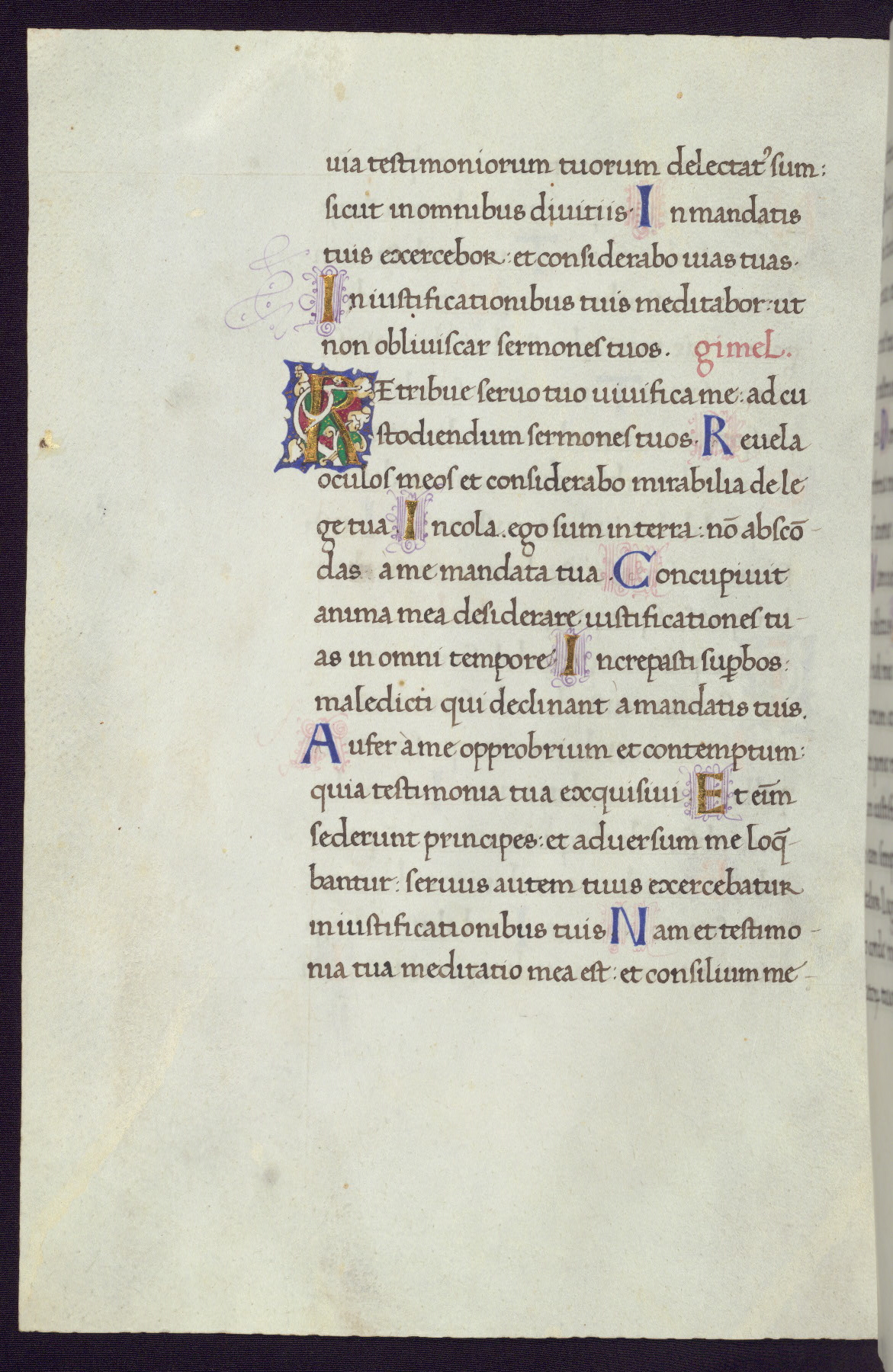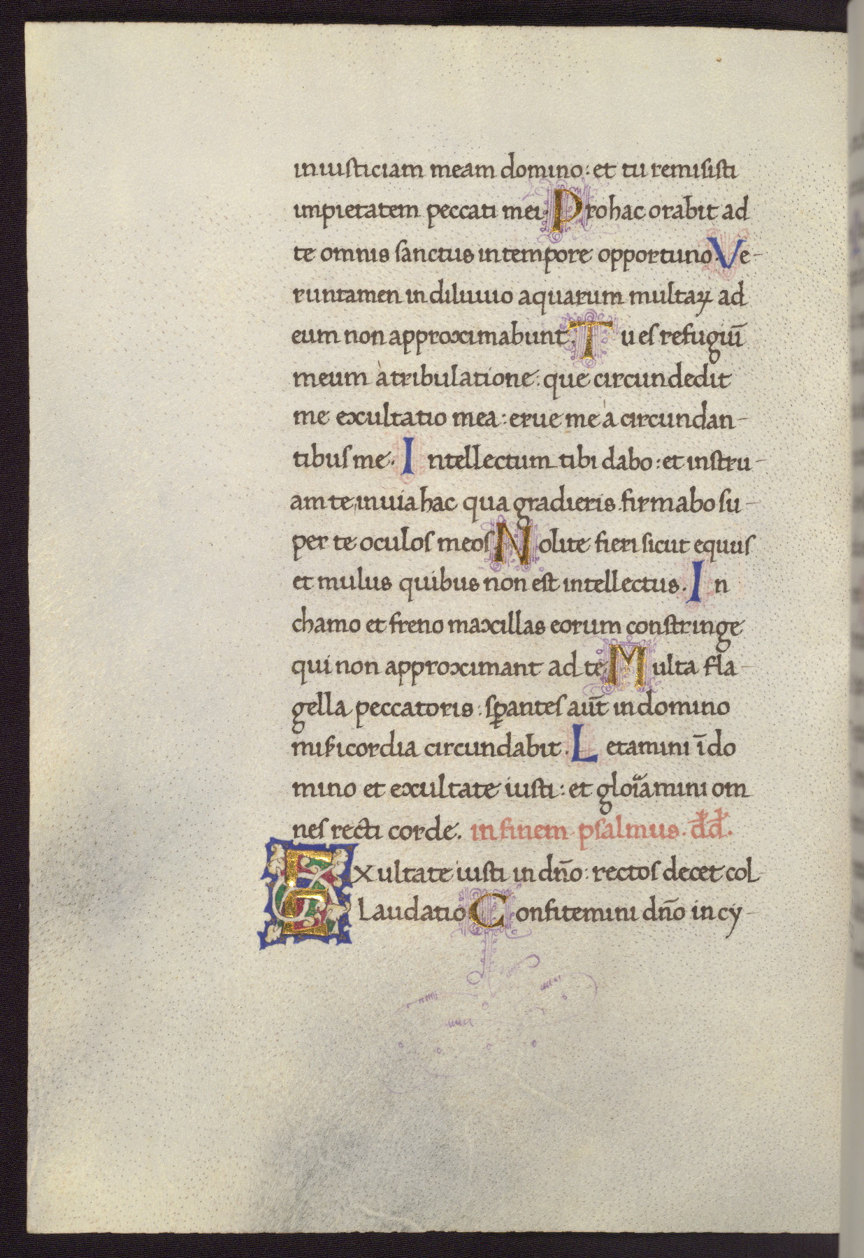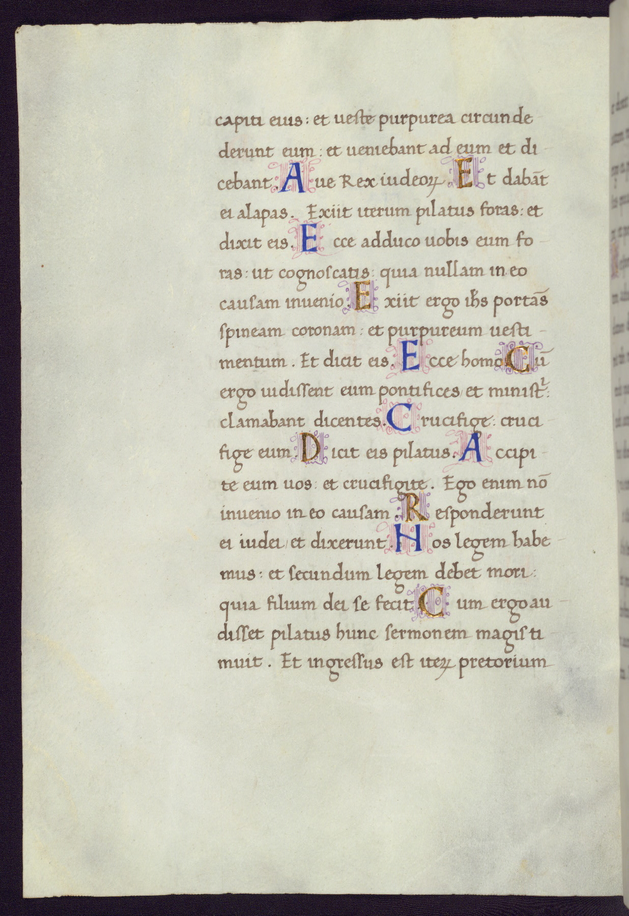 This Psalter was created in Southern Italy, likely Naples, in the last quarter of the fifteenth century. The litany (fols. 158v - 161r) suggests it was for Cistercian use. It contains six high-quality miniatures attributed to the Neopolitan illuminator Cristoforo Magorana (though the historiated initial of David playing a psaltry on fol. 15r may have been done by another hand), who from 1480-1492 worked at the court of Ferdinand I of Aragon. To date, almost forty manuscripts have been attributed to the artist. The Walters manuscript contains two full-page miniatures, one showing the Tree of Jesse and the other the Man of Sorrows. The Tree of Jesse (described in Isaiah 1:11) shows the ancestry of Christ rising from Jesse of Bethlehem, the father of King David who is depicted on the facing folio (171r). In this depiction Jesse is shown on the trunk of the tree, but it actually rises from Abraham. Surrounding Abraham is a crowd of Prophets each with scrolls with verses believed to prophecy the coming of Christ. The miniature with the Man of Sorrows shows Christ standing in his tomb and surrounded by the objects associated with the Passion (arma Christi). The miniature follows a specific Man of Sorrows iconography that originated in an early-fourteenth century mosaic icon from Constantinople that most likely arrived in Italy ca. 1380. The mosaic panel was believed to be an authentic representation of St. Gregory's vision of Christ as the Man of Sorrows, and this type of image encouraged the viewer to meditate on the suffering of Christ while reading the Passion narratives that follow. The humanist script and white-vine initials place the Walters Psalter firmly within the Humanist tradition of the late fifteenth century. Remnants of black velvet suggest this book once had a chemise binding, comparable to W.294 and W.480. Peter Kidd has suggested that the manuscript may have been written by Pietro Ursuleo of Capua (d. 1483).