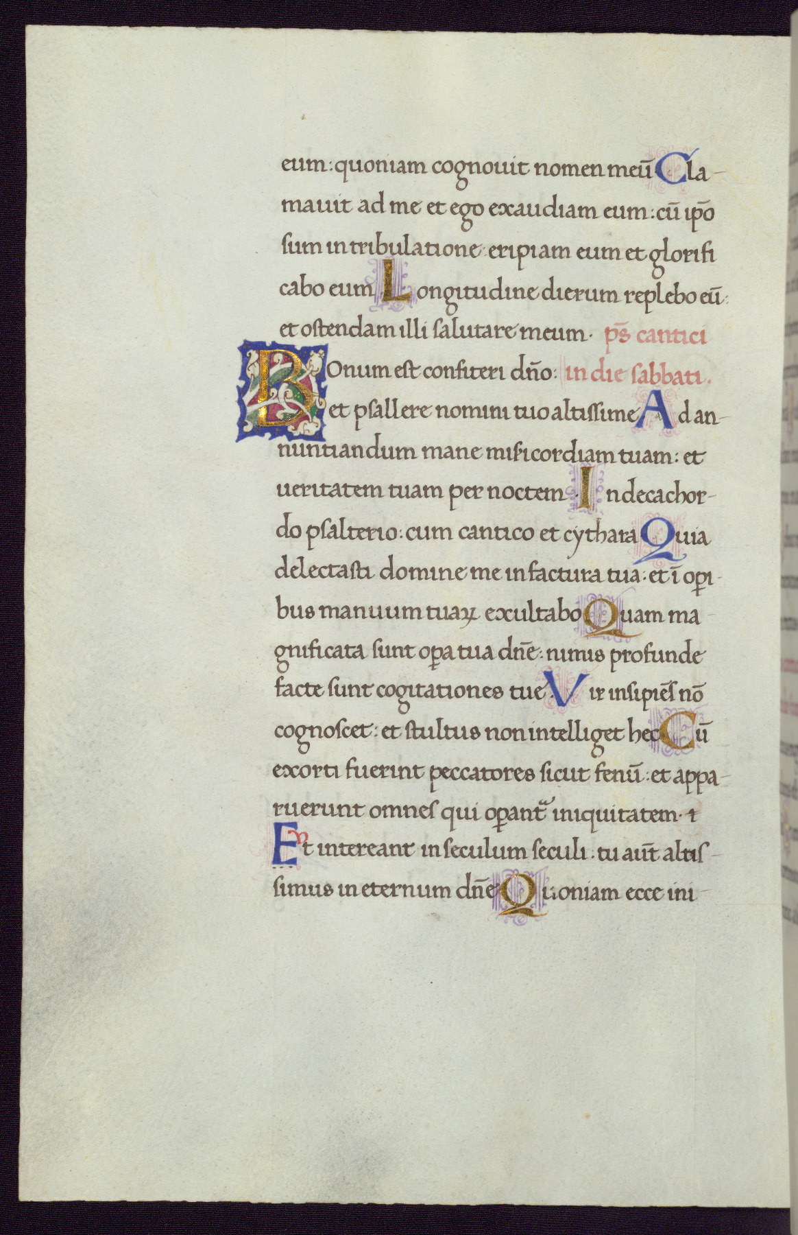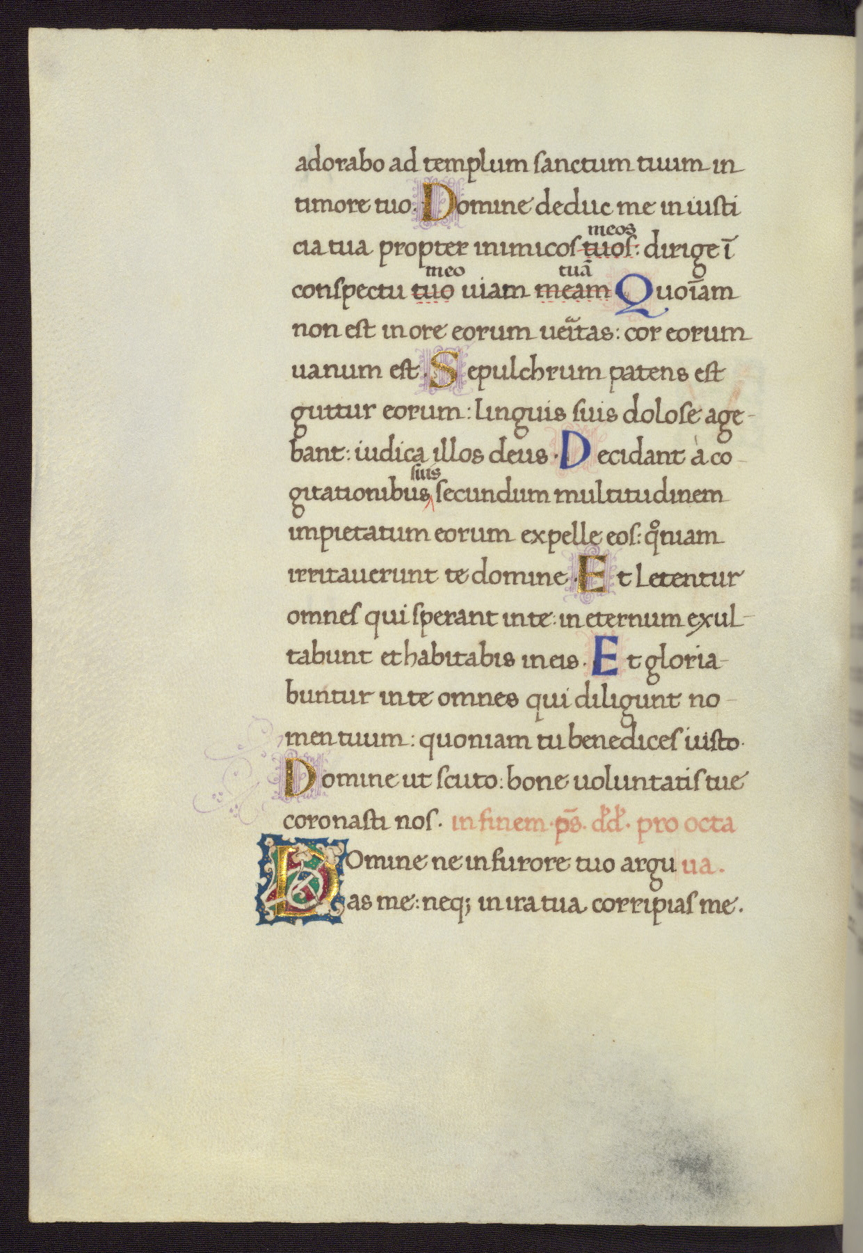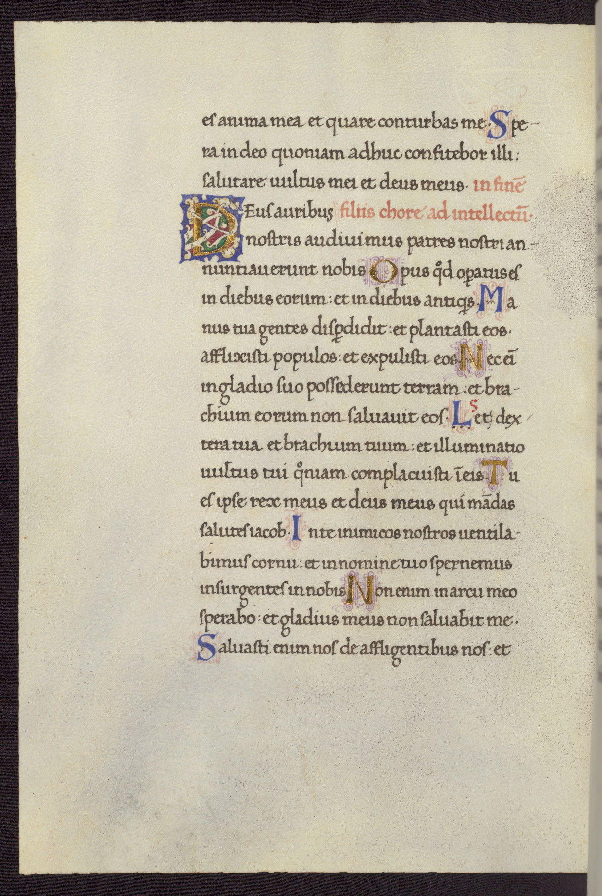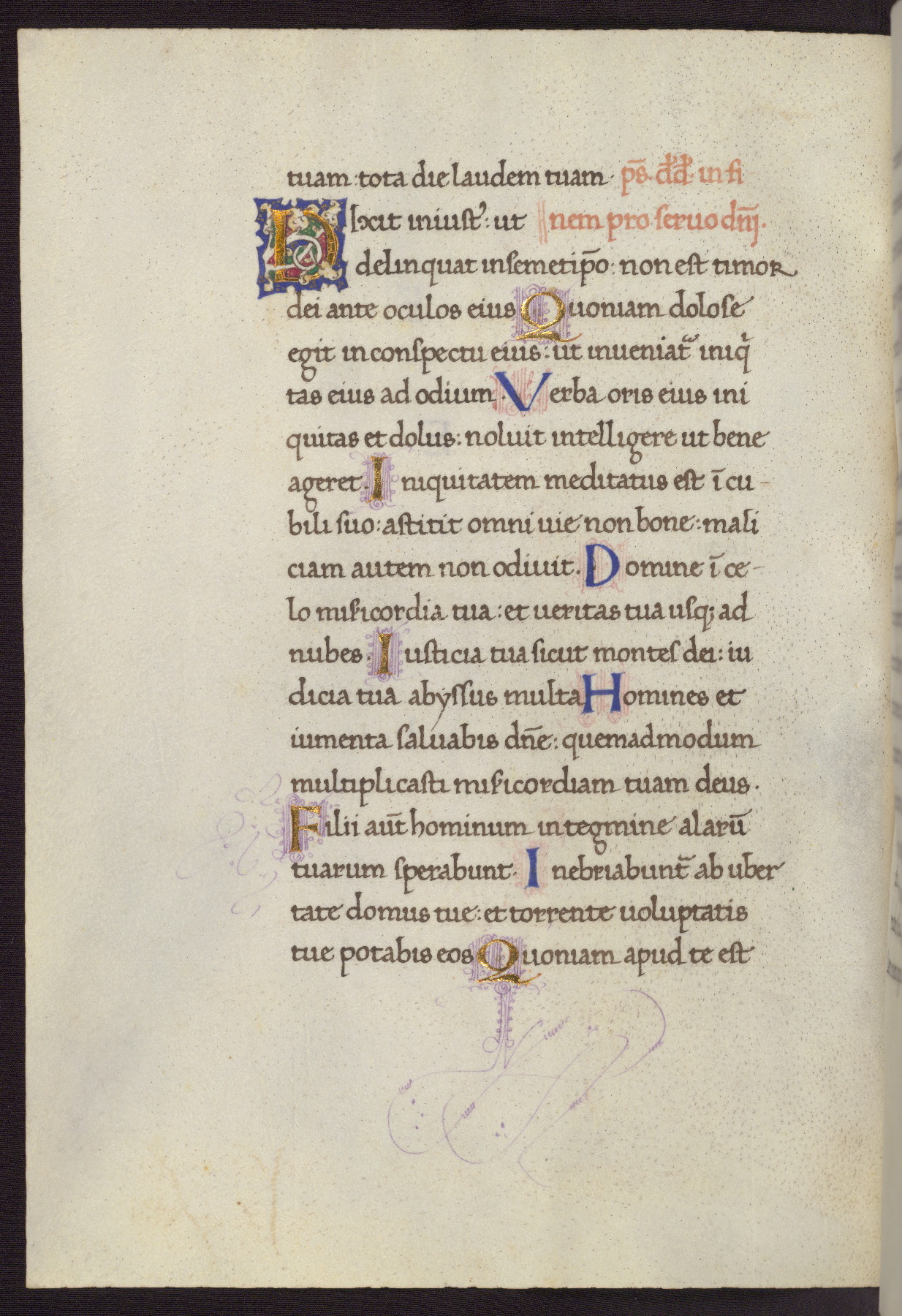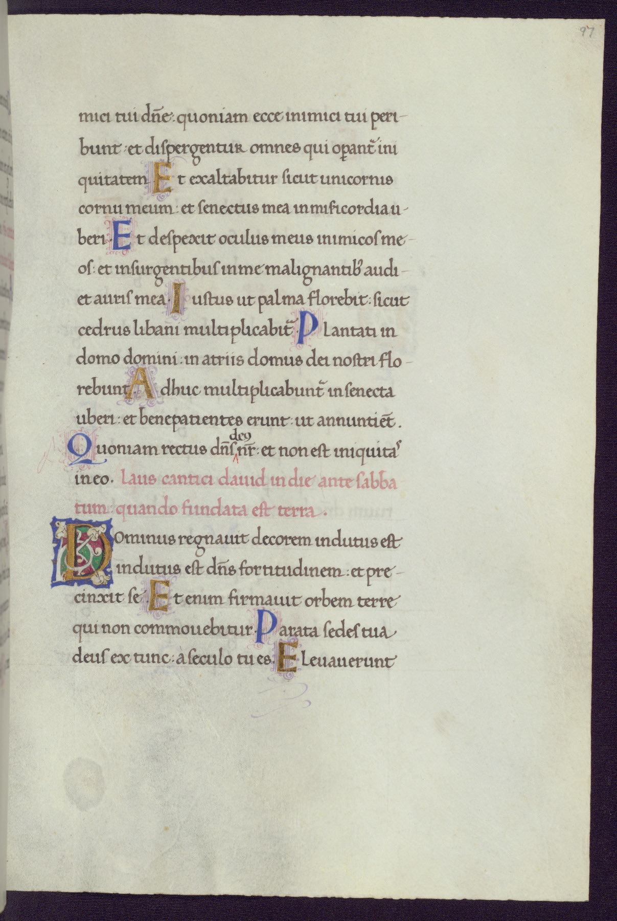 This Psalter was created in Southern Italy, likely Naples, in the last quarter of the fifteenth century. The litany (fols. 158v - 161r) suggests it was for Cistercian use. It contains six high-quality miniatures attributed to the Neopolitan illuminator Cristoforo Magorana (though the historiated initial of David playing a psaltry on fol. 15r may have been done by another hand), who from 1480-1492 worked at the court of Ferdinand I of Aragon. To date, almost forty manuscripts have been attributed to the artist. The Walters manuscript contains two full-page miniatures, one showing the Tree of Jesse and the other the Man of Sorrows. The Tree of Jesse (described in Isaiah 1:11) shows the ancestry of Christ rising from Jesse of Bethlehem, the father of King David who is depicted on the facing folio (171r). In this depiction Jesse is shown on the trunk of the tree, but it actually rises from Abraham. Surrounding Abraham is a crowd of Prophets each with scrolls with verses believed to prophecy the coming of Christ. The miniature with the Man of Sorrows shows Christ standing in his tomb and surrounded by the objects associated with the Passion (arma Christi). The miniature follows a specific Man of Sorrows iconography that originated in an early-fourteenth century mosaic icon from Constantinople that most likely arrived in Italy ca. 1380. The mosaic panel was believed to be an authentic representation of St. Gregory's vision of Christ as the Man of Sorrows, and this type of image encouraged the viewer to meditate on the suffering of Christ while reading the Passion narratives that follow. The humanist script and white-vine initials place the Walters Psalter firmly within the Humanist tradition of the late fifteenth century. Remnants of black velvet suggest this book once had a chemise binding, comparable to W.294 and W.480. Peter Kidd has suggested that the manuscript may have been written by Pietro Ursuleo of Capua (d. 1483).
