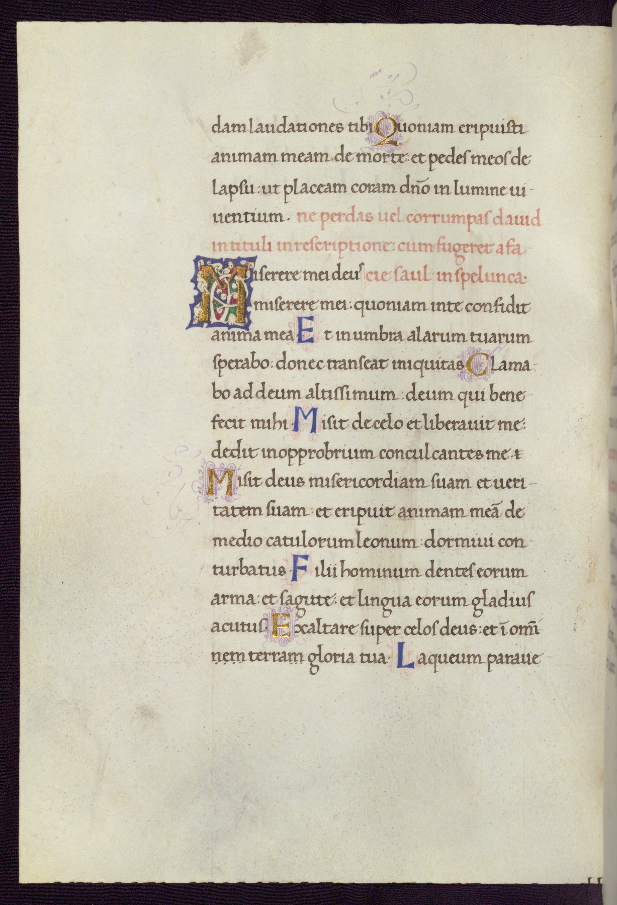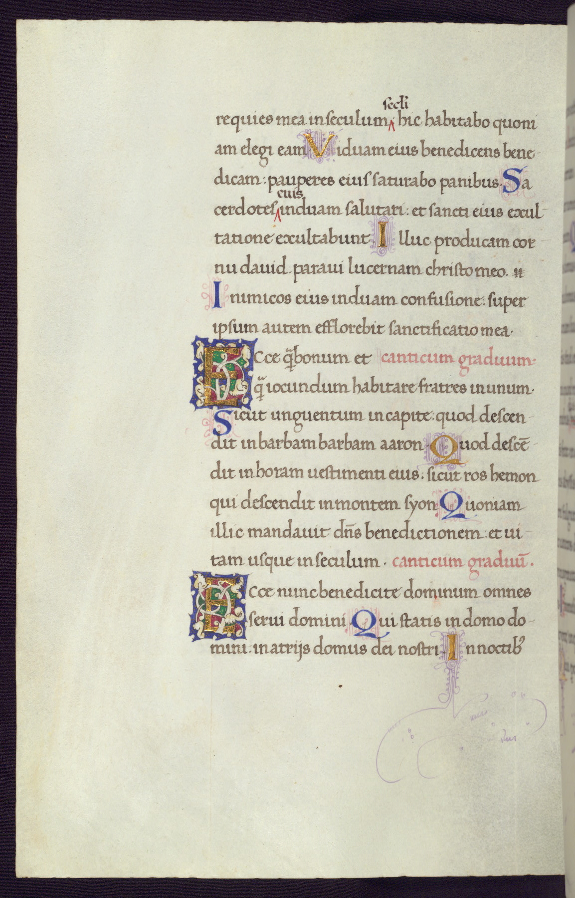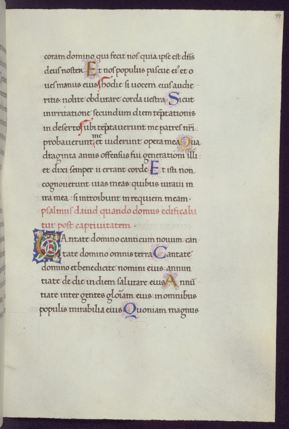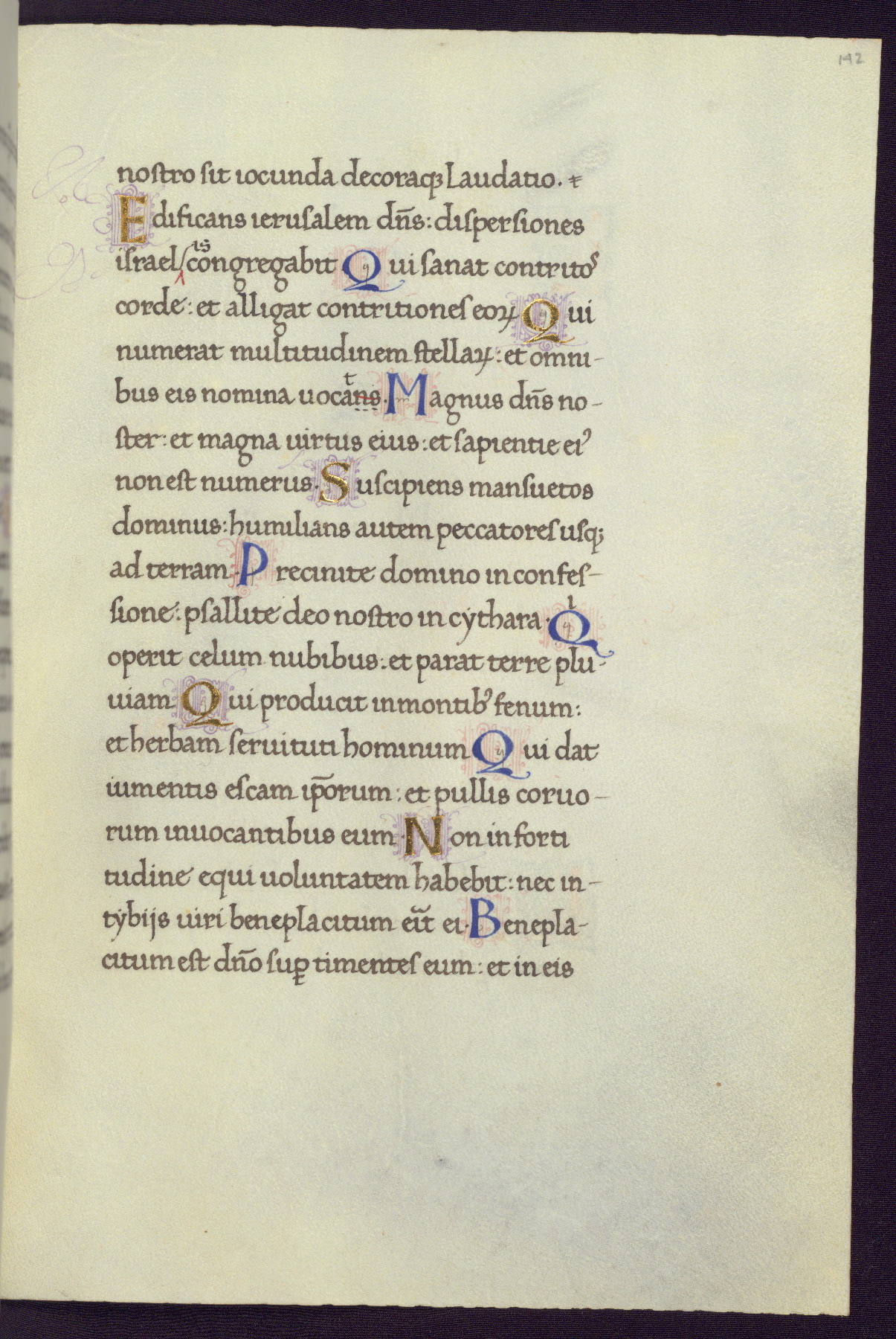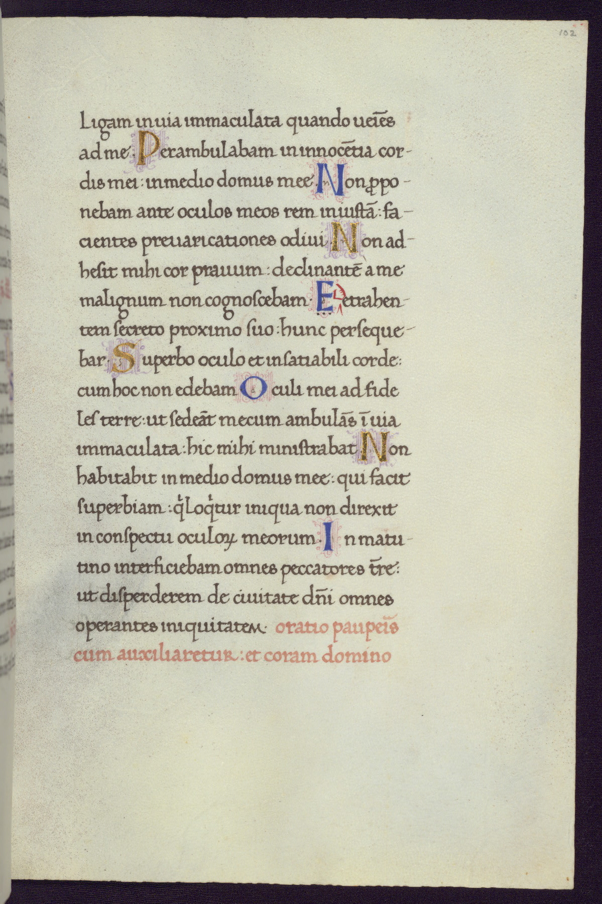 This Psalter was created in Southern Italy, likely Naples, in the last quarter of the fifteenth century. The litany (fols. 158v - 161r) suggests it was for Cistercian use. It contains six high-quality miniatures attributed to the Neopolitan illuminator Cristoforo Magorana (though the historiated initial of David playing a psaltry on fol. 15r may have been done by another hand), who from 1480-1492 worked at the court of Ferdinand I of Aragon. To date, almost forty manuscripts have been attributed to the artist. The Walters manuscript contains two full-page miniatures, one showing the Tree of Jesse and the other the Man of Sorrows. The Tree of Jesse (described in Isaiah 1:11) shows the ancestry of Christ rising from Jesse of Bethlehem, the father of King David who is depicted on the facing folio (171r). In this depiction Jesse is shown on the trunk of the tree, but it actually rises from Abraham. Surrounding Abraham is a crowd of Prophets each with scrolls with verses believed to prophecy the coming of Christ. The miniature with the Man of Sorrows shows Christ standing in his tomb and surrounded by the objects associated with the Passion (arma Christi). The miniature follows a specific Man of Sorrows iconography that originated in an early-fourteenth century mosaic icon from Constantinople that most likely arrived in Italy ca. 1380. The mosaic panel was believed to be an authentic representation of St. Gregory's vision of Christ as the Man of Sorrows, and this type of image encouraged the viewer to meditate on the suffering of Christ while reading the Passion narratives that follow. The humanist script and white-vine initials place the Walters Psalter firmly within the Humanist tradition of the late fifteenth century. Remnants of black velvet suggest this book once had a chemise binding, comparable to W.294 and W.480. Peter Kidd has suggested that the manuscript may have been written by Pietro Ursuleo of Capua (d. 1483).