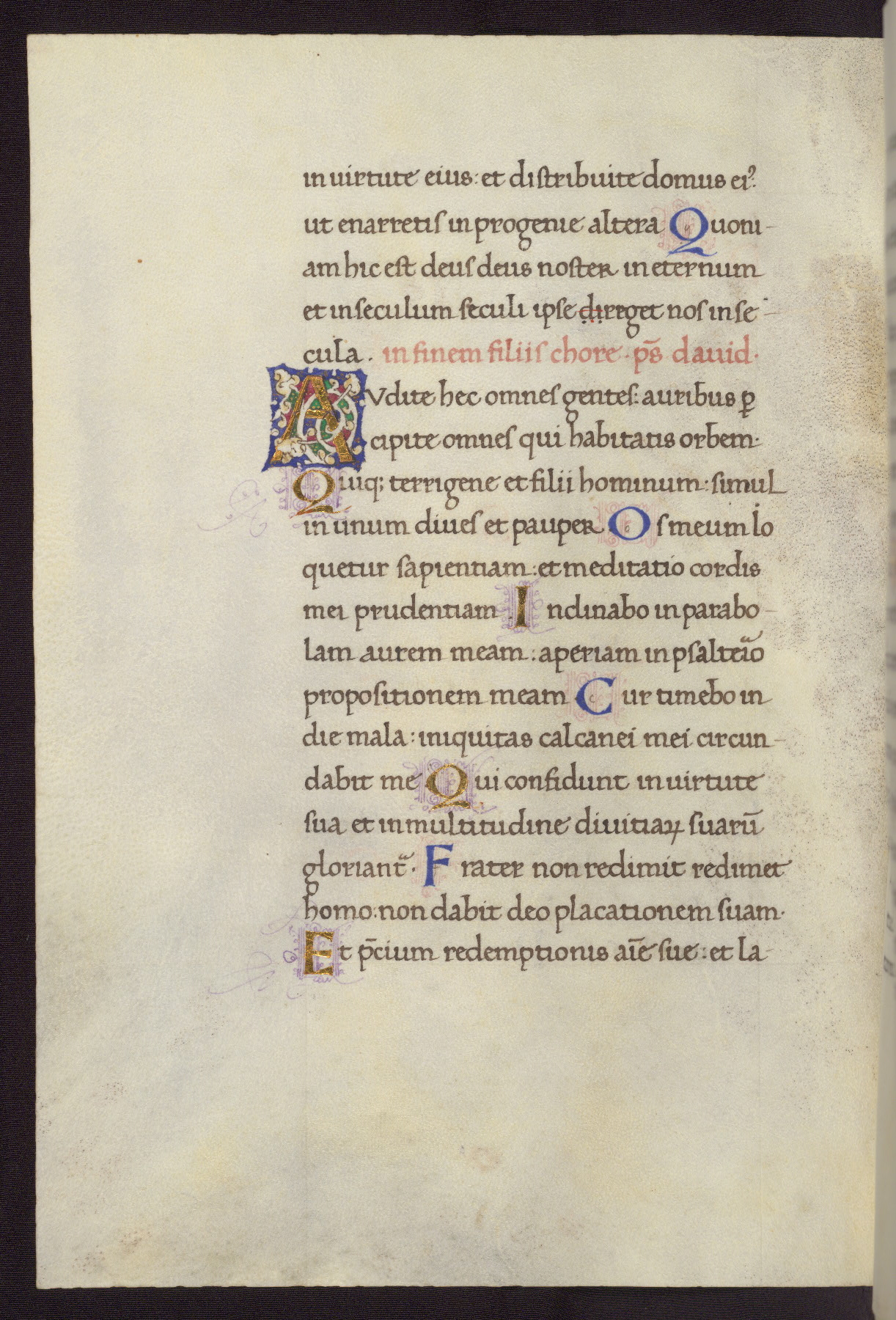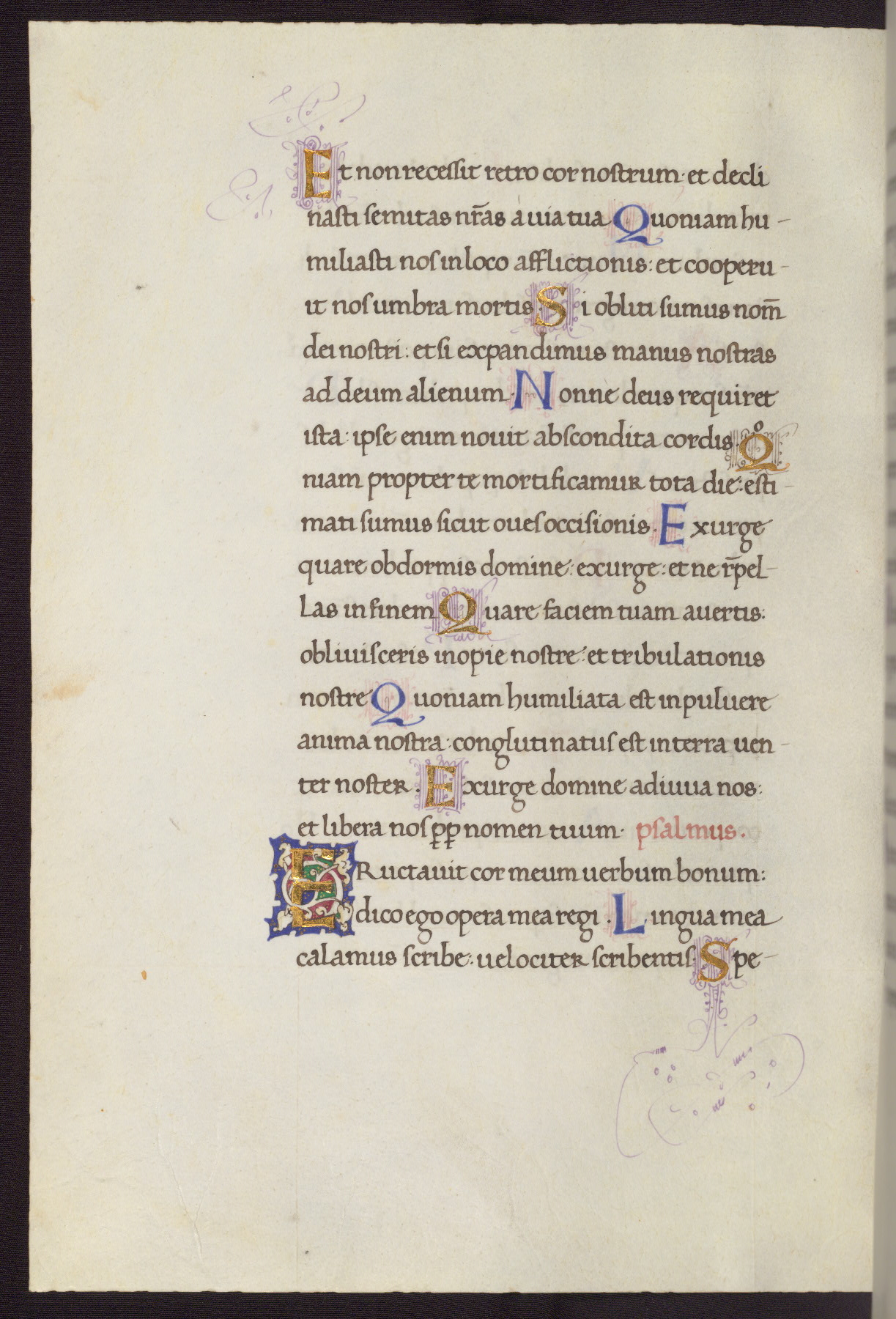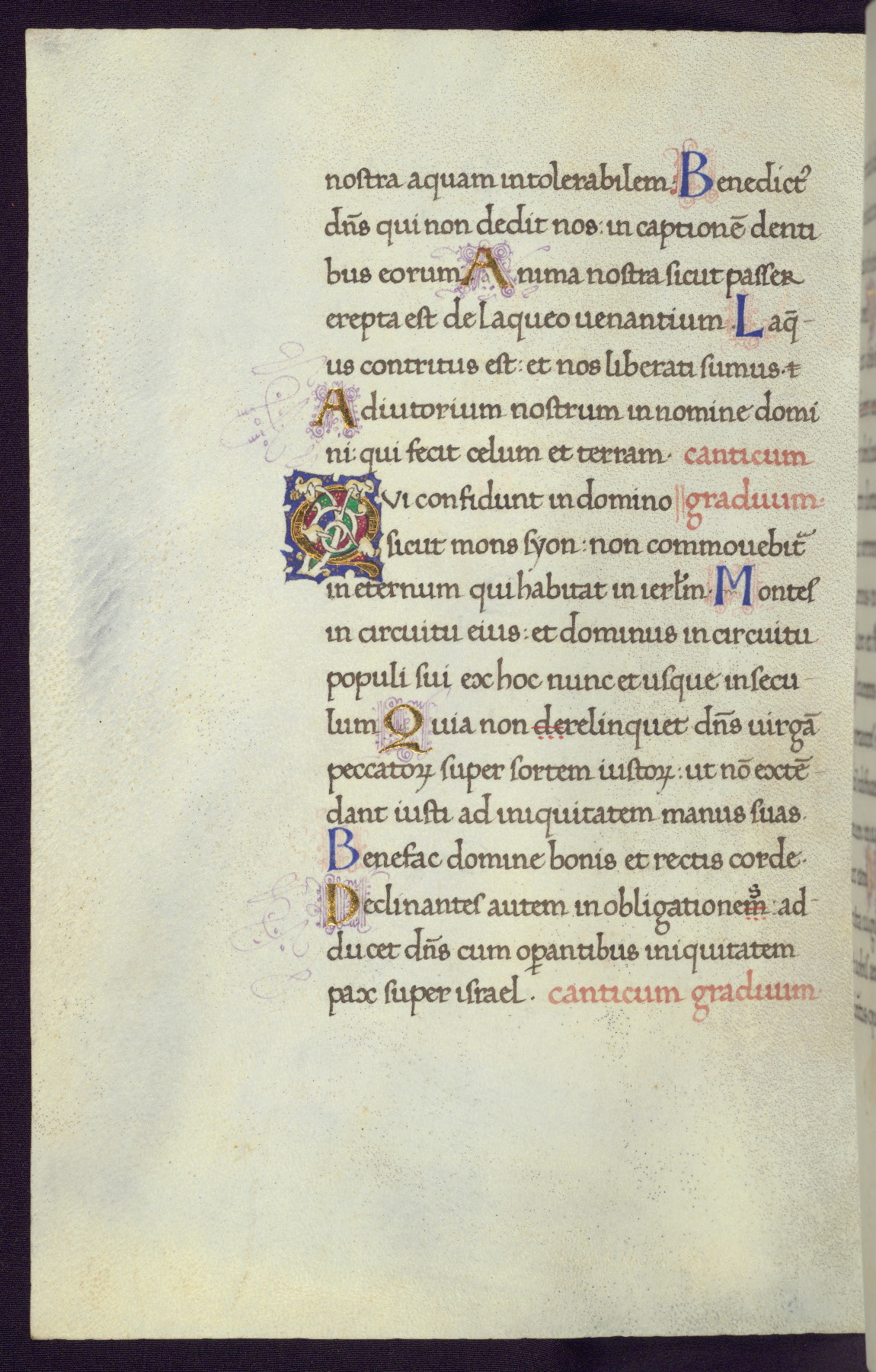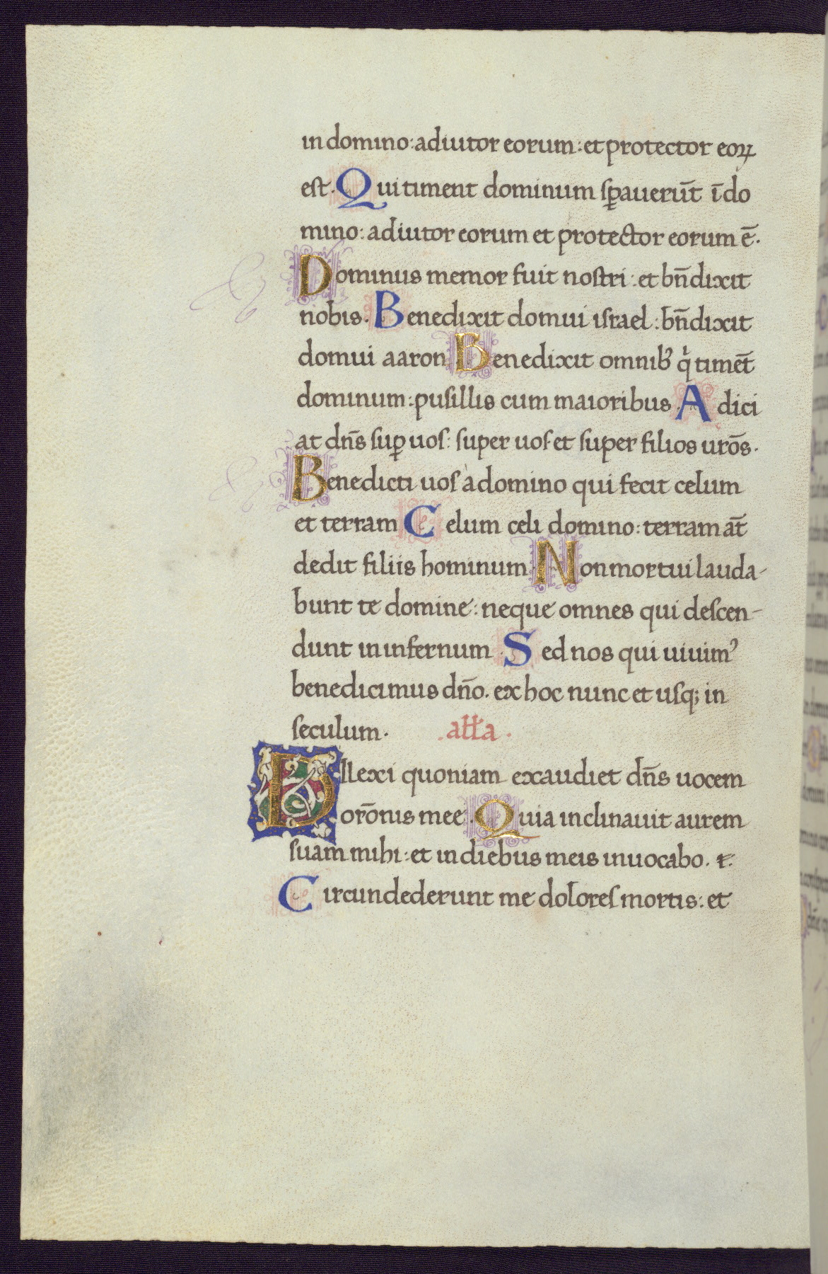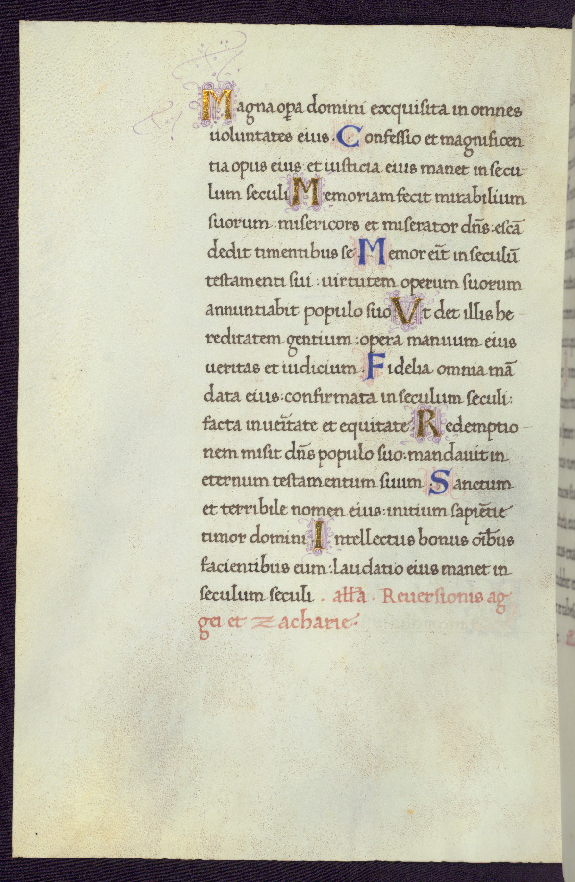 This Psalter was created in Southern Italy, likely Naples, in the last quarter of the fifteenth century. The litany (fols. 158v - 161r) suggests it was for Cistercian use. It contains six high-quality miniatures attributed to the Neopolitan illuminator Cristoforo Magorana (though the historiated initial of David playing a psaltry on fol. 15r may have been done by another hand), who from 1480-1492 worked at the court of Ferdinand I of Aragon. To date, almost forty manuscripts have been attributed to the artist. The Walters manuscript contains two full-page miniatures, one showing the Tree of Jesse and the other the Man of Sorrows. The Tree of Jesse (described in Isaiah 1:11) shows the ancestry of Christ rising from Jesse of Bethlehem, the father of King David who is depicted on the facing folio (171r). In this depiction Jesse is shown on the trunk of the tree, but it actually rises from Abraham. Surrounding Abraham is a crowd of Prophets each with scrolls with verses believed to prophecy the coming of Christ. The miniature with the Man of Sorrows shows Christ standing in his tomb and surrounded by the objects associated with the Passion (arma Christi). The miniature follows a specific Man of Sorrows iconography that originated in an early-fourteenth century mosaic icon from Constantinople that most likely arrived in Italy ca. 1380. The mosaic panel was believed to be an authentic representation of St. Gregory's vision of Christ as the Man of Sorrows, and this type of image encouraged the viewer to meditate on the suffering of Christ while reading the Passion narratives that follow. The humanist script and white-vine initials place the Walters Psalter firmly within the Humanist tradition of the late fifteenth century. Remnants of black velvet suggest this book once had a chemise binding, comparable to W.294 and W.480. Peter Kidd has suggested that the manuscript may have been written by Pietro Ursuleo of Capua (d. 1483).