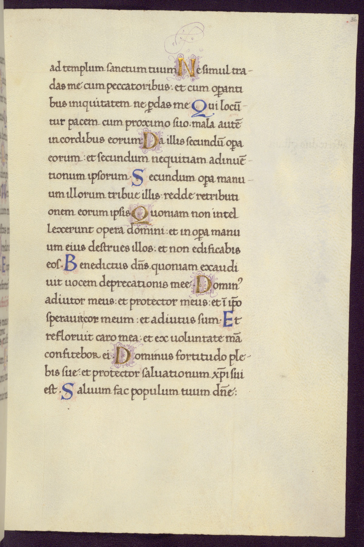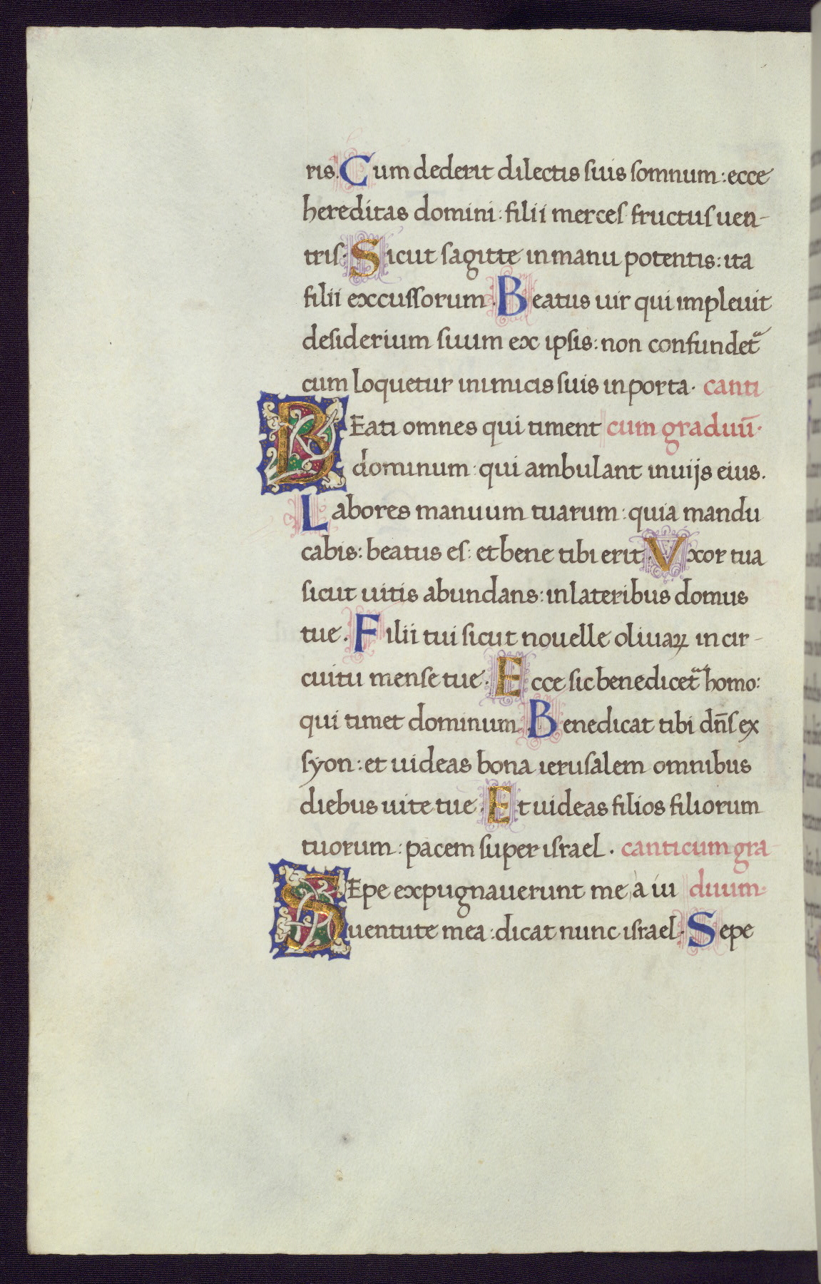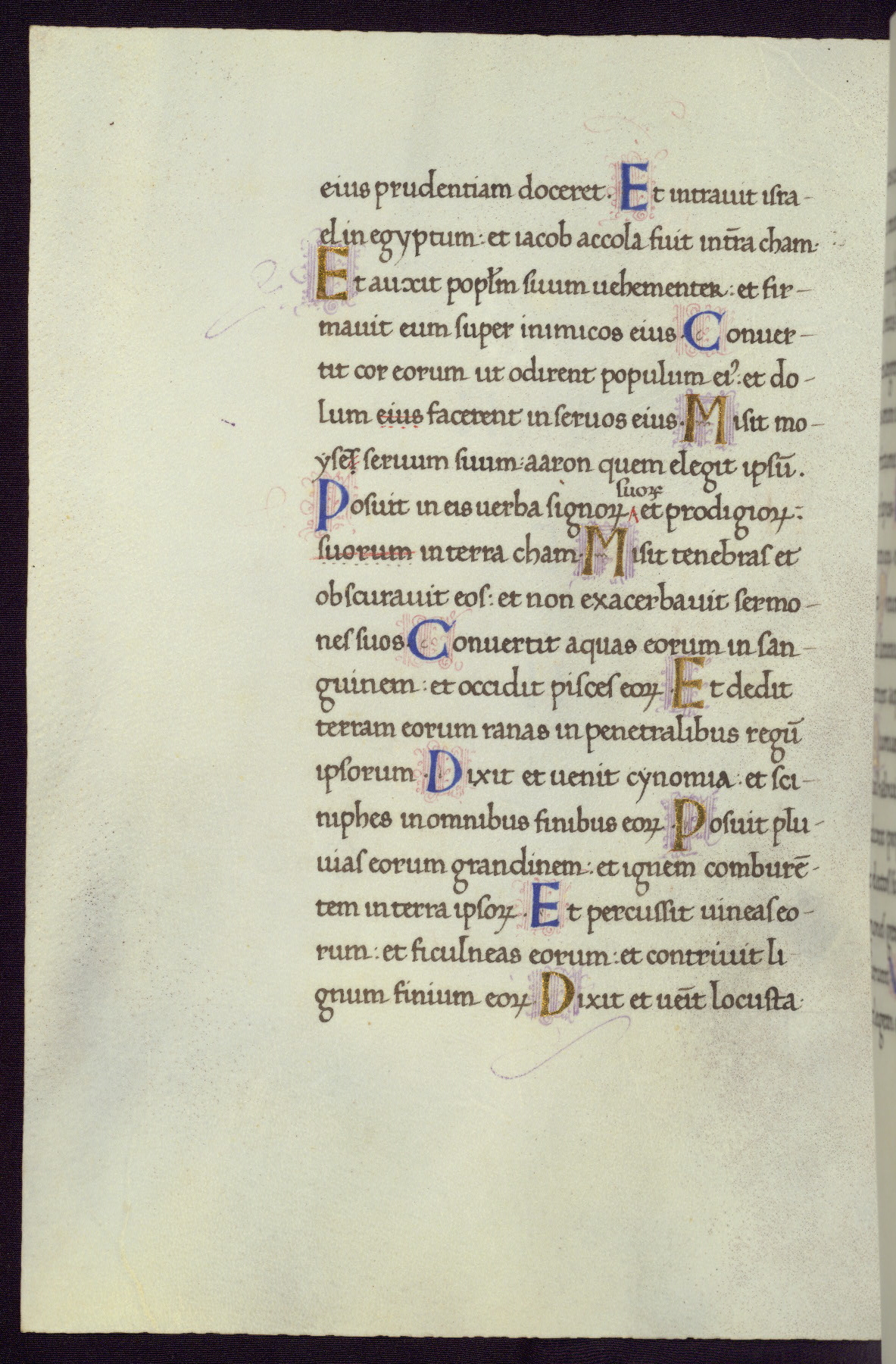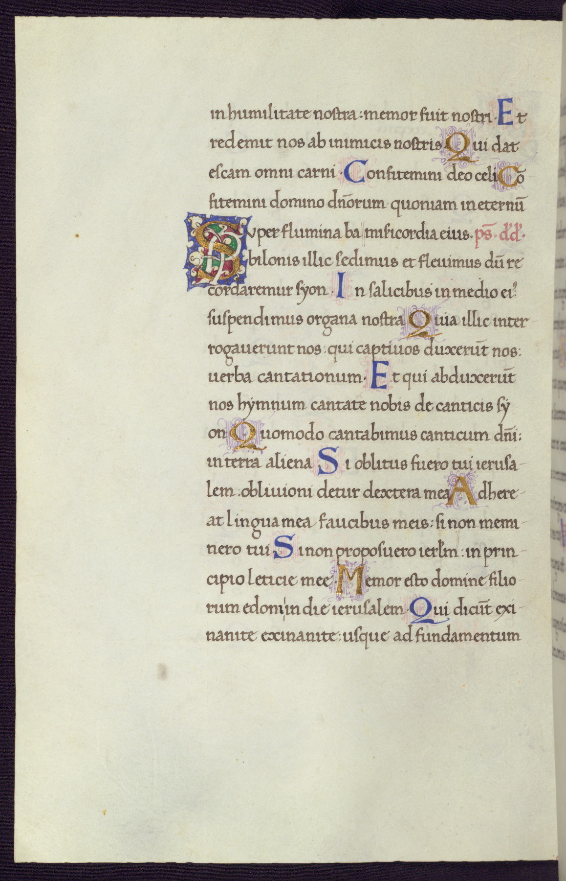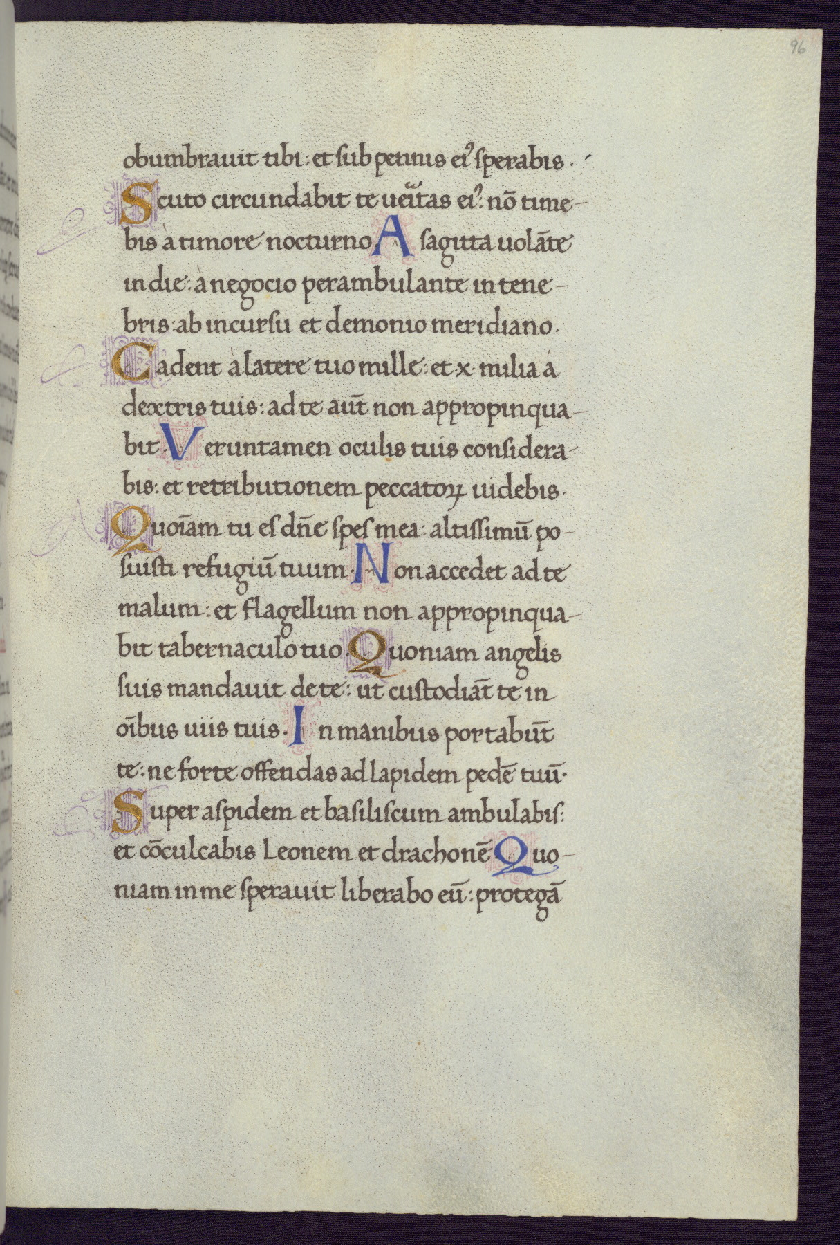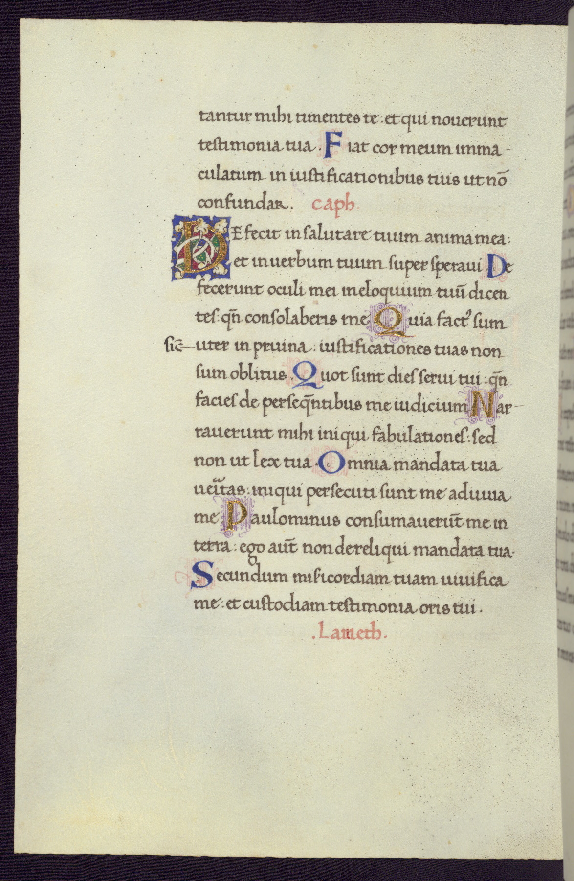This Psalter was created in Southern Italy, likely Naples, in the last quarter of the fifteenth century. The litany (fols. 158v - 161r) suggests it was for Cistercian use. It contains six high-quality miniatures attributed to the Neopolitan illuminator Cristoforo Magorana (though the historiated initial of David playing a psaltry on fol. 15r may have been done by another hand), who from 1480-1492 worked at the court of Ferdinand I of Aragon. To date, almost forty manuscripts have been attributed to the artist. The Walters manuscript contains two full-page miniatures, one showing the Tree of Jesse and the other the Man of Sorrows. The Tree of Jesse (described in Isaiah 1:11) shows the ancestry of Christ rising from Jesse of Bethlehem, the father of King David who is depicted on the facing folio (171r). In this depiction Jesse is shown on the trunk of the tree, but it actually rises from Abraham. Surrounding Abraham is a crowd of Prophets each with scrolls with verses believed to prophecy the coming of Christ. The miniature with the Man of Sorrows shows Christ standing in his tomb and surrounded by the objects associated with the Passion (arma Christi). The miniature follows a specific Man of Sorrows iconography that originated in an early-fourteenth century mosaic icon from Constantinople that most likely arrived in Italy ca. 1380. The mosaic panel was believed to be an authentic representation of St. Gregory's vision of Christ as the Man of Sorrows, and this type of image encouraged the viewer to meditate on the suffering of Christ while reading the Passion narratives that follow. The humanist script and white-vine initials place the Walters Psalter firmly within the Humanist tradition of the late fifteenth century. Remnants of black velvet suggest this book once had a chemise binding, comparable to W.294 and W.480. Peter Kidd has suggested that the manuscript may have been written by Pietro Ursuleo of Capua (d. 1483).