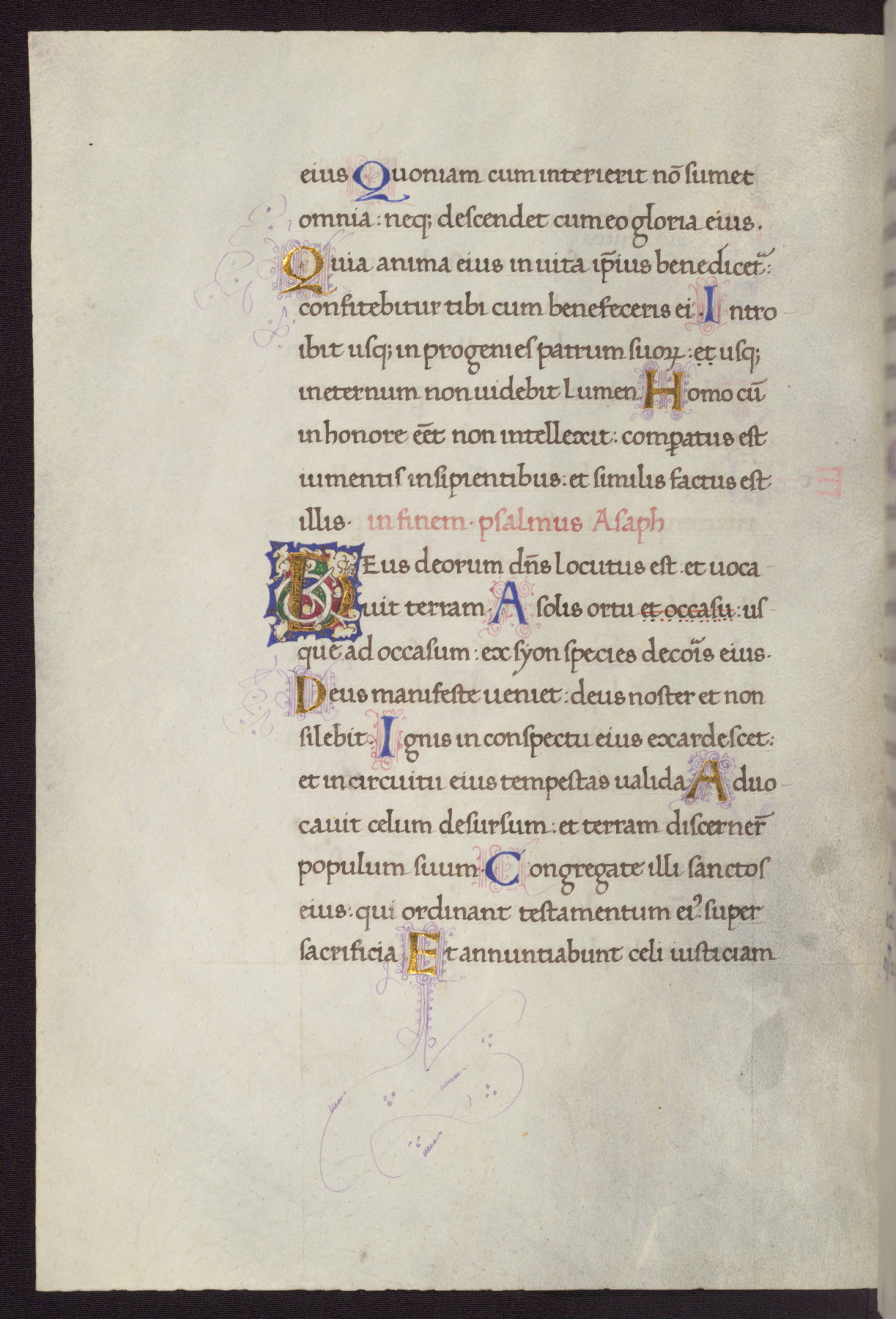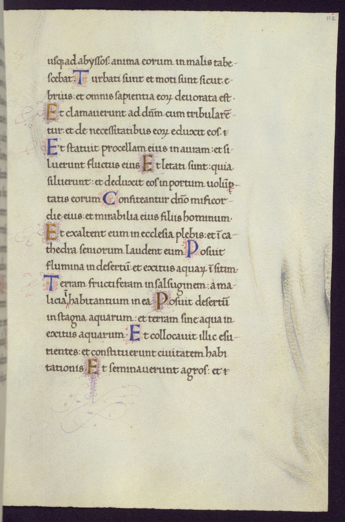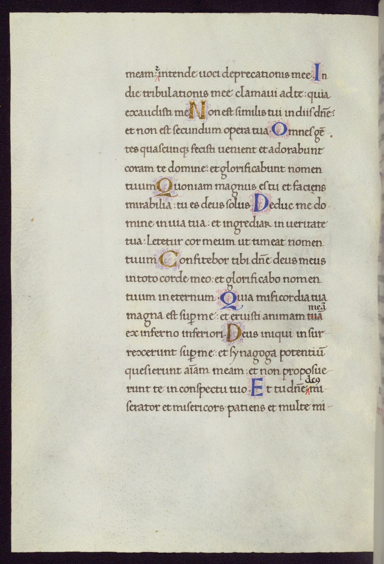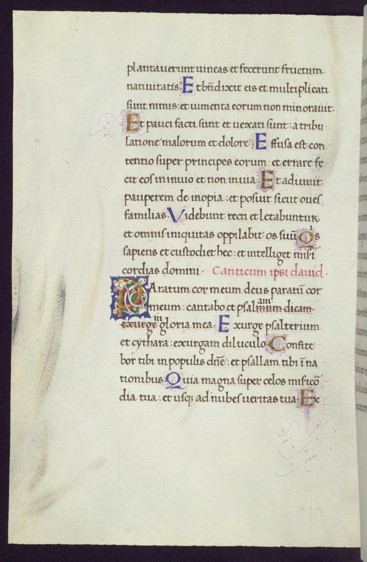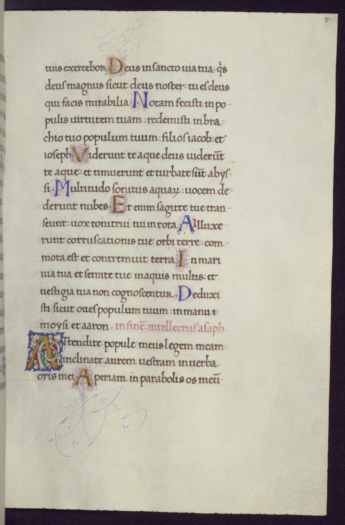 This Psalter was created in Southern Italy, likely Naples, in the last quarter of the fifteenth century. The litany (fols. 158v - 161r) suggests it was for Cistercian use. It contains six high-quality miniatures attributed to the Neopolitan illuminator Cristoforo Magorana (though the historiated initial of David playing a psaltry on fol. 15r may have been done by another hand), who from 1480-1492 worked at the court of Ferdinand I of Aragon. To date, almost forty manuscripts have been attributed to the artist. The Walters manuscript contains two full-page miniatures, one showing the Tree of Jesse and the other the Man of Sorrows. The Tree of Jesse (described in Isaiah 1:11) shows the ancestry of Christ rising from Jesse of Bethlehem, the father of King David who is depicted on the facing folio (171r). In this depiction Jesse is shown on the trunk of the tree, but it actually rises from Abraham. Surrounding Abraham is a crowd of Prophets each with scrolls with verses believed to prophecy the coming of Christ. The miniature with the Man of Sorrows shows Christ standing in his tomb and surrounded by the objects associated with the Passion (arma Christi). The miniature follows a specific Man of Sorrows iconography that originated in an early-fourteenth century mosaic icon from Constantinople that most likely arrived in Italy ca. 1380. The mosaic panel was believed to be an authentic representation of St. Gregory's vision of Christ as the Man of Sorrows, and this type of image encouraged the viewer to meditate on the suffering of Christ while reading the Passion narratives that follow. The humanist script and white-vine initials place the Walters Psalter firmly within the Humanist tradition of the late fifteenth century. Remnants of black velvet suggest this book once had a chemise binding, comparable to W.294 and W.480. Peter Kidd has suggested that the manuscript may have been written by Pietro Ursuleo of Capua (d. 1483).