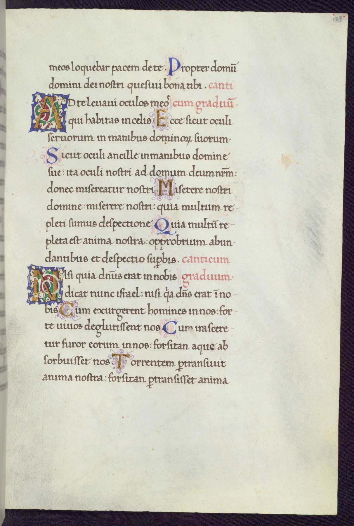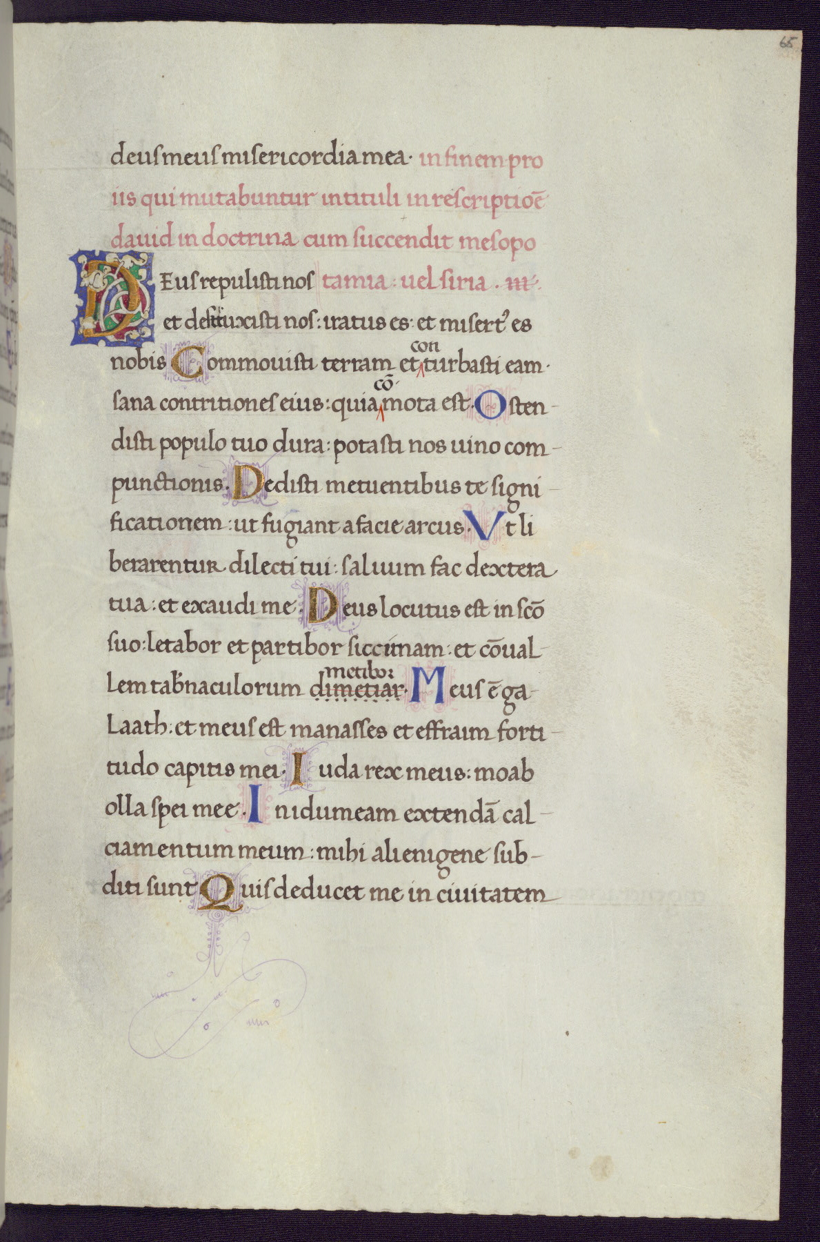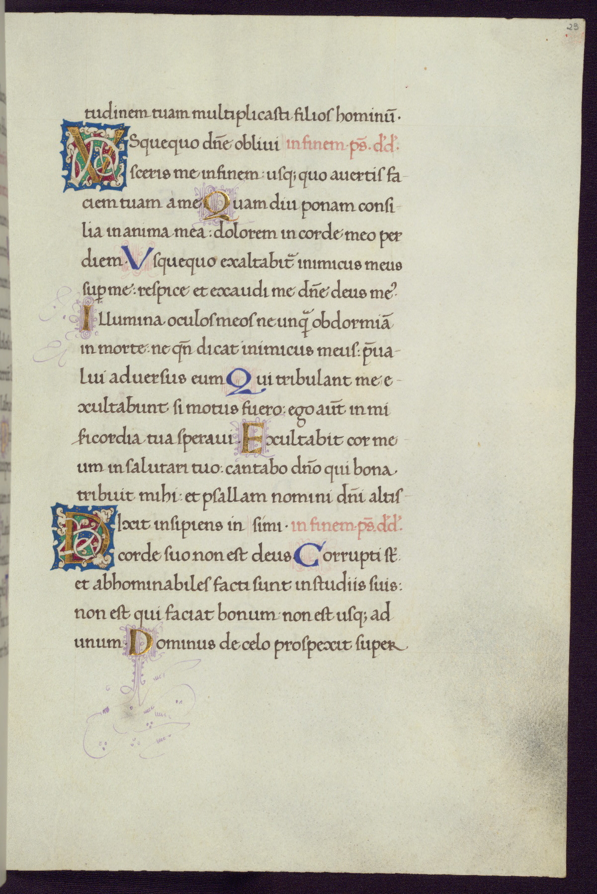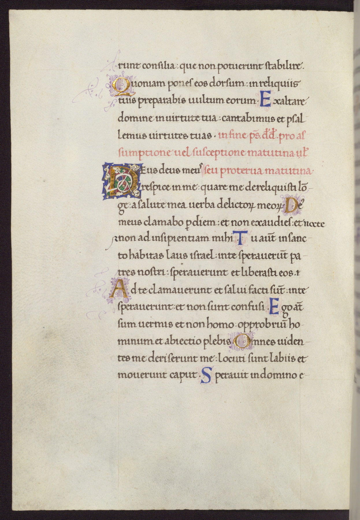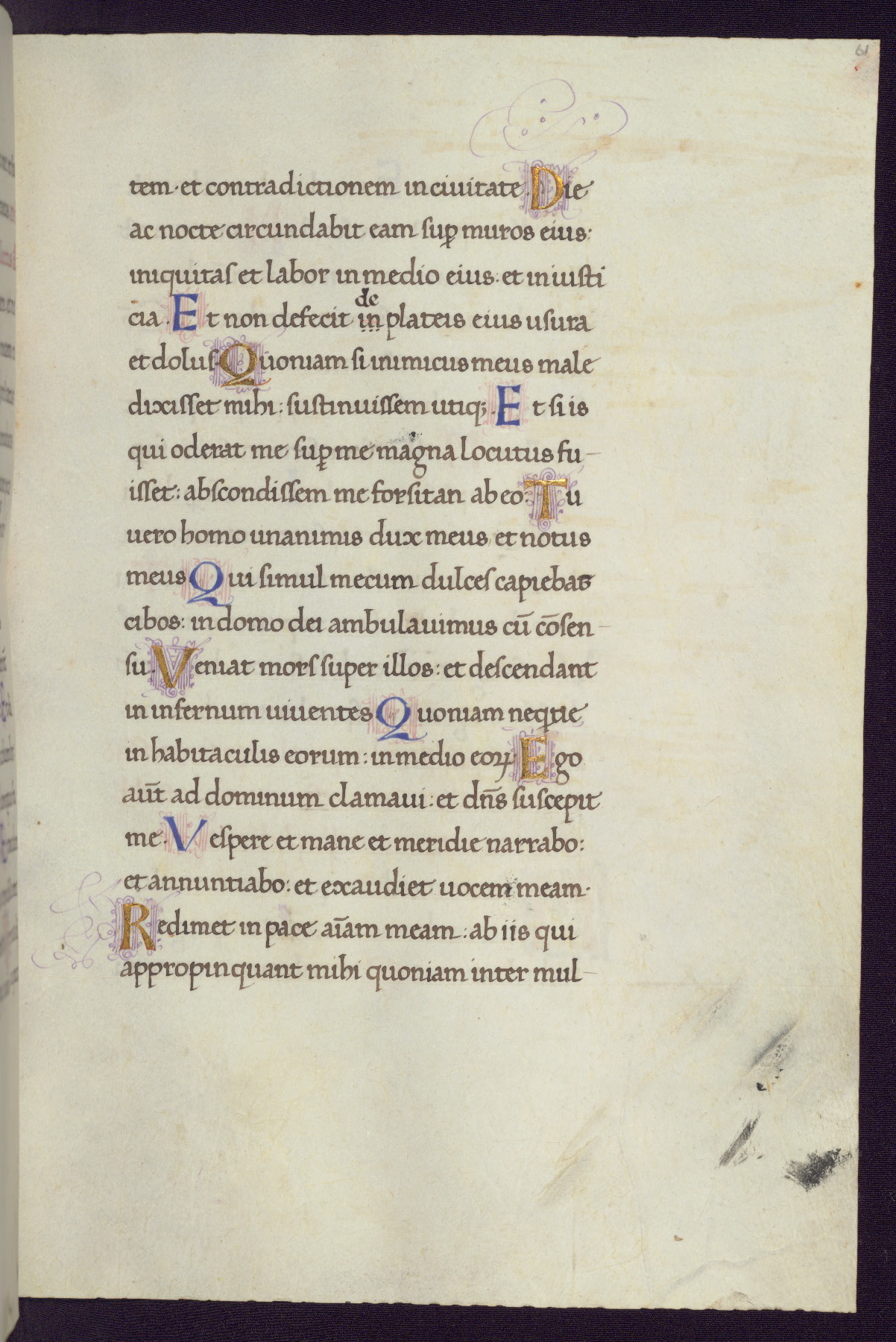 This Psalter was created in Southern Italy, likely Naples, in the last quarter of the fifteenth century. The litany (fols. 158v - 161r) suggests it was for Cistercian use. It contains six high-quality miniatures attributed to the Neopolitan illuminator Cristoforo Magorana (though the historiated initial of David playing a psaltry on fol. 15r may have been done by another hand), who from 1480-1492 worked at the court of Ferdinand I of Aragon. To date, almost forty manuscripts have been attributed to the artist. The Walters manuscript contains two full-page miniatures, one showing the Tree of Jesse and the other the Man of Sorrows. The Tree of Jesse (described in Isaiah 1:11) shows the ancestry of Christ rising from Jesse of Bethlehem, the father of King David who is depicted on the facing folio (171r). In this depiction Jesse is shown on the trunk of the tree, but it actually rises from Abraham. Surrounding Abraham is a crowd of Prophets each with scrolls with verses believed to prophecy the coming of Christ. The miniature with the Man of Sorrows shows Christ standing in his tomb and surrounded by the objects associated with the Passion (arma Christi). The miniature follows a specific Man of Sorrows iconography that originated in an early-fourteenth century mosaic icon from Constantinople that most likely arrived in Italy ca. 1380. The mosaic panel was believed to be an authentic representation of St. Gregory's vision of Christ as the Man of Sorrows, and this type of image encouraged the viewer to meditate on the suffering of Christ while reading the Passion narratives that follow. The humanist script and white-vine initials place the Walters Psalter firmly within the Humanist tradition of the late fifteenth century. Remnants of black velvet suggest this book once had a chemise binding, comparable to W.294 and W.480. Peter Kidd has suggested that the manuscript may have been written by Pietro Ursuleo of Capua (d. 1483).