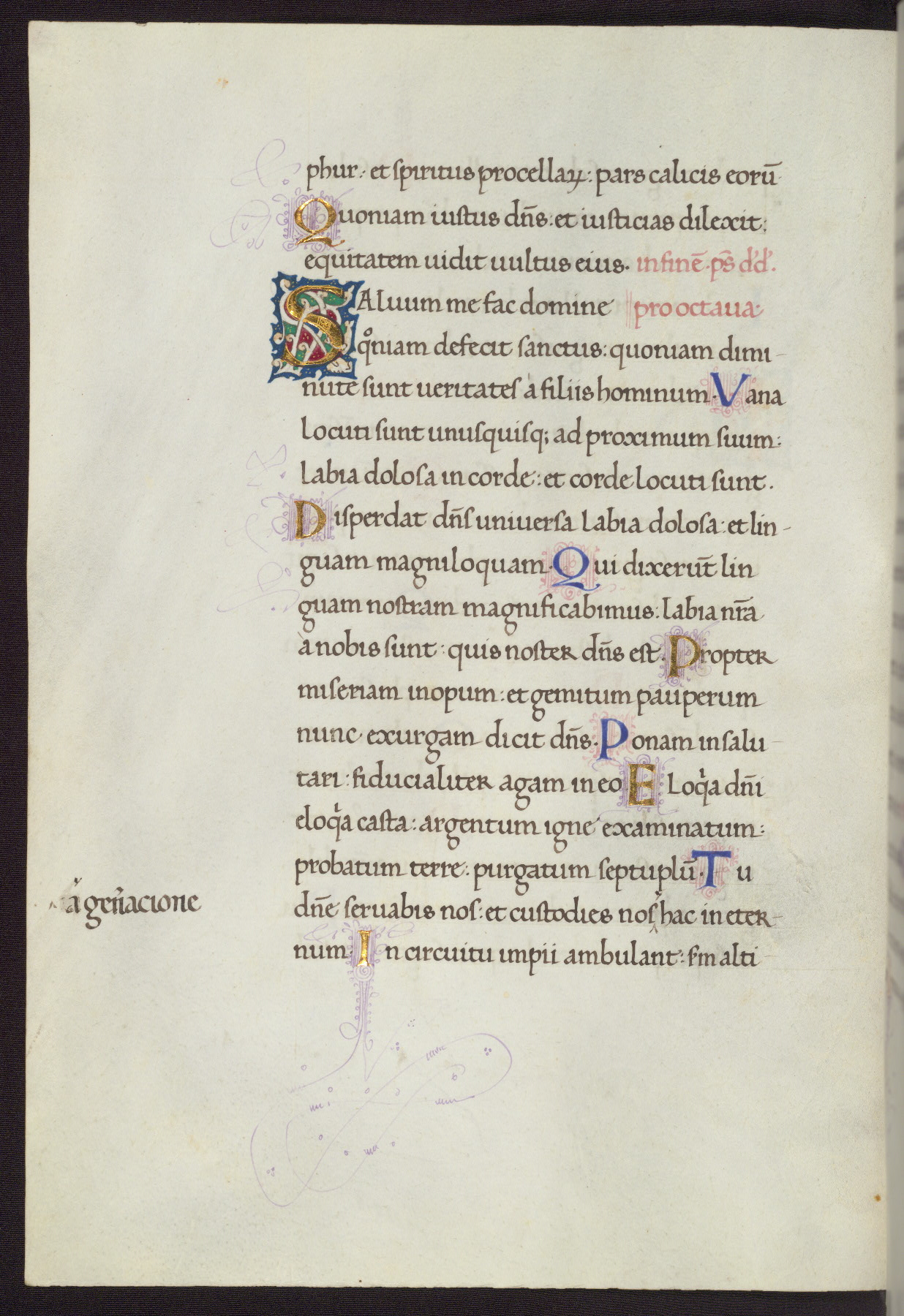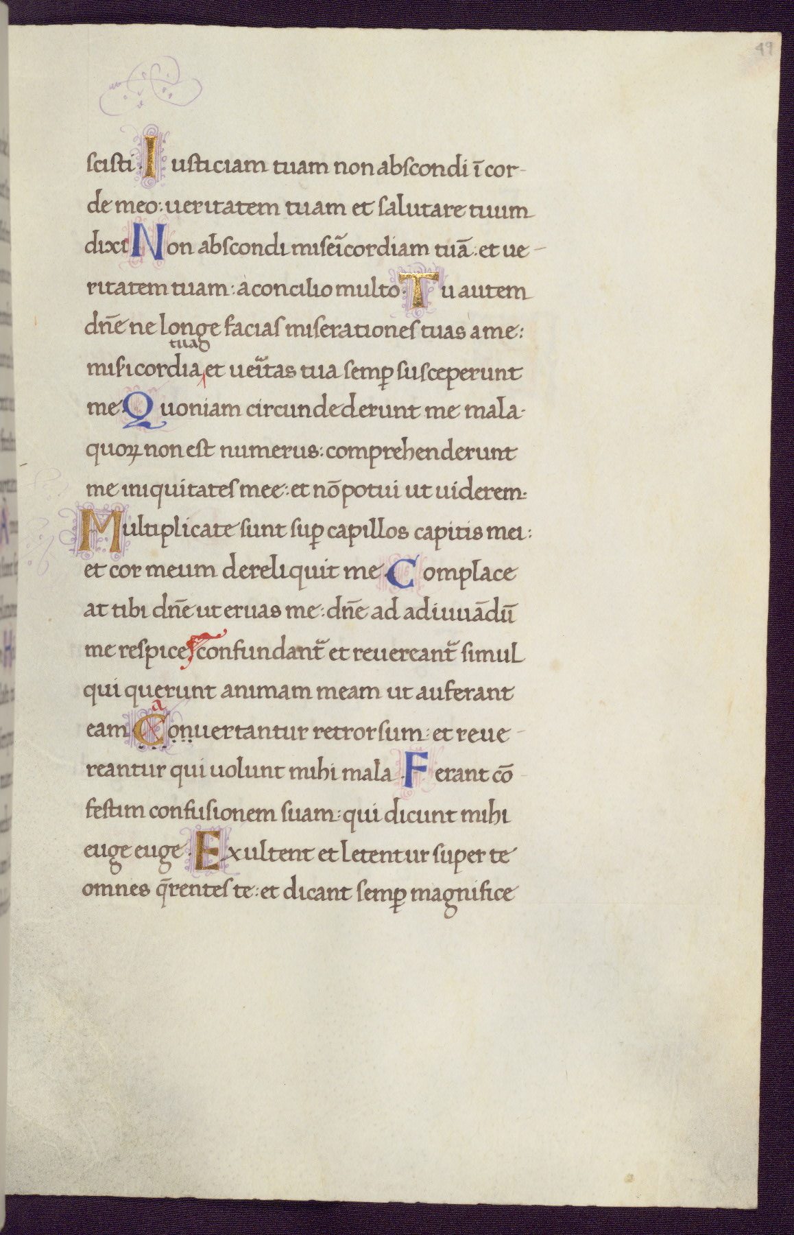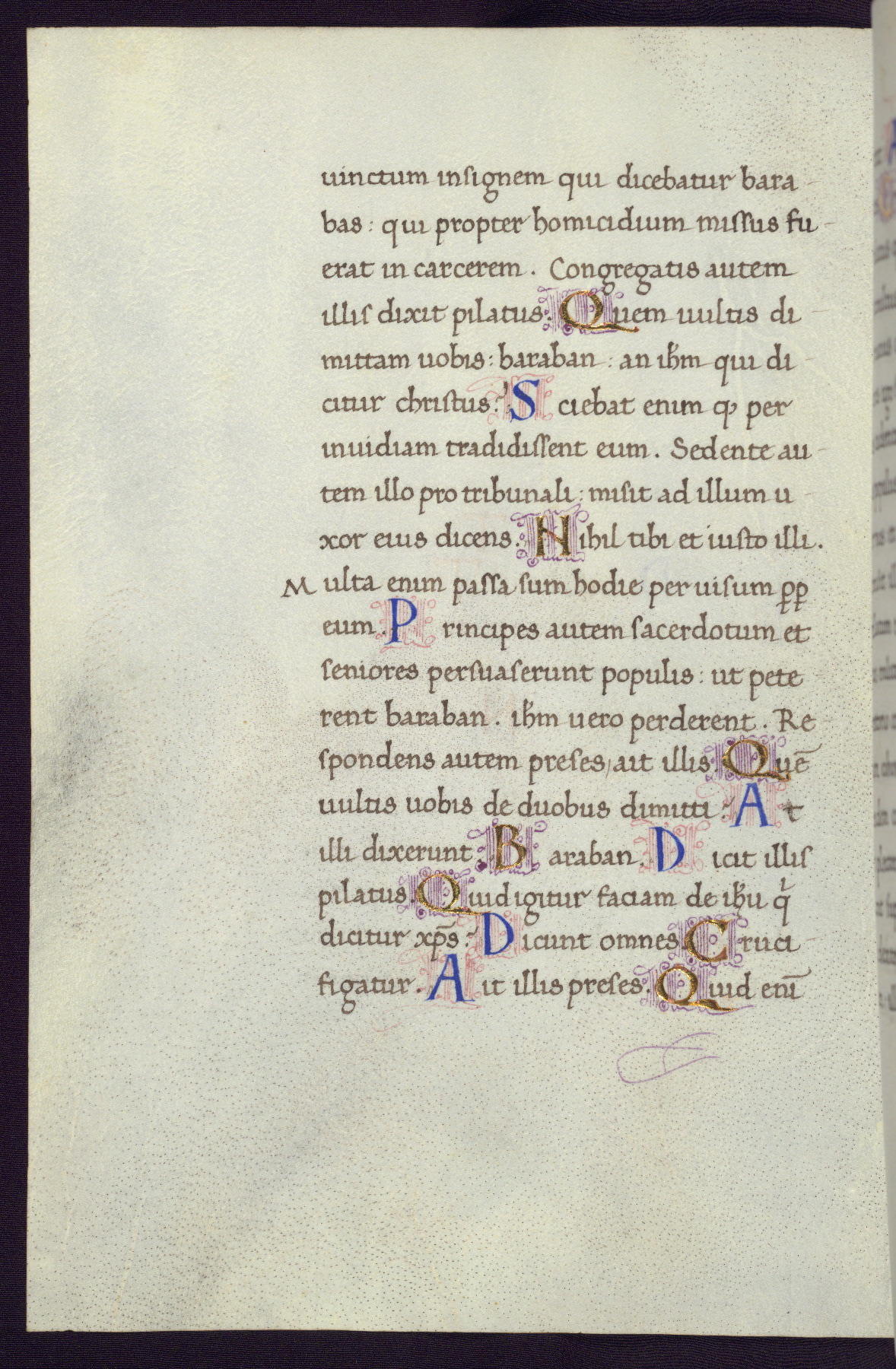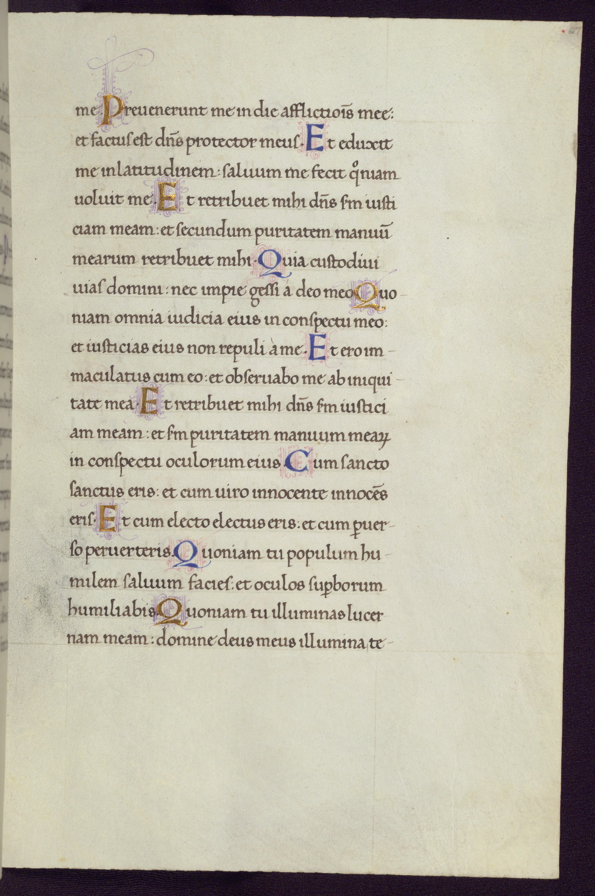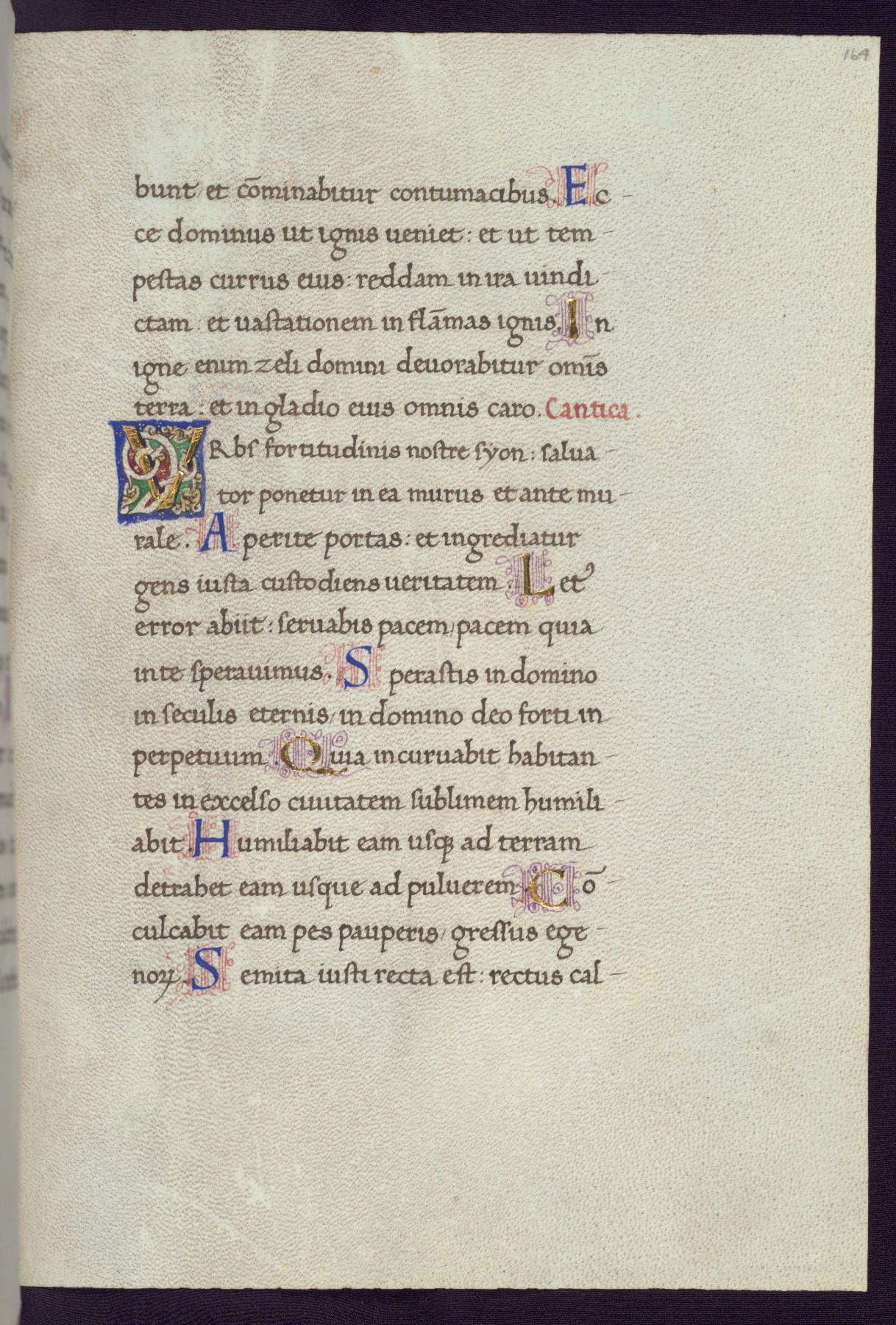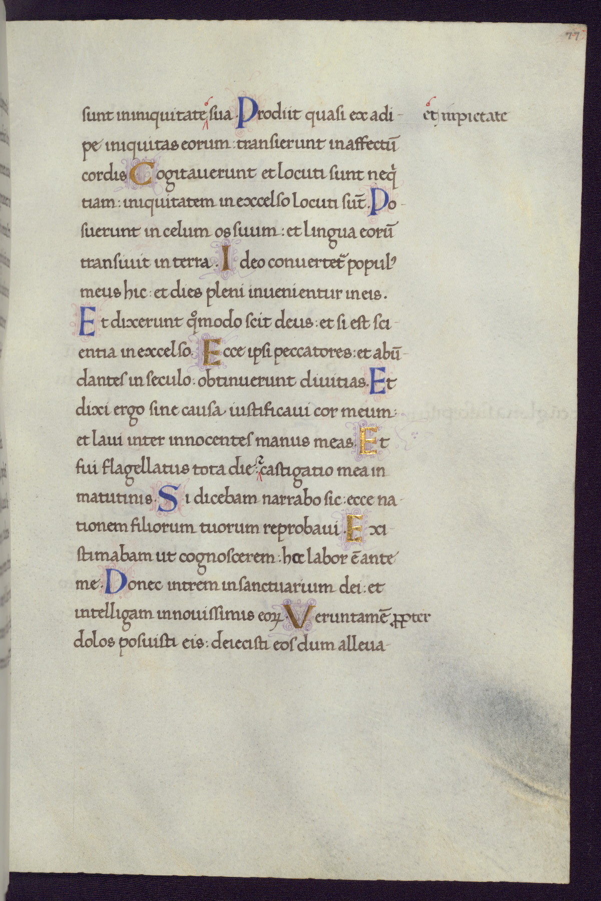 This Psalter was created in Southern Italy, likely Naples, in the last quarter of the fifteenth century. The litany (fols. 158v - 161r) suggests it was for Cistercian use. It contains six high-quality miniatures attributed to the Neopolitan illuminator Cristoforo Magorana (though the historiated initial of David playing a psaltry on fol. 15r may have been done by another hand), who from 1480-1492 worked at the court of Ferdinand I of Aragon. To date, almost forty manuscripts have been attributed to the artist. The Walters manuscript contains two full-page miniatures, one showing the Tree of Jesse and the other the Man of Sorrows. The Tree of Jesse (described in Isaiah 1:11) shows the ancestry of Christ rising from Jesse of Bethlehem, the father of King David who is depicted on the facing folio (171r). In this depiction Jesse is shown on the trunk of the tree, but it actually rises from Abraham. Surrounding Abraham is a crowd of Prophets each with scrolls with verses believed to prophecy the coming of Christ. The miniature with the Man of Sorrows shows Christ standing in his tomb and surrounded by the objects associated with the Passion (arma Christi). The miniature follows a specific Man of Sorrows iconography that originated in an early-fourteenth century mosaic icon from Constantinople that most likely arrived in Italy ca. 1380. The mosaic panel was believed to be an authentic representation of St. Gregory's vision of Christ as the Man of Sorrows, and this type of image encouraged the viewer to meditate on the suffering of Christ while reading the Passion narratives that follow. The humanist script and white-vine initials place the Walters Psalter firmly within the Humanist tradition of the late fifteenth century. Remnants of black velvet suggest this book once had a chemise binding, comparable to W.294 and W.480. Peter Kidd has suggested that the manuscript may have been written by Pietro Ursuleo of Capua (d. 1483).