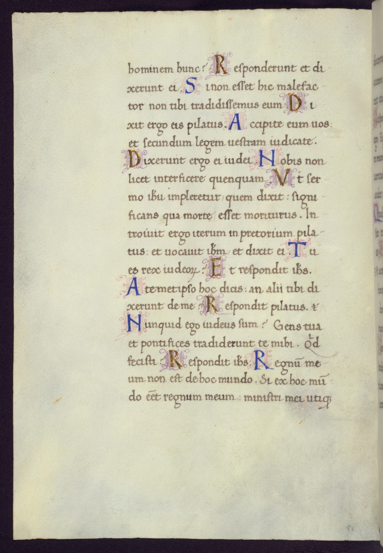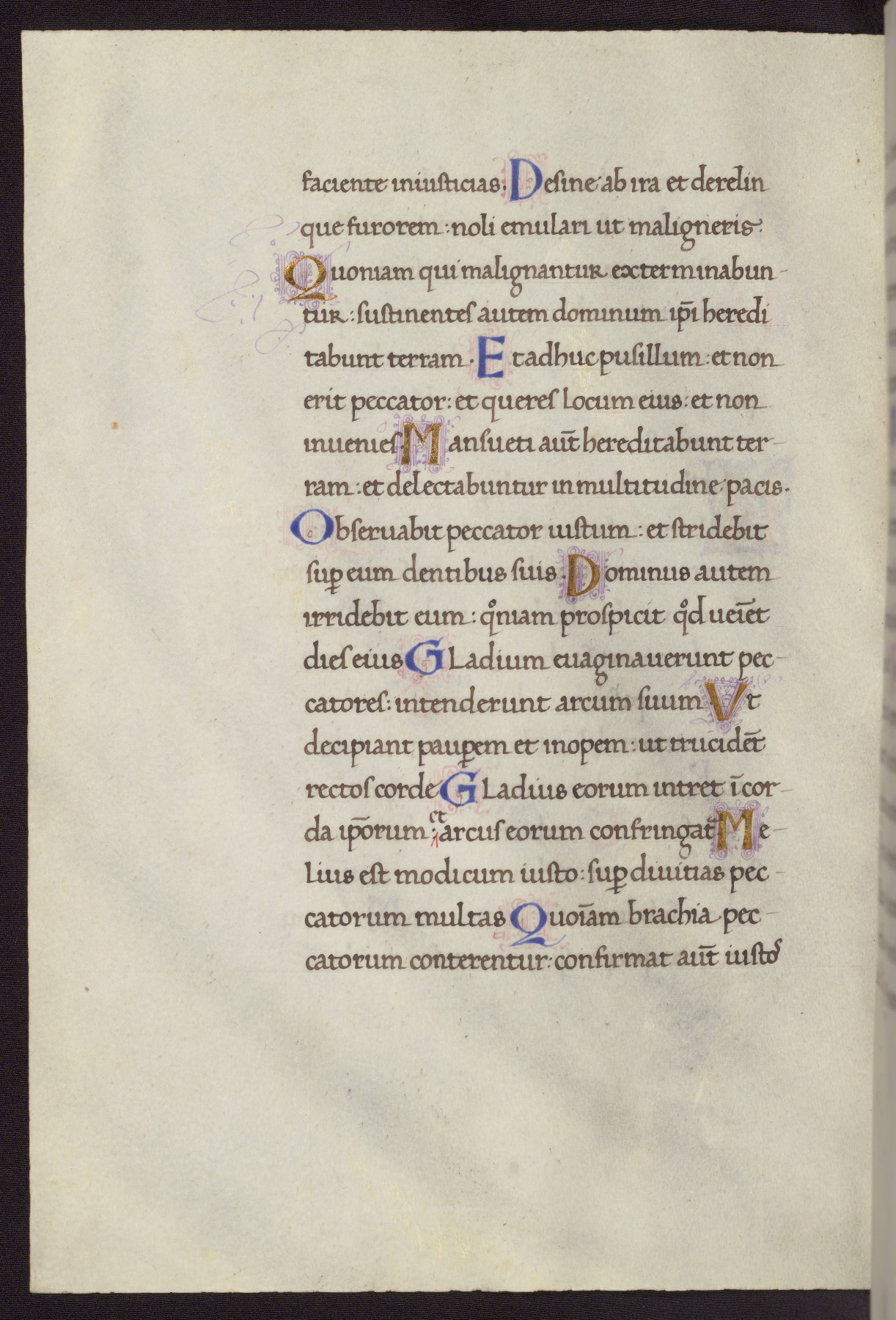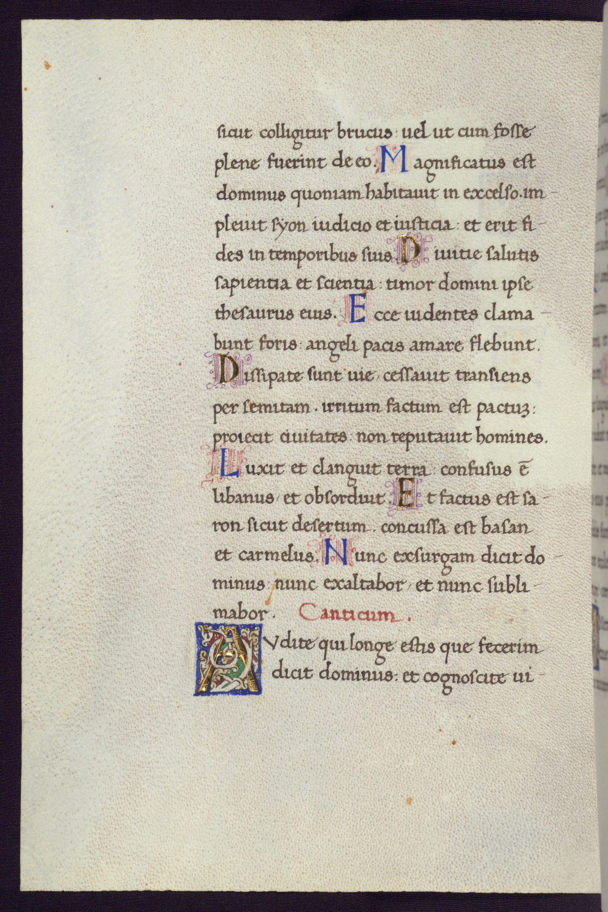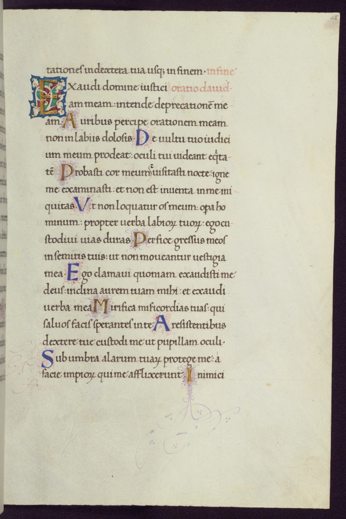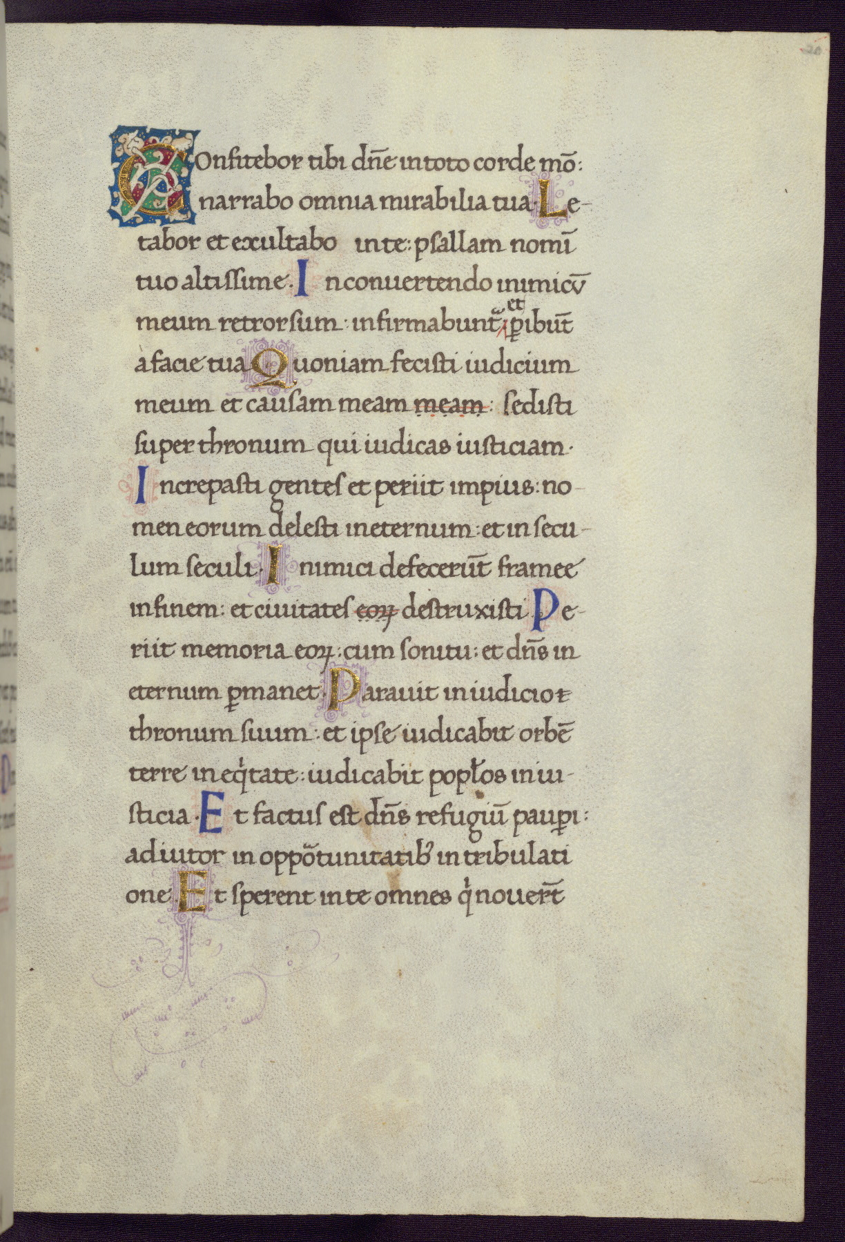 This Psalter was created in Southern Italy, likely Naples, in the last quarter of the fifteenth century. The litany (fols. 158v - 161r) suggests it was for Cistercian use. It contains six high-quality miniatures attributed to the Neopolitan illuminator Cristoforo Magorana (though the historiated initial of David playing a psaltry on fol. 15r may have been done by another hand), who from 1480-1492 worked at the court of Ferdinand I of Aragon. To date, almost forty manuscripts have been attributed to the artist. The Walters manuscript contains two full-page miniatures, one showing the Tree of Jesse and the other the Man of Sorrows. The Tree of Jesse (described in Isaiah 1:11) shows the ancestry of Christ rising from Jesse of Bethlehem, the father of King David who is depicted on the facing folio (171r). In this depiction Jesse is shown on the trunk of the tree, but it actually rises from Abraham. Surrounding Abraham is a crowd of Prophets each with scrolls with verses believed to prophecy the coming of Christ. The miniature with the Man of Sorrows shows Christ standing in his tomb and surrounded by the objects associated with the Passion (arma Christi). The miniature follows a specific Man of Sorrows iconography that originated in an early-fourteenth century mosaic icon from Constantinople that most likely arrived in Italy ca. 1380. The mosaic panel was believed to be an authentic representation of St. Gregory's vision of Christ as the Man of Sorrows, and this type of image encouraged the viewer to meditate on the suffering of Christ while reading the Passion narratives that follow. The humanist script and white-vine initials place the Walters Psalter firmly within the Humanist tradition of the late fifteenth century. Remnants of black velvet suggest this book once had a chemise binding, comparable to W.294 and W.480. Peter Kidd has suggested that the manuscript may have been written by Pietro Ursuleo of Capua (d. 1483).
