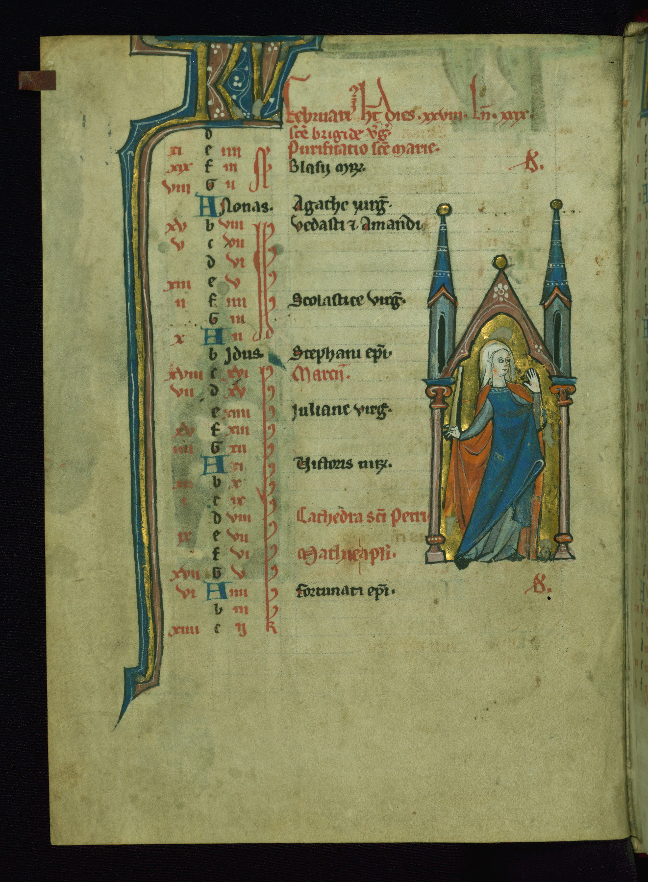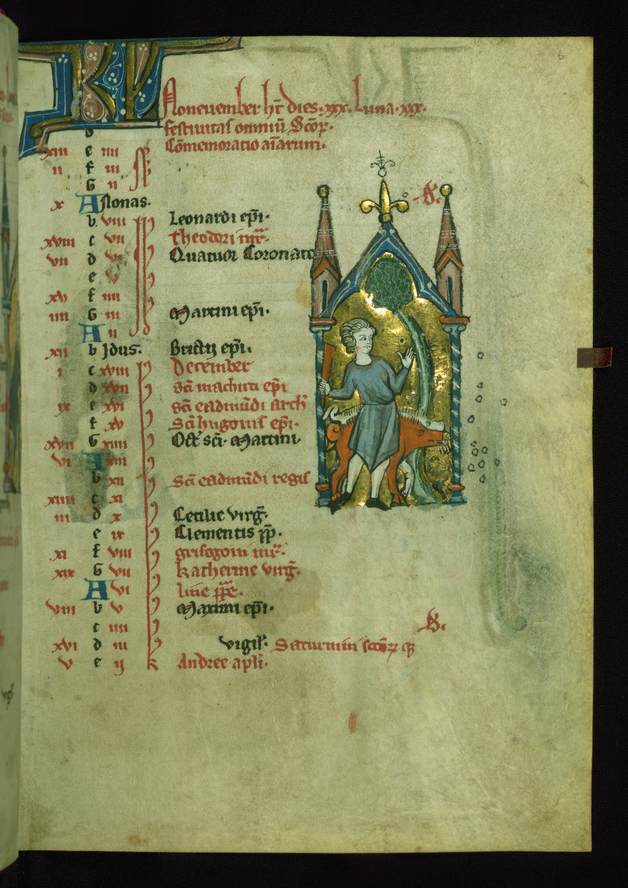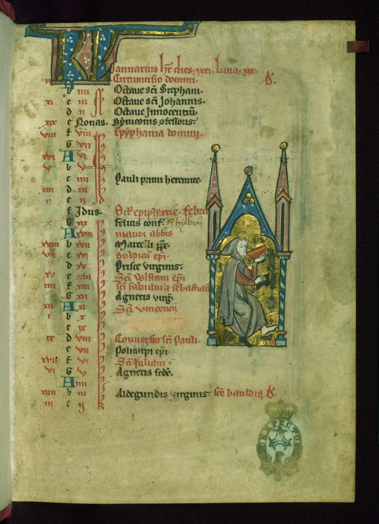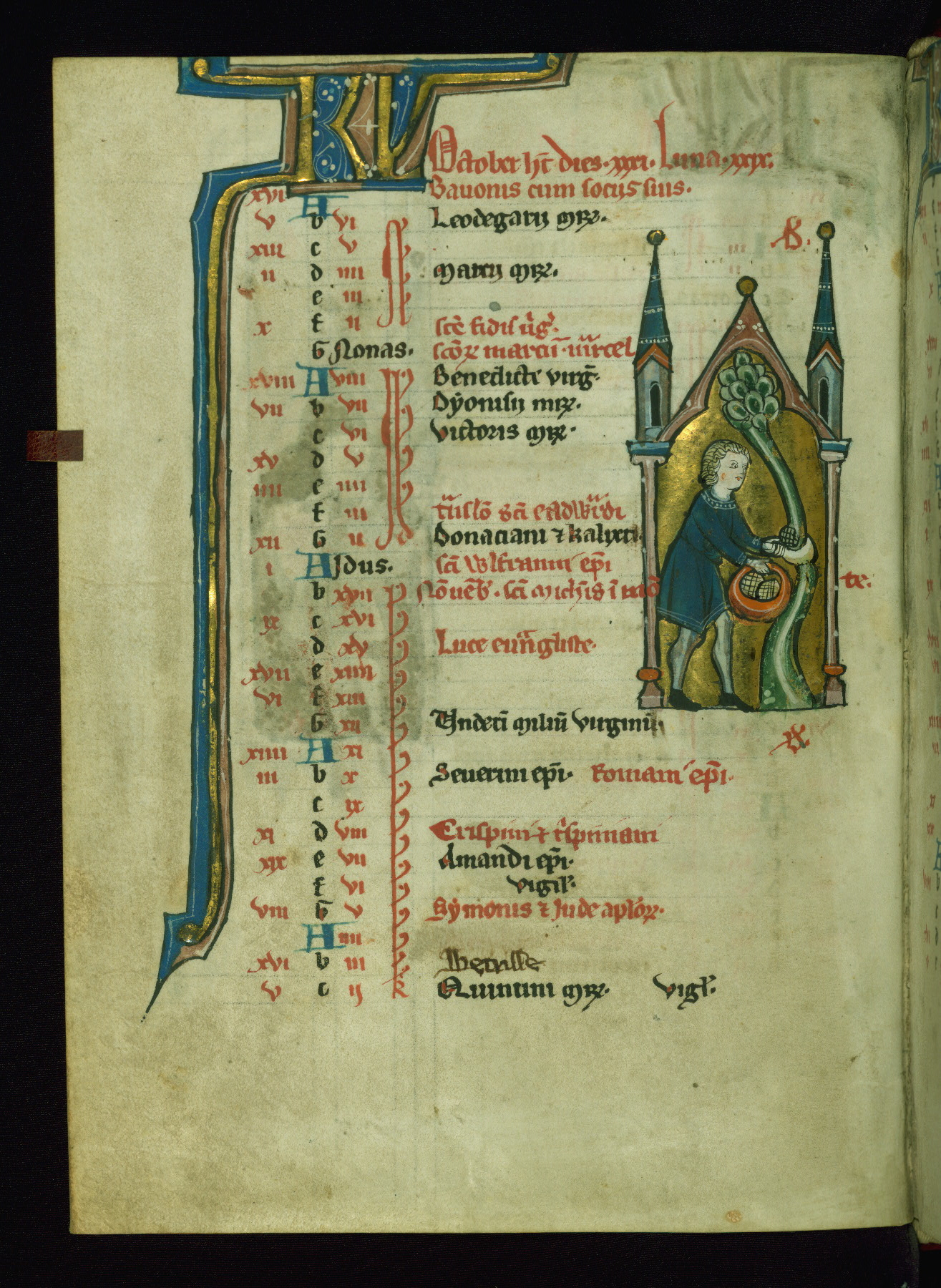 - Contents: Calendar originally a quarter full, closer to half full with fourteenth-century additions in brown ink; graded in red and black; Egyptian days indicated with a "D;" saints of note include Hilary (Jan. 10), Donatus (Mar. 1), Adrian (Mar. 4), Rufus (Apr. 19), Basil (June 14), Donatus (Aug. 7), Remacle (Sept. 3), Cosmas and Damian (Sept. 27), Bavo (Oct. 1), Benedicta (Oct. 8), All Saints (Nov. 1), All Souls (Nov. 2), Ignatius and "O sapiencia"(Dec. 16); added English saints include Wulstan (Jan. 19), Bathildis (Jan. 31), Edward (Mar. 17), Cuthbert (Mar. 20), Augustine (May 26), and the Feast of Relics (Sept. 15)