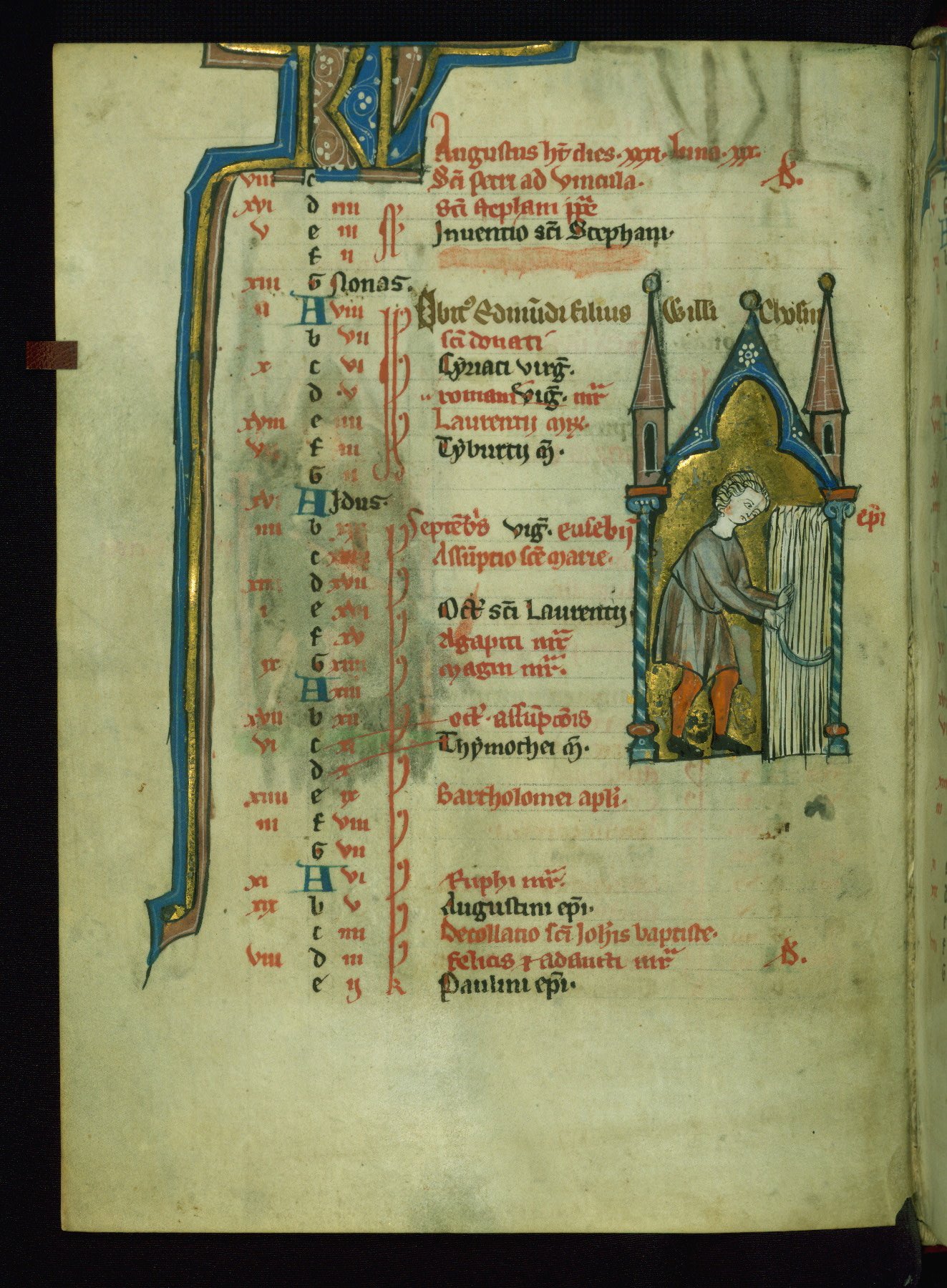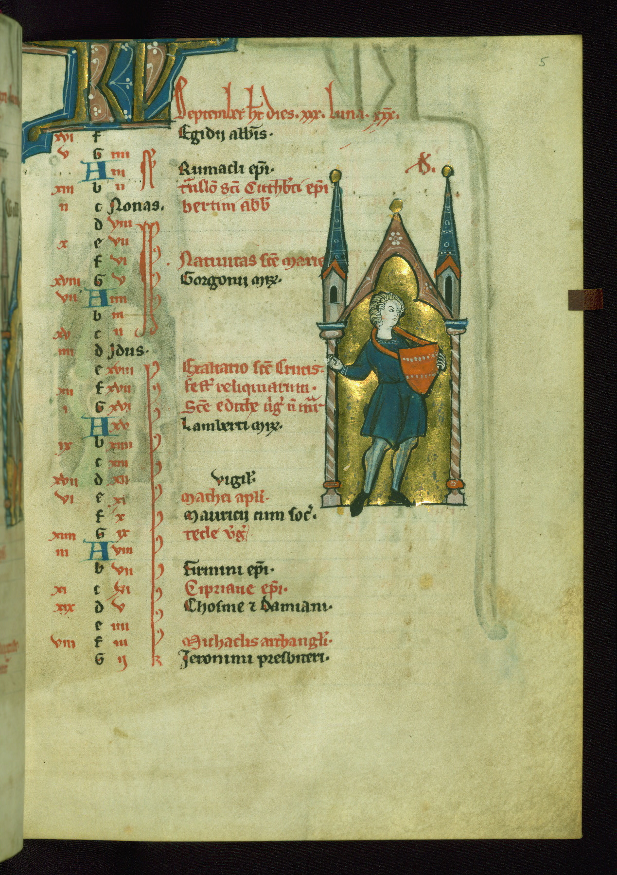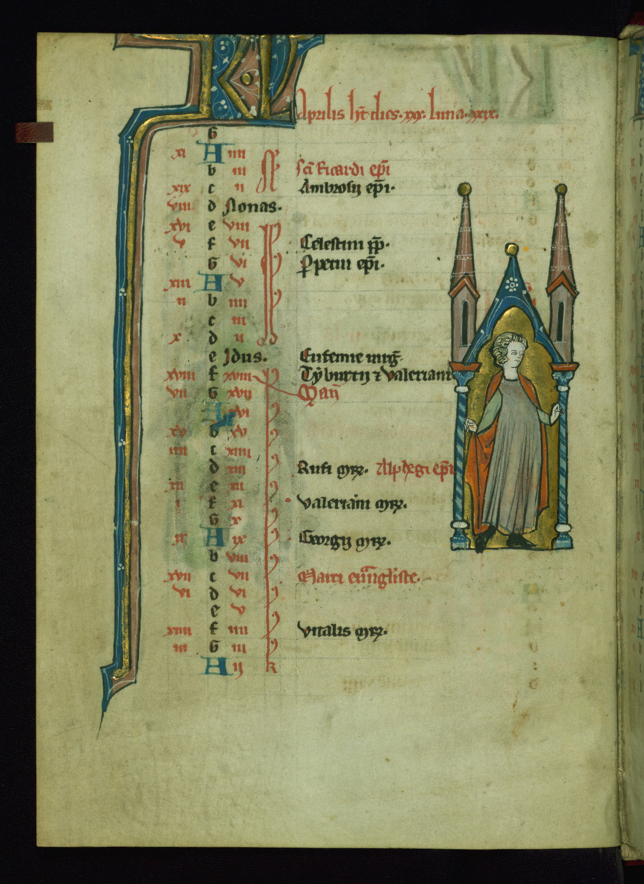 - Contents: Calendar originally a quarter full, closer to half full with fourteenth-century additions in brown ink; graded in red and black; Egyptian days indicated with a "D;" saints of note include Hilary (Jan. 10), Donatus (Mar. 1), Adrian (Mar. 4), Rufus (Apr. 19), Basil (June 14), Donatus (Aug. 7), Remacle (Sept. 3), Cosmas and Damian (Sept. 27), Bavo (Oct. 1), Benedicta (Oct. 8), All Saints (Nov. 1), All Souls (Nov. 2), Ignatius and "O sapiencia"(Dec. 16); added English saints include Wulstan (Jan. 19), Bathildis (Jan. 31), Edward (Mar. 17), Cuthbert (Mar. 20), Augustine (May 26), and the Feast of Relics (Sept. 15)