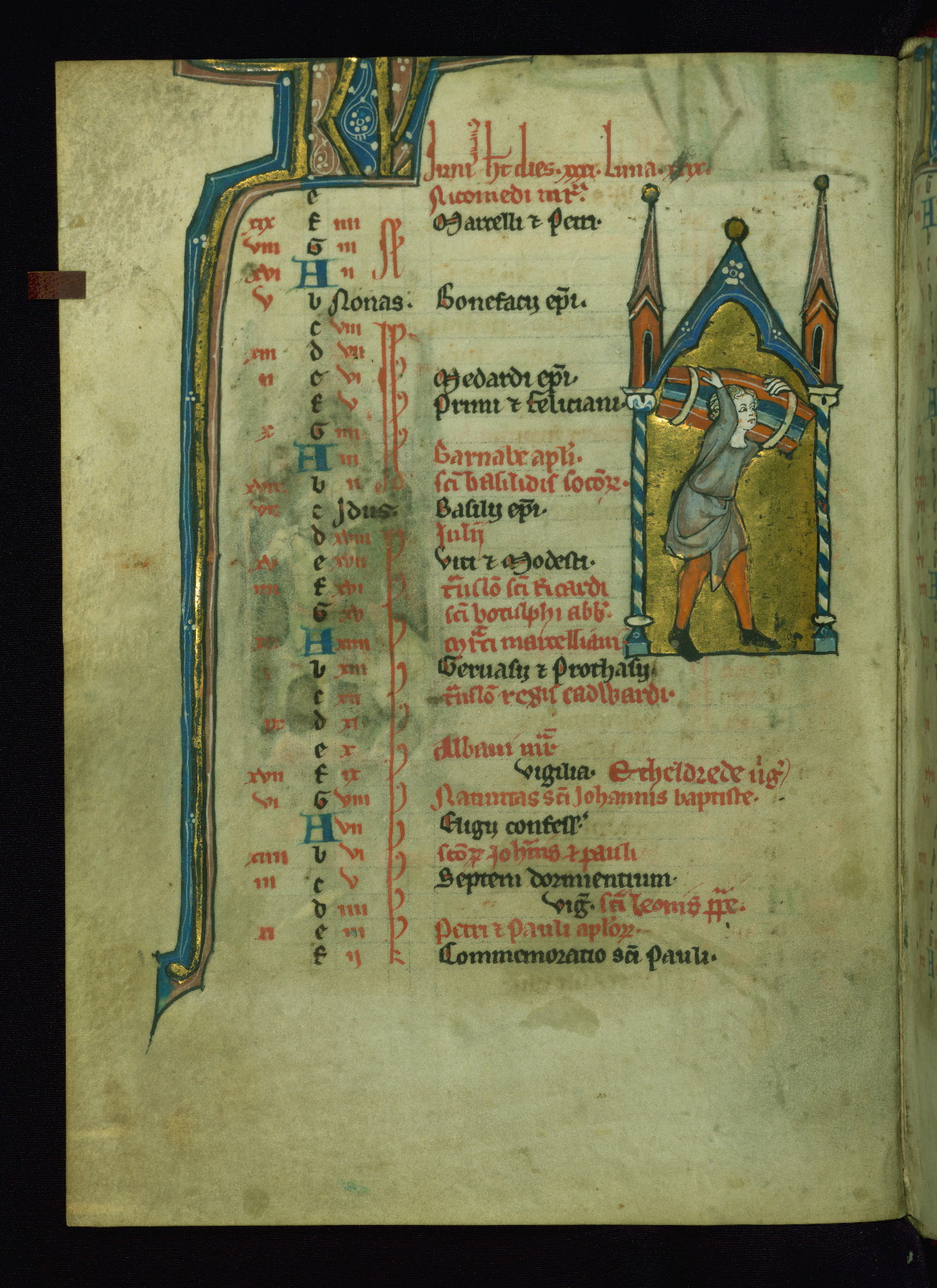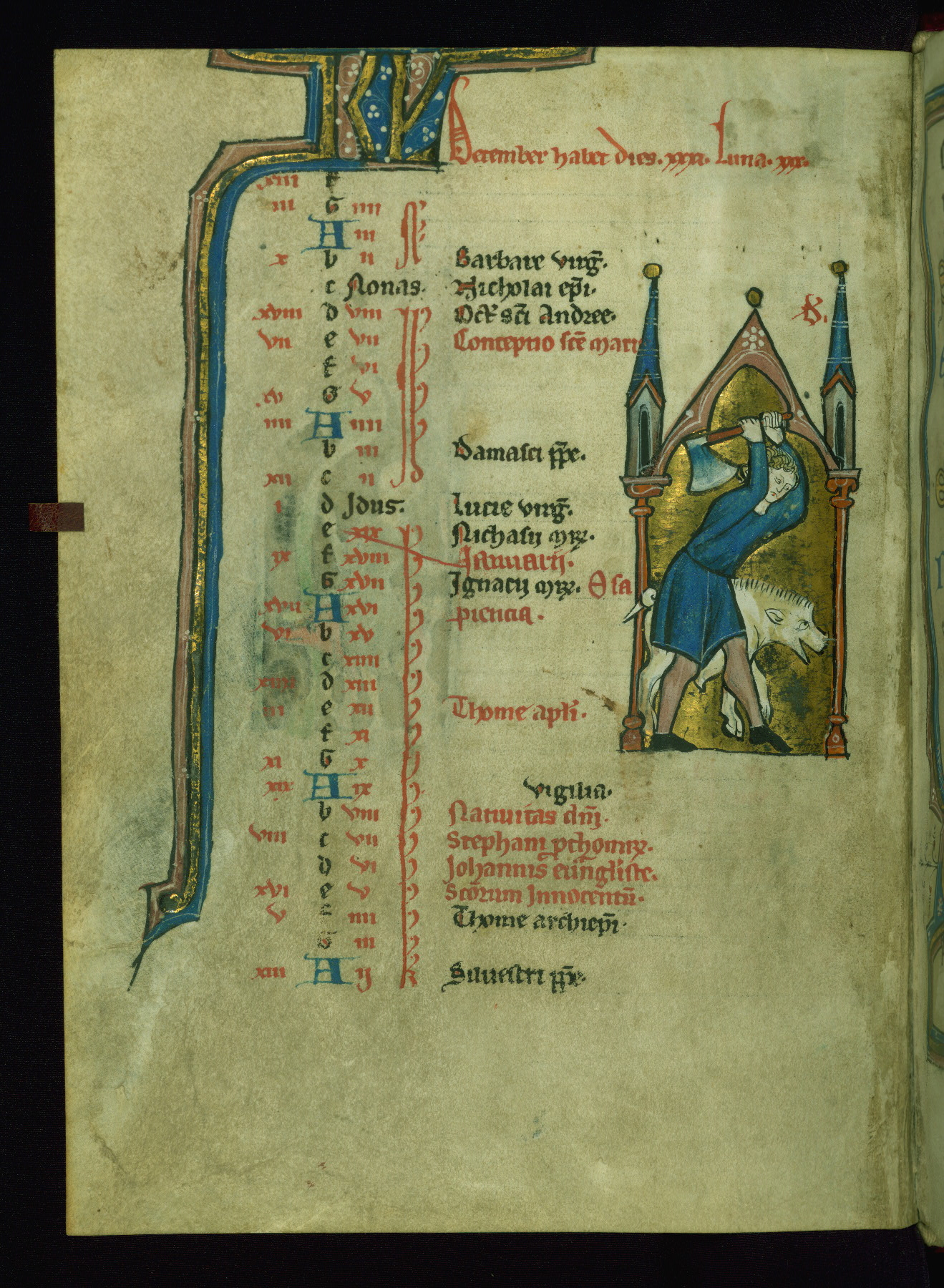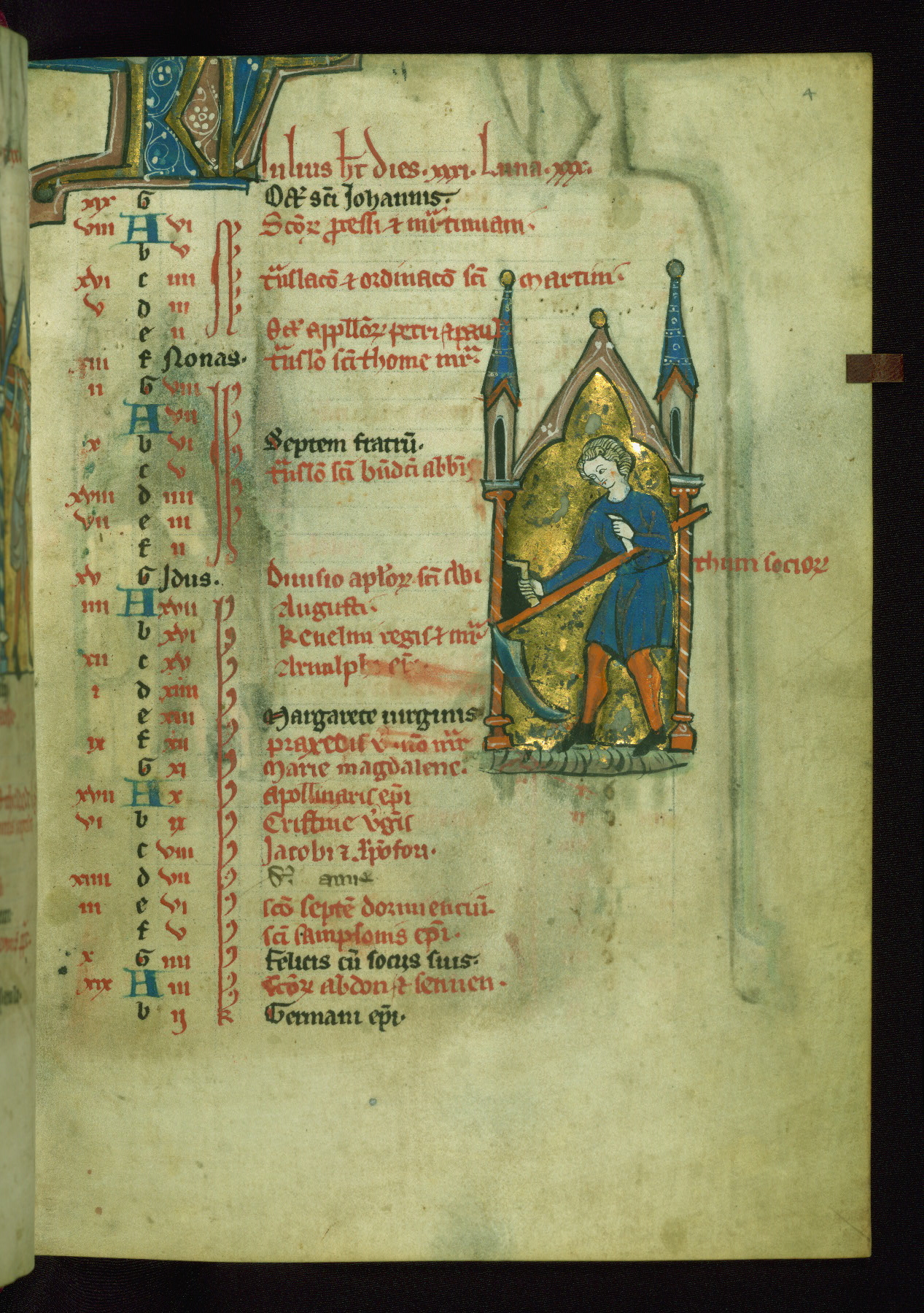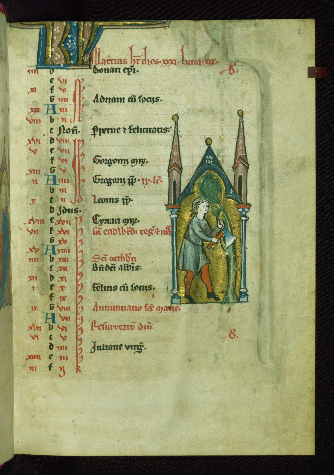 - Contents: Calendar originally a quarter full, closer to half full with fourteenth-century additions in brown ink; graded in red and black; Egyptian days indicated with a "D;" saints of note include Hilary (Jan. 10), Donatus (Mar. 1), Adrian (Mar. 4), Rufus (Apr. 19), Basil (June 14), Donatus (Aug. 7), Remacle (Sept. 3), Cosmas and Damian (Sept. 27), Bavo (Oct. 1), Benedicta (Oct. 8), All Saints (Nov. 1), All Souls (Nov. 2), Ignatius and "O sapiencia"(Dec. 16); added English saints include Wulstan (Jan. 19), Bathildis (Jan. 31), Edward (Mar. 17), Cuthbert (Mar. 20), Augustine (May 26), and the Feast of Relics (Sept. 15)