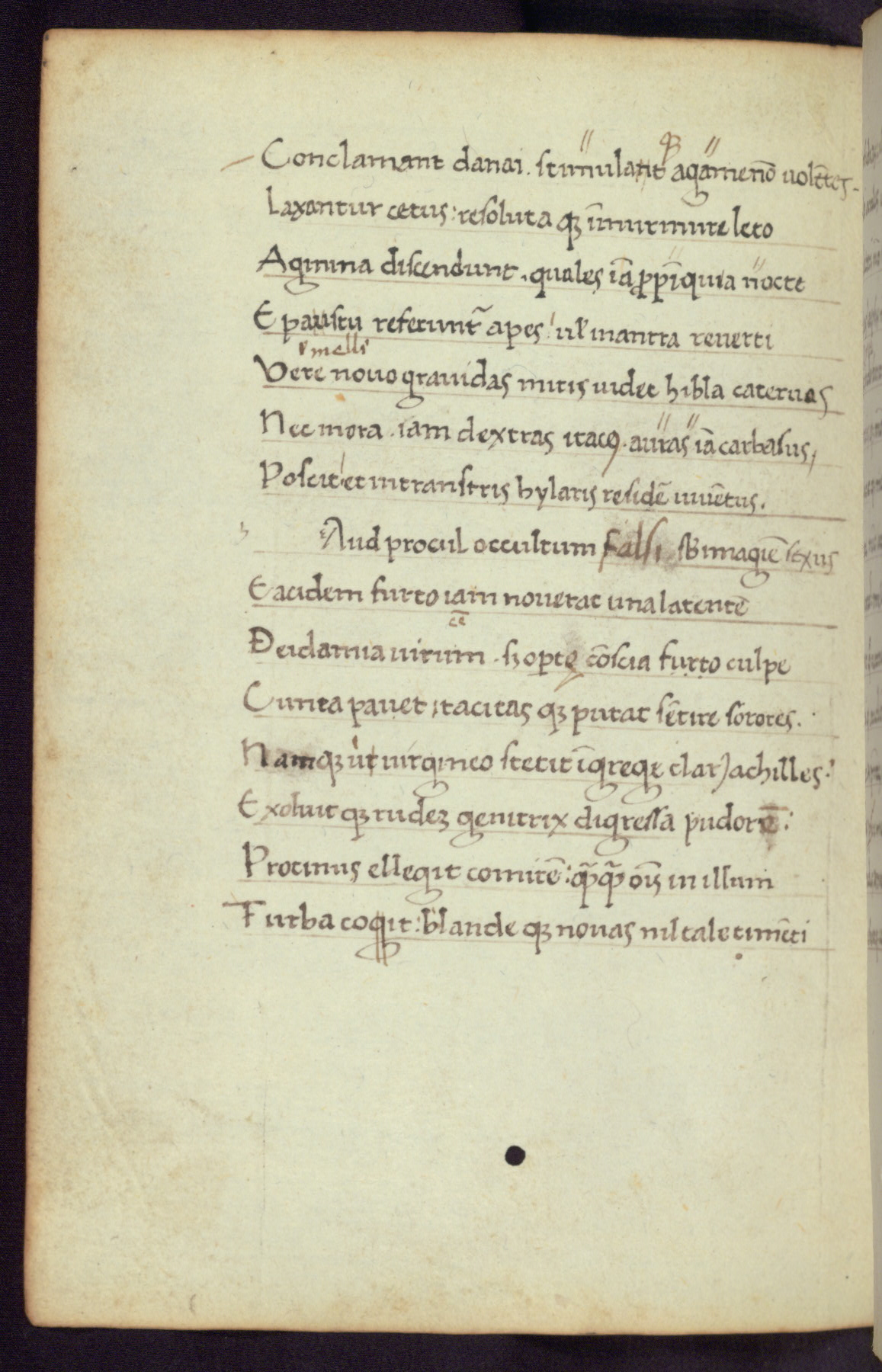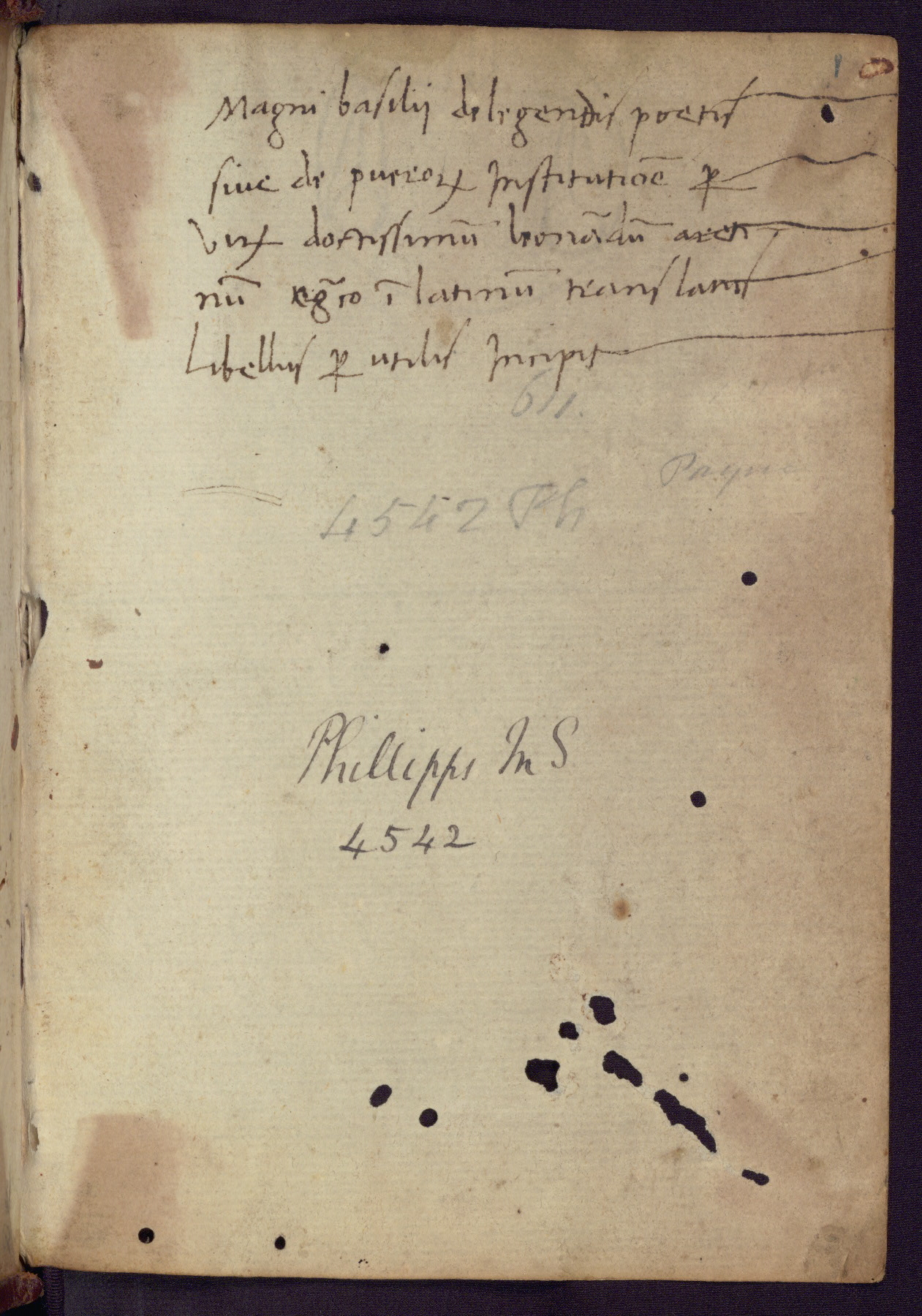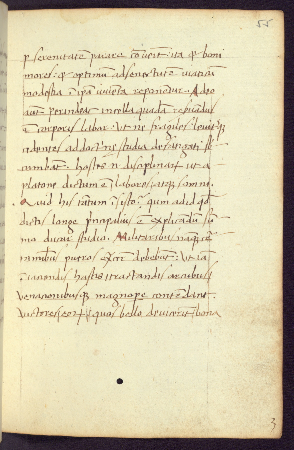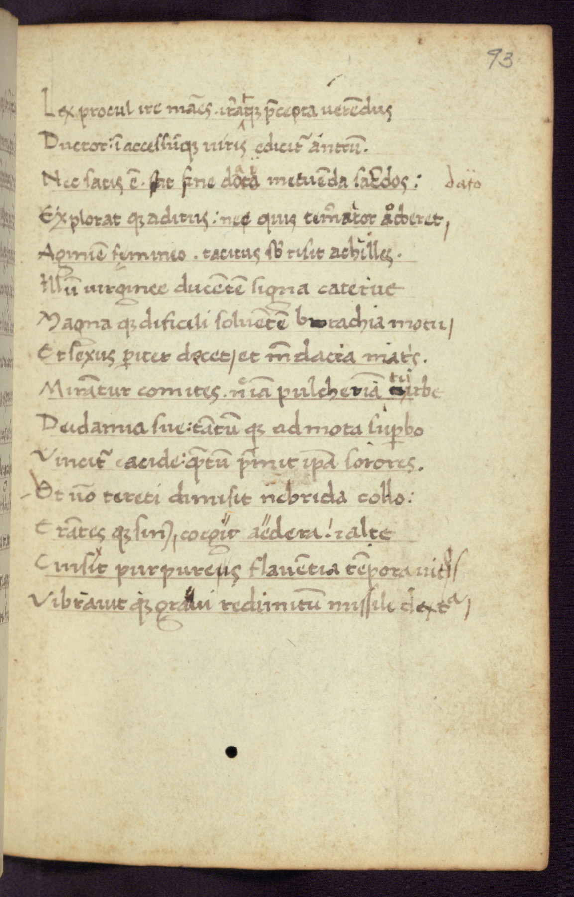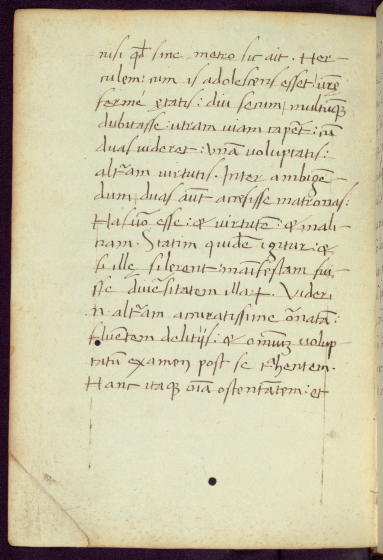 Written in Italy in the third quarter of the fifteenth century, this manuscript contains works by St. Basilius, Pseudo(?) Plutarch, and Statius. The first two texts are Greek treatises on education that were translated into Latin, bearing witness to the Italian humanist revival of, and interest in, the study of ancient Greek. The translators of those texts, Leonardo Bruni (d.1444) and Guarino Veronese (d.1460), both studied Greek under the tutelage of Byzantine scholar Manuel Chrysoloras (d.1415), who was one of the first to introduce Greek literature to Western Europe. The third text by Statius was included as part of a compendium of texts frequently used by students studying Latin beginning in the tenth century. During this same period, Statius was confused with the rhetorician Statius Ursulus of Toulouse, who is mentioned in Jerome’s translation of Eusebius’ chronicles as active in 56 CE. Statius' full Roman name was Publius Papinius Statius, however due to his conflation with the rhetorician in the tenth century, there are a number of manuscripts that begin Statius' name with “Sucurlus” instead of “Publius.” This can be found for instance in an Italian incunabula that is contemporary with W.358, and which is also found in the Walters’ collection (91.1119). This suggests that this error may have been a regional phenomenon in Italy.
