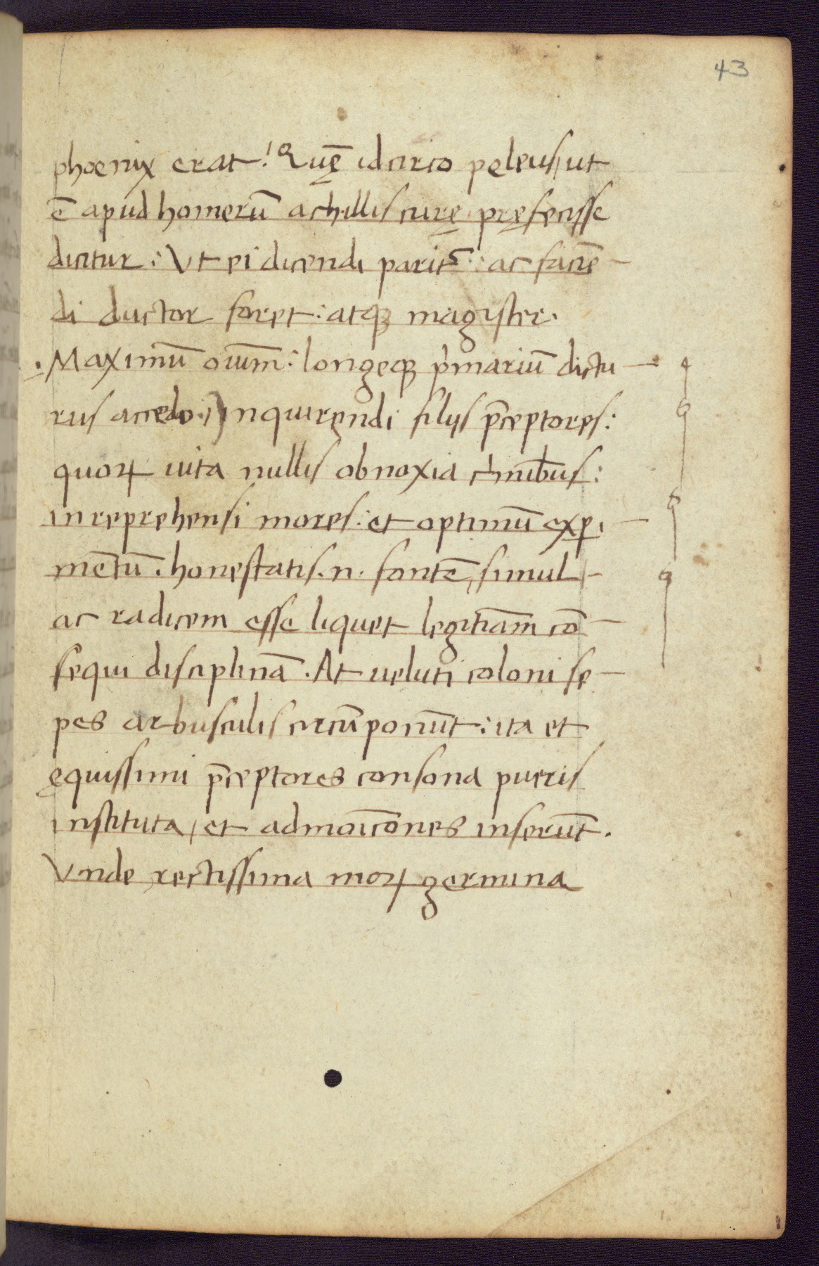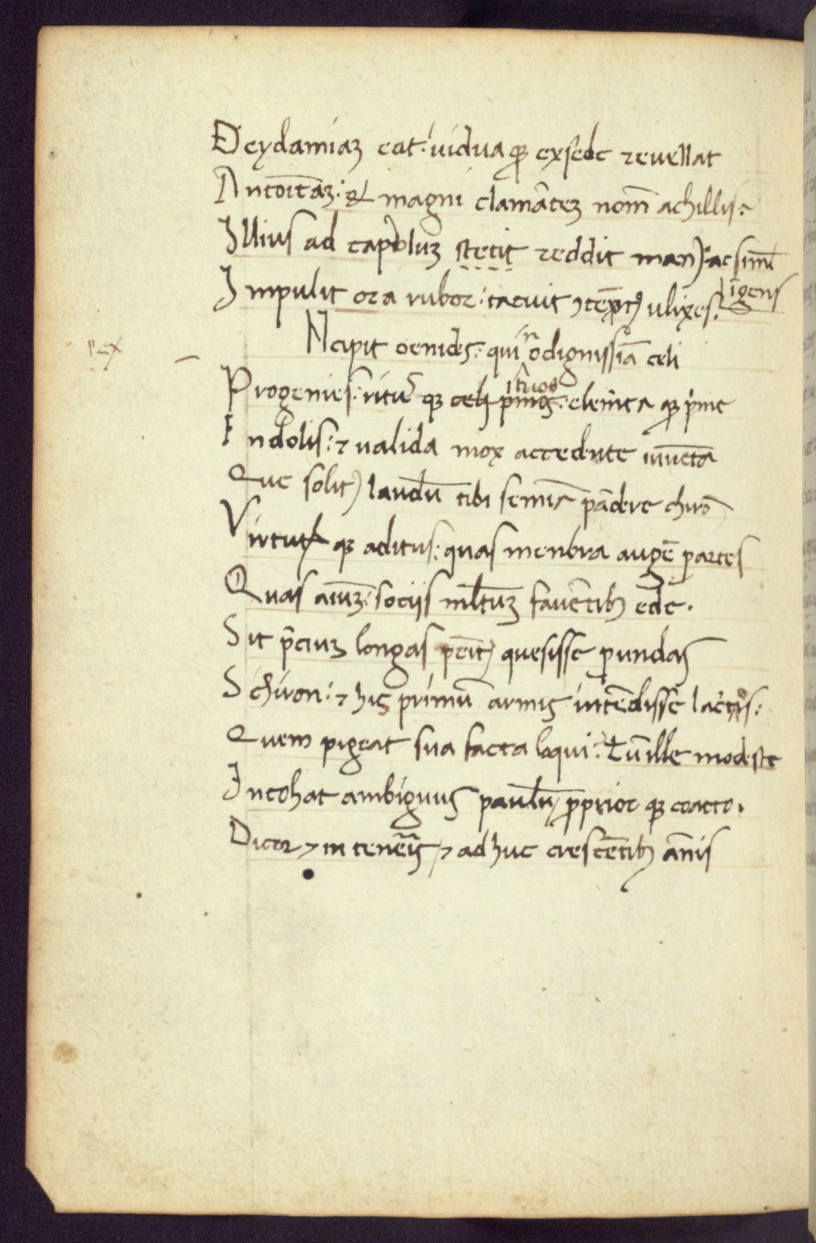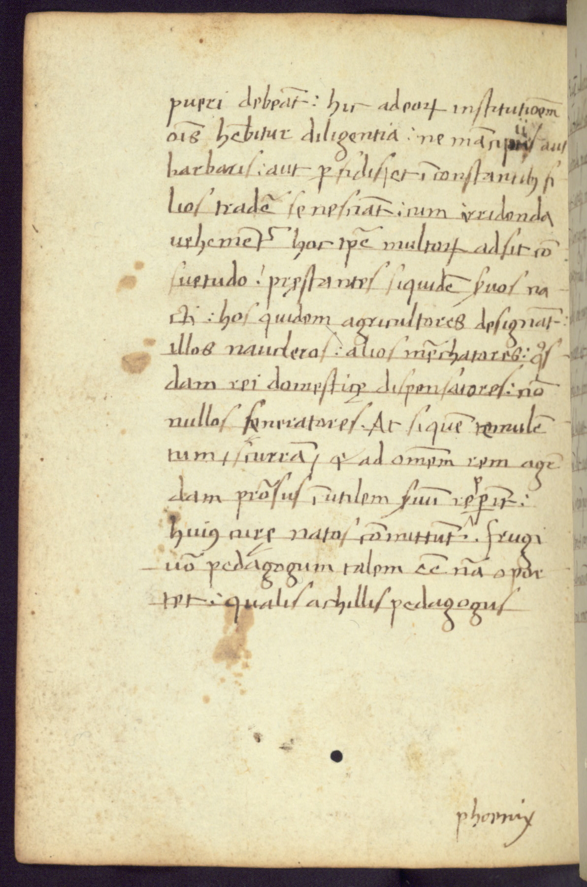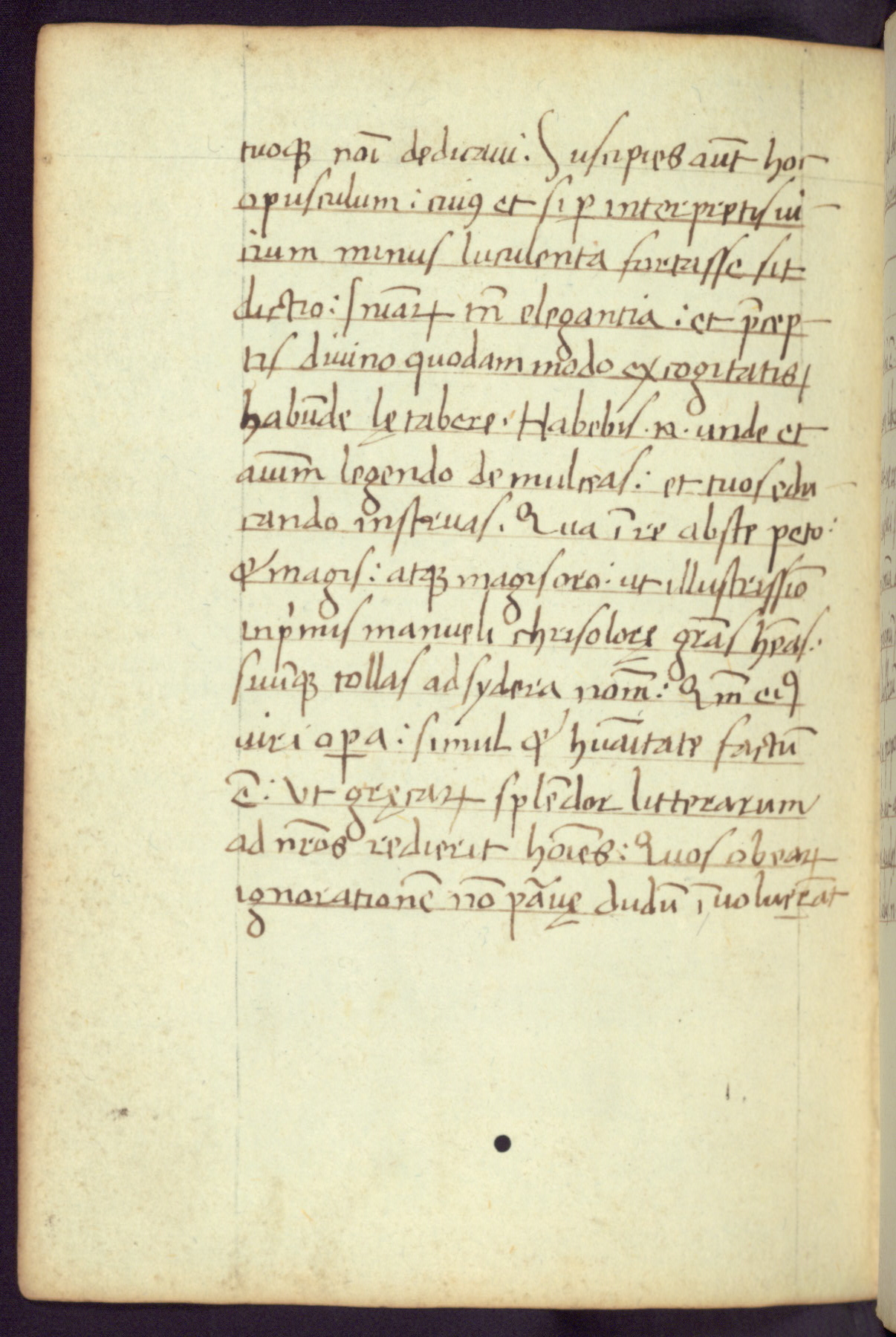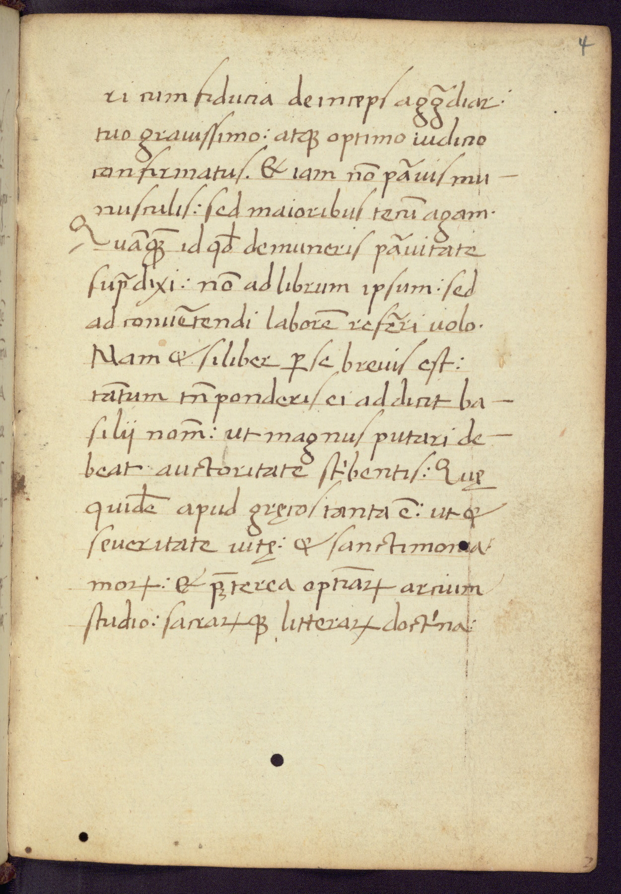Written in Italy in the third quarter of the fifteenth century, this manuscript contains works by St. Basilius, Pseudo(?) Plutarch, and Statius. The first two texts are Greek treatises on education that were translated into Latin, bearing witness to the Italian humanist revival of, and interest in, the study of ancient Greek. The translators of those texts, Leonardo Bruni (d.1444) and Guarino Veronese (d.1460), both studied Greek under the tutelage of Byzantine scholar Manuel Chrysoloras (d.1415), who was one of the first to introduce Greek literature to Western Europe. The third text by Statius was included as part of a compendium of texts frequently used by students studying Latin beginning in the tenth century. During this same period, Statius was confused with the rhetorician Statius Ursulus of Toulouse, who is mentioned in Jerome’s translation of Eusebius’ chronicles as active in 56 CE. Statius' full Roman name was Publius Papinius Statius, however due to his conflation with the rhetorician in the tenth century, there are a number of manuscripts that begin Statius' name with “Sucurlus” instead of “Publius.” This can be found for instance in an Italian incunabula that is contemporary with W.358, and which is also found in the Walters’ collection (91.1119). This suggests that this error may have been a regional phenomenon in Italy.