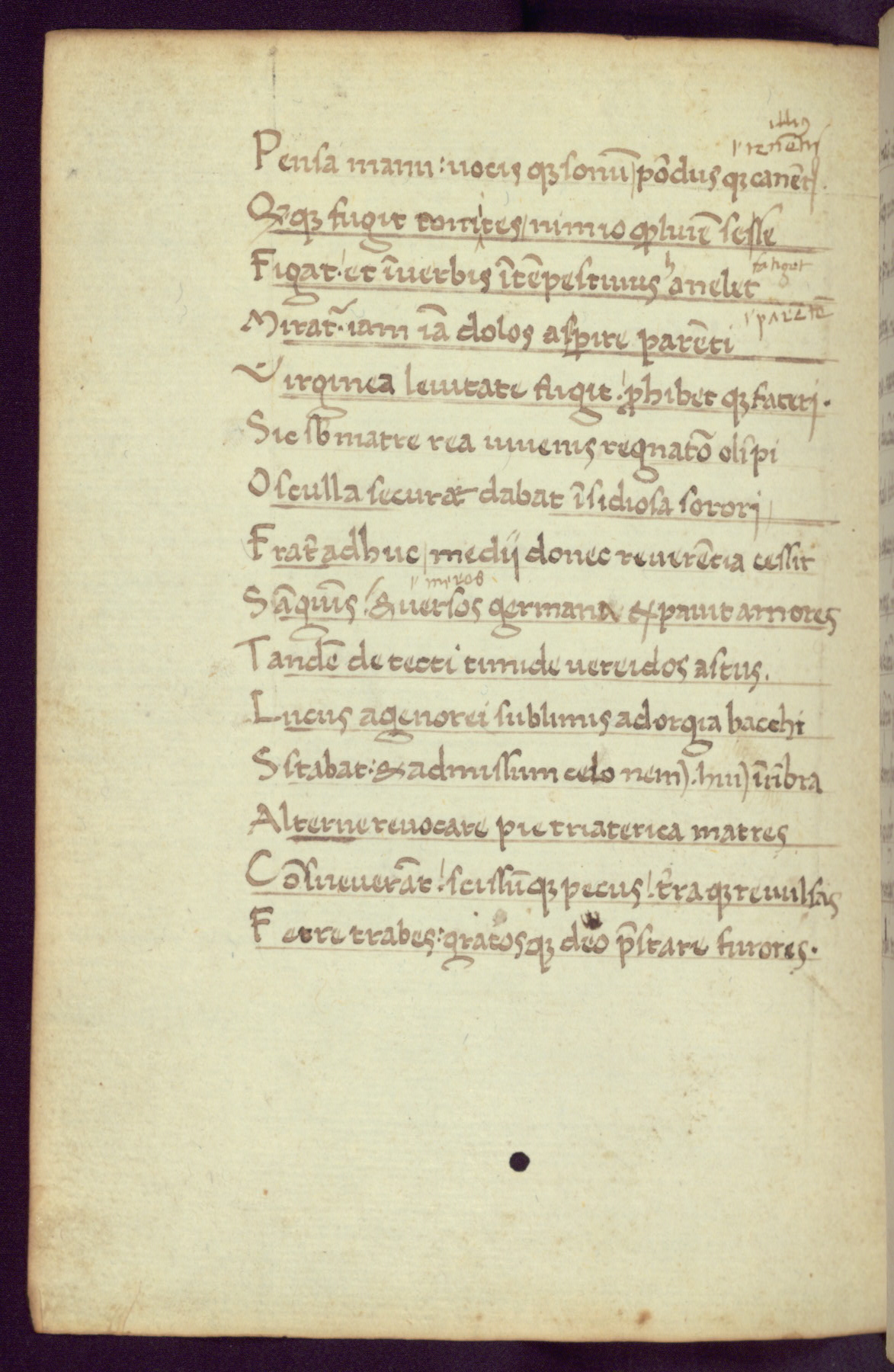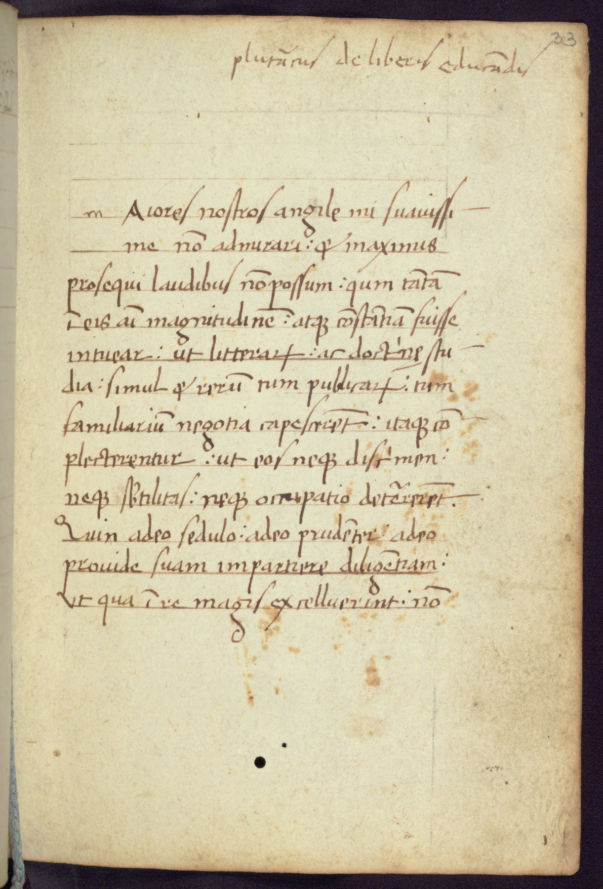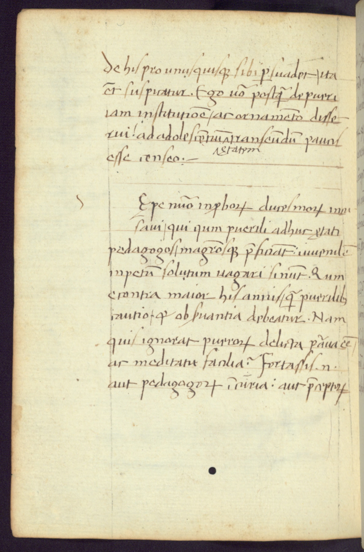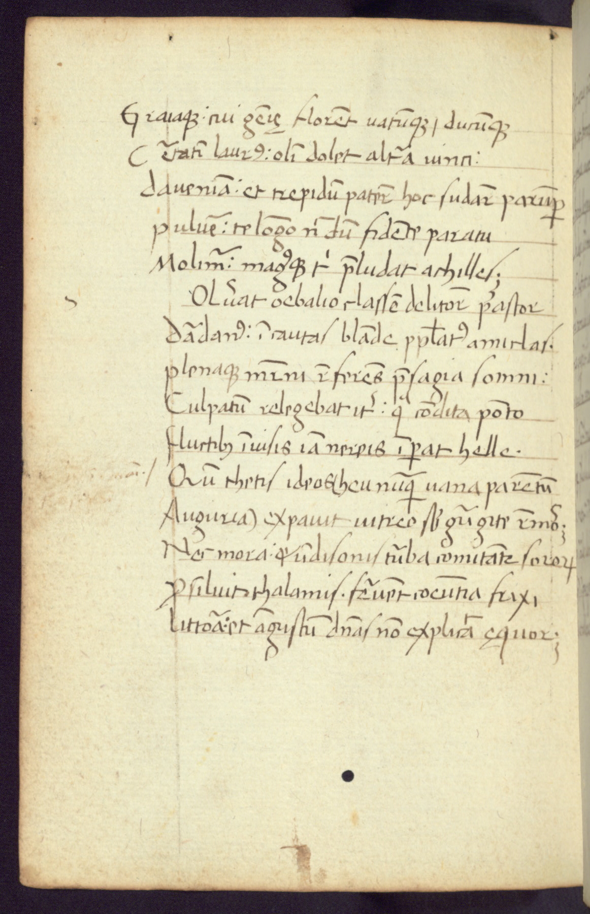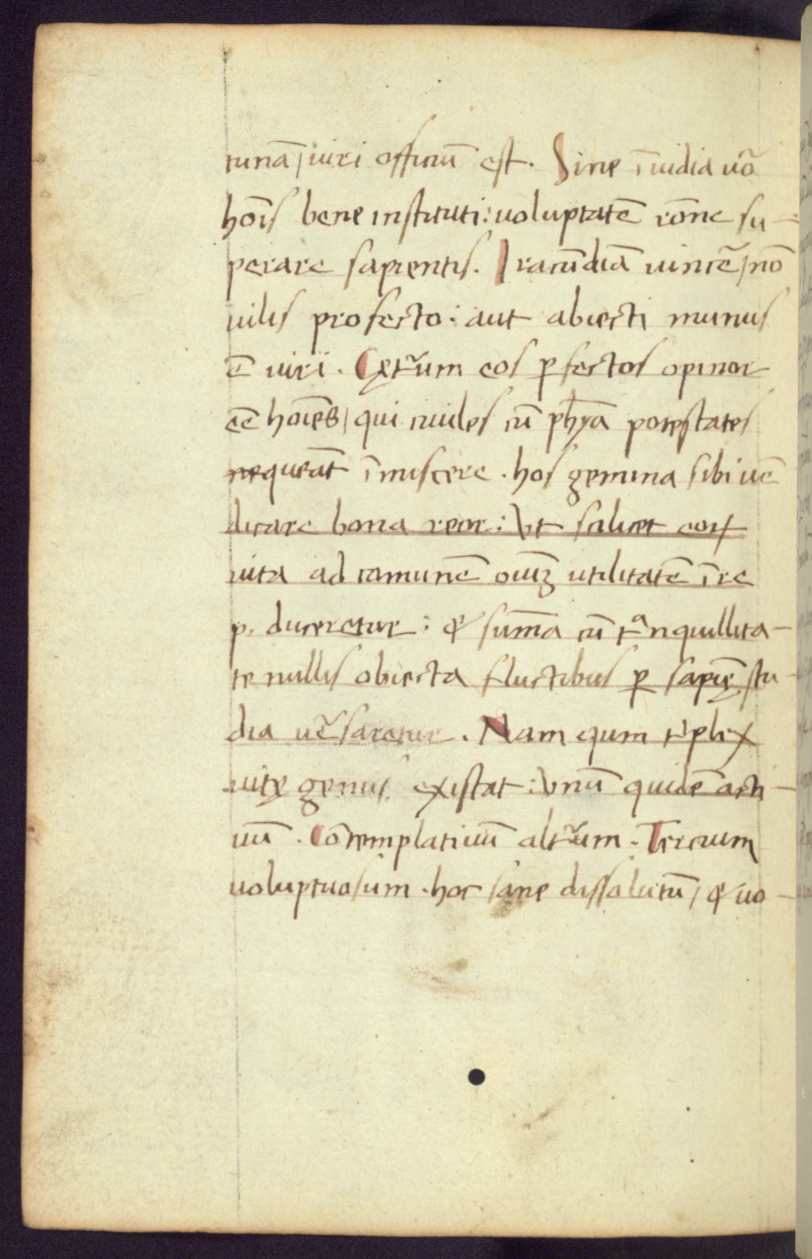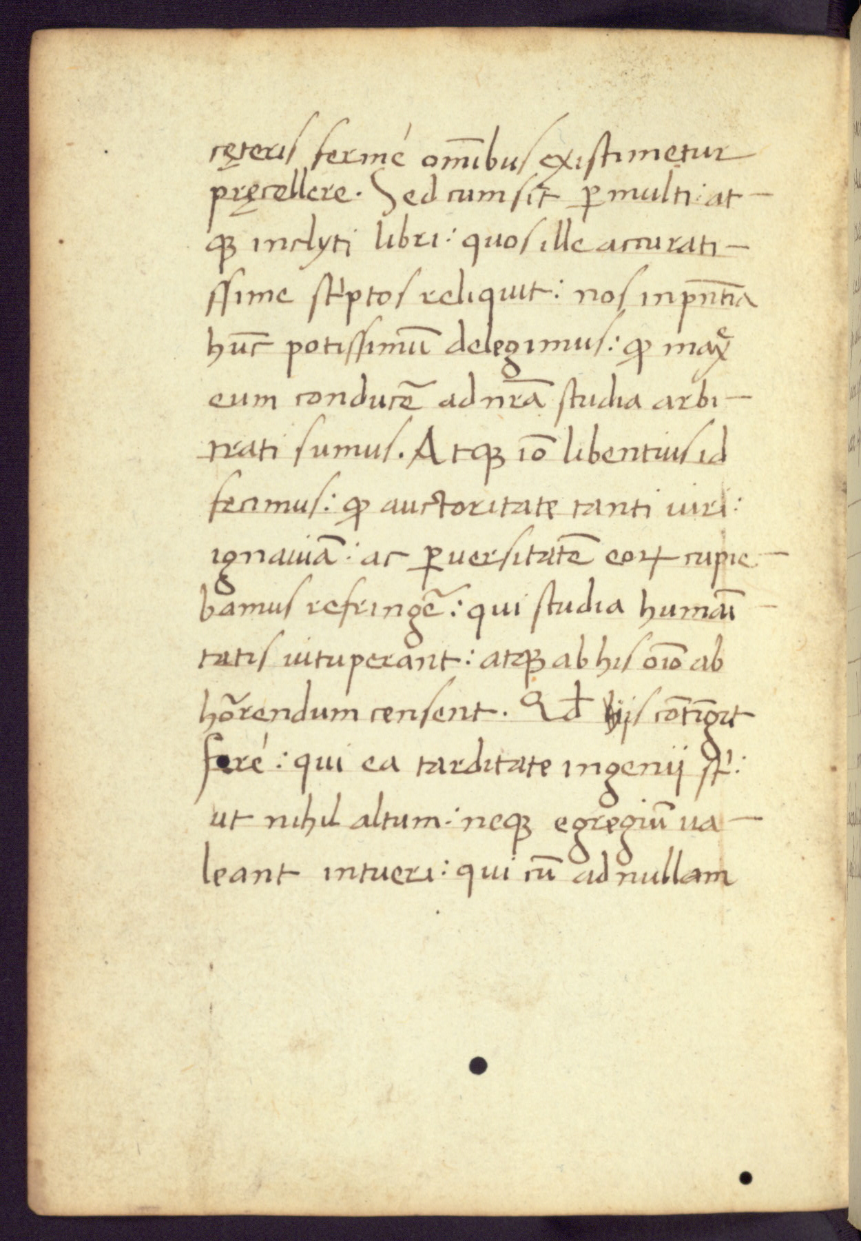 Written in Italy in the third quarter of the fifteenth century, this manuscript contains works by St. Basilius, Pseudo(?) Plutarch, and Statius. The first two texts are Greek treatises on education that were translated into Latin, bearing witness to the Italian humanist revival of, and interest in, the study of ancient Greek. The translators of those texts, Leonardo Bruni (d.1444) and Guarino Veronese (d.1460), both studied Greek under the tutelage of Byzantine scholar Manuel Chrysoloras (d.1415), who was one of the first to introduce Greek literature to Western Europe. The third text by Statius was included as part of a compendium of texts frequently used by students studying Latin beginning in the tenth century. During this same period, Statius was confused with the rhetorician Statius Ursulus of Toulouse, who is mentioned in Jerome’s translation of Eusebius’ chronicles as active in 56 CE. Statius' full Roman name was Publius Papinius Statius, however due to his conflation with the rhetorician in the tenth century, there are a number of manuscripts that begin Statius' name with “Sucurlus” instead of “Publius.” This can be found for instance in an Italian incunabula that is contemporary with W.358, and which is also found in the Walters’ collection (91.1119). This suggests that this error may have been a regional phenomenon in Italy.