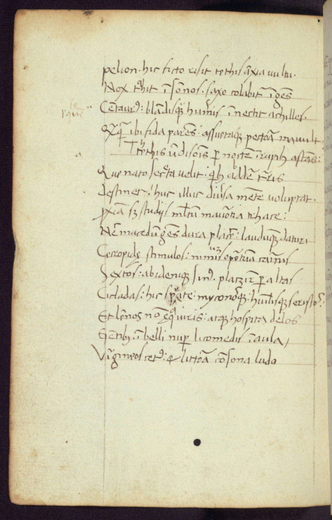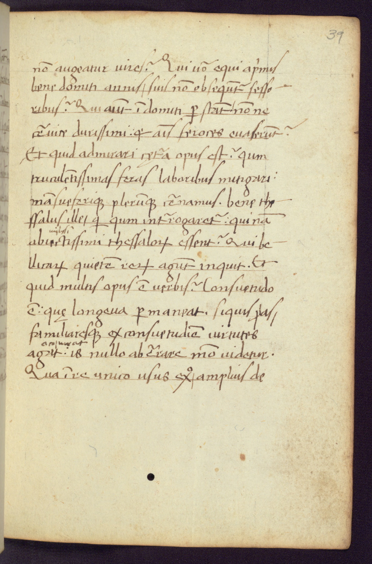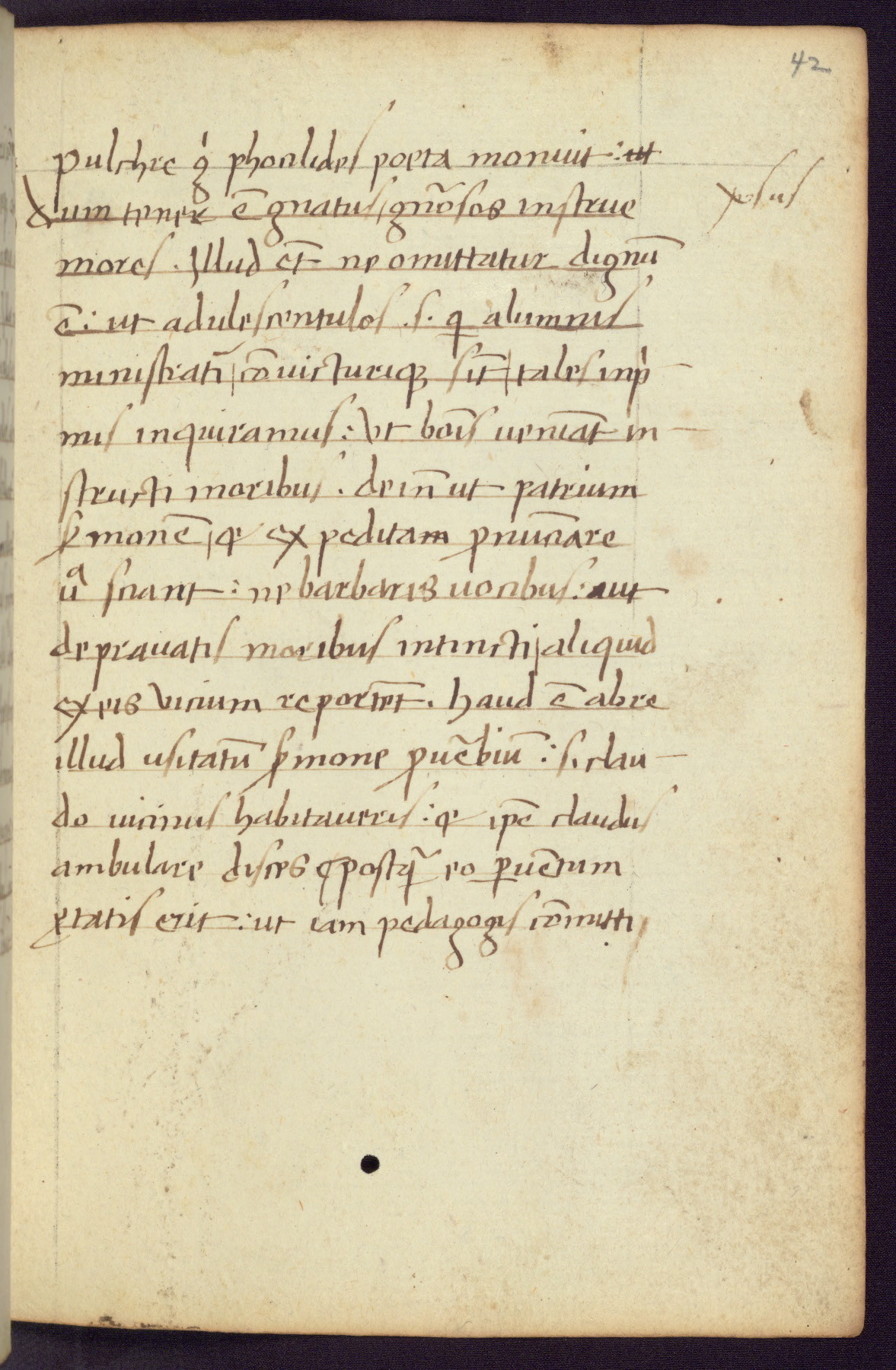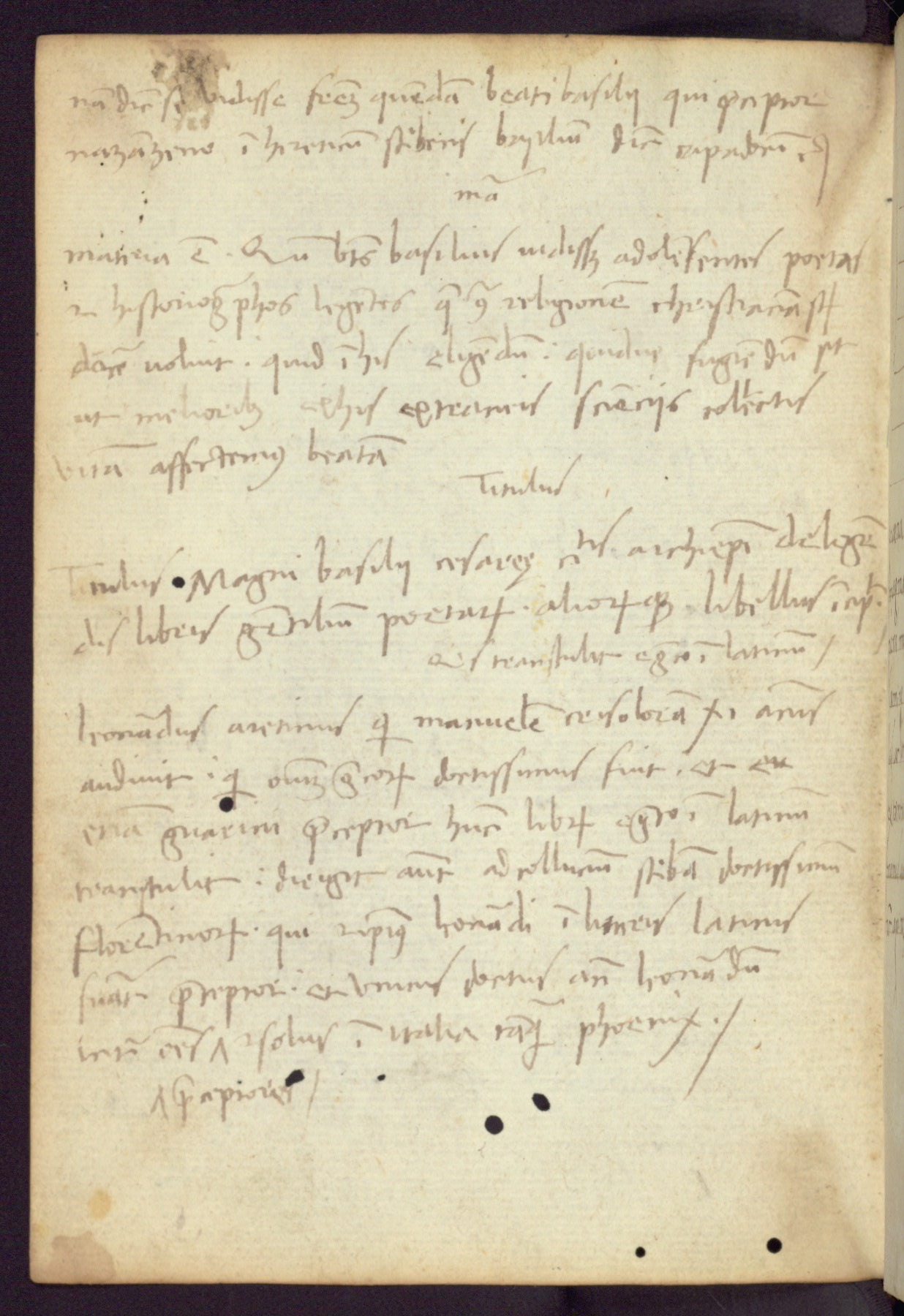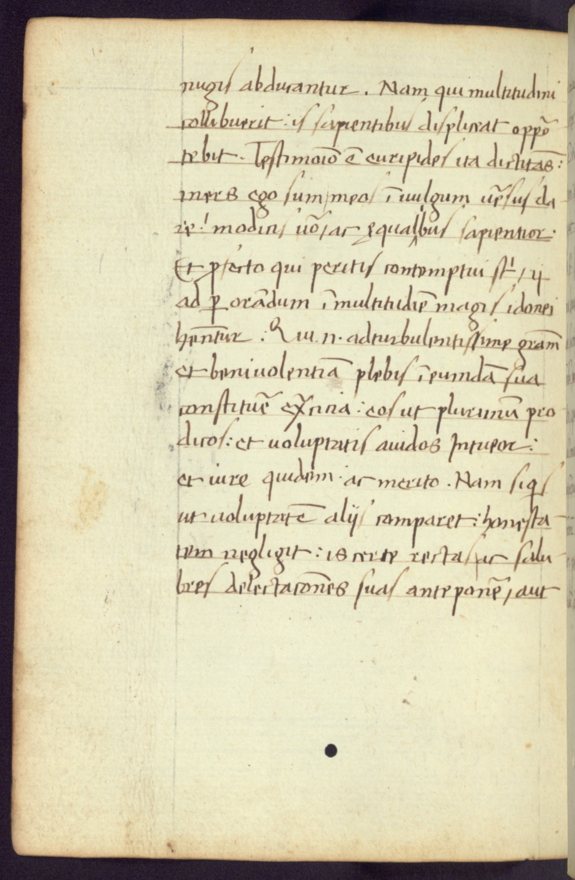 Written in Italy in the third quarter of the fifteenth century, this manuscript contains works by St. Basilius, Pseudo(?) Plutarch, and Statius. The first two texts are Greek treatises on education that were translated into Latin, bearing witness to the Italian humanist revival of, and interest in, the study of ancient Greek. The translators of those texts, Leonardo Bruni (d.1444) and Guarino Veronese (d.1460), both studied Greek under the tutelage of Byzantine scholar Manuel Chrysoloras (d.1415), who was one of the first to introduce Greek literature to Western Europe. The third text by Statius was included as part of a compendium of texts frequently used by students studying Latin beginning in the tenth century. During this same period, Statius was confused with the rhetorician Statius Ursulus of Toulouse, who is mentioned in Jerome’s translation of Eusebius’ chronicles as active in 56 CE. Statius' full Roman name was Publius Papinius Statius, however due to his conflation with the rhetorician in the tenth century, there are a number of manuscripts that begin Statius' name with “Sucurlus” instead of “Publius.” This can be found for instance in an Italian incunabula that is contemporary with W.358, and which is also found in the Walters’ collection (91.1119). This suggests that this error may have been a regional phenomenon in Italy.