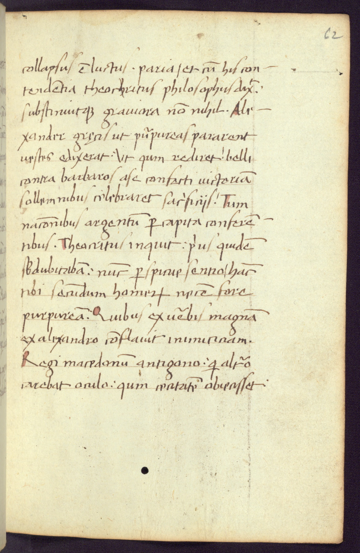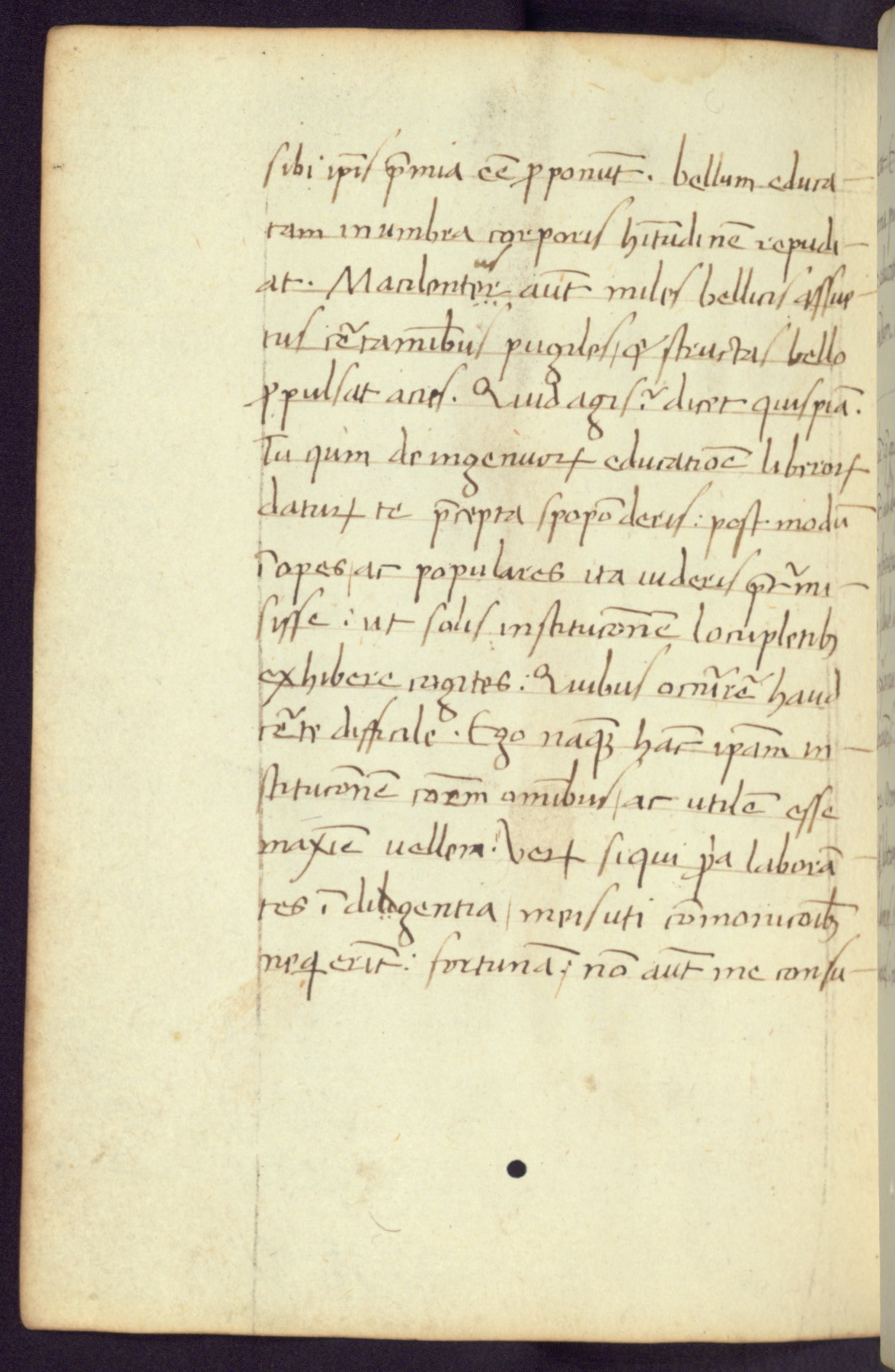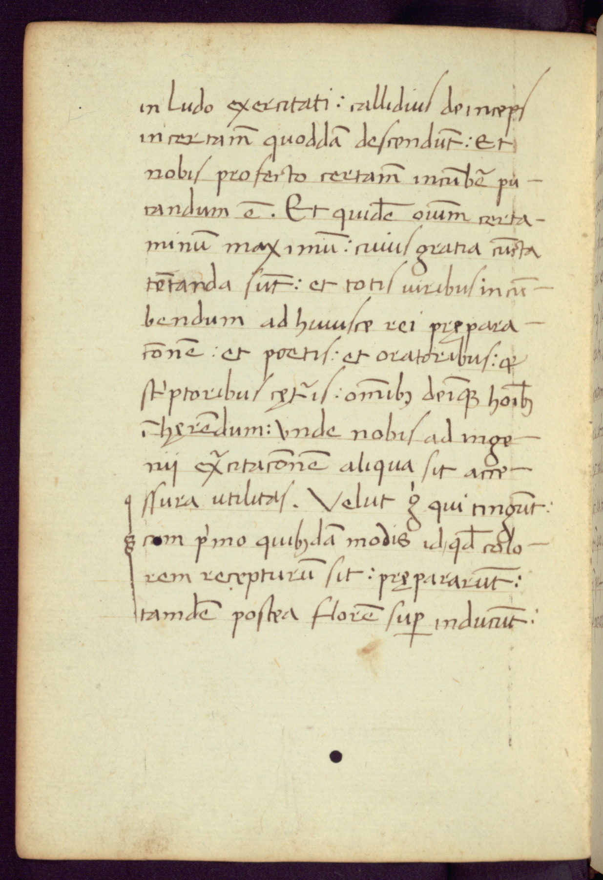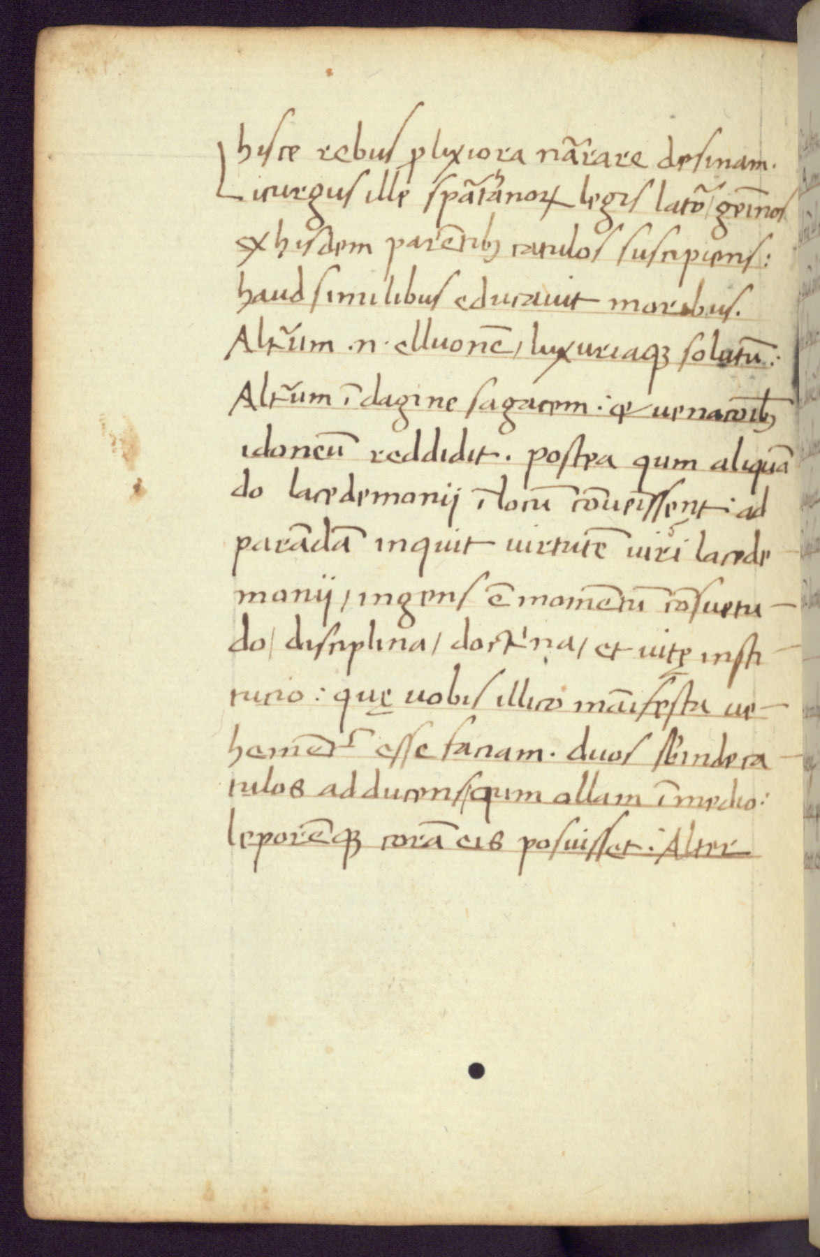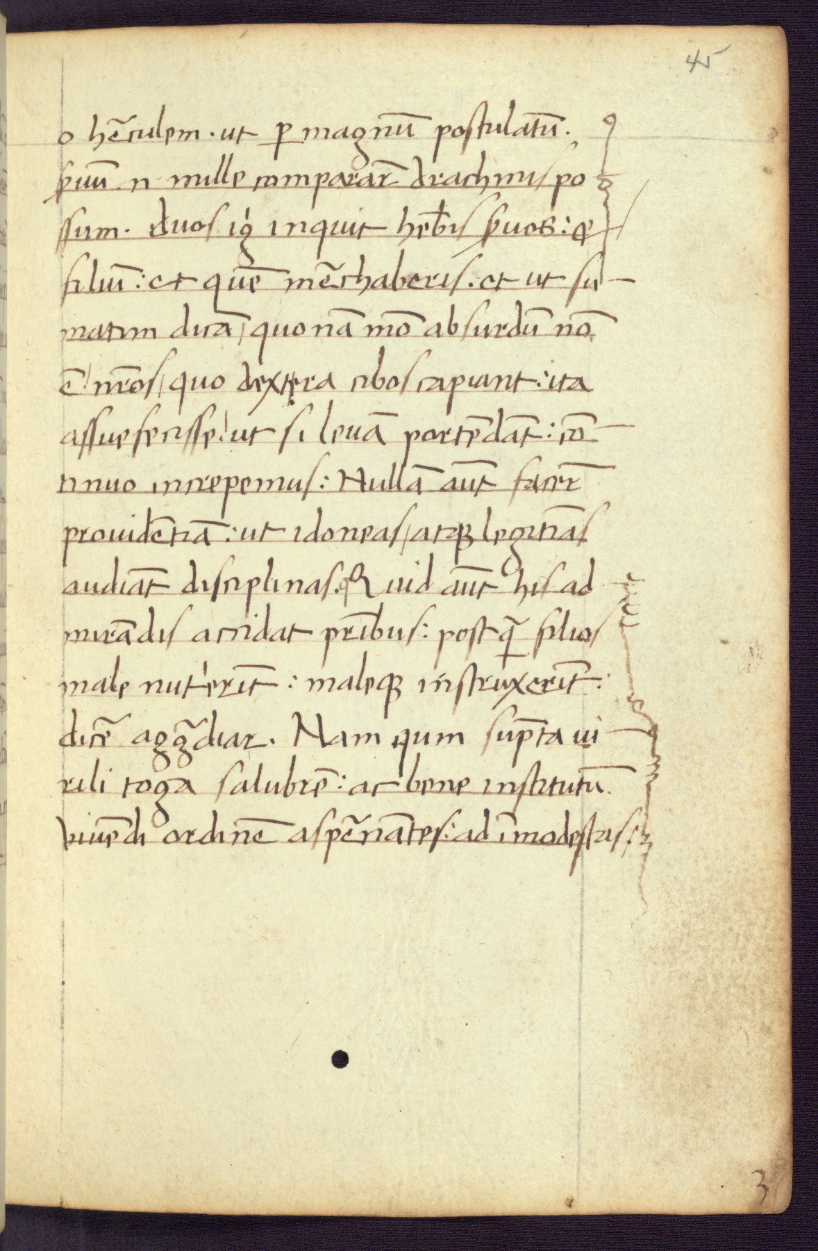 Written in Italy in the third quarter of the fifteenth century, this manuscript contains works by St. Basilius, Pseudo(?) Plutarch, and Statius. The first two texts are Greek treatises on education that were translated into Latin, bearing witness to the Italian humanist revival of, and interest in, the study of ancient Greek. The translators of those texts, Leonardo Bruni (d.1444) and Guarino Veronese (d.1460), both studied Greek under the tutelage of Byzantine scholar Manuel Chrysoloras (d.1415), who was one of the first to introduce Greek literature to Western Europe. The third text by Statius was included as part of a compendium of texts frequently used by students studying Latin beginning in the tenth century. During this same period, Statius was confused with the rhetorician Statius Ursulus of Toulouse, who is mentioned in Jerome’s translation of Eusebius’ chronicles as active in 56 CE. Statius' full Roman name was Publius Papinius Statius, however due to his conflation with the rhetorician in the tenth century, there are a number of manuscripts that begin Statius' name with “Sucurlus” instead of “Publius.” This can be found for instance in an Italian incunabula that is contemporary with W.358, and which is also found in the Walters’ collection (91.1119). This suggests that this error may have been a regional phenomenon in Italy.