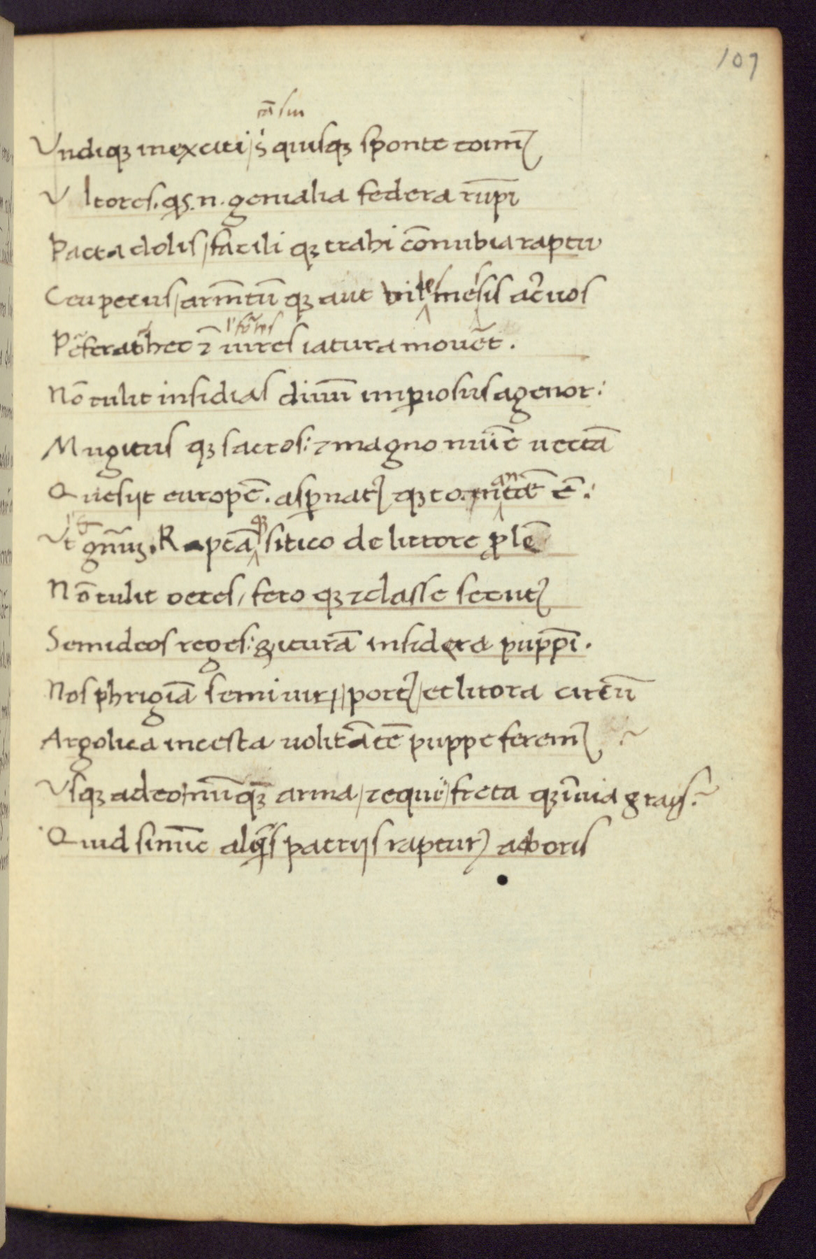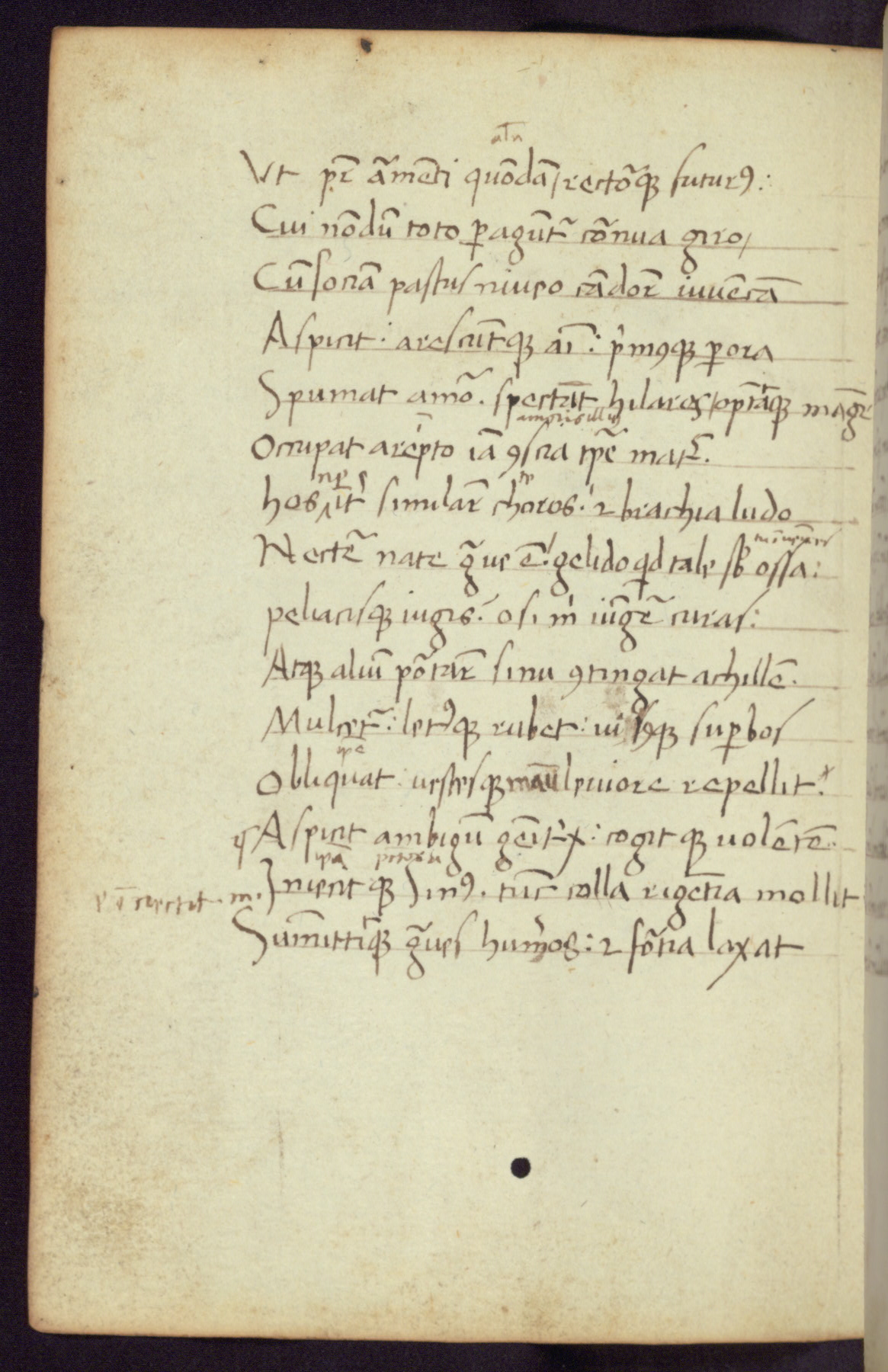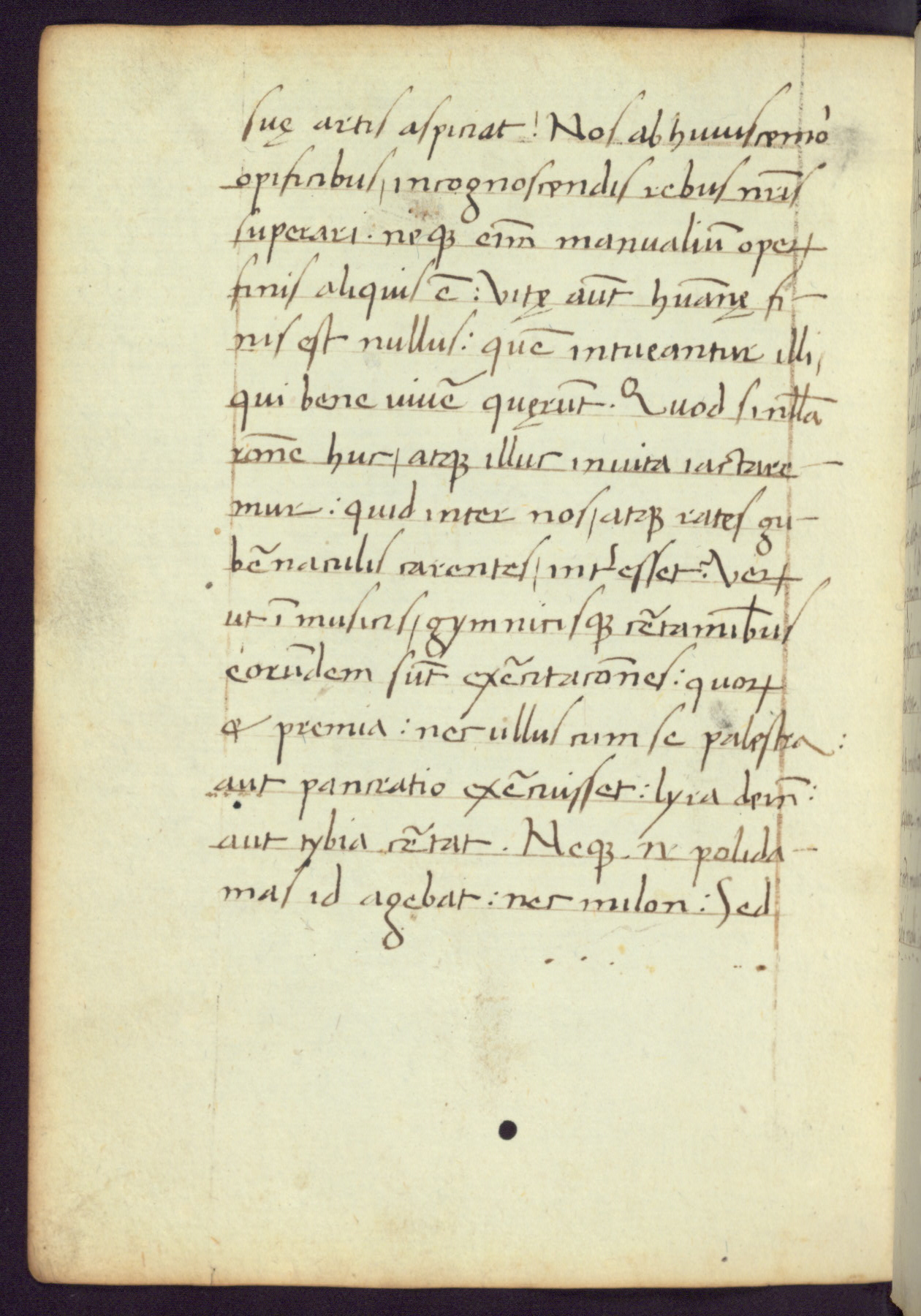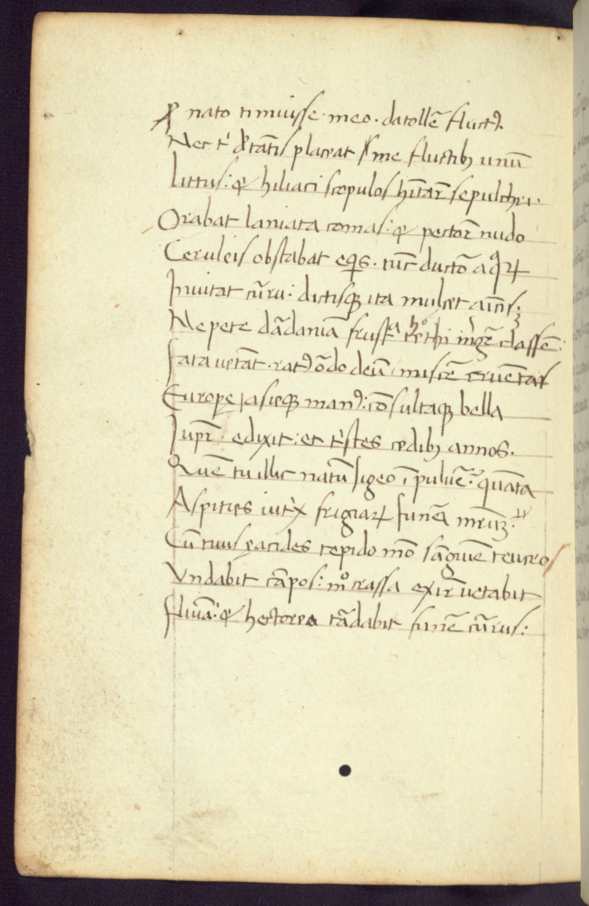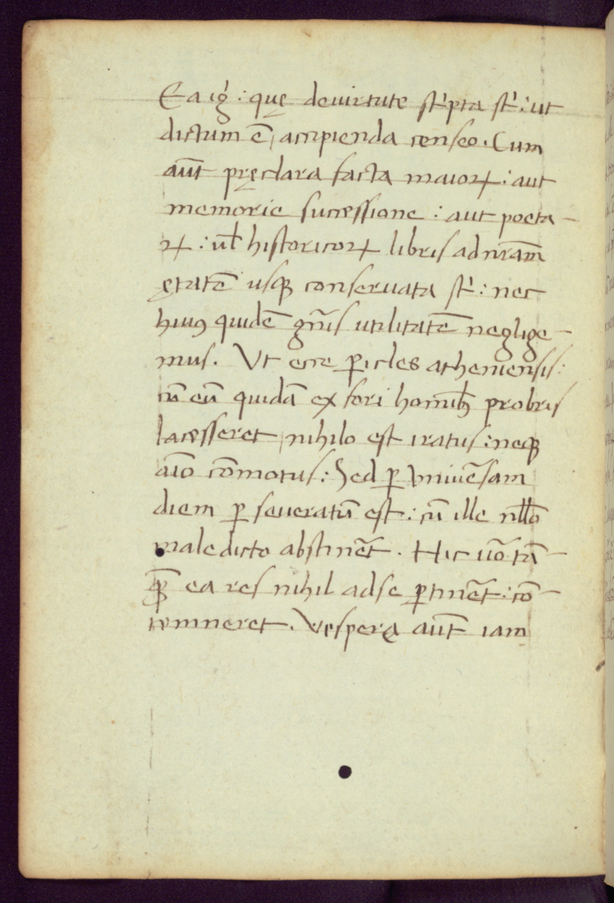 Written in Italy in the third quarter of the fifteenth century, this manuscript contains works by St. Basilius, Pseudo(?) Plutarch, and Statius. The first two texts are Greek treatises on education that were translated into Latin, bearing witness to the Italian humanist revival of, and interest in, the study of ancient Greek. The translators of those texts, Leonardo Bruni (d.1444) and Guarino Veronese (d.1460), both studied Greek under the tutelage of Byzantine scholar Manuel Chrysoloras (d.1415), who was one of the first to introduce Greek literature to Western Europe. The third text by Statius was included as part of a compendium of texts frequently used by students studying Latin beginning in the tenth century. During this same period, Statius was confused with the rhetorician Statius Ursulus of Toulouse, who is mentioned in Jerome’s translation of Eusebius’ chronicles as active in 56 CE. Statius' full Roman name was Publius Papinius Statius, however due to his conflation with the rhetorician in the tenth century, there are a number of manuscripts that begin Statius' name with “Sucurlus” instead of “Publius.” This can be found for instance in an Italian incunabula that is contemporary with W.358, and which is also found in the Walters’ collection (91.1119). This suggests that this error may have been a regional phenomenon in Italy.
