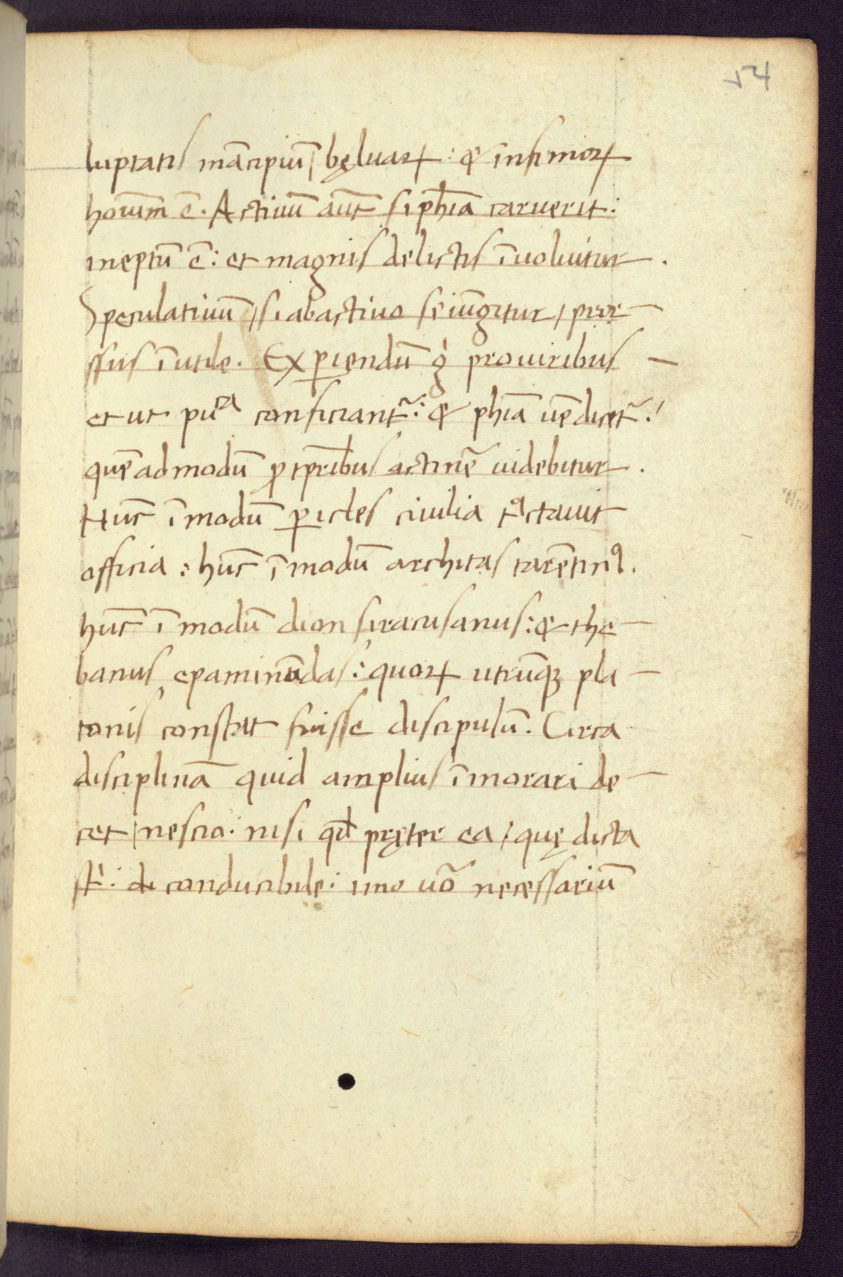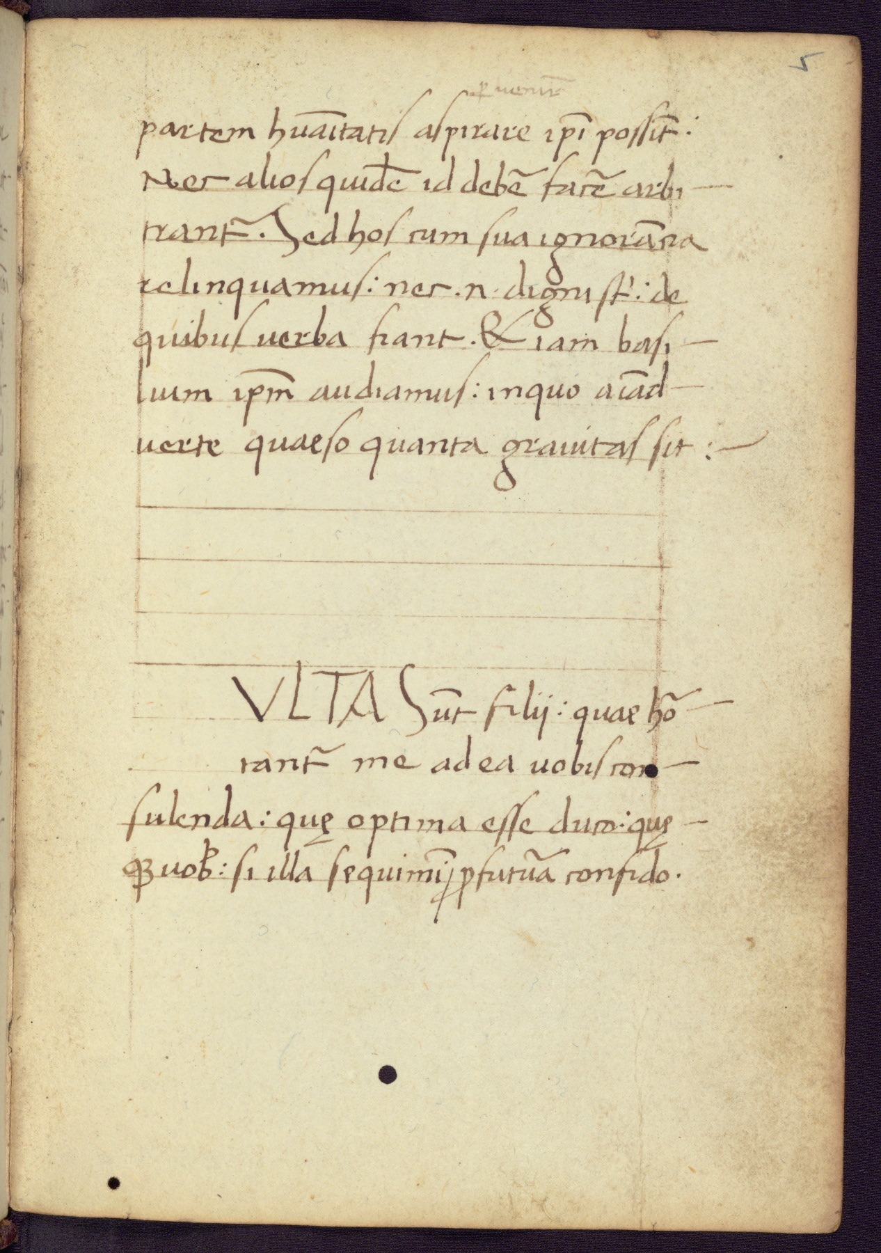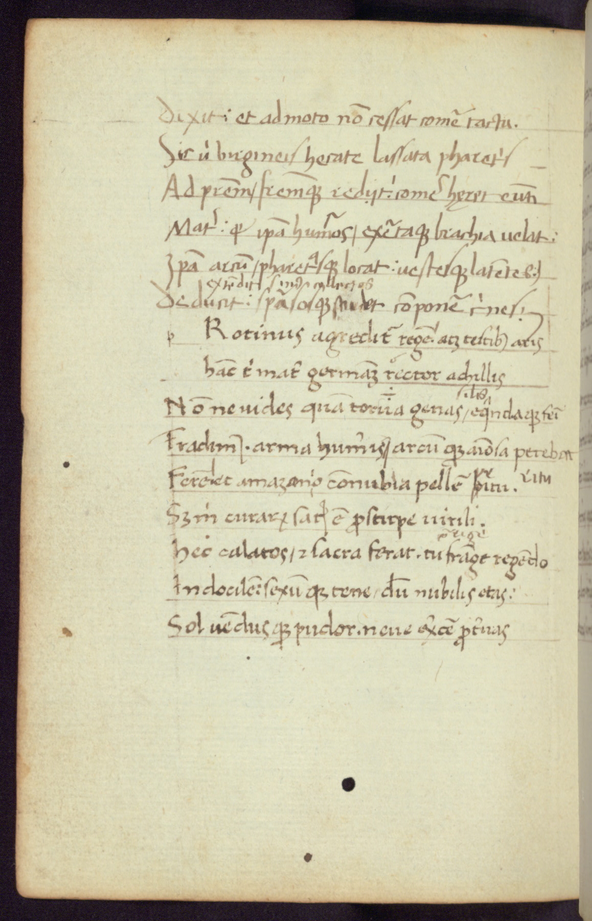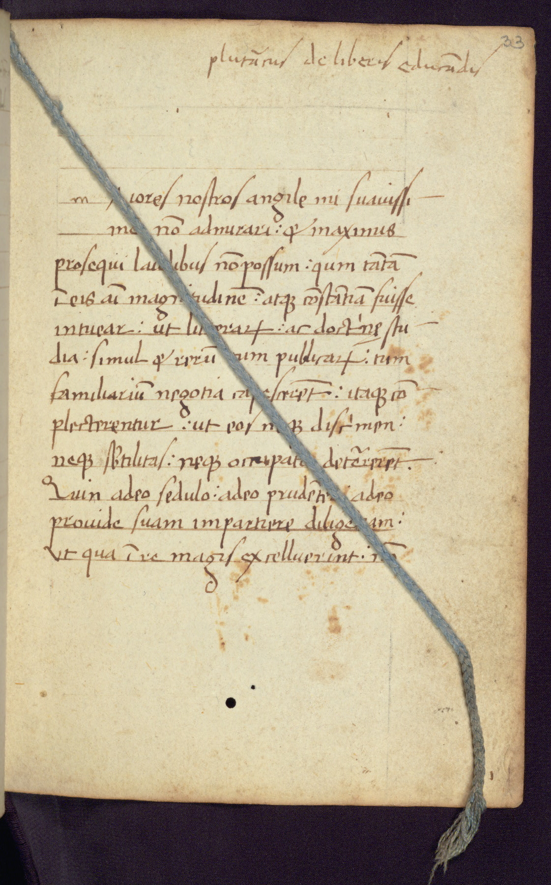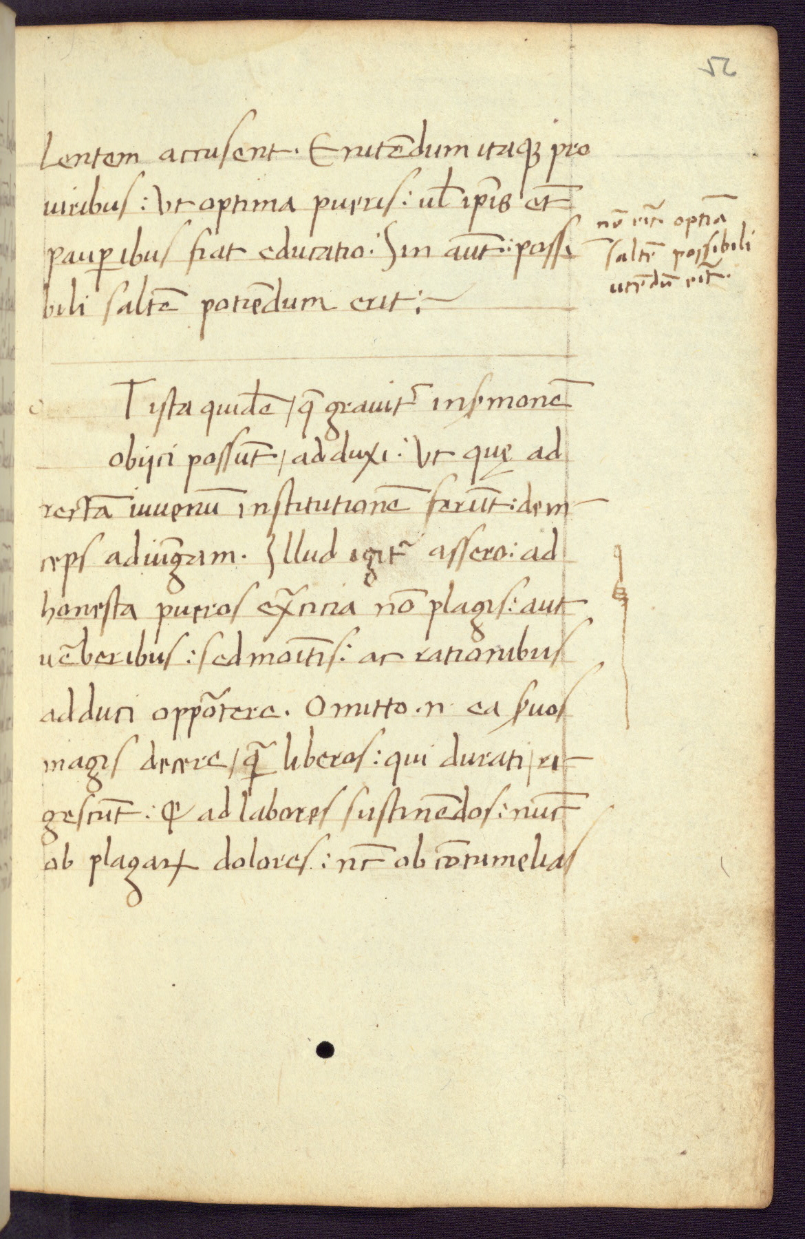 Written in Italy in the third quarter of the fifteenth century, this manuscript contains works by St. Basilius, Pseudo(?) Plutarch, and Statius. The first two texts are Greek treatises on education that were translated into Latin, bearing witness to the Italian humanist revival of, and interest in, the study of ancient Greek. The translators of those texts, Leonardo Bruni (d.1444) and Guarino Veronese (d.1460), both studied Greek under the tutelage of Byzantine scholar Manuel Chrysoloras (d.1415), who was one of the first to introduce Greek literature to Western Europe. The third text by Statius was included as part of a compendium of texts frequently used by students studying Latin beginning in the tenth century. During this same period, Statius was confused with the rhetorician Statius Ursulus of Toulouse, who is mentioned in Jerome’s translation of Eusebius’ chronicles as active in 56 CE. Statius' full Roman name was Publius Papinius Statius, however due to his conflation with the rhetorician in the tenth century, there are a number of manuscripts that begin Statius' name with “Sucurlus” instead of “Publius.” This can be found for instance in an Italian incunabula that is contemporary with W.358, and which is also found in the Walters’ collection (91.1119). This suggests that this error may have been a regional phenomenon in Italy.
