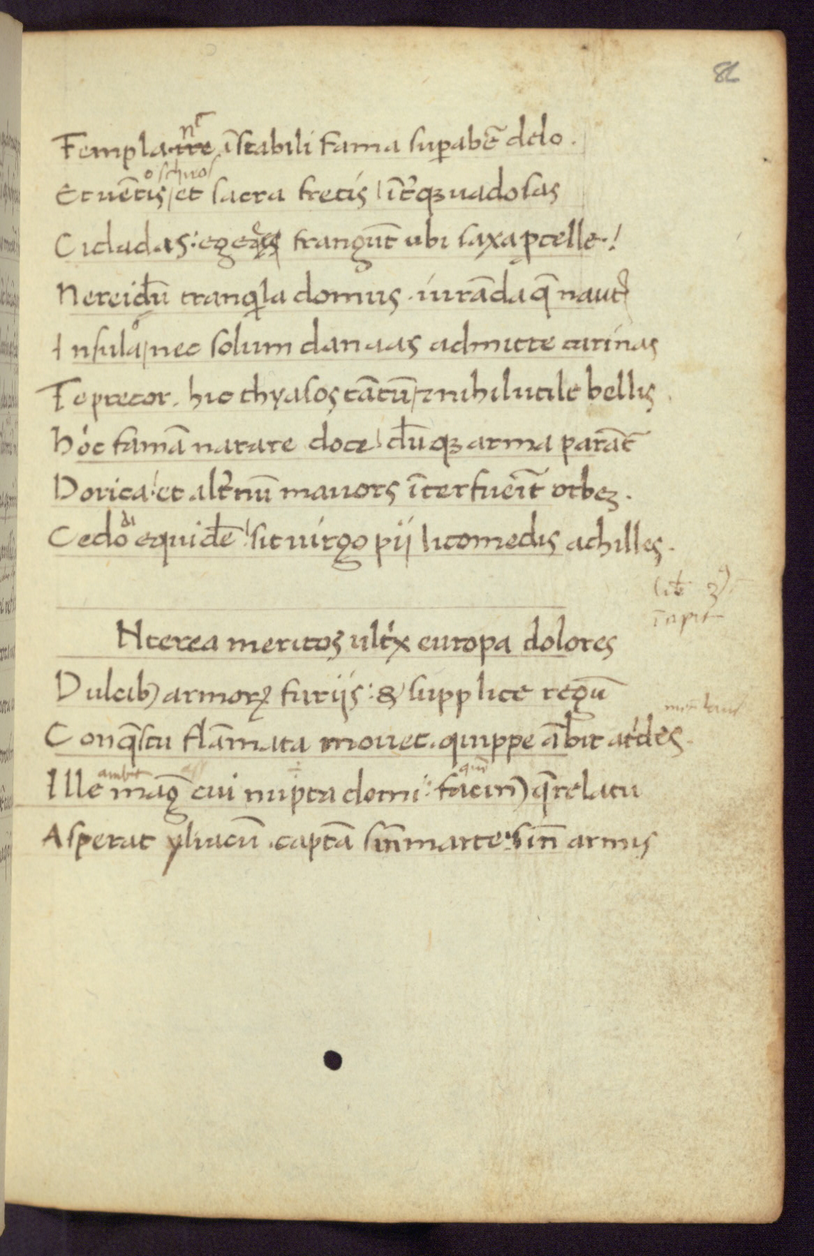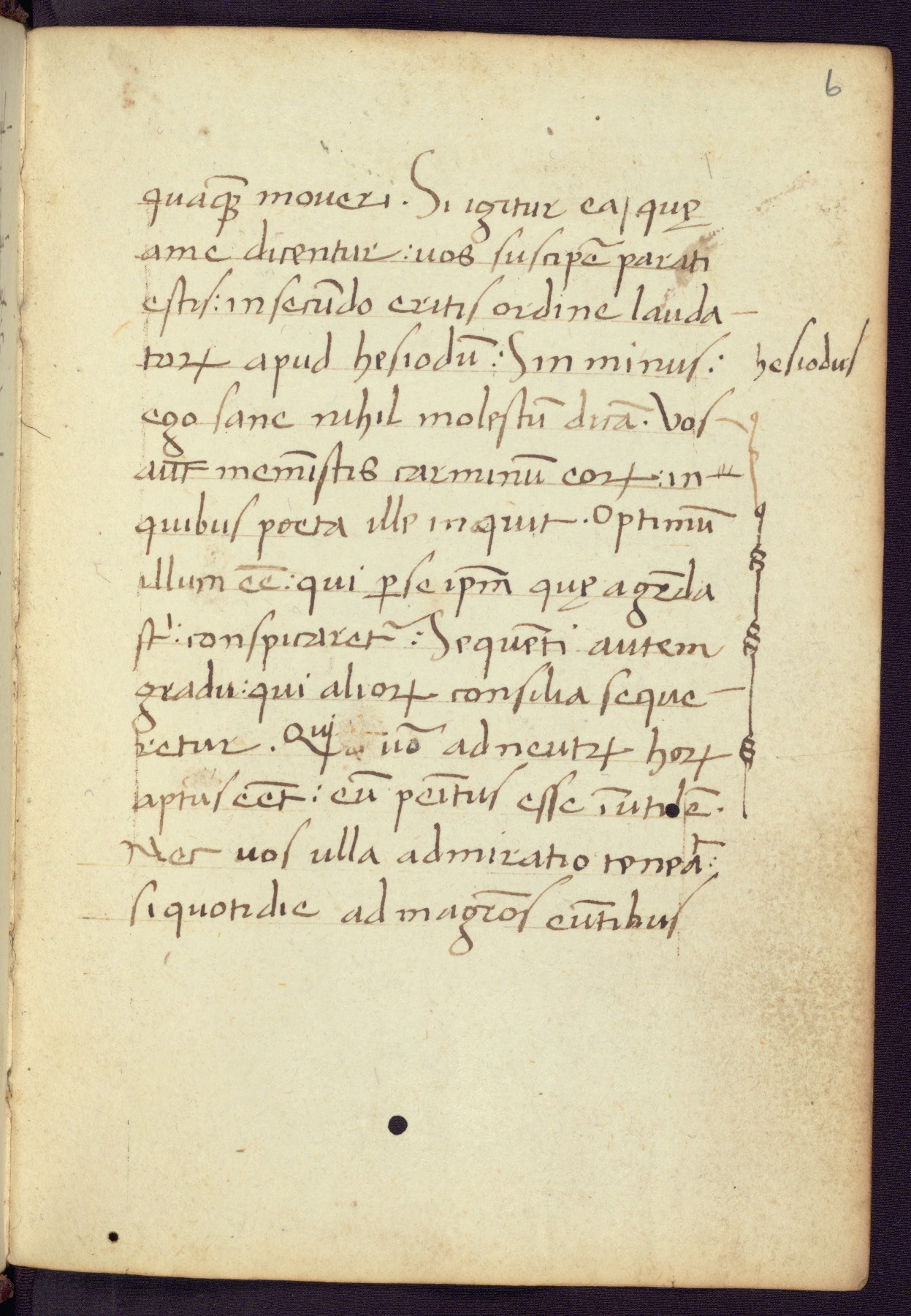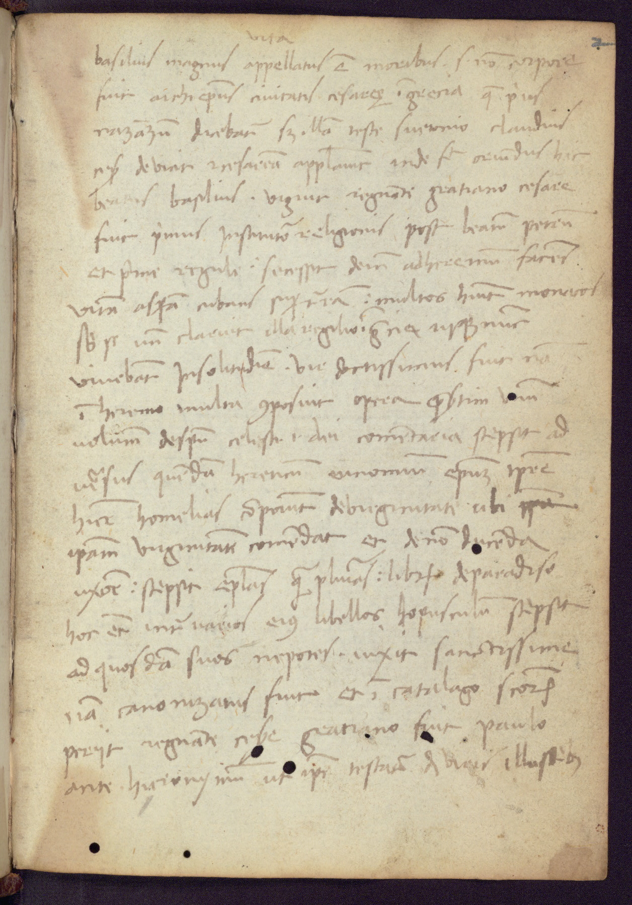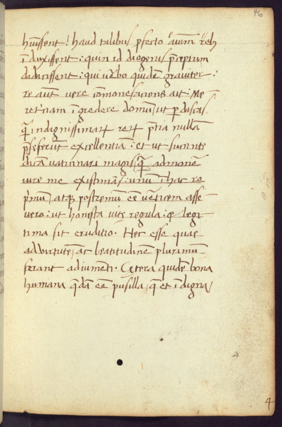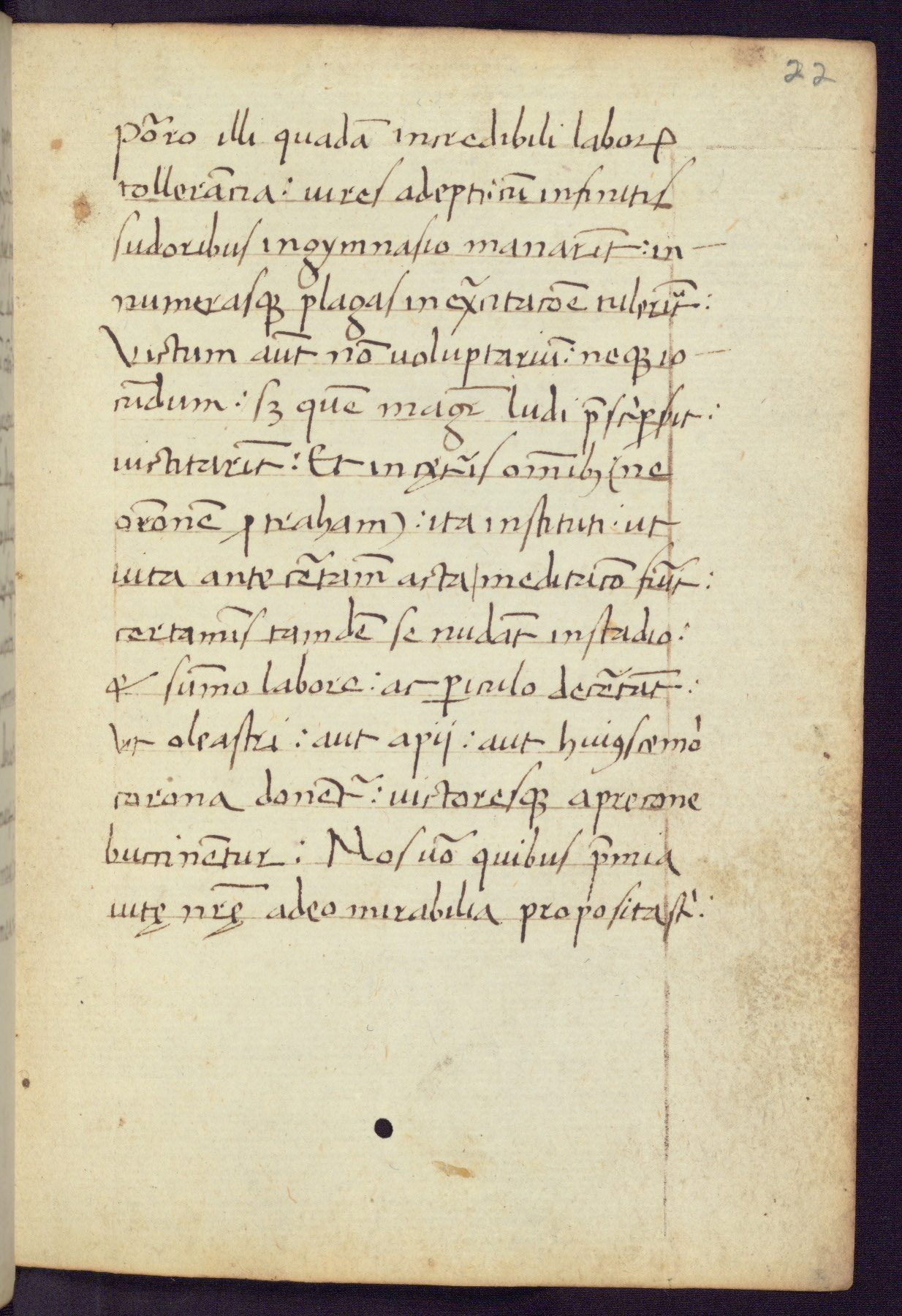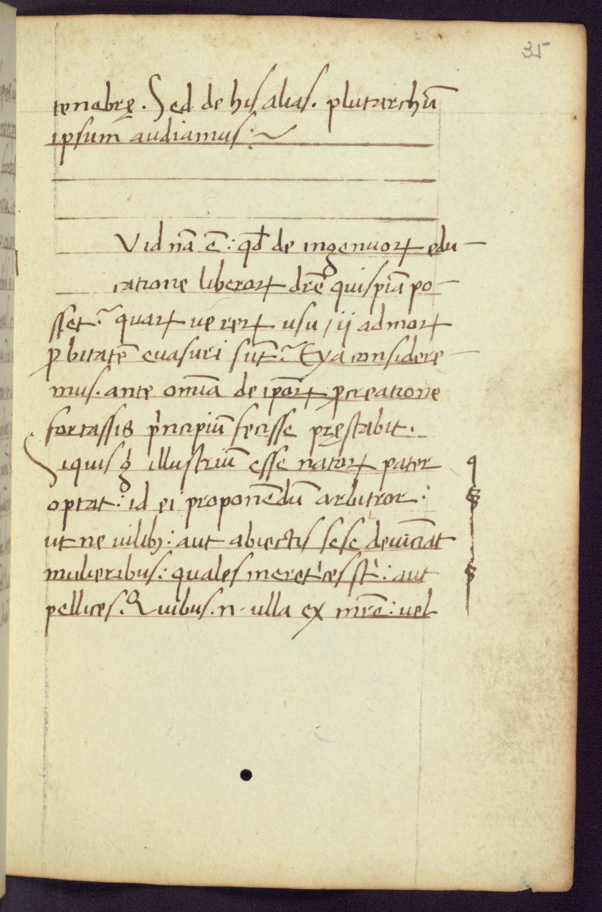 Written in Italy in the third quarter of the fifteenth century, this manuscript contains works by St. Basilius, Pseudo(?) Plutarch, and Statius. The first two texts are Greek treatises on education that were translated into Latin, bearing witness to the Italian humanist revival of, and interest in, the study of ancient Greek. The translators of those texts, Leonardo Bruni (d.1444) and Guarino Veronese (d.1460), both studied Greek under the tutelage of Byzantine scholar Manuel Chrysoloras (d.1415), who was one of the first to introduce Greek literature to Western Europe. The third text by Statius was included as part of a compendium of texts frequently used by students studying Latin beginning in the tenth century. During this same period, Statius was confused with the rhetorician Statius Ursulus of Toulouse, who is mentioned in Jerome’s translation of Eusebius’ chronicles as active in 56 CE. Statius' full Roman name was Publius Papinius Statius, however due to his conflation with the rhetorician in the tenth century, there are a number of manuscripts that begin Statius' name with “Sucurlus” instead of “Publius.” This can be found for instance in an Italian incunabula that is contemporary with W.358, and which is also found in the Walters’ collection (91.1119). This suggests that this error may have been a regional phenomenon in Italy.