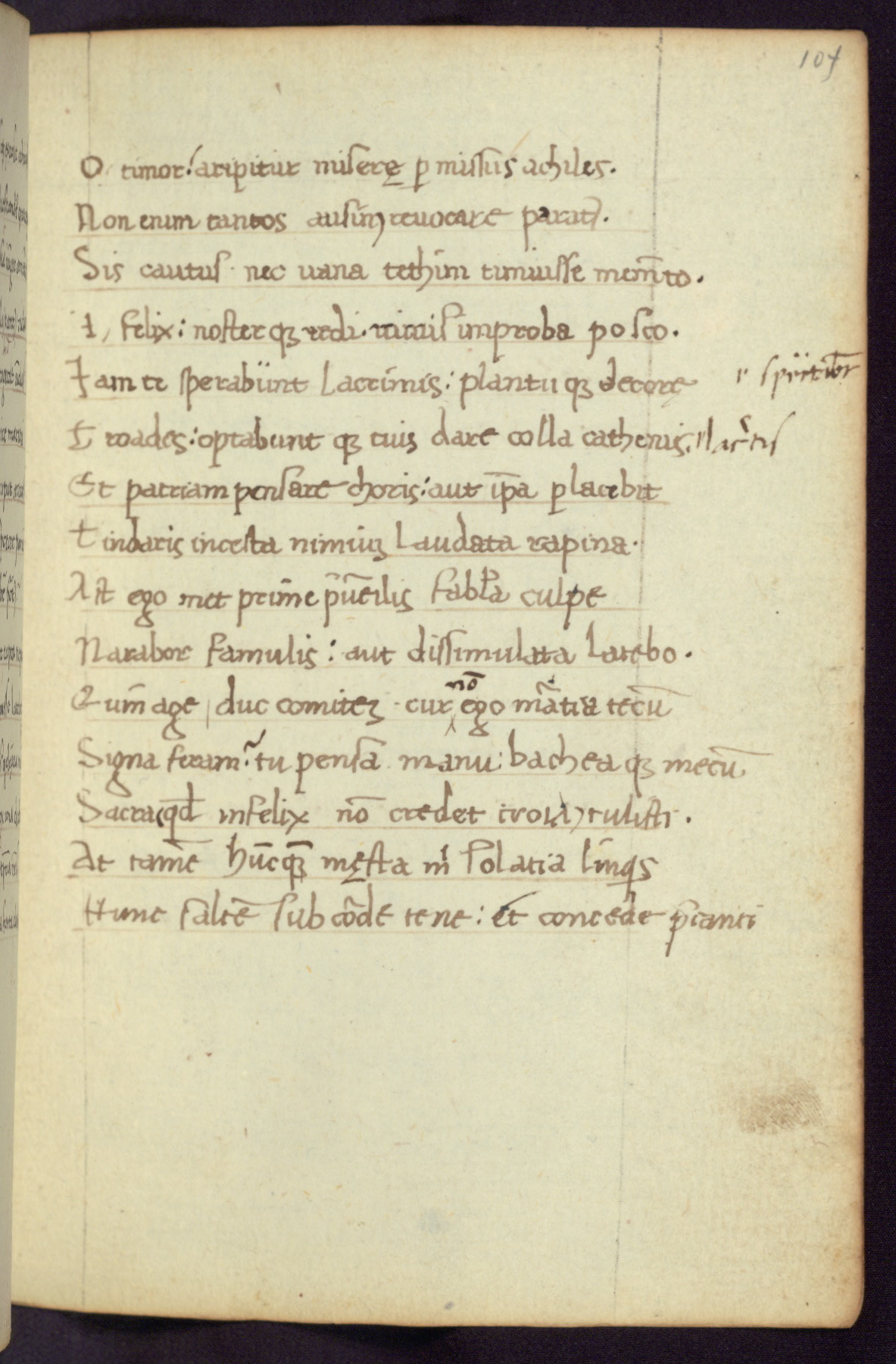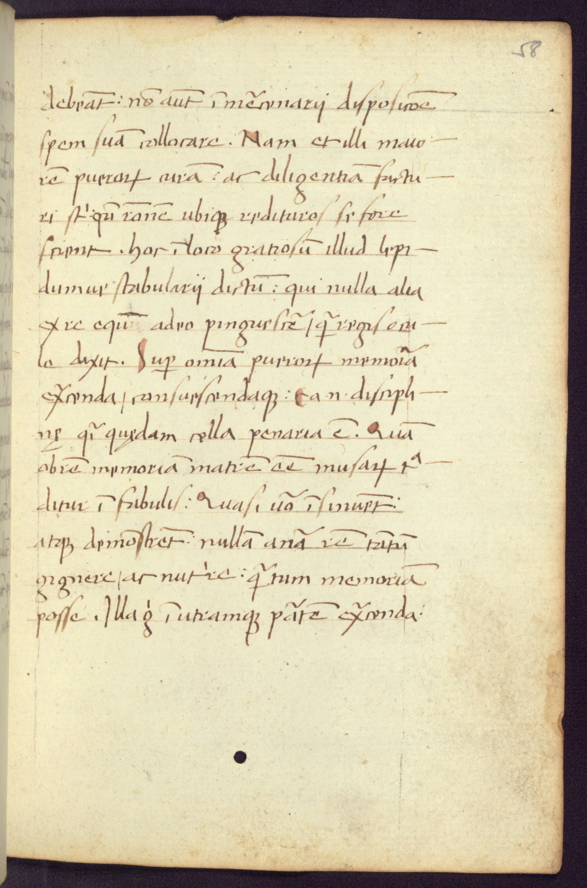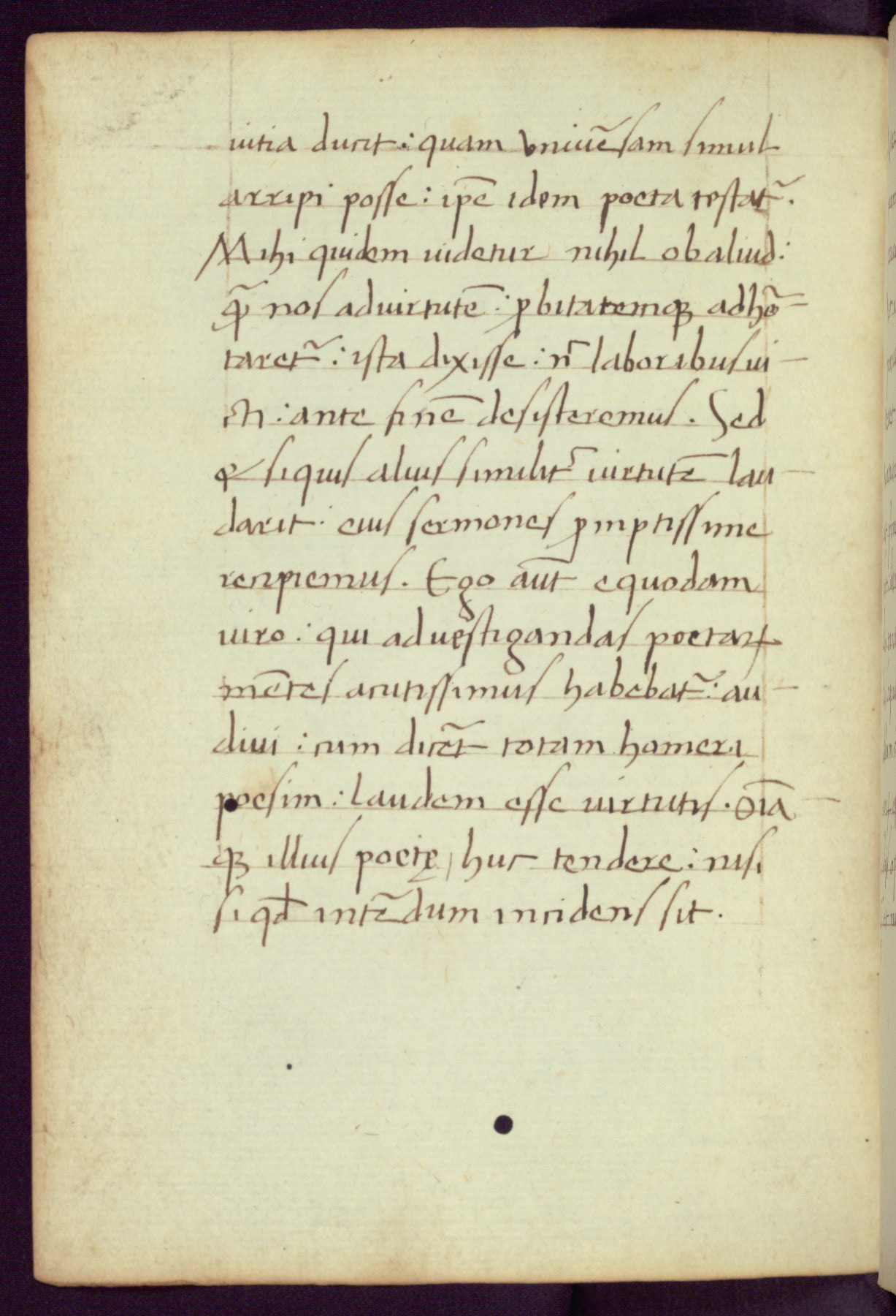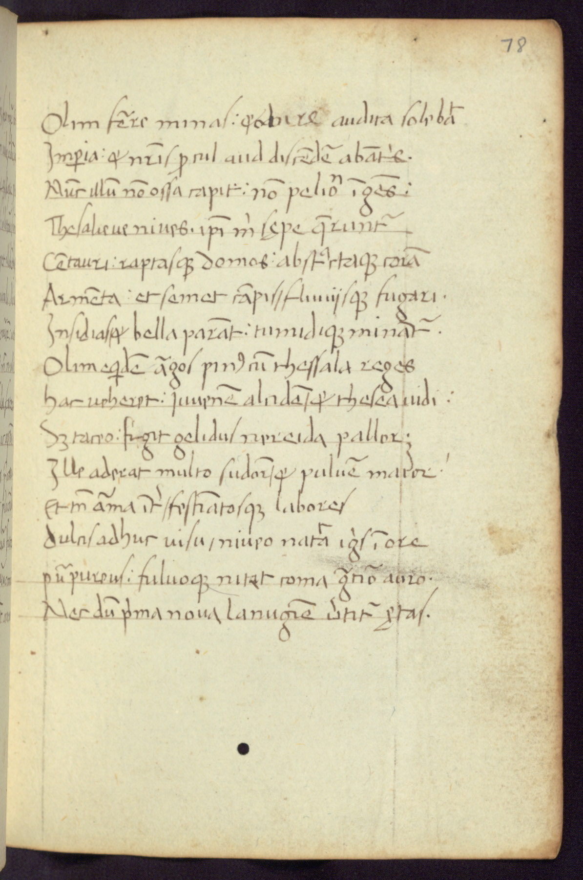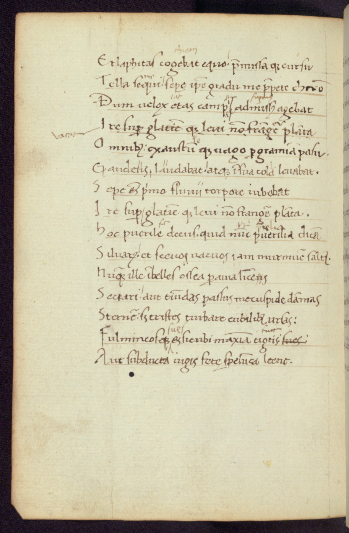 Written in Italy in the third quarter of the fifteenth century, this manuscript contains works by St. Basilius, Pseudo(?) Plutarch, and Statius. The first two texts are Greek treatises on education that were translated into Latin, bearing witness to the Italian humanist revival of, and interest in, the study of ancient Greek. The translators of those texts, Leonardo Bruni (d.1444) and Guarino Veronese (d.1460), both studied Greek under the tutelage of Byzantine scholar Manuel Chrysoloras (d.1415), who was one of the first to introduce Greek literature to Western Europe. The third text by Statius was included as part of a compendium of texts frequently used by students studying Latin beginning in the tenth century. During this same period, Statius was confused with the rhetorician Statius Ursulus of Toulouse, who is mentioned in Jerome’s translation of Eusebius’ chronicles as active in 56 CE. Statius' full Roman name was Publius Papinius Statius, however due to his conflation with the rhetorician in the tenth century, there are a number of manuscripts that begin Statius' name with “Sucurlus” instead of “Publius.” This can be found for instance in an Italian incunabula that is contemporary with W.358, and which is also found in the Walters’ collection (91.1119). This suggests that this error may have been a regional phenomenon in Italy.