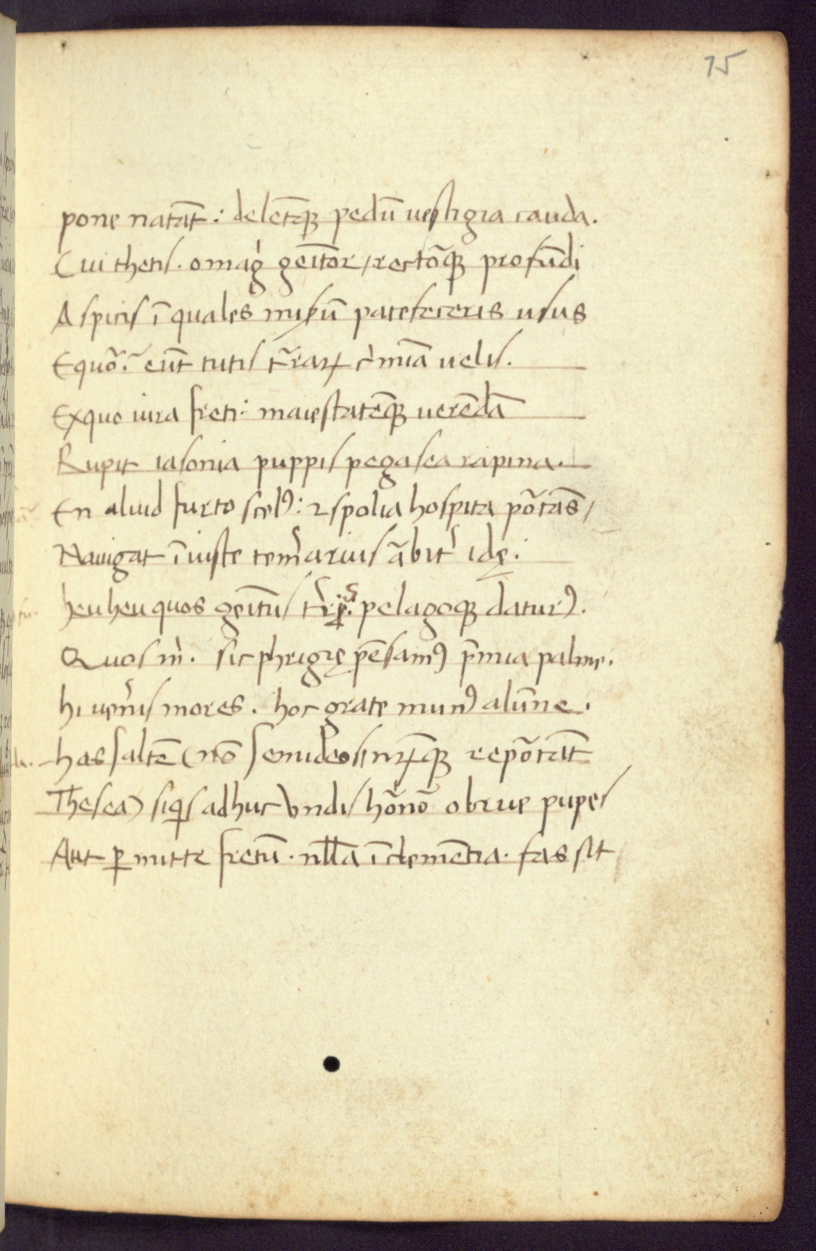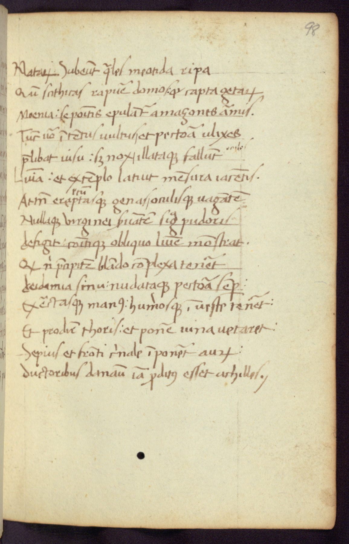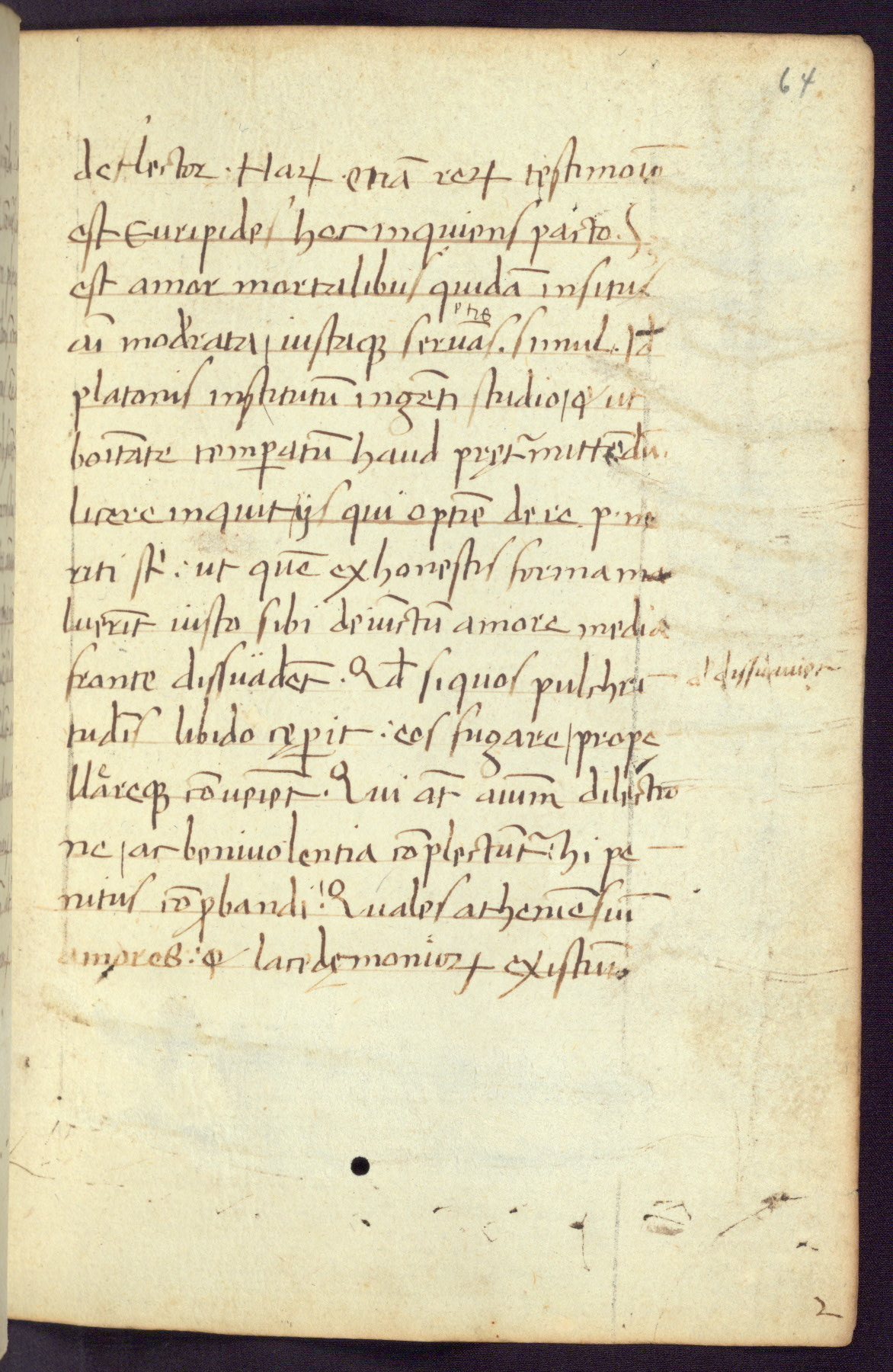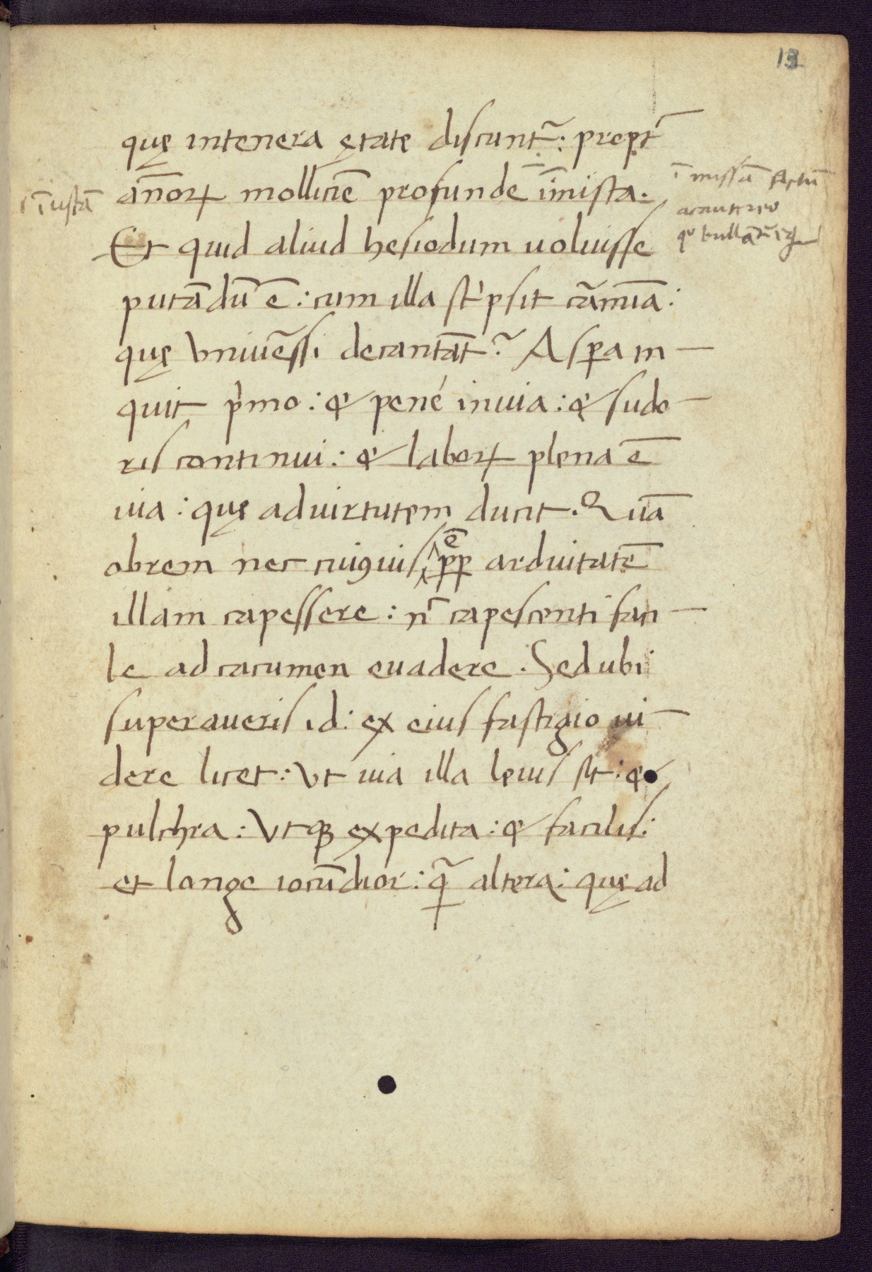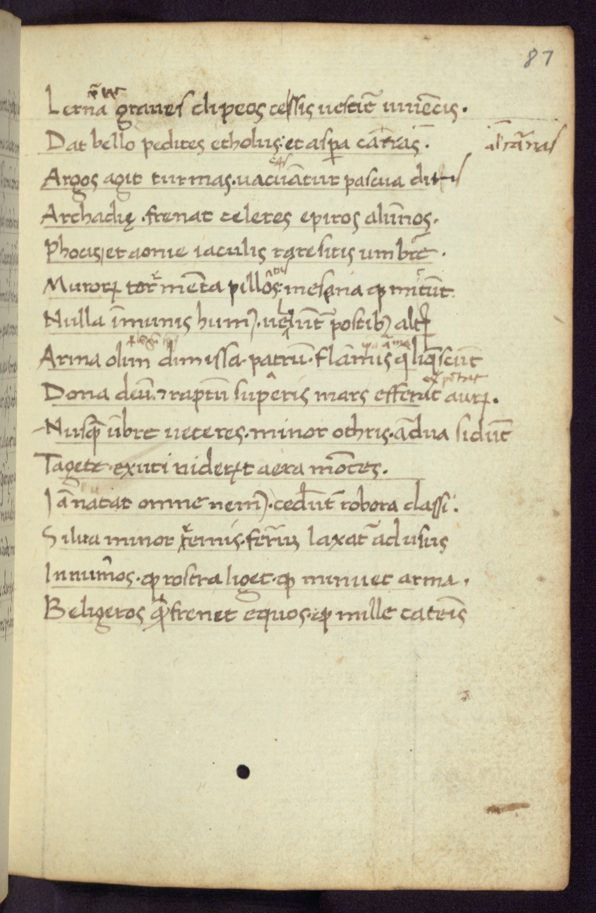 Written in Italy in the third quarter of the fifteenth century, this manuscript contains works by St. Basilius, Pseudo(?) Plutarch, and Statius. The first two texts are Greek treatises on education that were translated into Latin, bearing witness to the Italian humanist revival of, and interest in, the study of ancient Greek. The translators of those texts, Leonardo Bruni (d.1444) and Guarino Veronese (d.1460), both studied Greek under the tutelage of Byzantine scholar Manuel Chrysoloras (d.1415), who was one of the first to introduce Greek literature to Western Europe. The third text by Statius was included as part of a compendium of texts frequently used by students studying Latin beginning in the tenth century. During this same period, Statius was confused with the rhetorician Statius Ursulus of Toulouse, who is mentioned in Jerome’s translation of Eusebius’ chronicles as active in 56 CE. Statius' full Roman name was Publius Papinius Statius, however due to his conflation with the rhetorician in the tenth century, there are a number of manuscripts that begin Statius' name with “Sucurlus” instead of “Publius.” This can be found for instance in an Italian incunabula that is contemporary with W.358, and which is also found in the Walters’ collection (91.1119). This suggests that this error may have been a regional phenomenon in Italy.