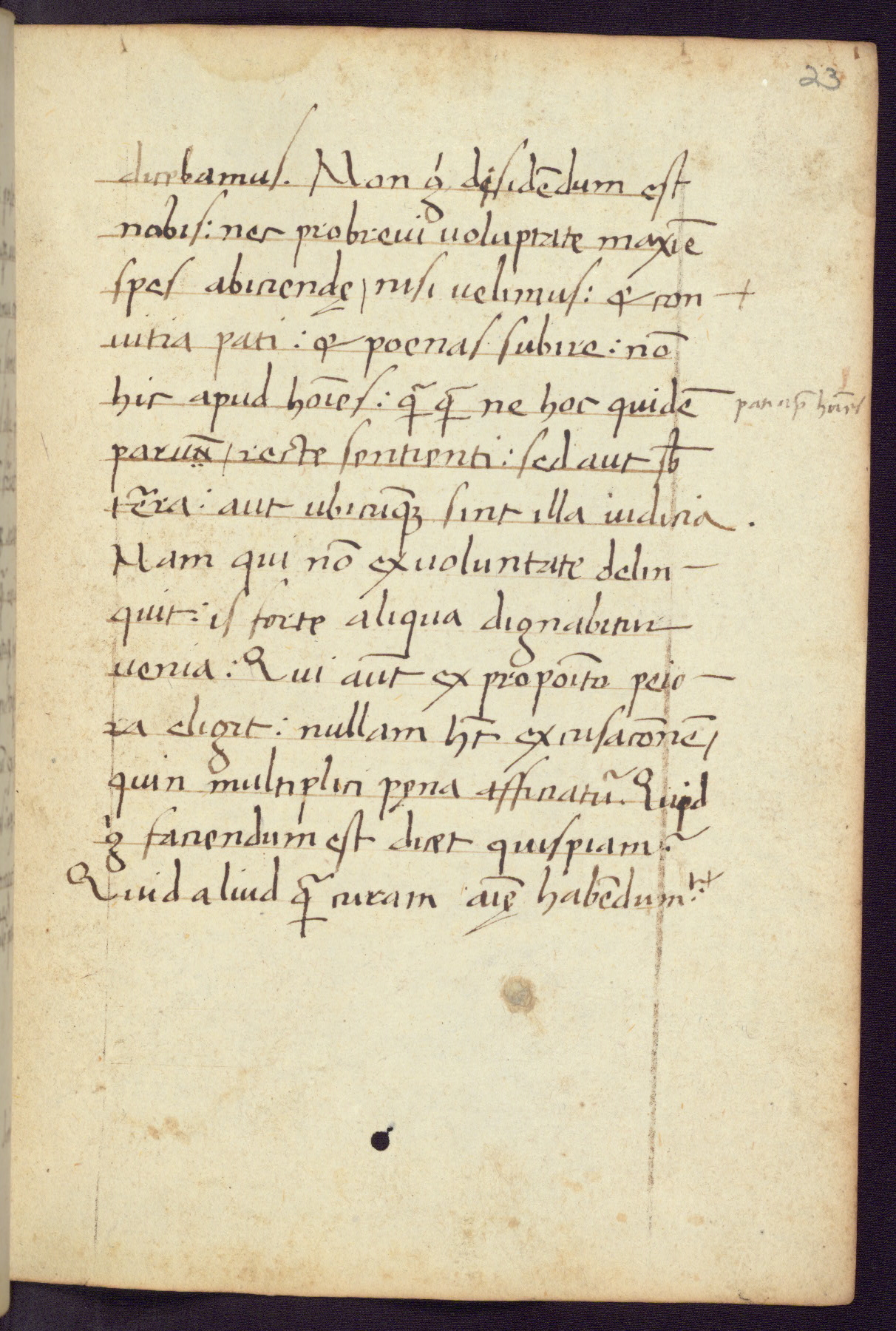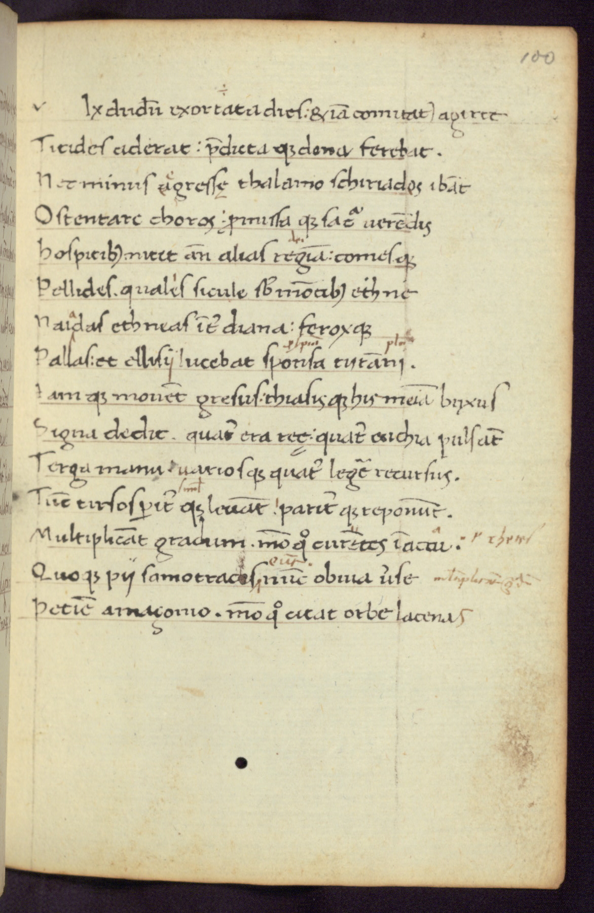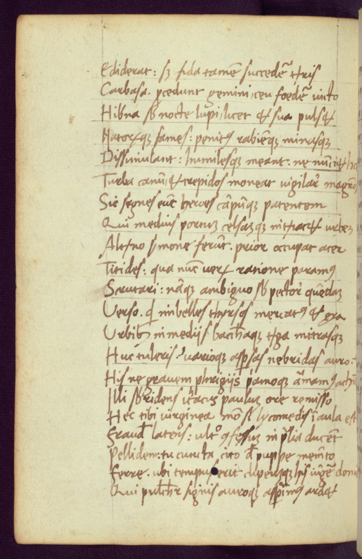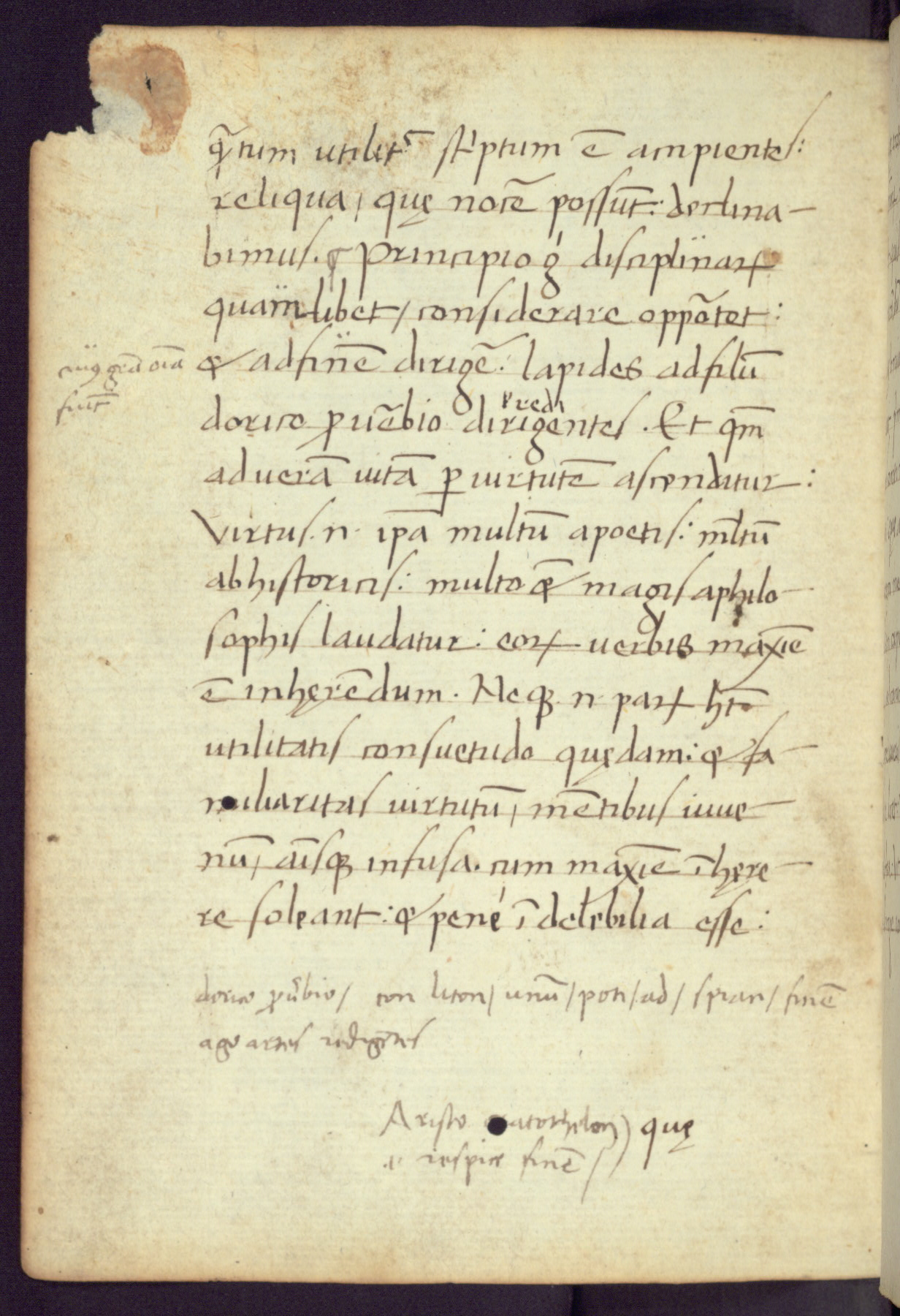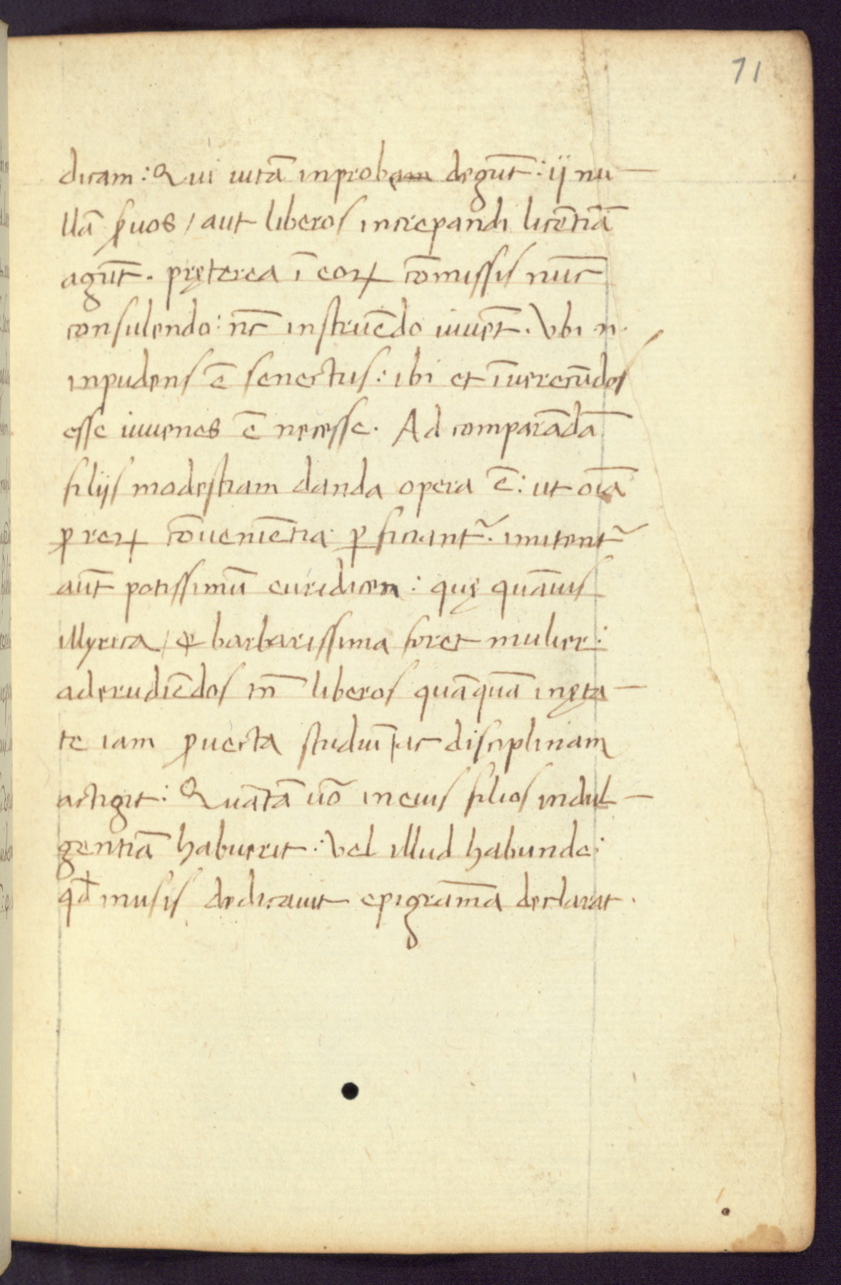 Written in Italy in the third quarter of the fifteenth century, this manuscript contains works by St. Basilius, Pseudo(?) Plutarch, and Statius. The first two texts are Greek treatises on education that were translated into Latin, bearing witness to the Italian humanist revival of, and interest in, the study of ancient Greek. The translators of those texts, Leonardo Bruni (d.1444) and Guarino Veronese (d.1460), both studied Greek under the tutelage of Byzantine scholar Manuel Chrysoloras (d.1415), who was one of the first to introduce Greek literature to Western Europe. The third text by Statius was included as part of a compendium of texts frequently used by students studying Latin beginning in the tenth century. During this same period, Statius was confused with the rhetorician Statius Ursulus of Toulouse, who is mentioned in Jerome’s translation of Eusebius’ chronicles as active in 56 CE. Statius' full Roman name was Publius Papinius Statius, however due to his conflation with the rhetorician in the tenth century, there are a number of manuscripts that begin Statius' name with “Sucurlus” instead of “Publius.” This can be found for instance in an Italian incunabula that is contemporary with W.358, and which is also found in the Walters’ collection (91.1119). This suggests that this error may have been a regional phenomenon in Italy.