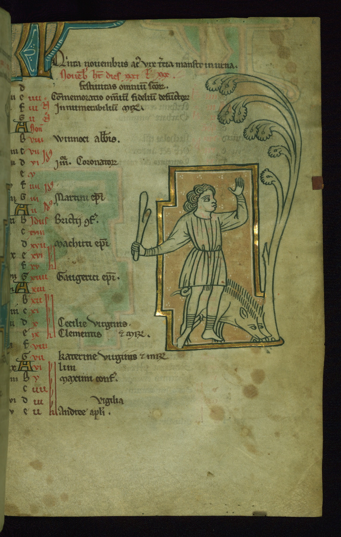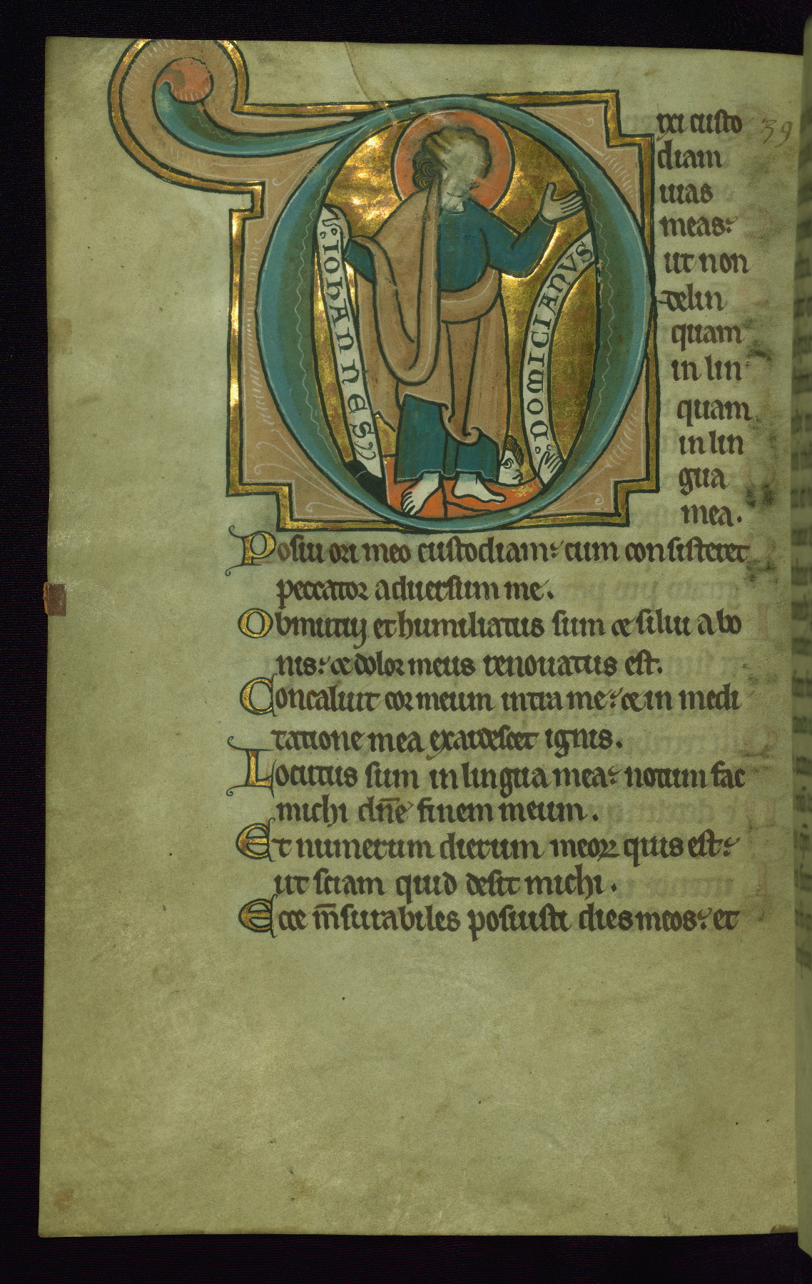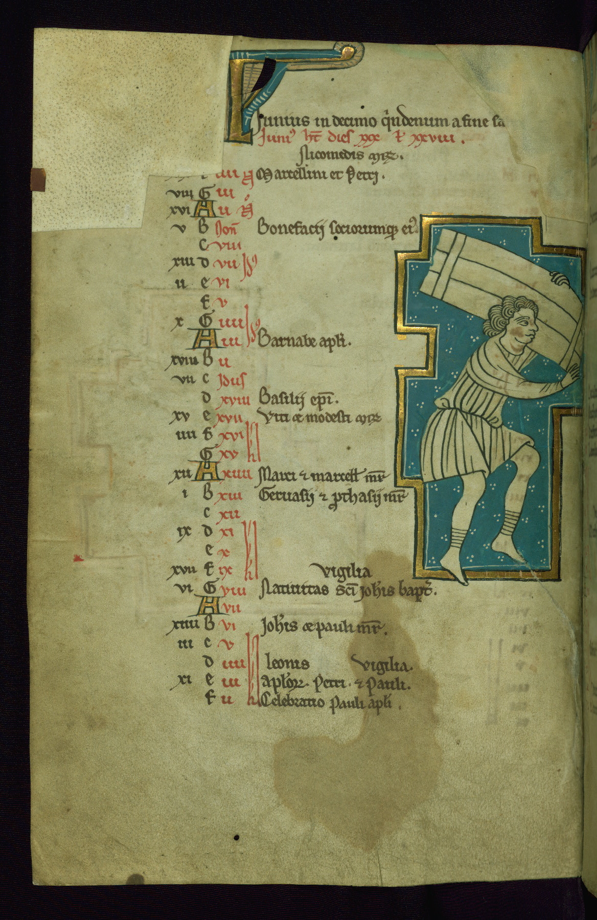- Decoration note: Lacks one full-page miniature and one historiated initial; eight extant historiated initials (12-14 lines) mark liturgical psalms, some of which have been heavily rubbed (e.g., the face on fol. 38v); eight extant illuminations in calendar (14-18 lines); large decorative initials for "KL" in calendar and at beginning of remaining psalms throughout, with long descenders in gold against blue and beige grounds with white patterns (4 lines); elaborate descenders with thistles (?) and acorns uniquely found on fols. 109v-110r (Psalm 118), added for English owner in fifteenth or sixteenth century; versals in gold (1 line); added Easter table in red and black ink with yellow and green dividing bands; rubrics in red; text in dark brown ink