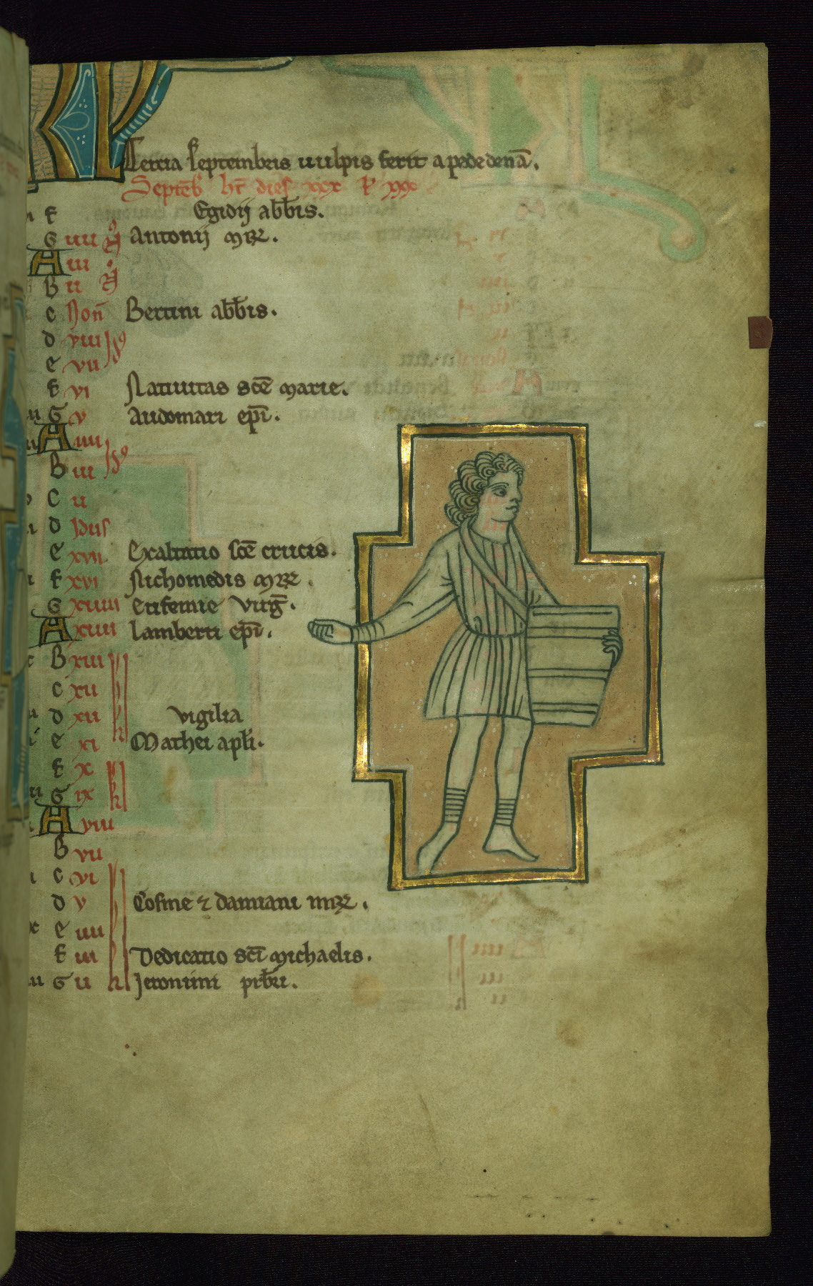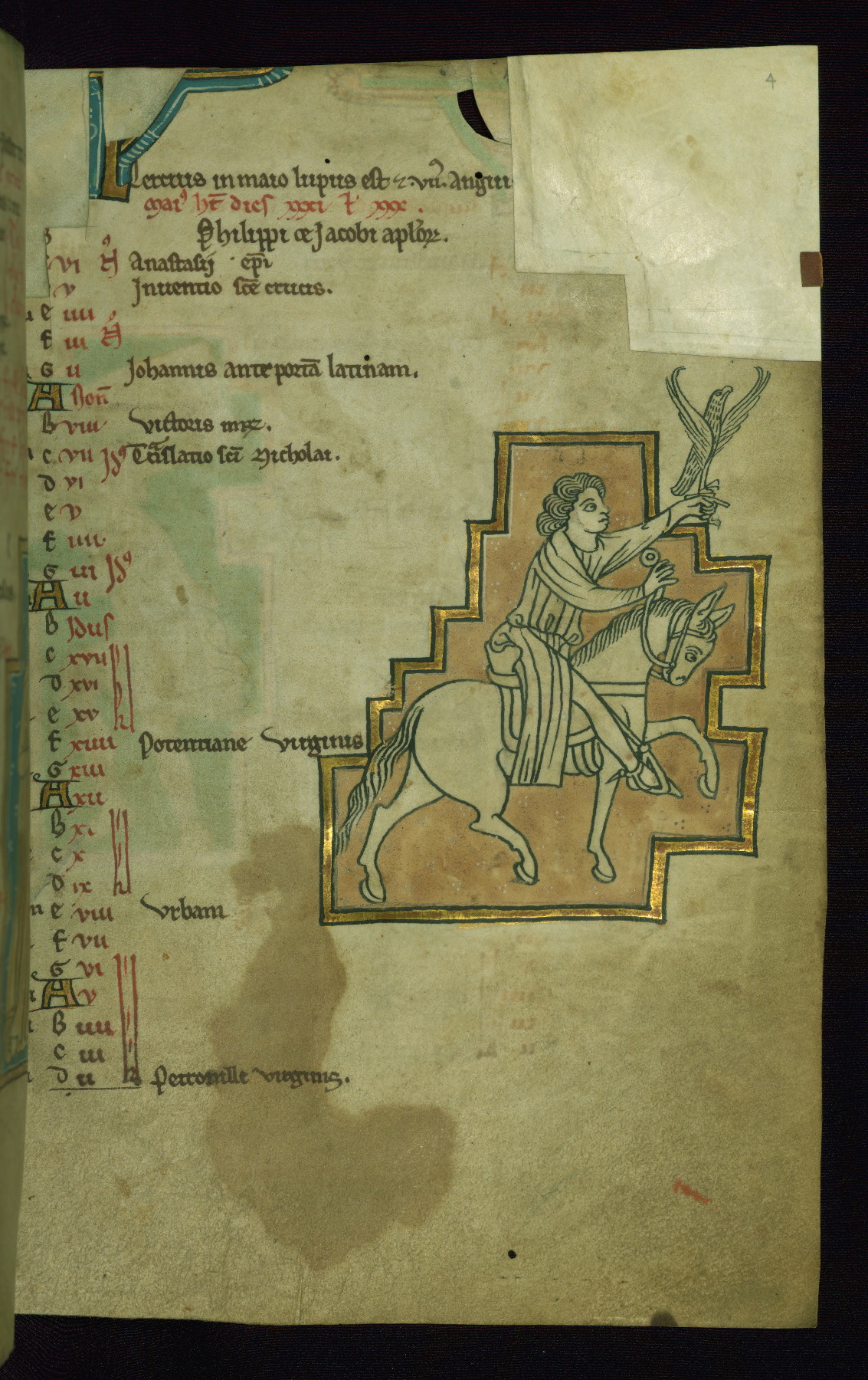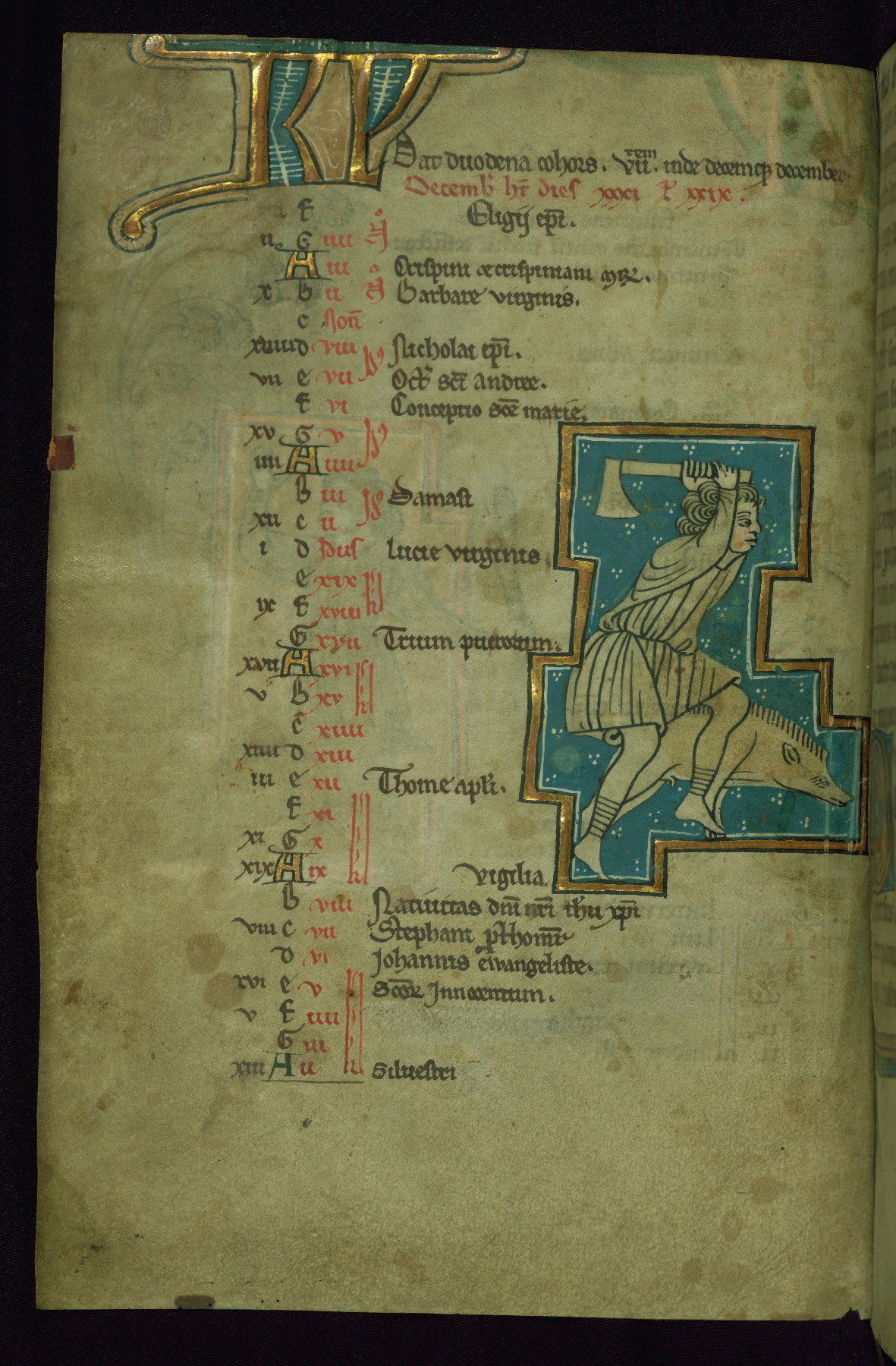 - Decoration note: Lacks one full-page miniature and one historiated initial; eight extant historiated initials (12-14 lines) mark liturgical psalms, some of which have been heavily rubbed (e.g., the face on fol. 38v); eight extant illuminations in calendar (14-18 lines); large decorative initials for "KL" in calendar and at beginning of remaining psalms throughout, with long descenders in gold against blue and beige grounds with white patterns (4 lines); elaborate descenders with thistles (?) and acorns uniquely found on fols. 109v-110r (Psalm 118), added for English owner in fifteenth or sixteenth century; versals in gold (1 line); added Easter table in red and black ink with yellow and green dividing bands; rubrics in red; text in dark brown ink