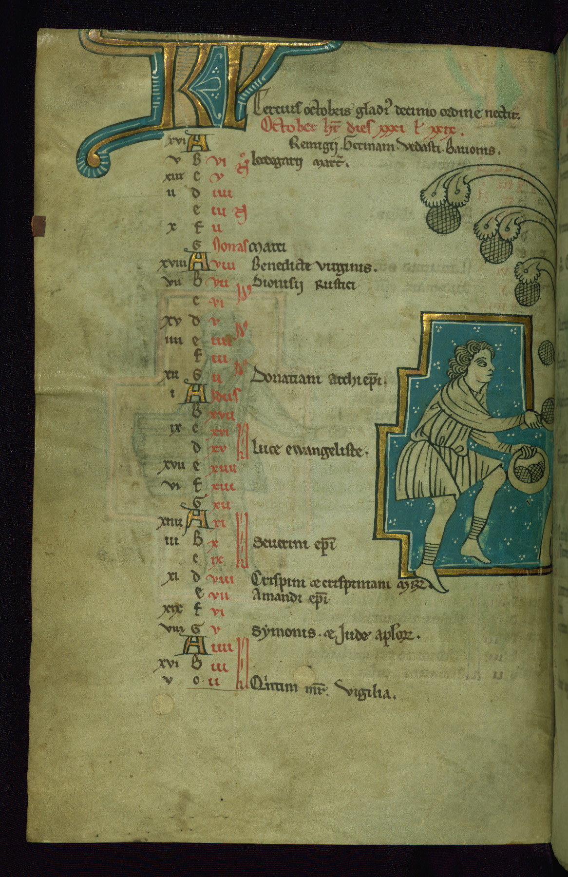 - Contents: Incomplete; lacks pages with March/April (between fols. 3 and 4) and July/August (between fols. 4 and 5); calendar 1/2 to 3/4 full; all names in dark brown; Egyptian verses, naming which days are to be feared, head each month; erasures include Thomas of Canterbury (December 29) (fol. 6v) and added later birth/death dates of Touke family (fols. 3r and 5r); English instructions for calculating Lent added in the sixteenth century in red, fol. 3v; notable saints include Basil (January 1, added early on), Bertin (September 5), Michael (September 29), Basil (June 14, ordination), Remigius, Germanus, Vedast, Bavo (October 1), Benedicta (October 8), Rusticus (October 9), Donatian (October 14), Martyrs (November 3), Winnoc (November 6), Catherine (November 25), Three Hebrews in the Furnace (December 16)