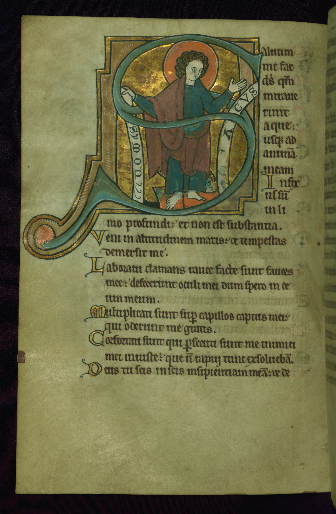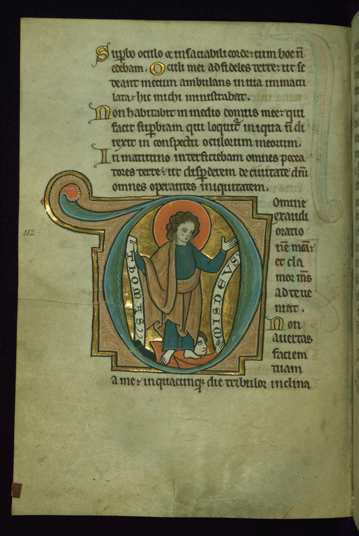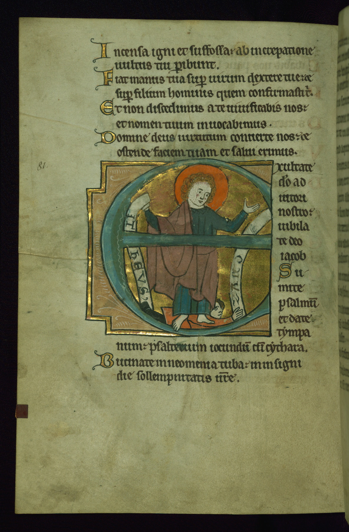 - Contents: Incomplete; ten-partite liturgical psalter (divided at Psalms 1, 26, 38, 51, 52, 68, 80, 97, 101, and 109); removal of images resulted in loss of text: full-page miniature excised at beginning, so missing first words of Psalm 1 (Beatus vir, awkwardly rewritten in fifteenth or sixteenth century at top of fol. 7r using pasted initial "B" from another manuscript); folio probably containing historiated initial removed between fols. 102 and 103, resulting in full loss of Psalm 109 and beginning of Psalm 110, the latter resuming on fol. 103r with verse 9, "[manda]uit in eternam"