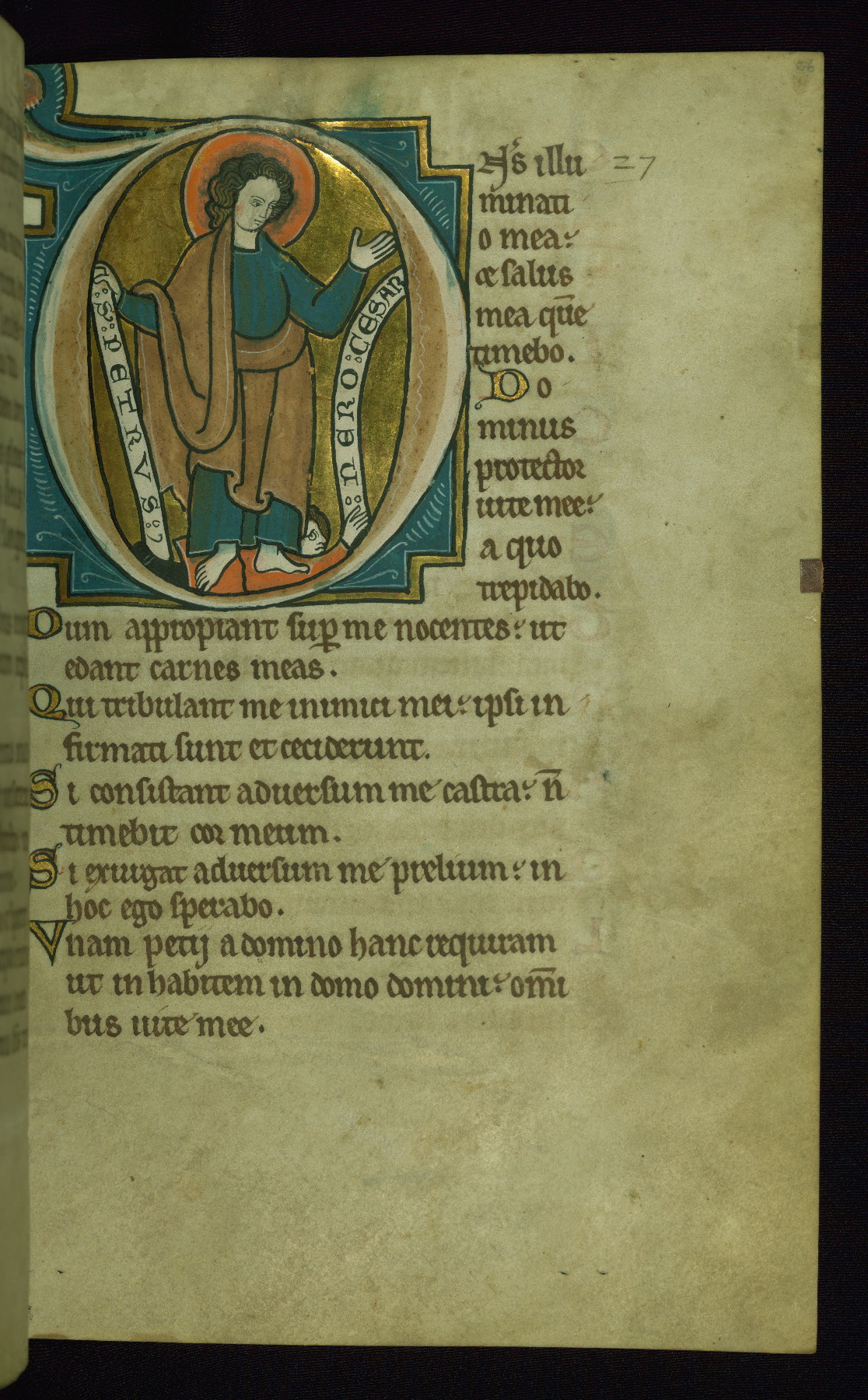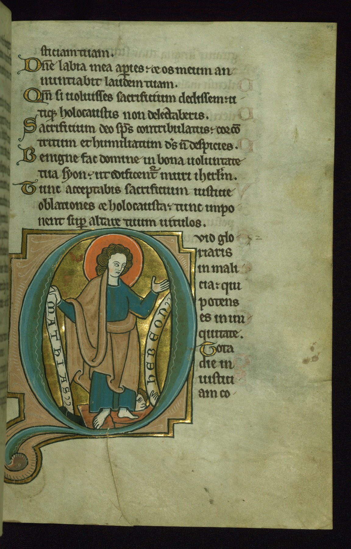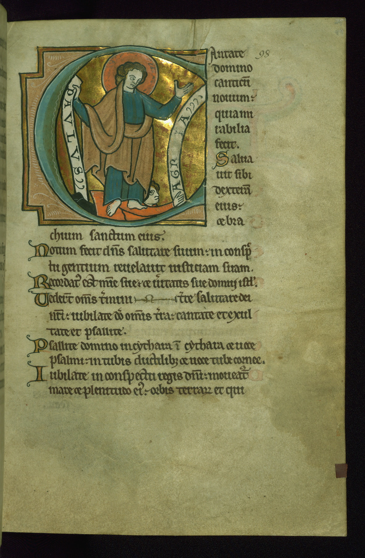 - Contents: Incomplete; ten-partite liturgical psalter (divided at Psalms 1, 26, 38, 51, 52, 68, 80, 97, 101, and 109); removal of images resulted in loss of text: full-page miniature excised at beginning, so missing first words of Psalm 1 (Beatus vir, awkwardly rewritten in fifteenth or sixteenth century at top of fol. 7r using pasted initial "B" from another manuscript); folio probably containing historiated initial removed between fols. 102 and 103, resulting in full loss of Psalm 109 and beginning of Psalm 110, the latter resuming on fol. 103r with verse 9, "[manda]uit in eternam"