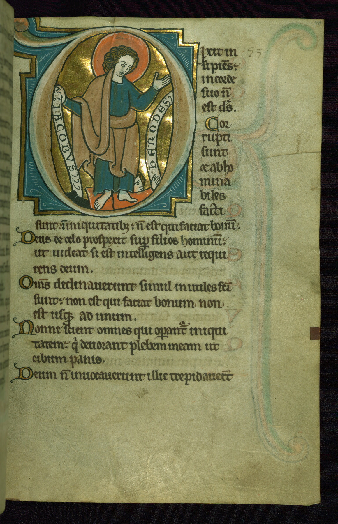 - Title: Initial "D" with St. James the Greater trampling Herod