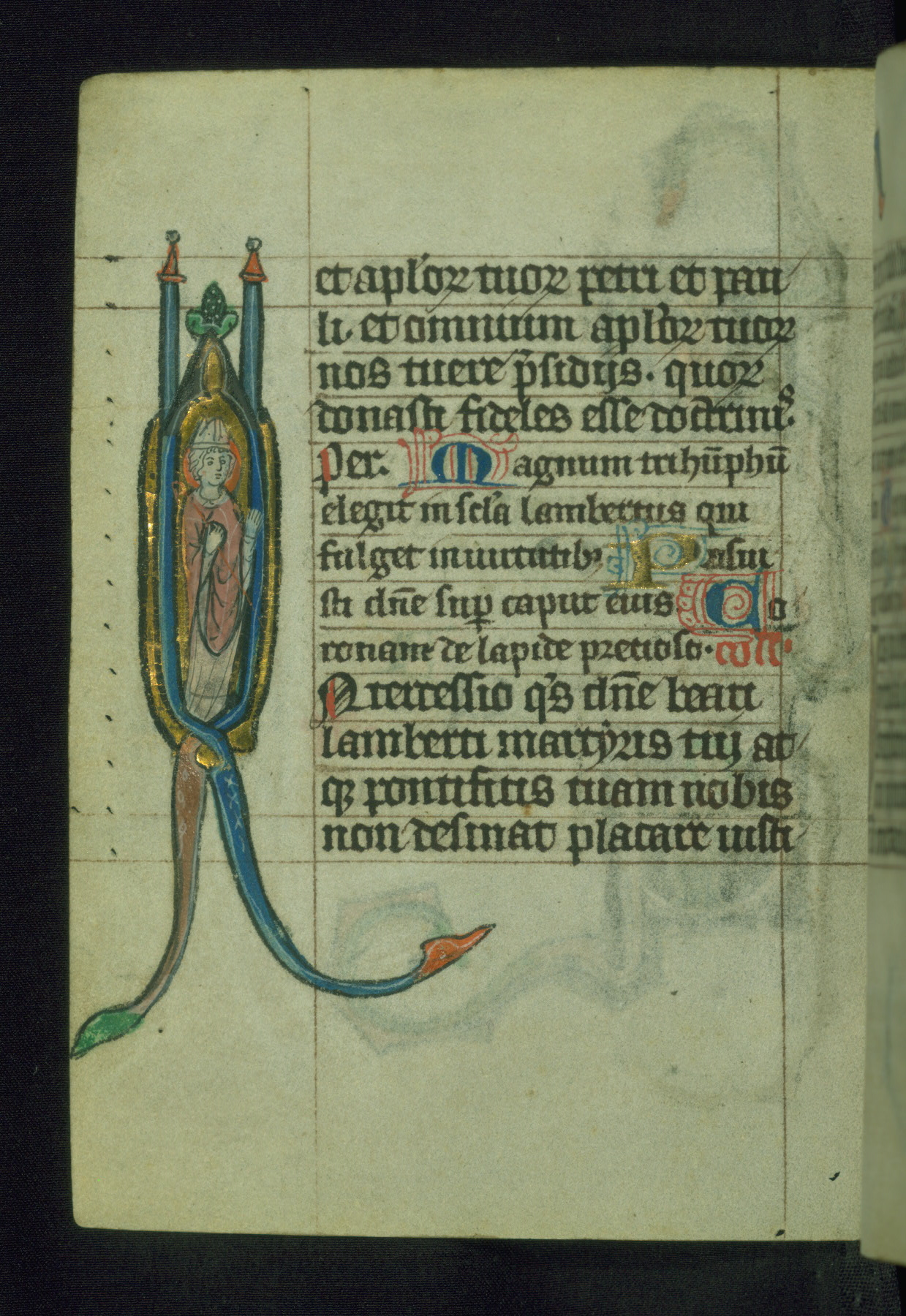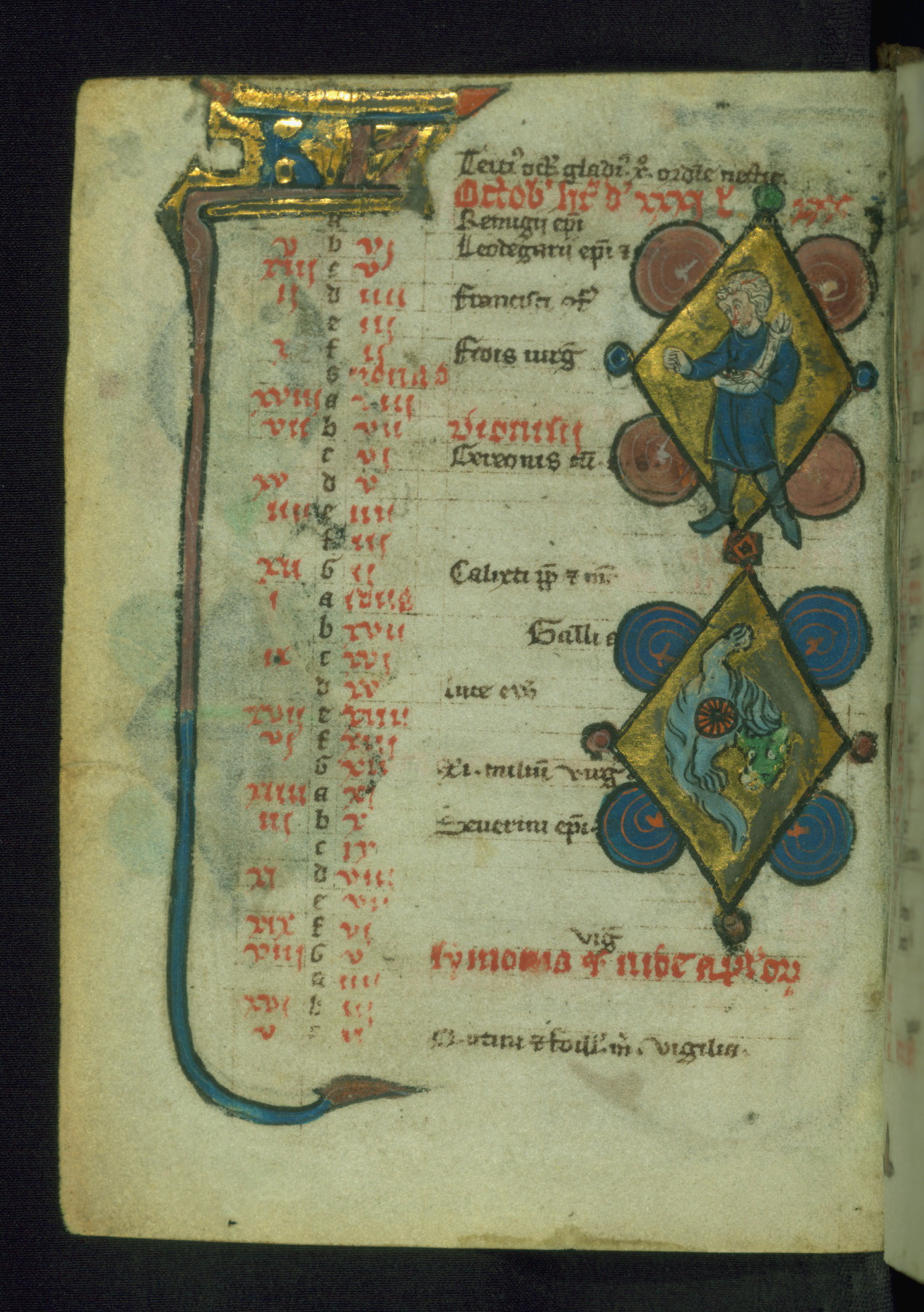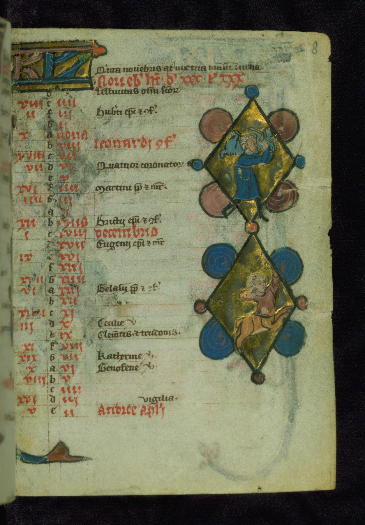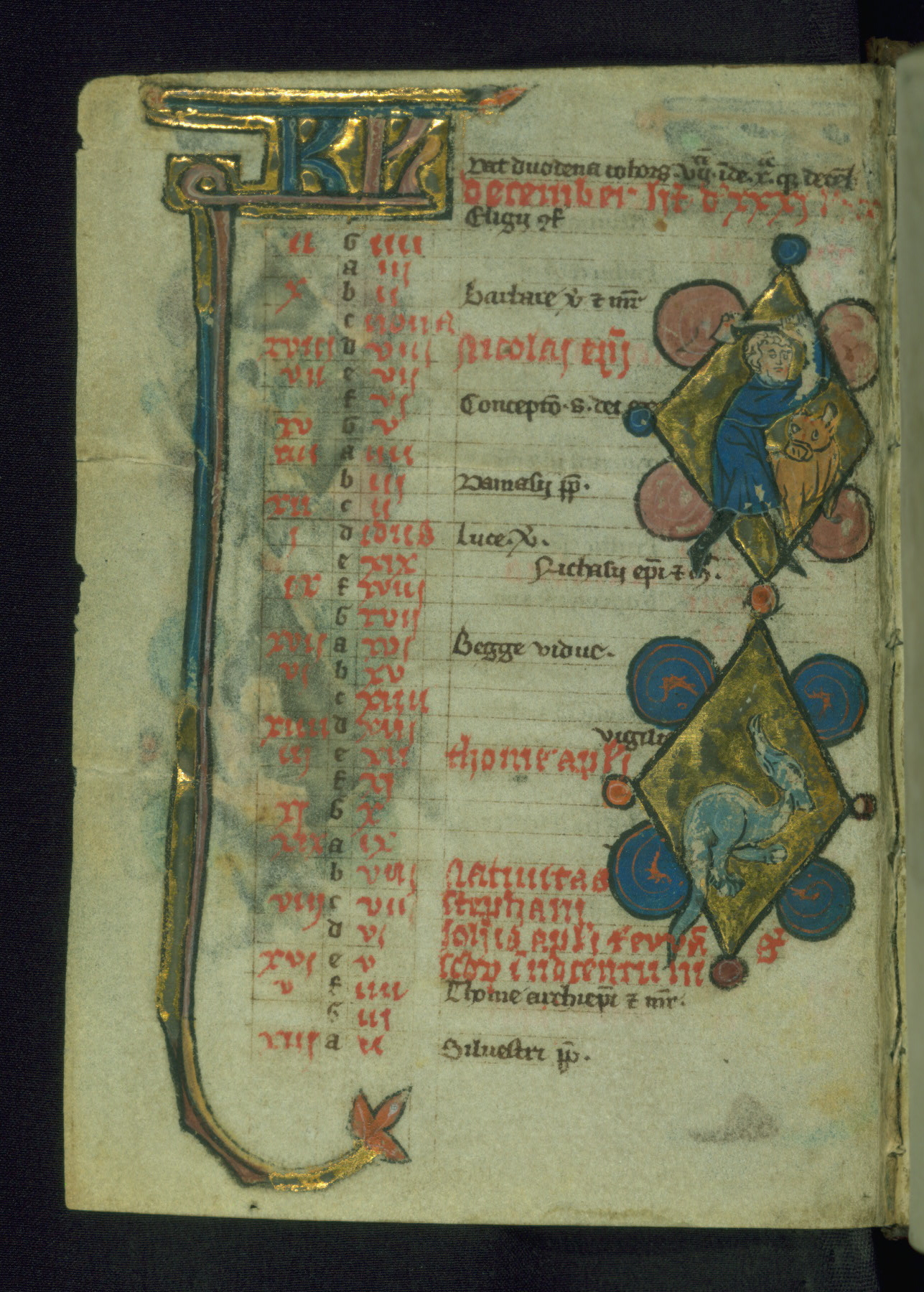 - Contents: Use of Liège; one quarter to one half full; graded in red and black ink; twenty-eight virgin saints shows considerable female representation; many saints of Huy indicate intended usage there; notable saints include Mengold (February 8, count of Huy), Lambert (April 28), Domitian (May 7, bishop of Tongres and Huy, patron of Huy), Gengulf (May 11), Servatius (May 13, bishop of Tongres), Monegund (July 1), Helen (August 18, "regine," and the only other with this saint listed this way is British Library Harley 2930, which is also from Liège and made for a woman who was likely a Beguine), Lambert (September 17, bishop of Liège, patron saint of diocese), Remigius (October 1), Hubert (November 3, bishop of Liège, buried at St.-Pierre, Liège), Leonard (November 6), Geneviève (November 26, "Genofeue," also uniquely found this way in a group of Liège manuscripts, see Oliver, 1988), Begga (December 17, "uidue," patron saint of Beguines