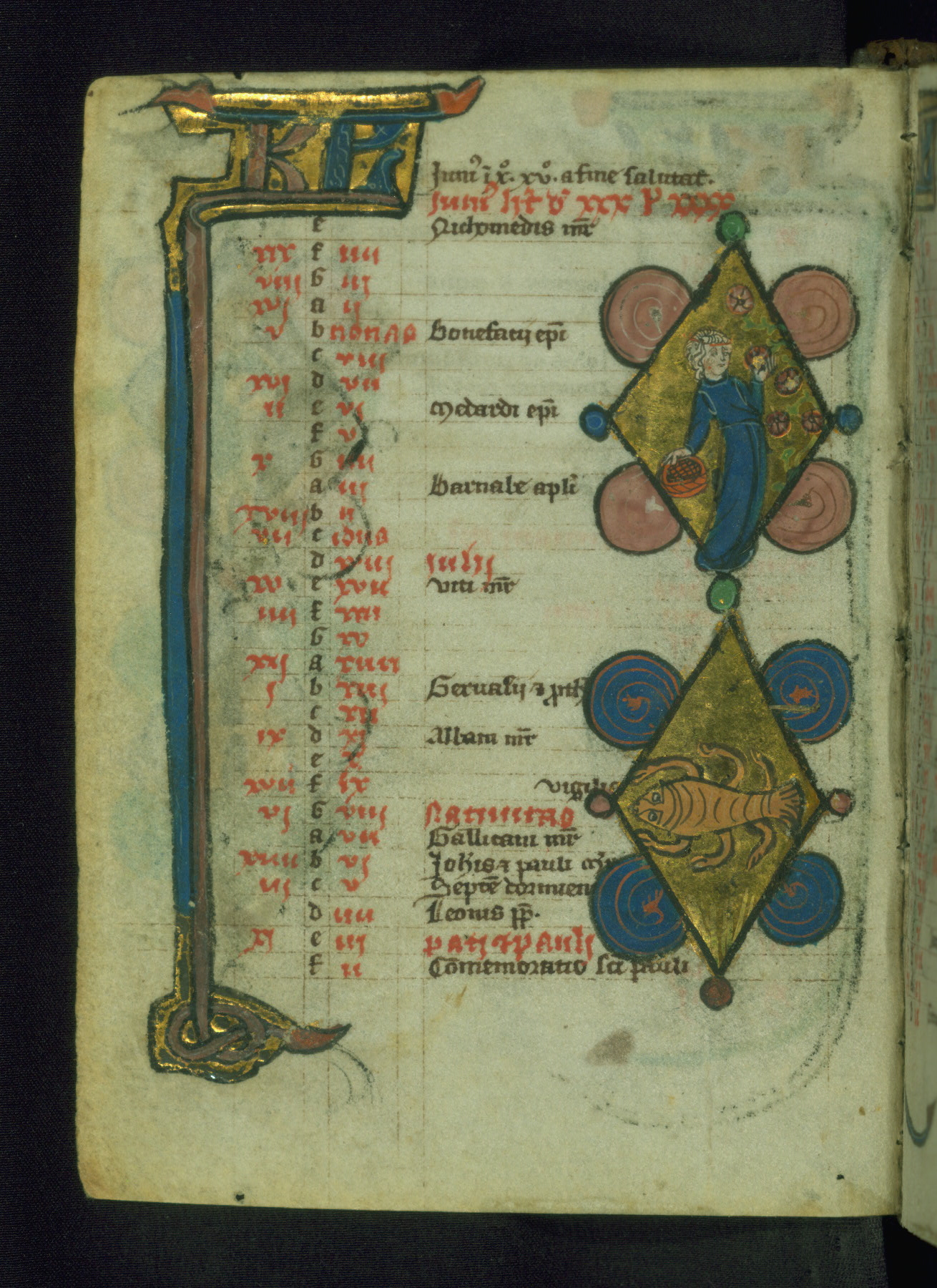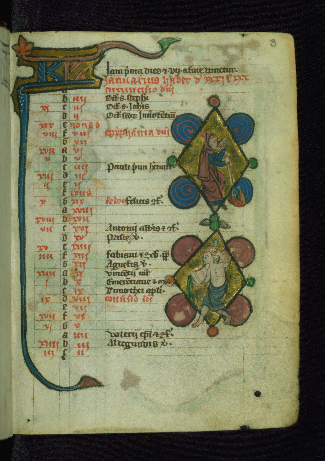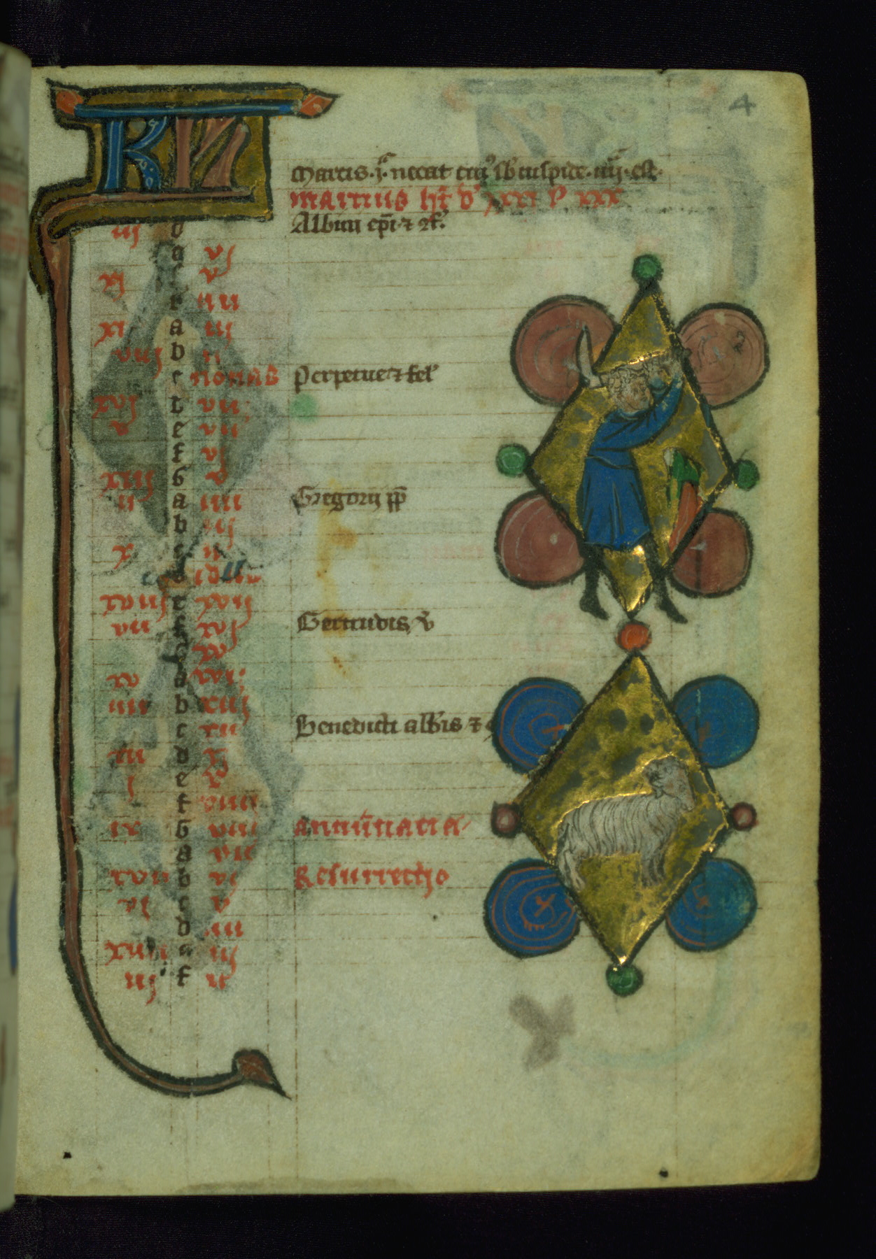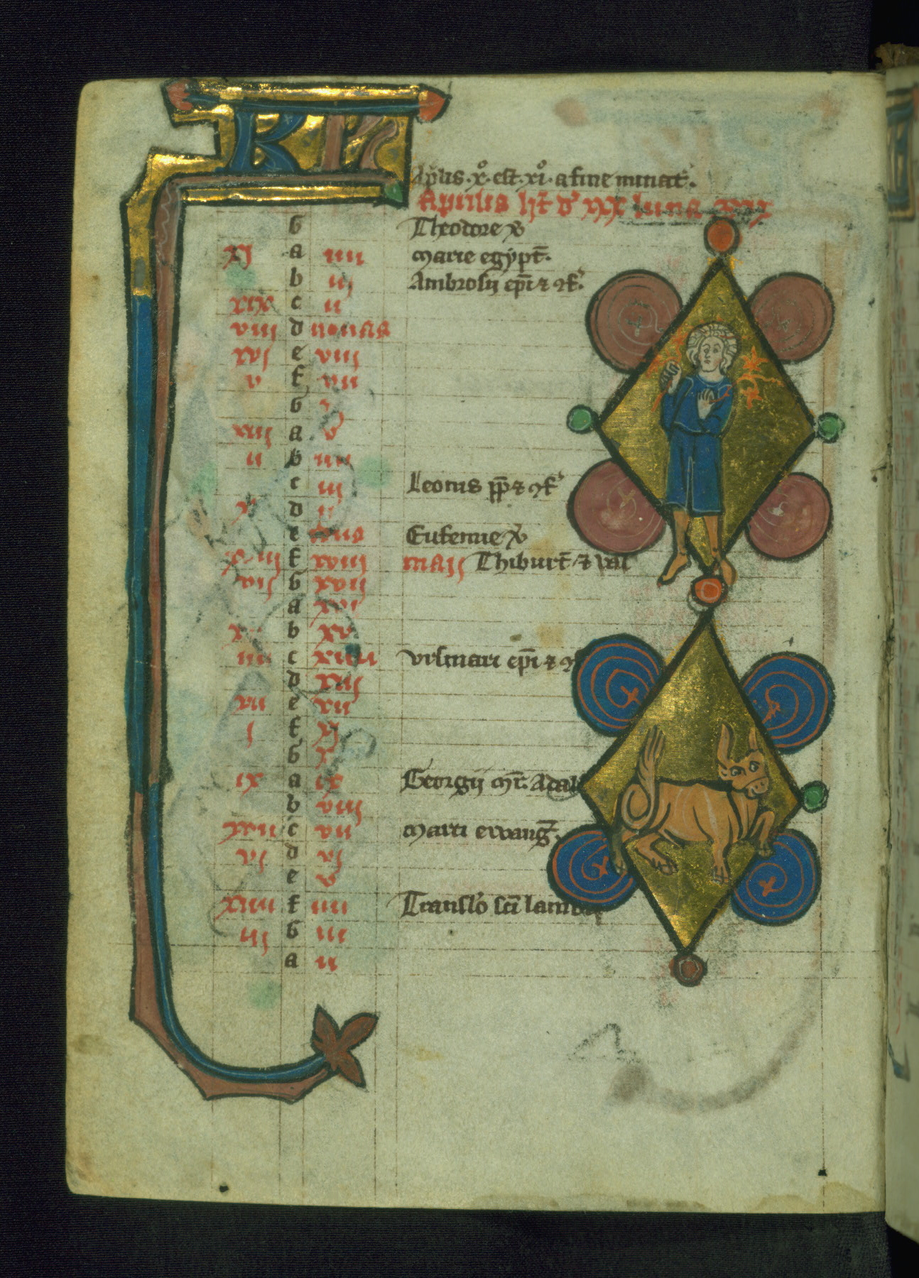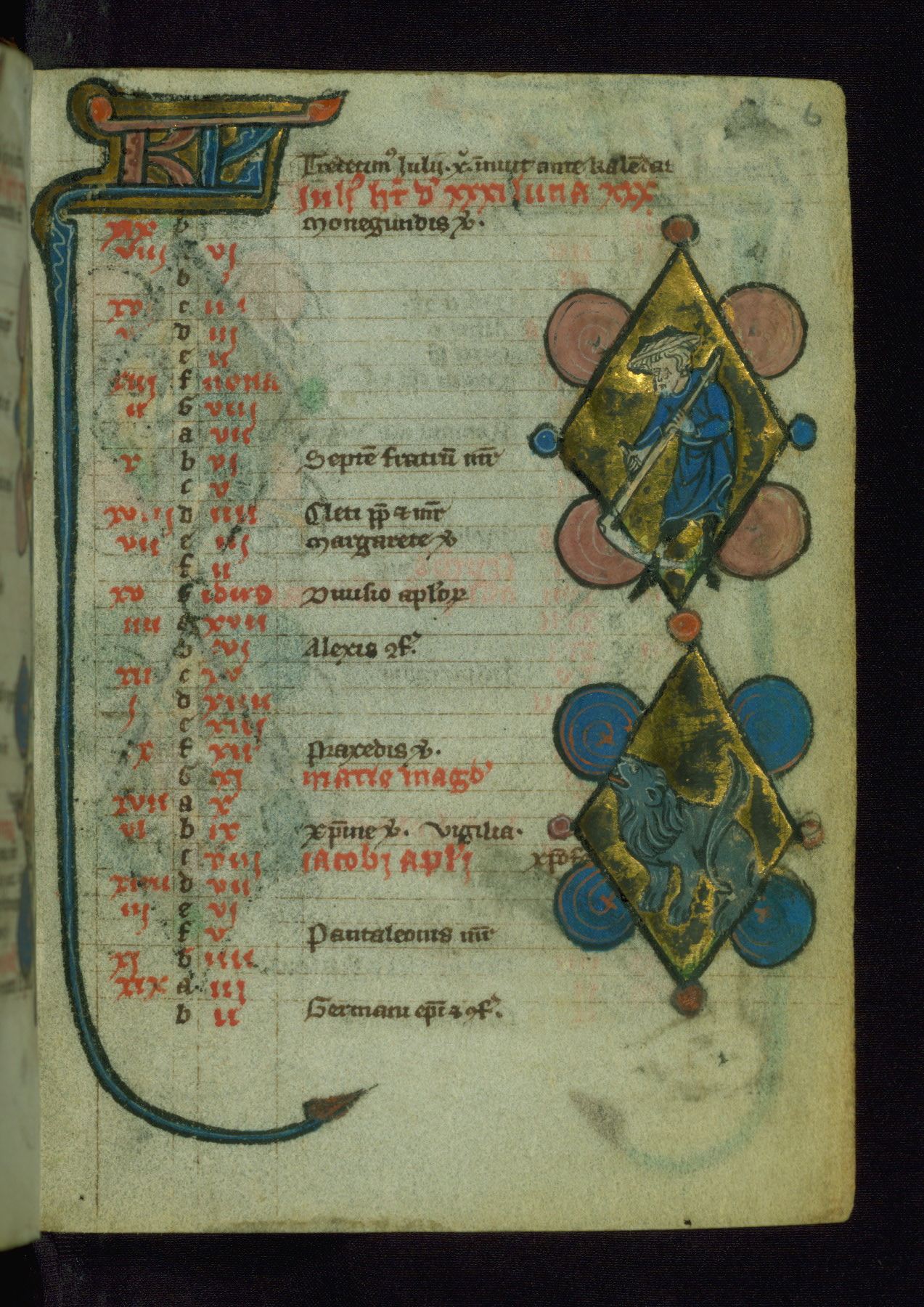 - Contents: Use of Liège; one quarter to one half full; graded in red and black ink; twenty-eight virgin saints shows considerable female representation; many saints of Huy indicate intended usage there; notable saints include Mengold (February 8, count of Huy), Lambert (April 28), Domitian (May 7, bishop of Tongres and Huy, patron of Huy), Gengulf (May 11), Servatius (May 13, bishop of Tongres), Monegund (July 1), Helen (August 18, "regine," and the only other with this saint listed this way is British Library Harley 2930, which is also from Liège and made for a woman who was likely a Beguine), Lambert (September 17, bishop of Liège, patron saint of diocese), Remigius (October 1), Hubert (November 3, bishop of Liège, buried at St.-Pierre, Liège), Leonard (November 6), Geneviève (November 26, "Genofeue," also uniquely found this way in a group of Liège manuscripts, see Oliver, 1988), Begga (December 17, "uidue," patron saint of Beguines