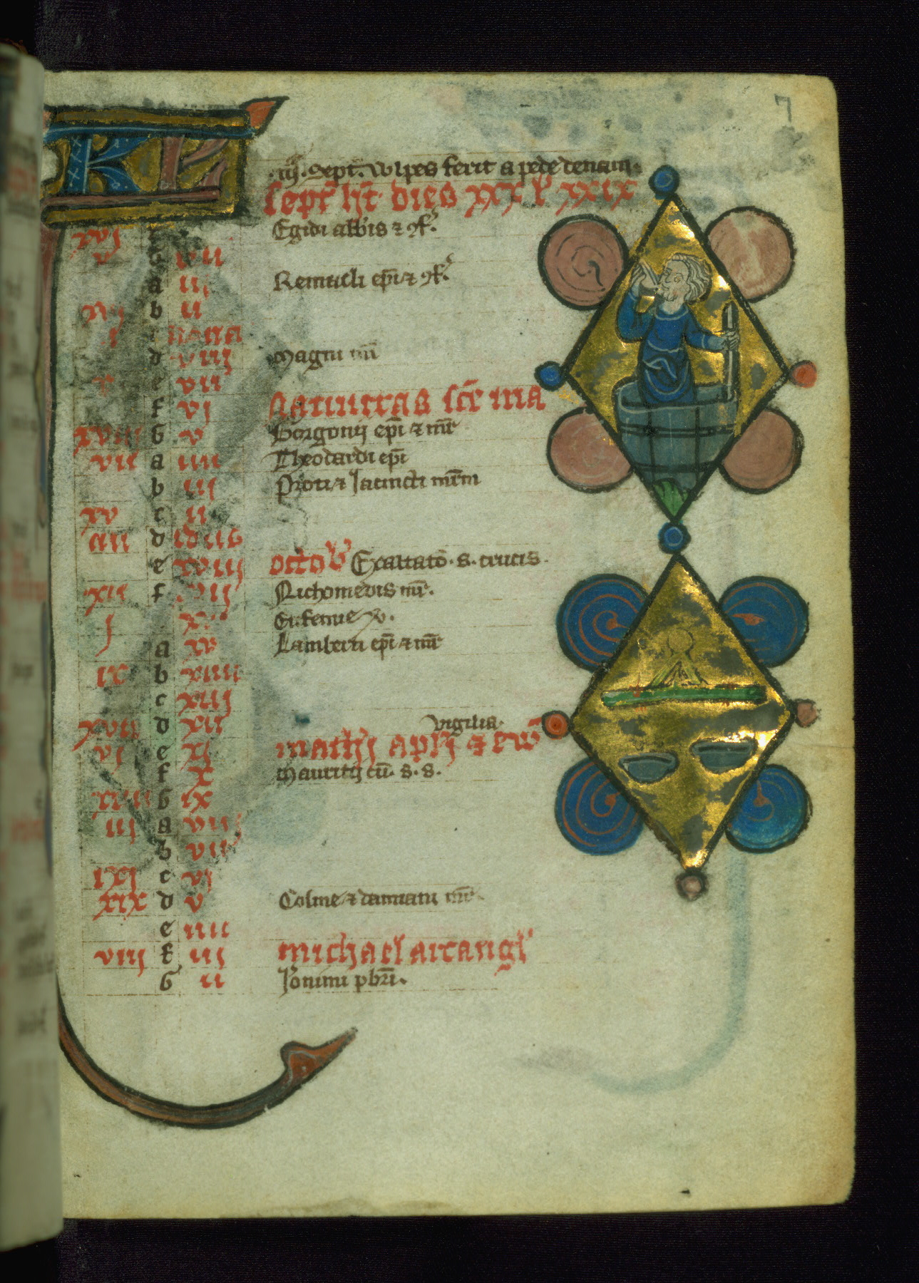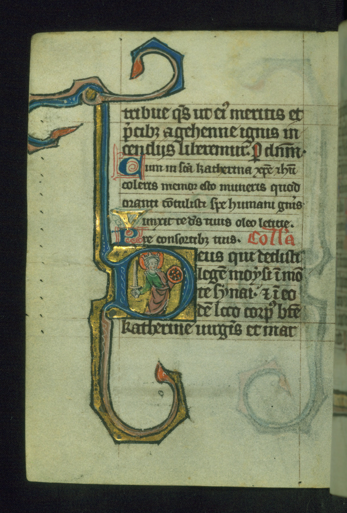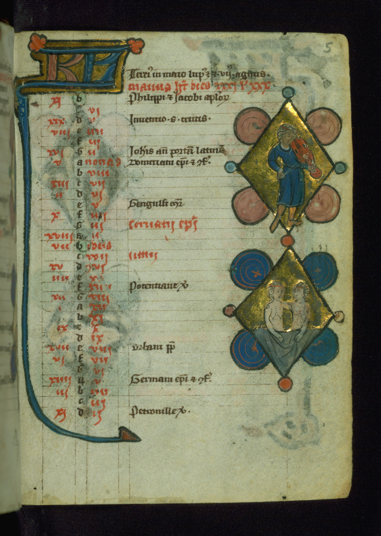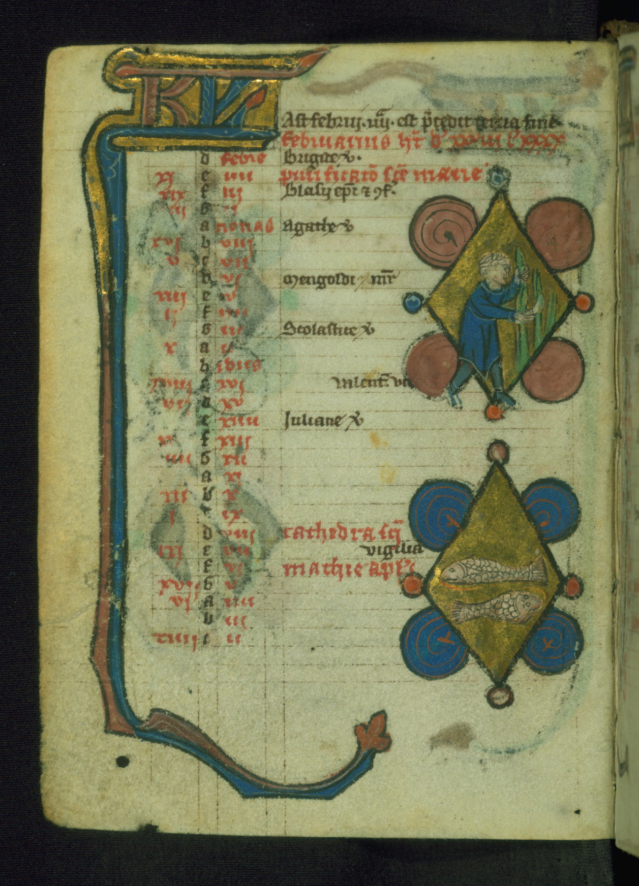 - Contents: Use of Liège; one quarter to one half full; graded in red and black ink; twenty-eight virgin saints shows considerable female representation; many saints of Huy indicate intended usage there; notable saints include Mengold (February 8, count of Huy), Lambert (April 28), Domitian (May 7, bishop of Tongres and Huy, patron of Huy), Gengulf (May 11), Servatius (May 13, bishop of Tongres), Monegund (July 1), Helen (August 18, "regine," and the only other with this saint listed this way is British Library Harley 2930, which is also from Liège and made for a woman who was likely a Beguine), Lambert (September 17, bishop of Liège, patron saint of diocese), Remigius (October 1), Hubert (November 3, bishop of Liège, buried at St.-Pierre, Liège), Leonard (November 6), Geneviève (November 26, "Genofeue," also uniquely found this way in a group of Liège manuscripts, see Oliver, 1988), Begga (December 17, "uidue," patron saint of Beguines