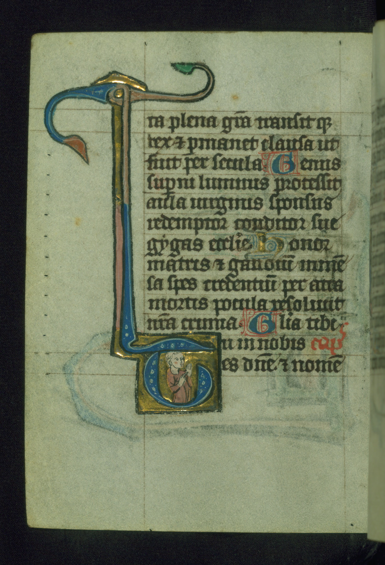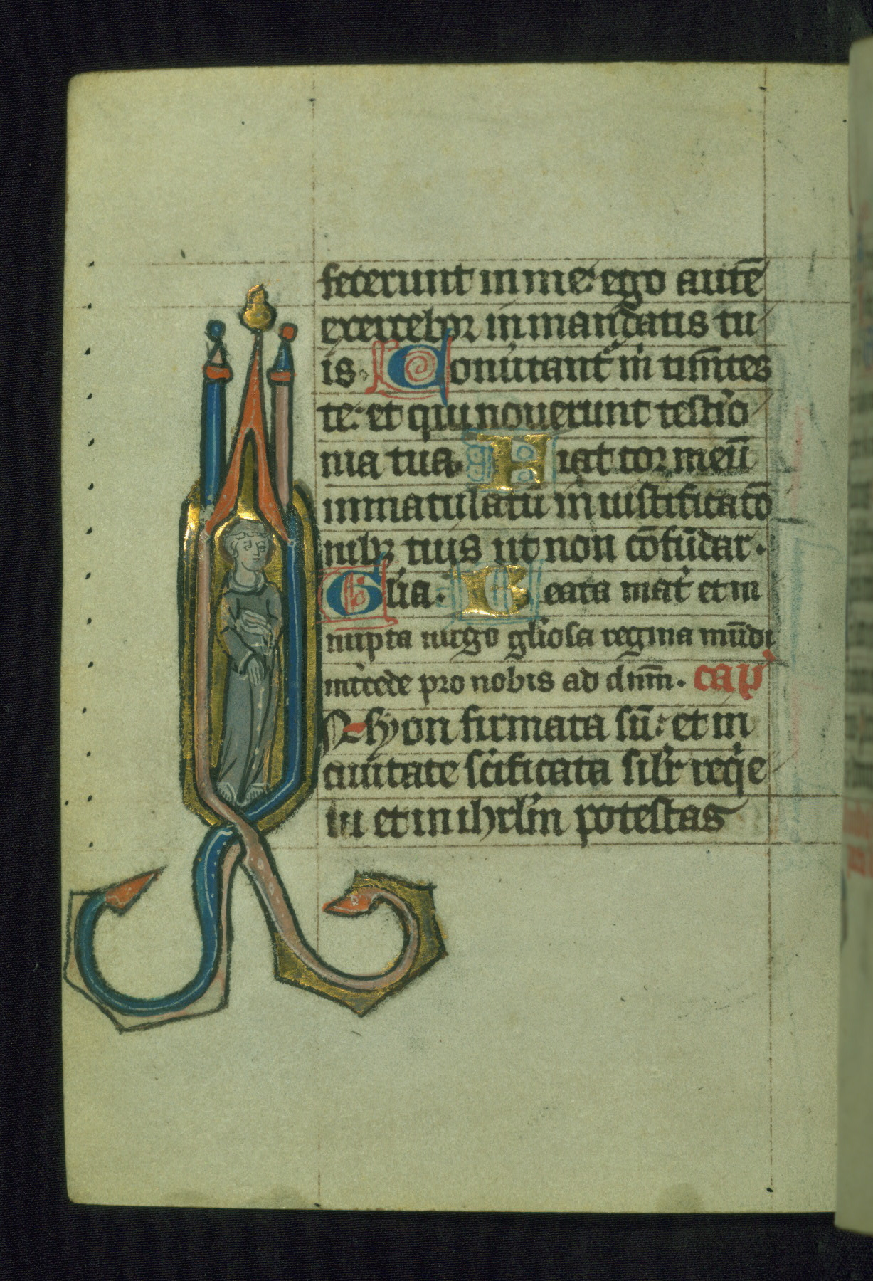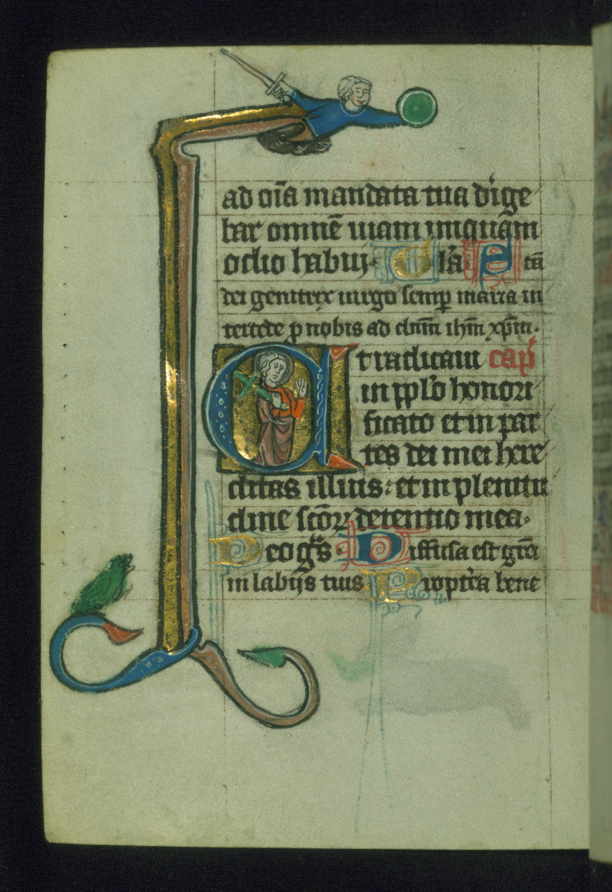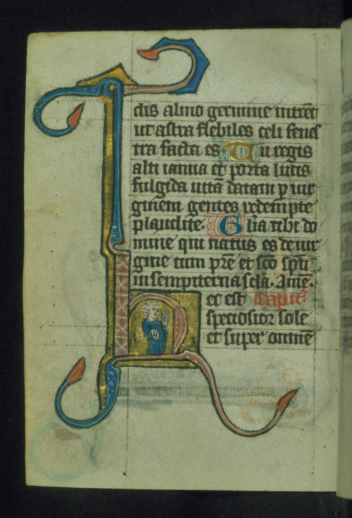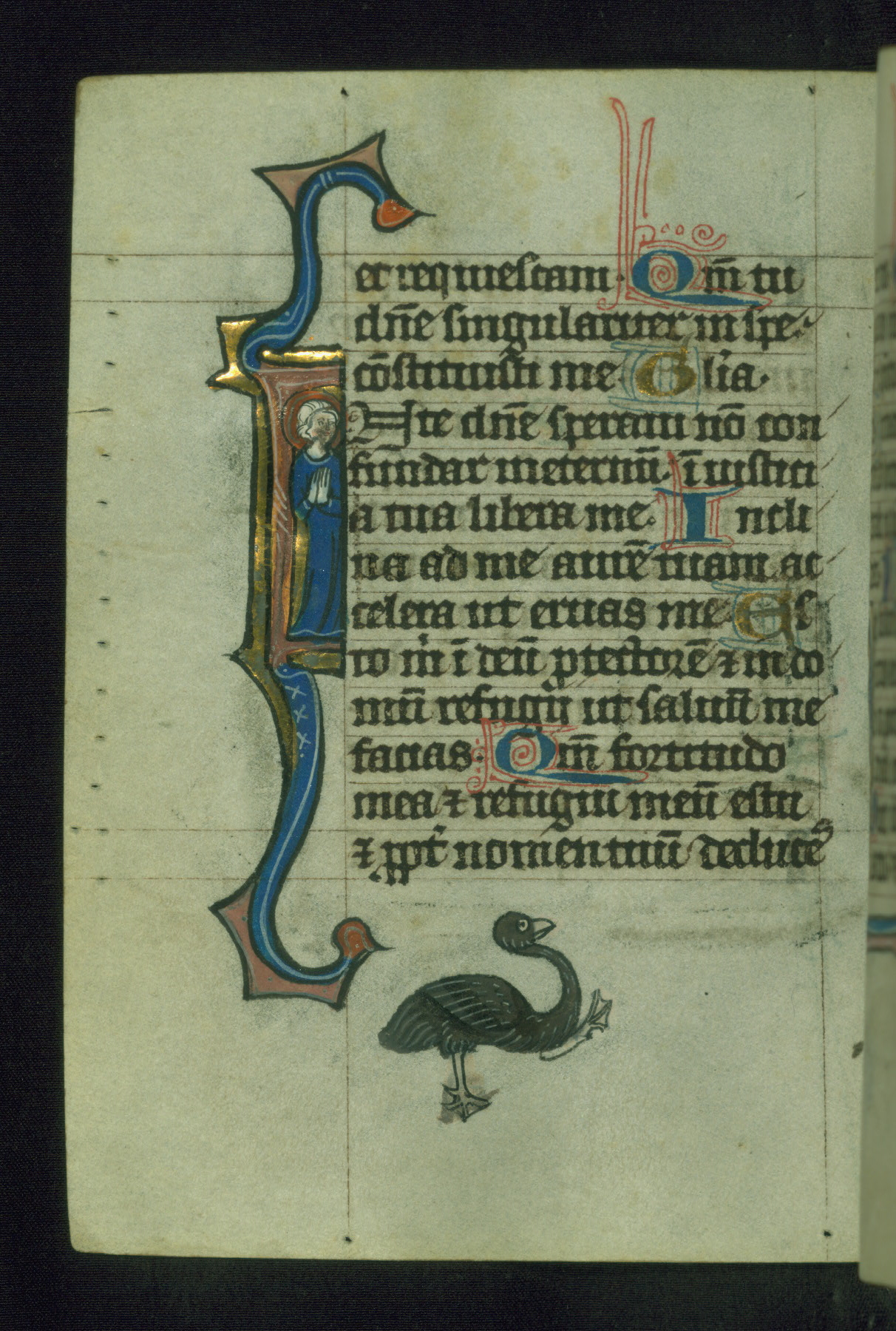 - Decoration note: Two full-page miniatures and one large historiated initial missing; fourteen extant full-page miniatures; twenty-four calendar illuminations with labors and zodiac symbols for each month (13 lines); eleven extant large historiated initials (8 to 10 lines) face full-page miniatures; 188 small historiated initials (4 lines) at secondary text divisions; drolleries throughout; alternating gold and blue versals with blue and red pen flourishes throughout (1 line); borders formed of prolonged extenders of initials; line fillers in litany have geometric or floral designs, birds, or beasts; rubrics in red; text in black ink