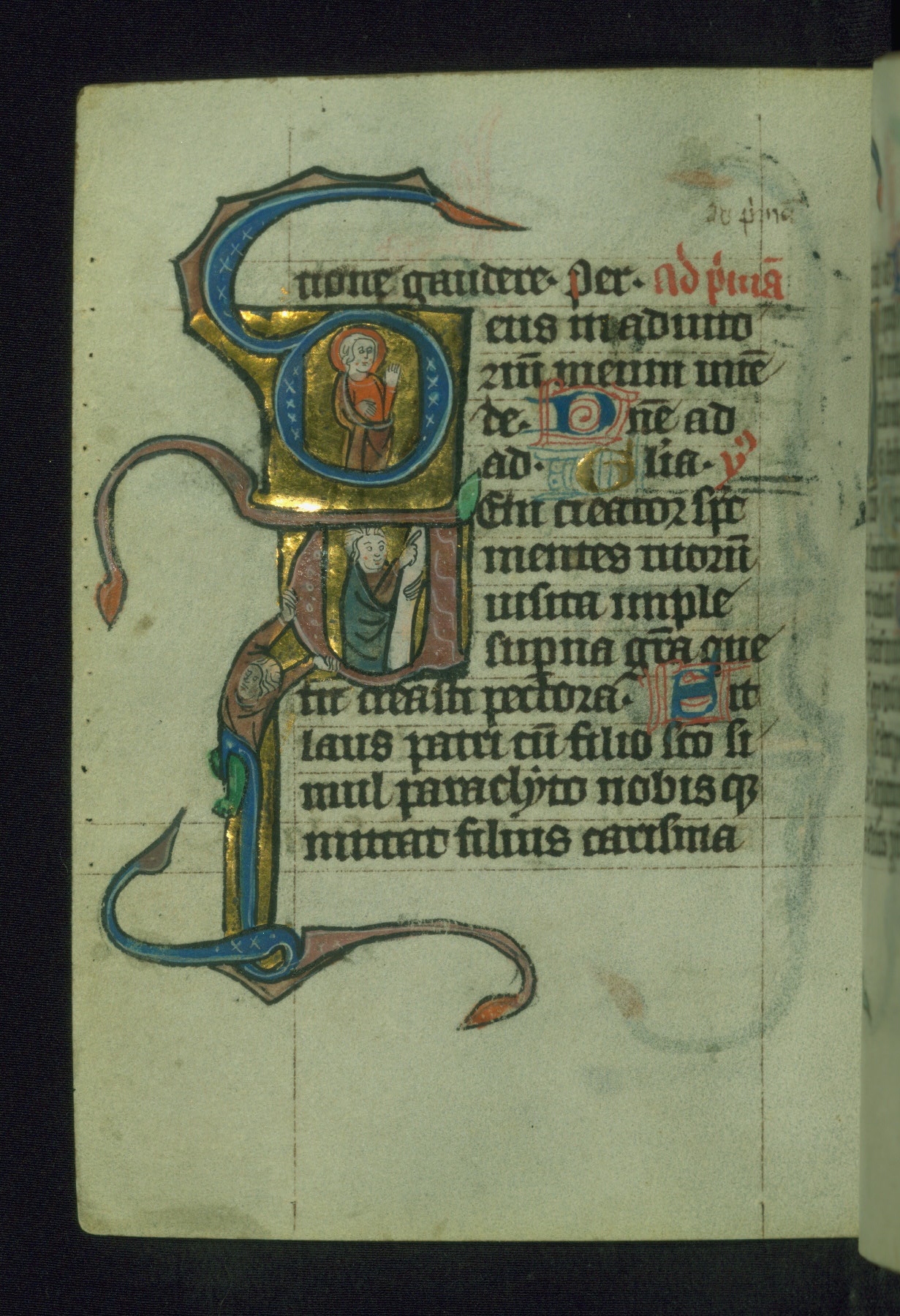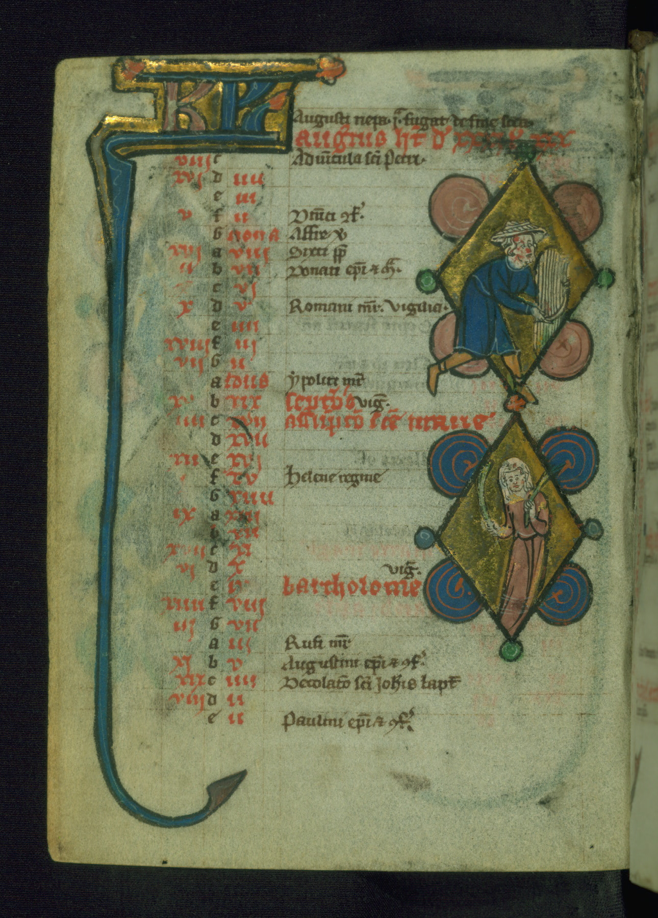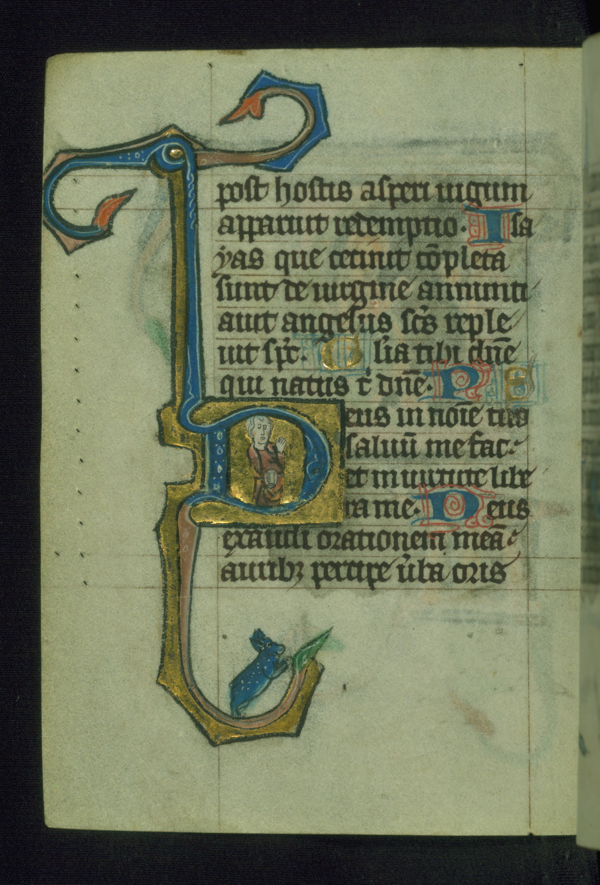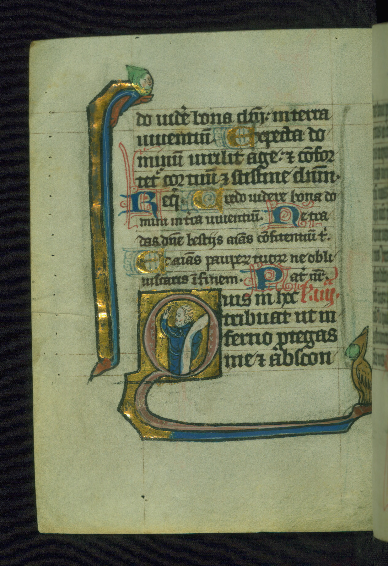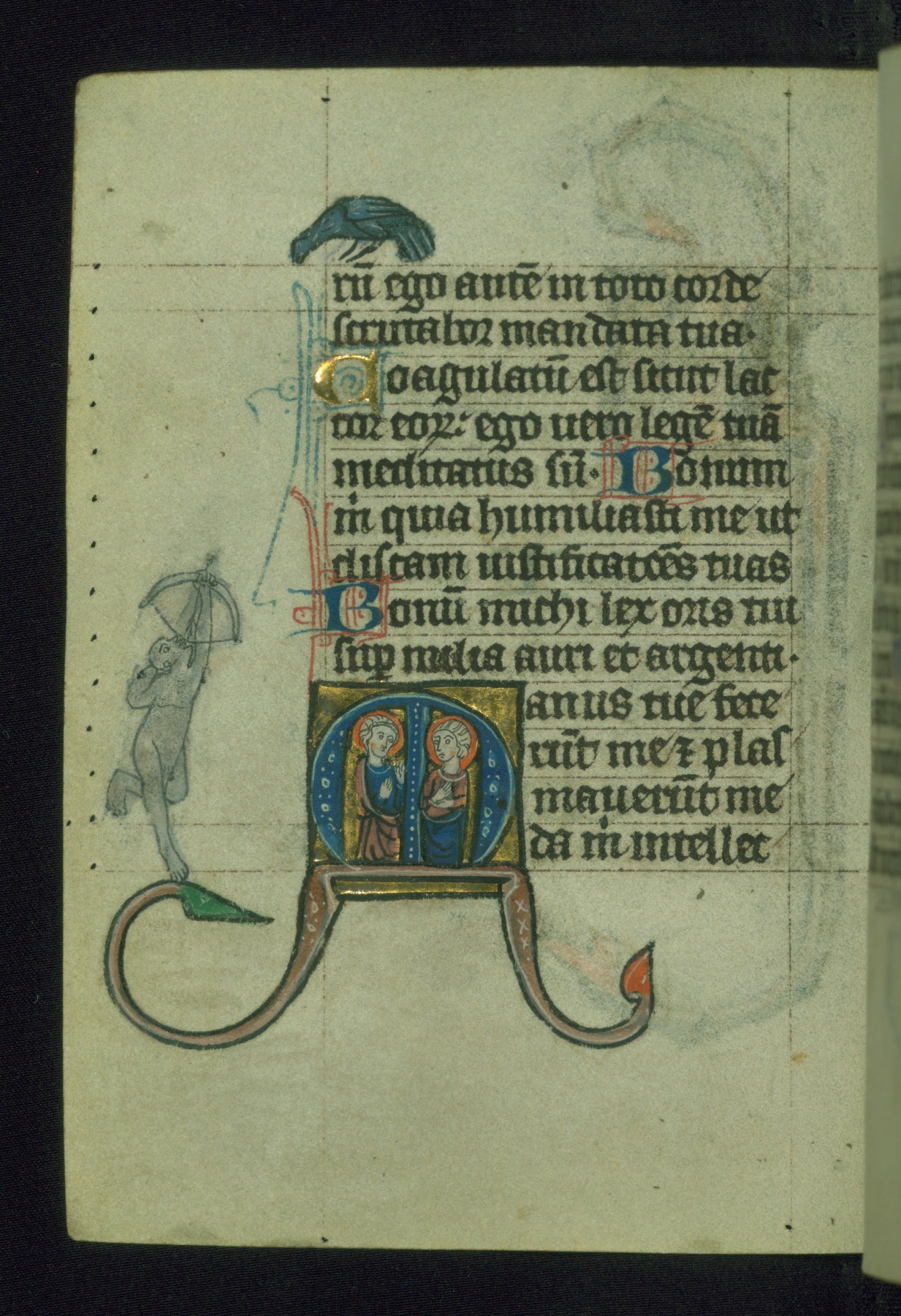 - Decoration note: Two full-page miniatures and one large historiated initial missing; fourteen extant full-page miniatures; twenty-four calendar illuminations with labors and zodiac symbols for each month (13 lines); eleven extant large historiated initials (8 to 10 lines) face full-page miniatures; 188 small historiated initials (4 lines) at secondary text divisions; drolleries throughout; alternating gold and blue versals with blue and red pen flourishes throughout (1 line); borders formed of prolonged extenders of initials; line fillers in litany have geometric or floral designs, birds, or beasts; rubrics in red; text in black ink