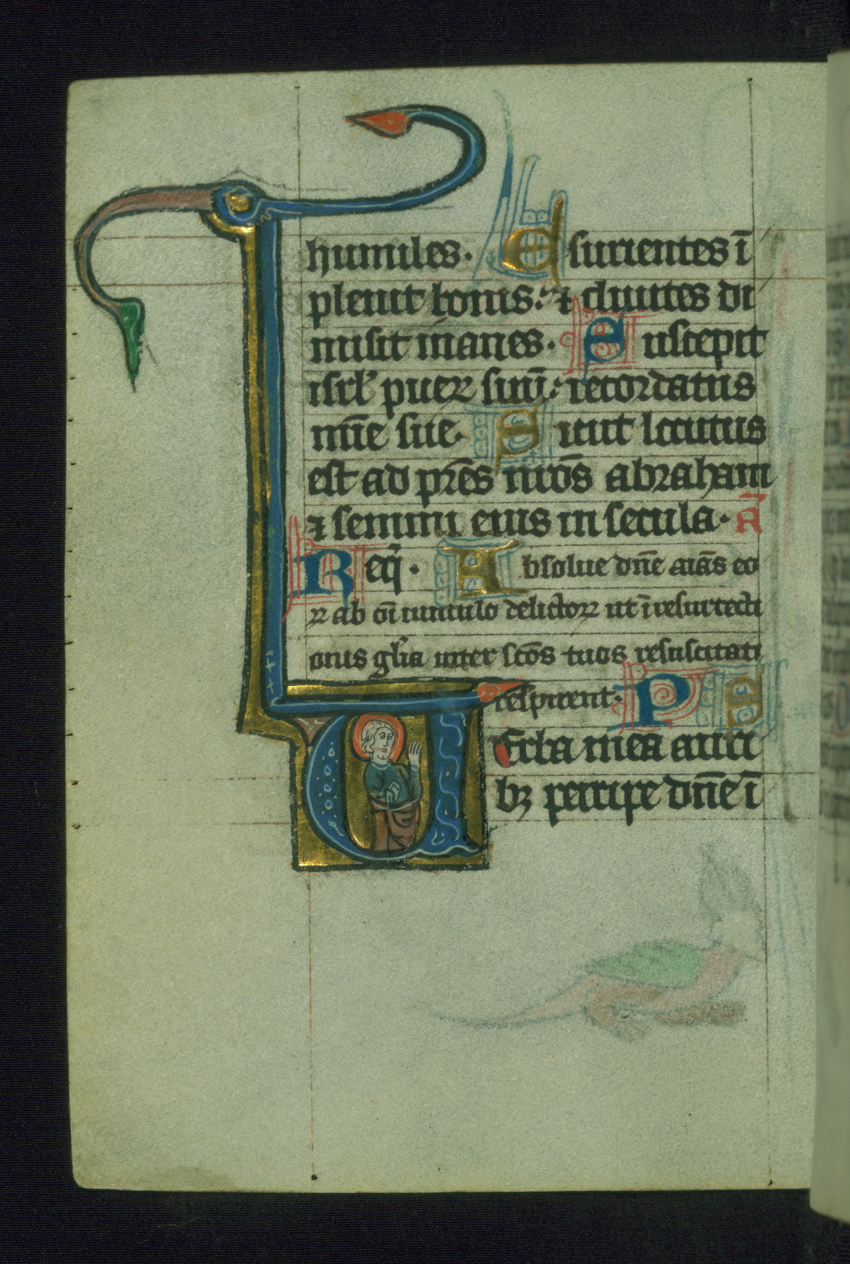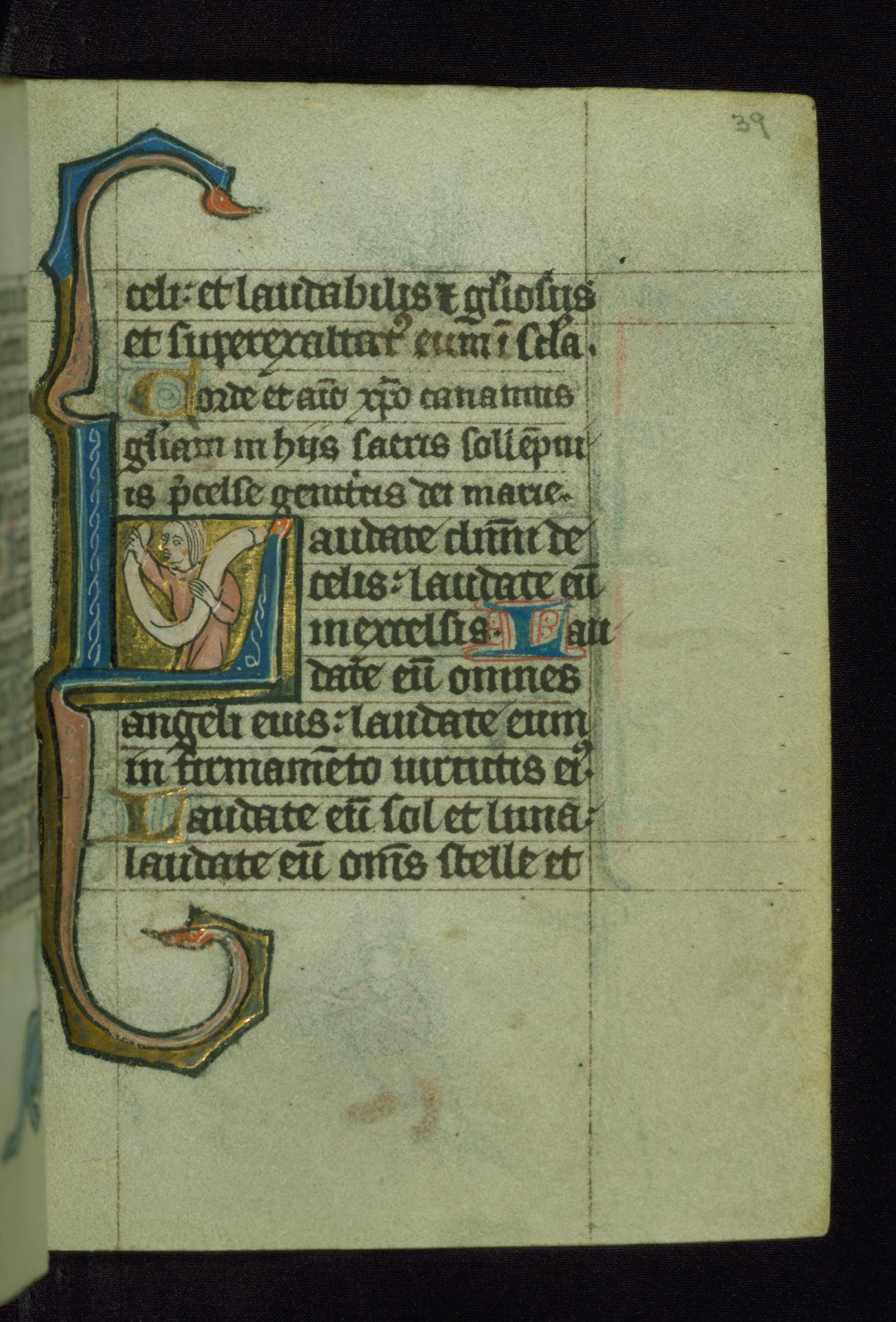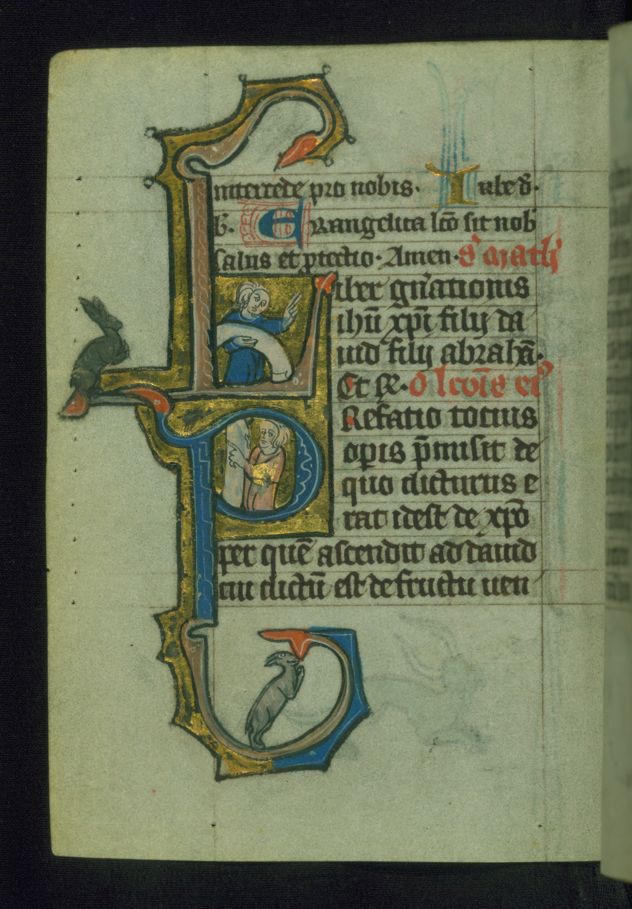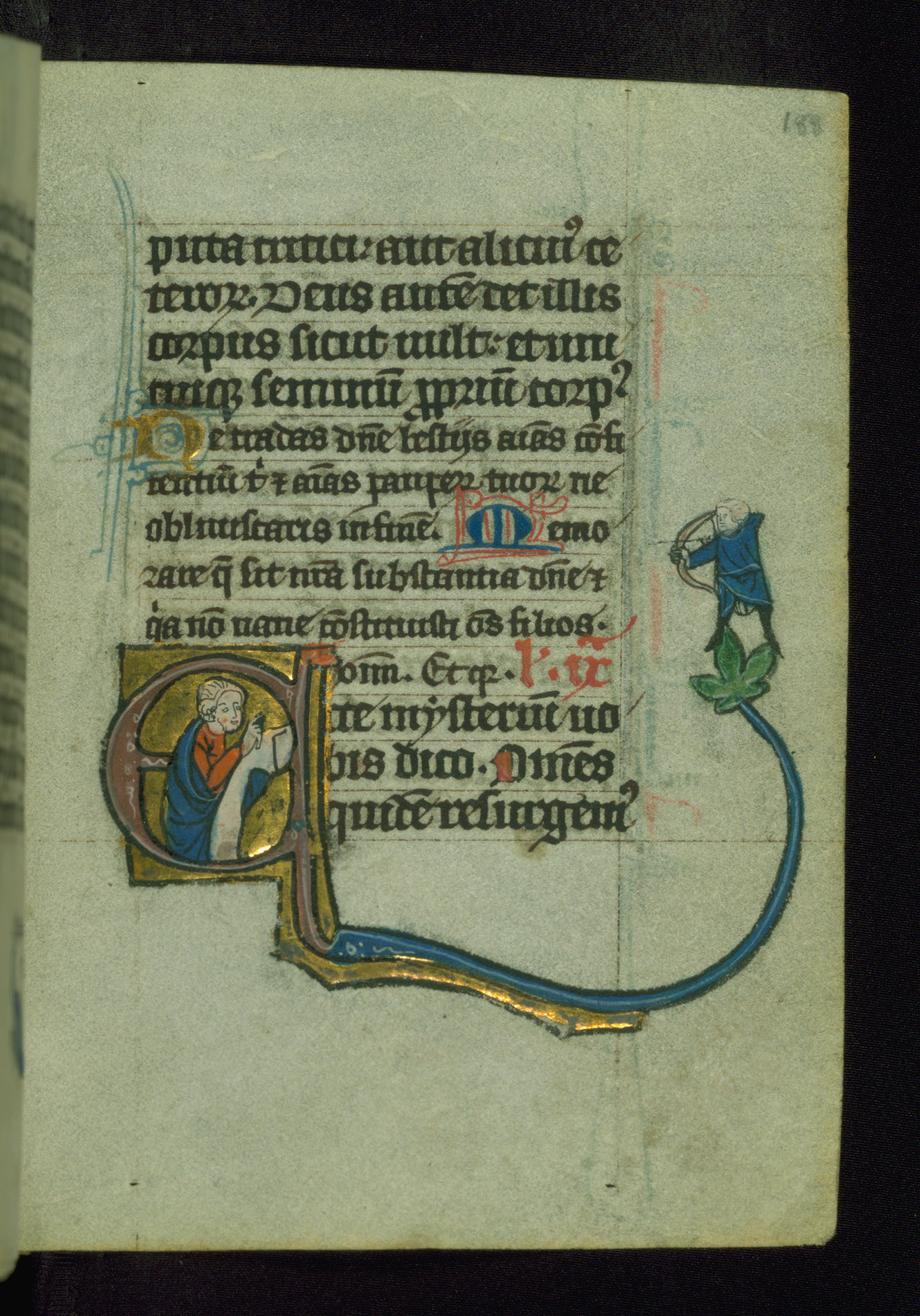 - Decoration note: Two full-page miniatures and one large historiated initial missing; fourteen extant full-page miniatures; twenty-four calendar illuminations with labors and zodiac symbols for each month (13 lines); eleven extant large historiated initials (8 to 10 lines) face full-page miniatures; 188 small historiated initials (4 lines) at secondary text divisions; drolleries throughout; alternating gold and blue versals with blue and red pen flourishes throughout (1 line); borders formed of prolonged extenders of initials; line fillers in litany have geometric or floral designs, birds, or beasts; rubrics in red; text in black ink