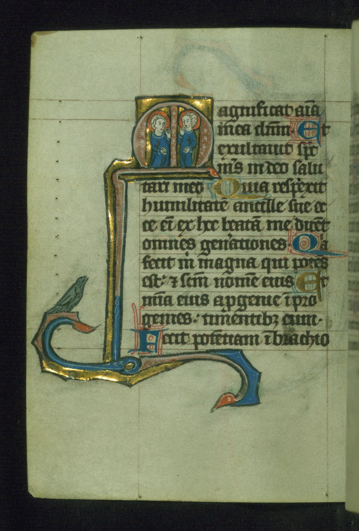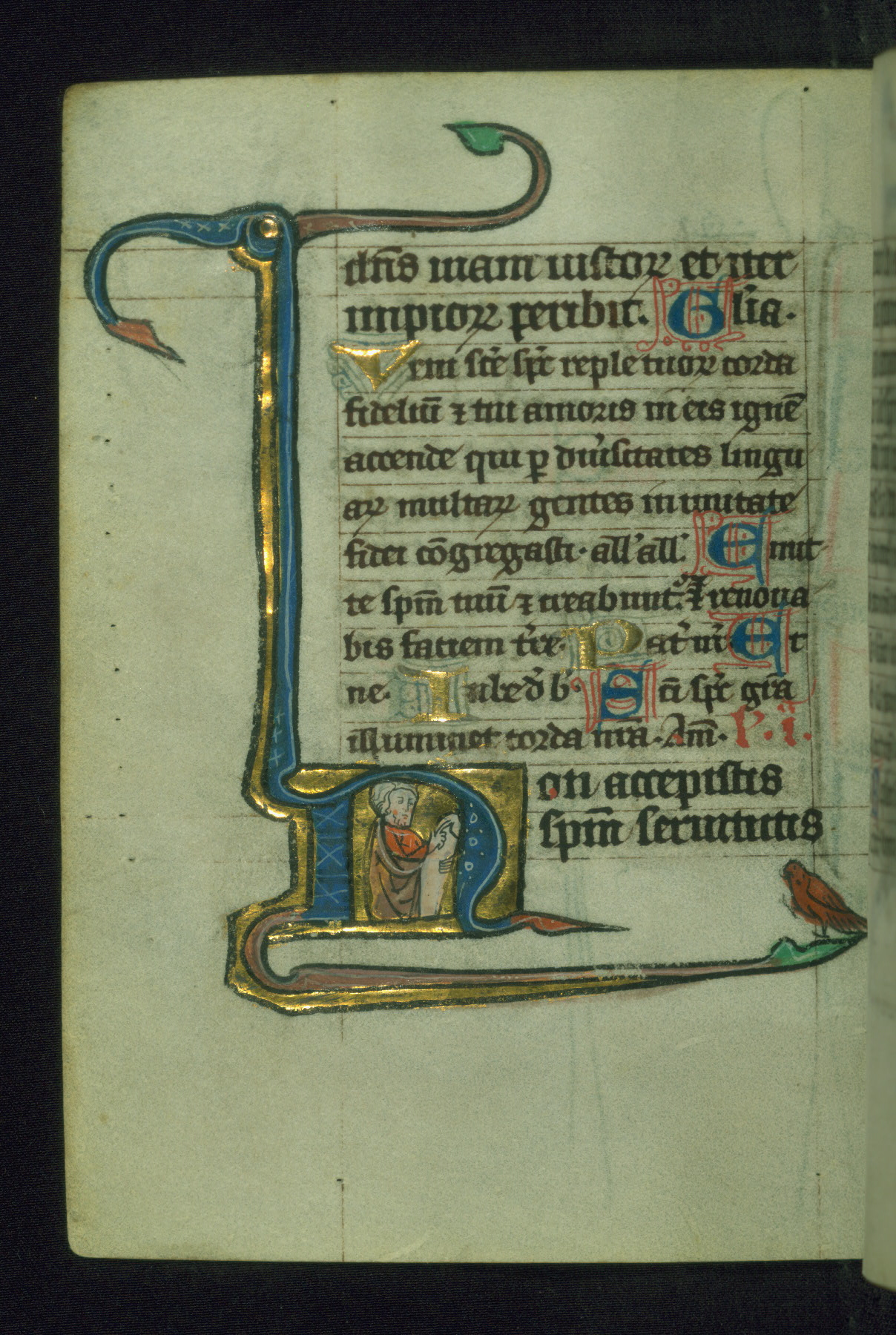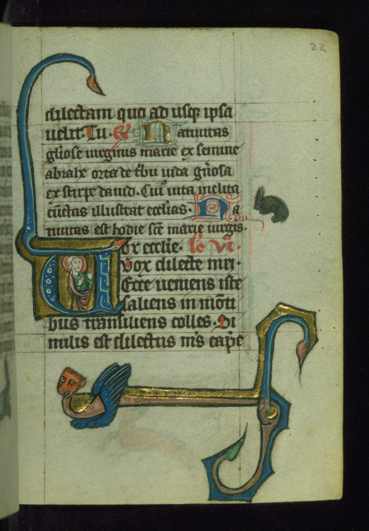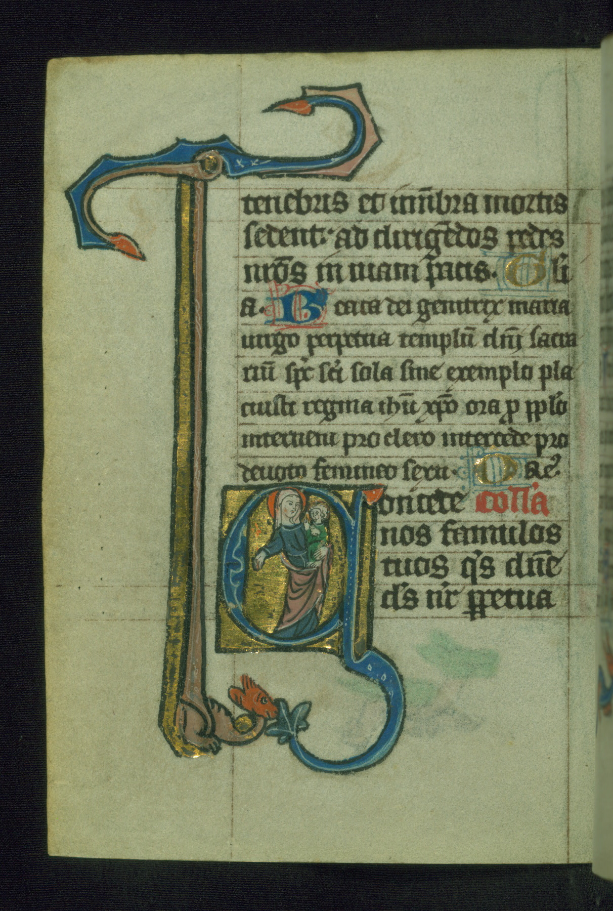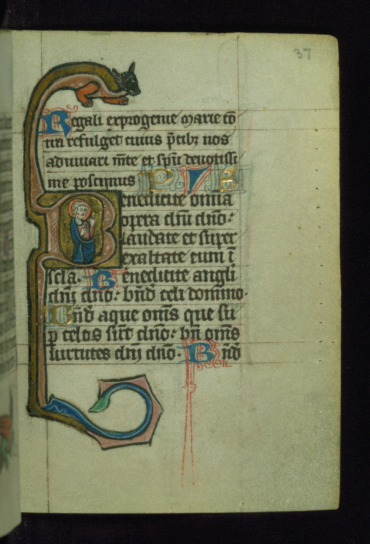 - Decoration note: Two full-page miniatures and one large historiated initial missing; fourteen extant full-page miniatures; twenty-four calendar illuminations with labors and zodiac symbols for each month (13 lines); eleven extant large historiated initials (8 to 10 lines) face full-page miniatures; 188 small historiated initials (4 lines) at secondary text divisions; drolleries throughout; alternating gold and blue versals with blue and red pen flourishes throughout (1 line); borders formed of prolonged extenders of initials; line fillers in litany have geometric or floral designs, birds, or beasts; rubrics in red; text in black ink
