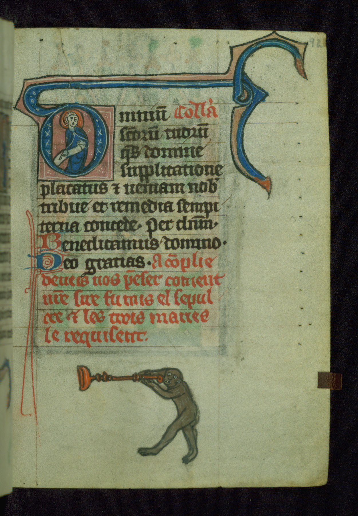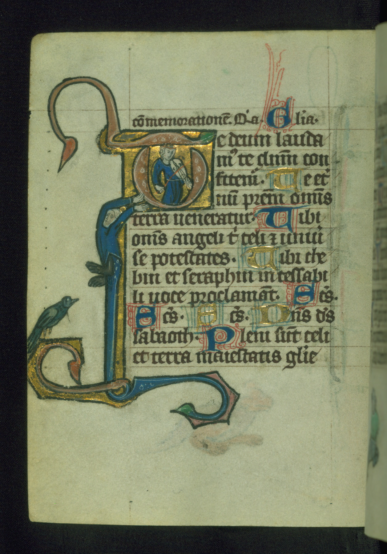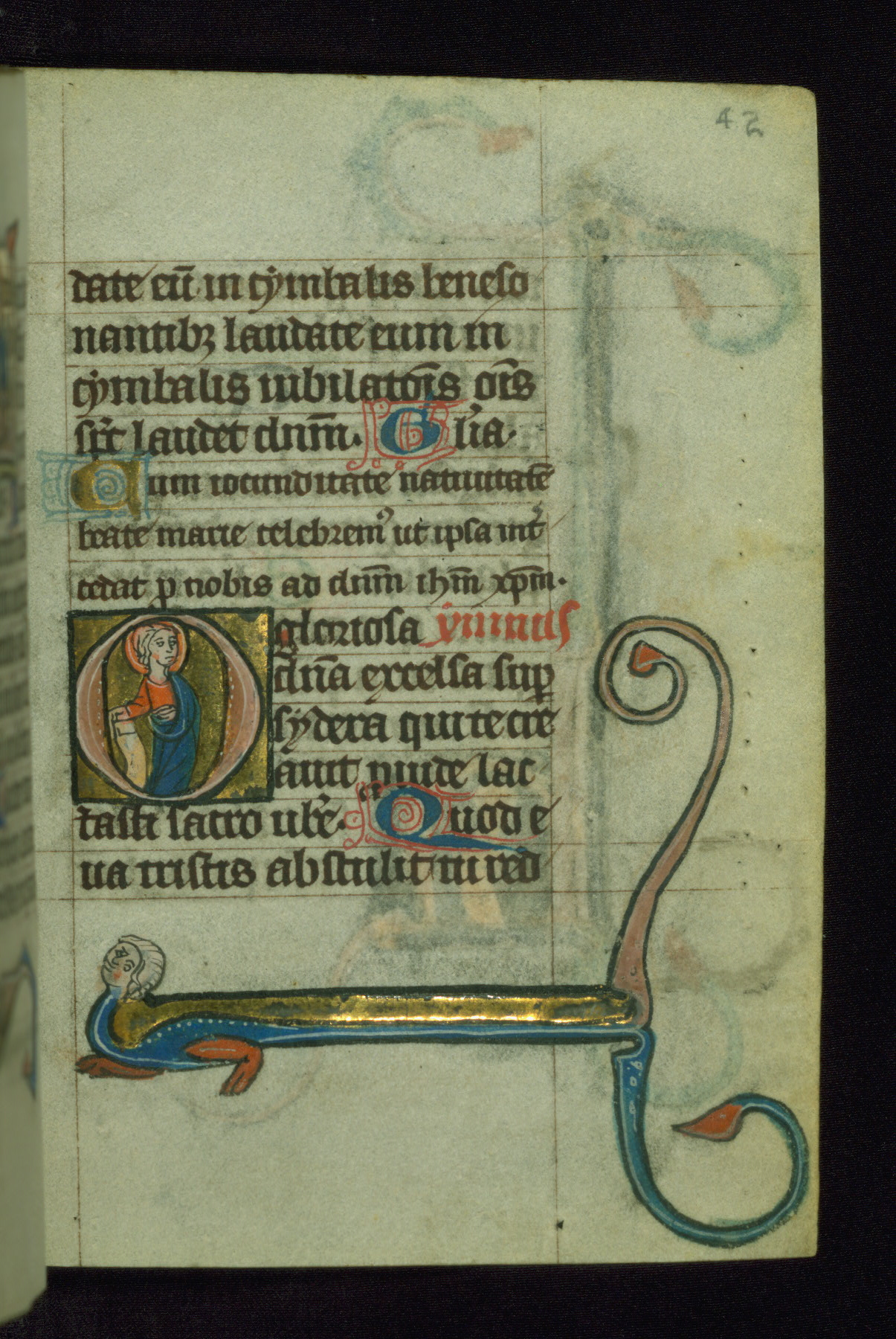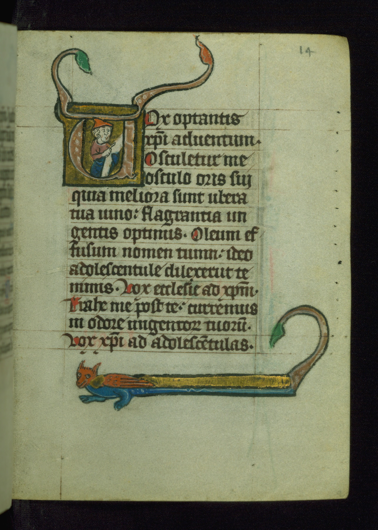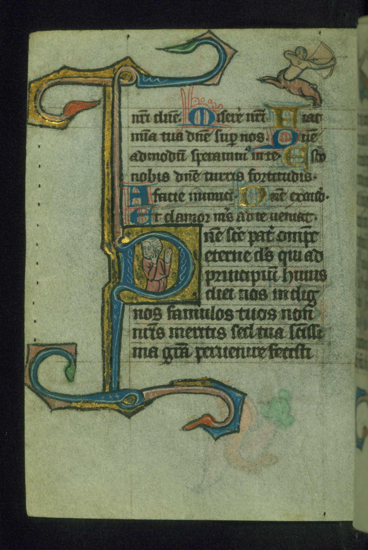- Decoration note: Two full-page miniatures and one large historiated initial missing; fourteen extant full-page miniatures; twenty-four calendar illuminations with labors and zodiac symbols for each month (13 lines); eleven extant large historiated initials (8 to 10 lines) face full-page miniatures; 188 small historiated initials (4 lines) at secondary text divisions; drolleries throughout; alternating gold and blue versals with blue and red pen flourishes throughout (1 line); borders formed of prolonged extenders of initials; line fillers in litany have geometric or floral designs, birds, or beasts; rubrics in red; text in black ink