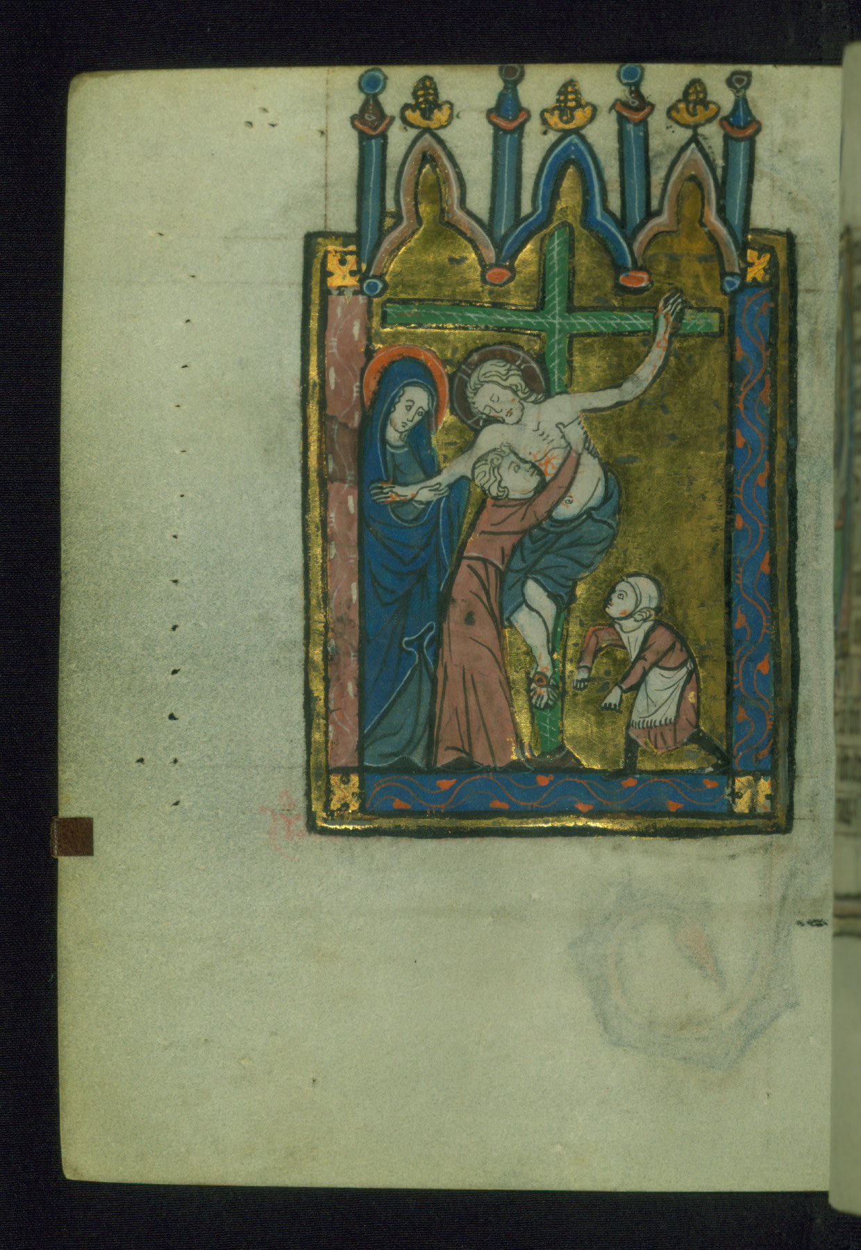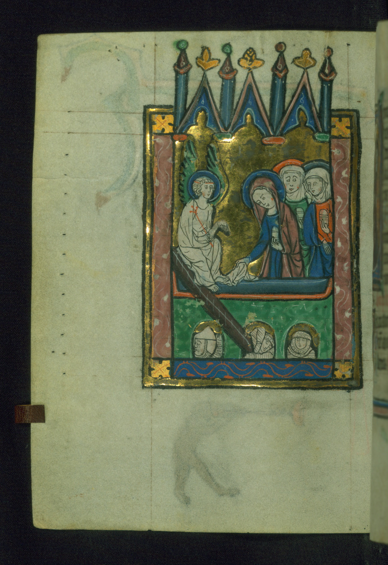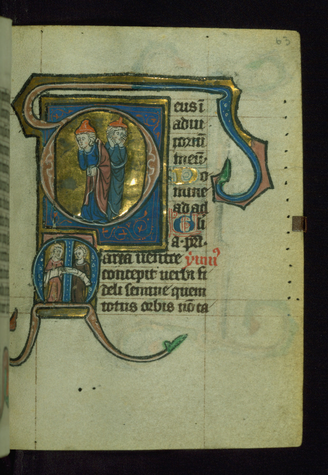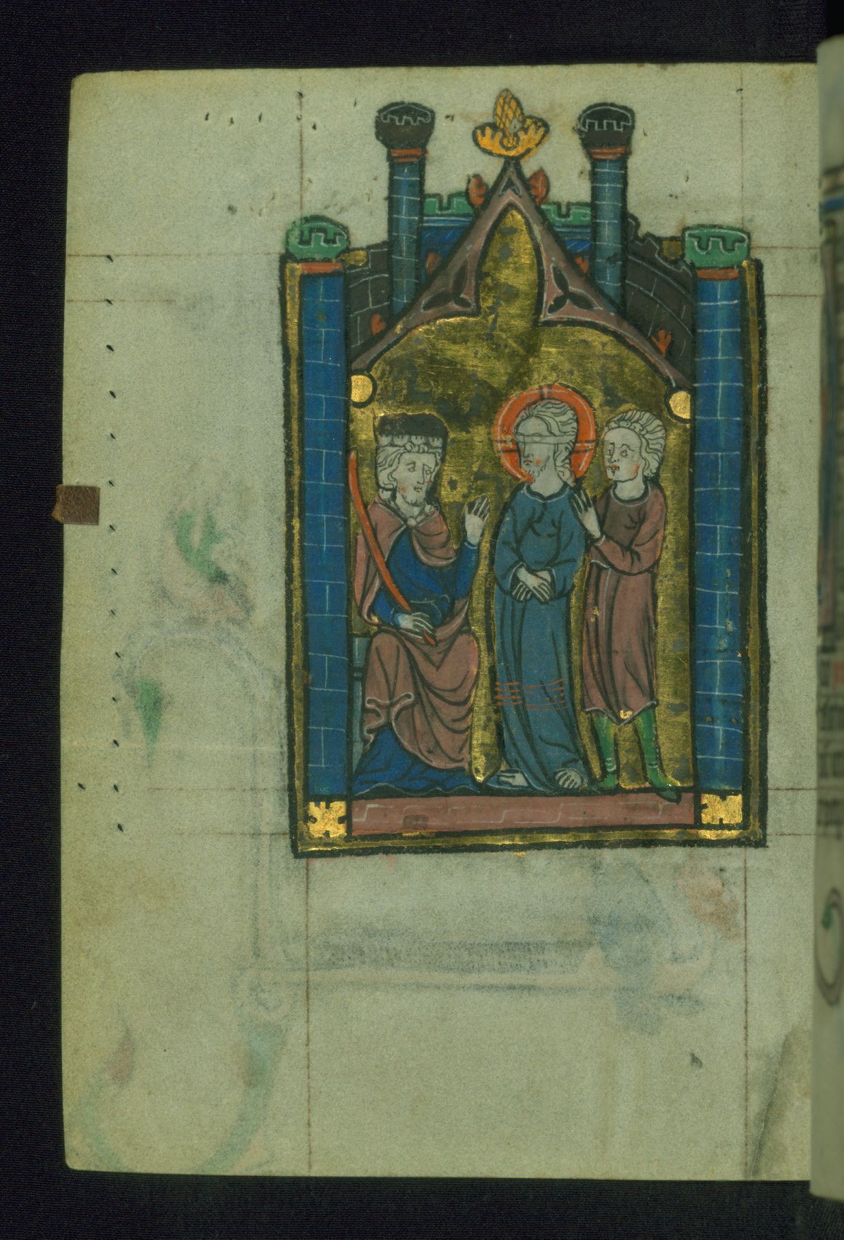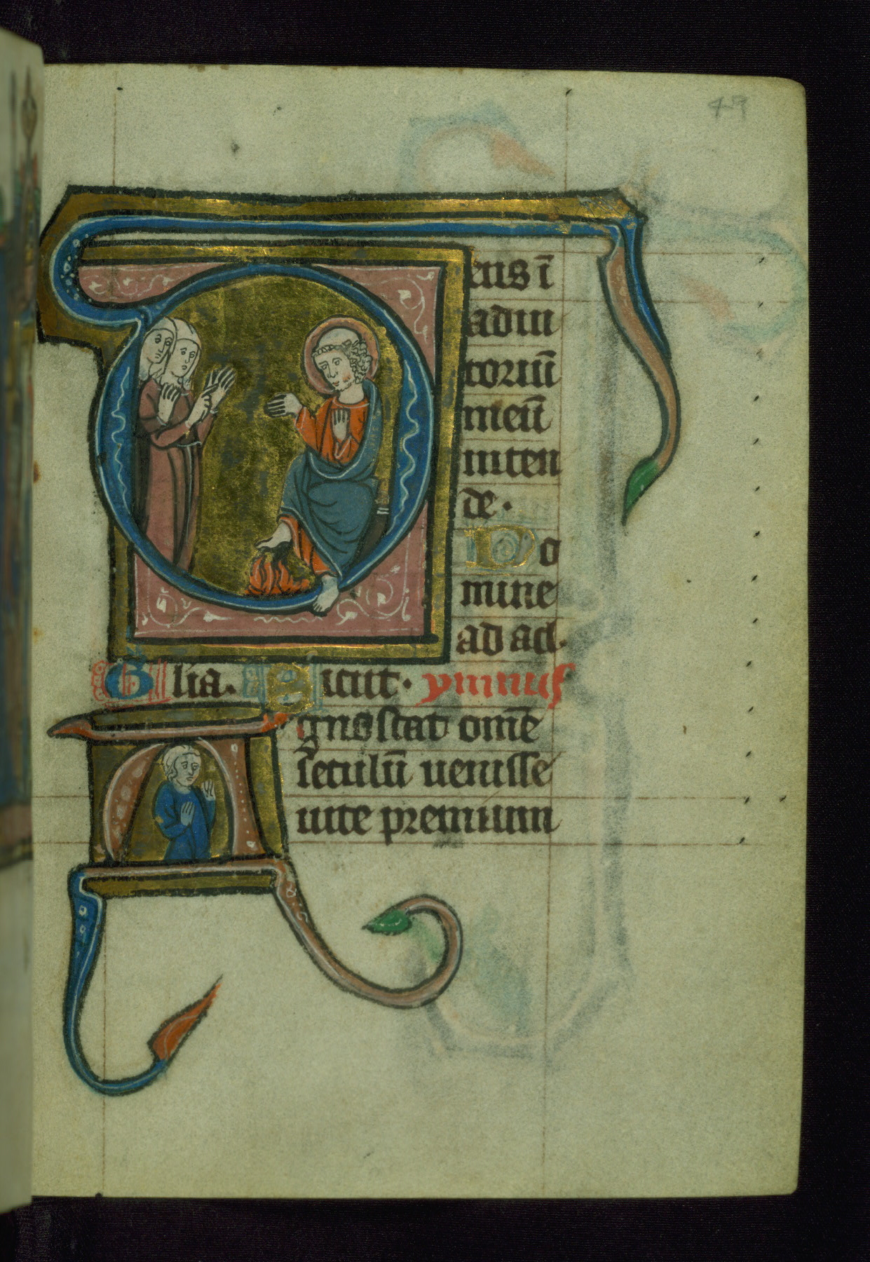 - Decoration note: Full-page miniature and facing large historiated initial lacking after fol. 12, and full-page miniature lacking after fol. 62; full-page miniatures fols. 32v, 48v, 69v, 76v, 83v, and 92v; large historiated initials fols. 33r, 49r, 63r, 70r, 77r, 84r, and 93r; small historiated initials fols. 13r, 14r, 15r-v, 18r, 19r, 20r, 21r, 22r, 23r, 24v, 26r, 27v, 28v, 29v, 30v, 33v, 35r, 36r, 37r, 39r, 40v, 41v, 42r-v, 43r, 44v, 45v, 46r-v, 47r-v, 48r, 49r-v, 50v, 51r, 52r, 53r-v, 58r, 60v, 62r, 63r-v, 64v, 65r, 66r, 67r-v, 68v, 69r, 79r-v, 71v, 72r, 73r, 74v, 75v, 76r, 77r-v, 78v, 79r, 80r-v, 81v, 82v, 83r, 84r, 85r, 86r, 87r, 88r, 89r, 90r-v, 91v, 92r, 93r-v, 94v, 95r, 97r-v, 98r, and 99r-v