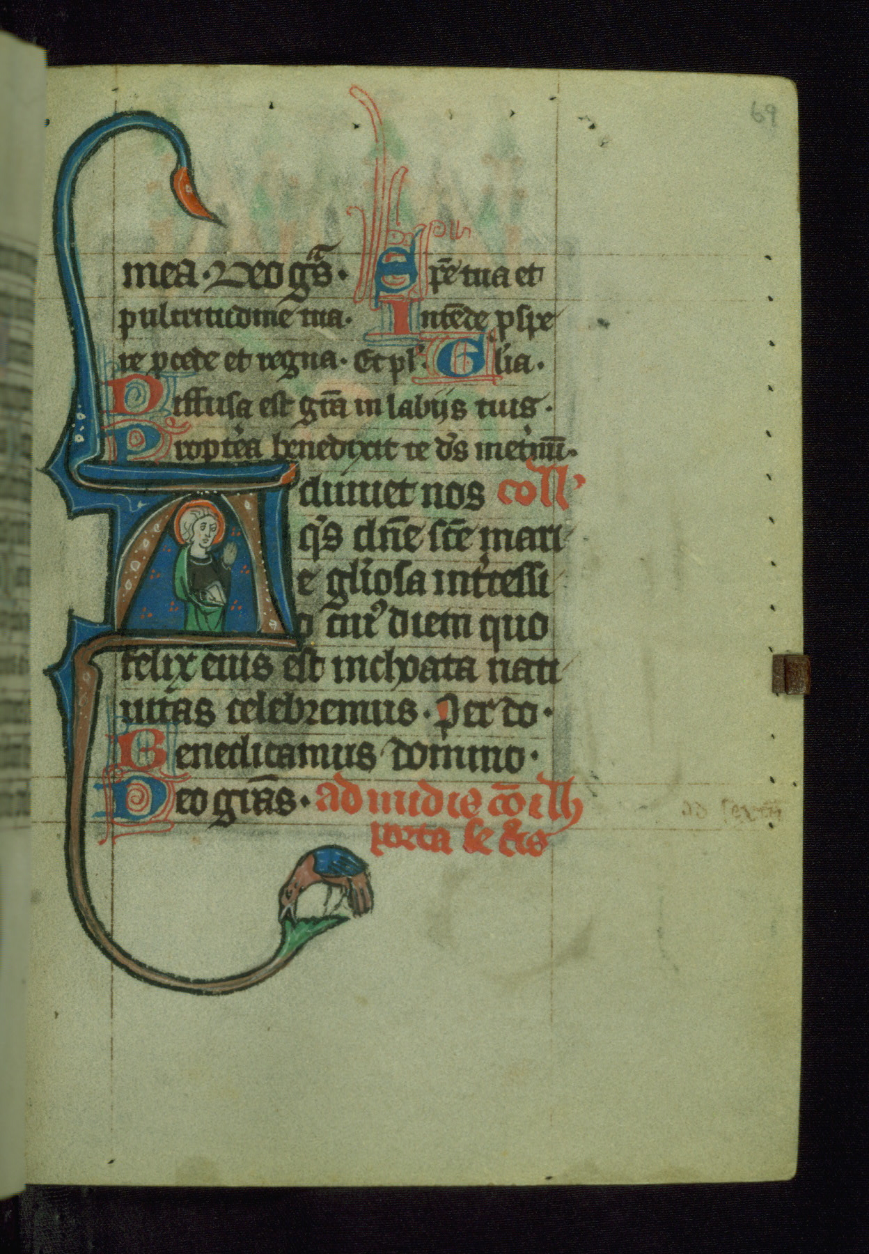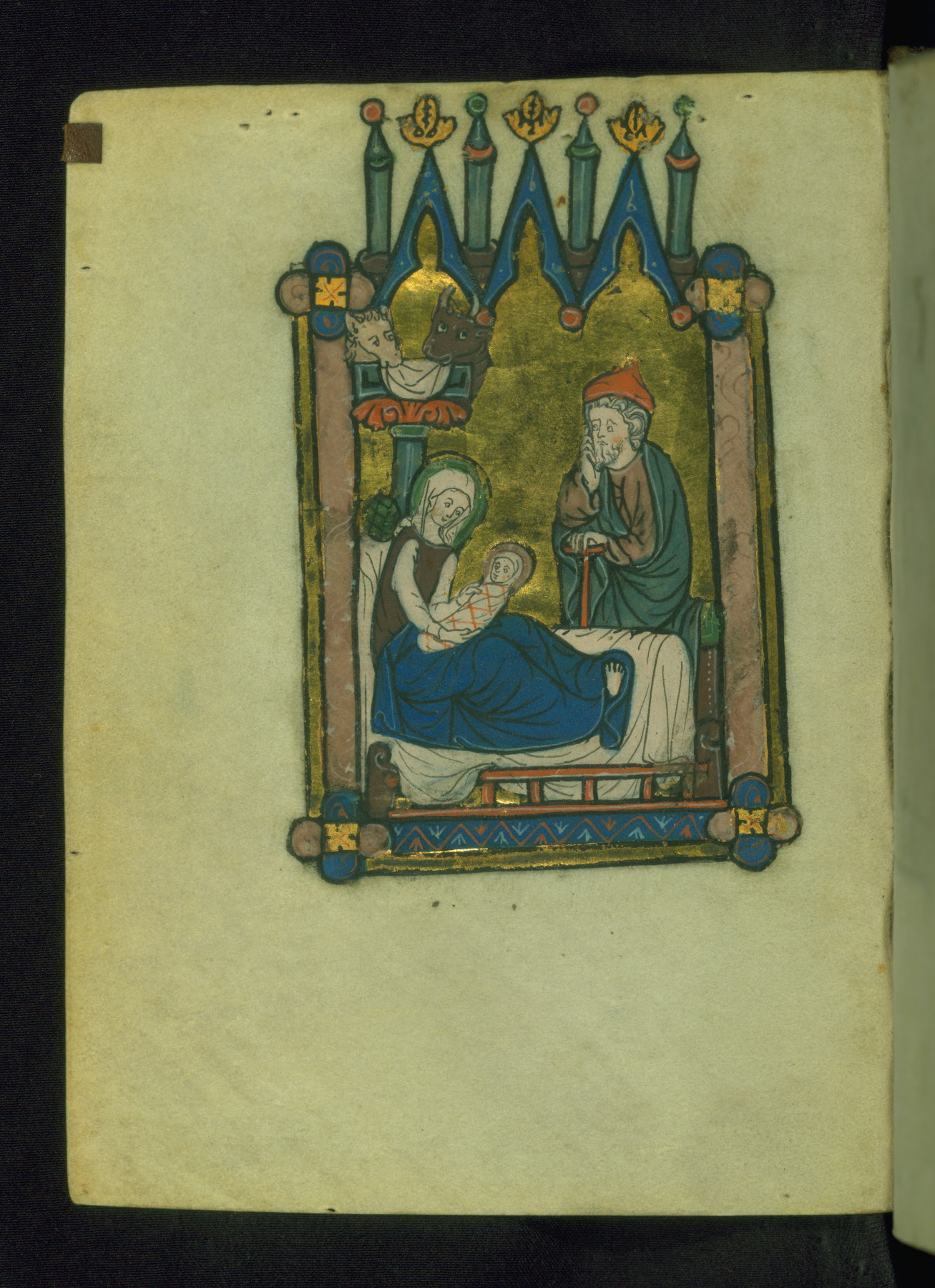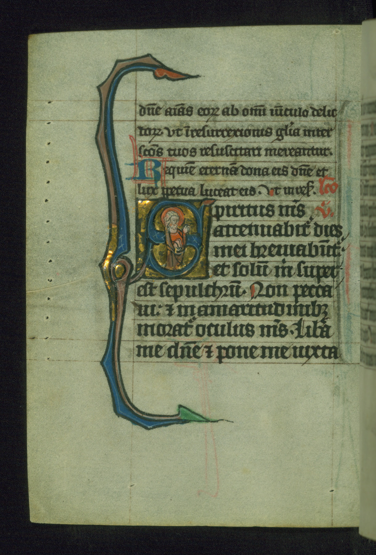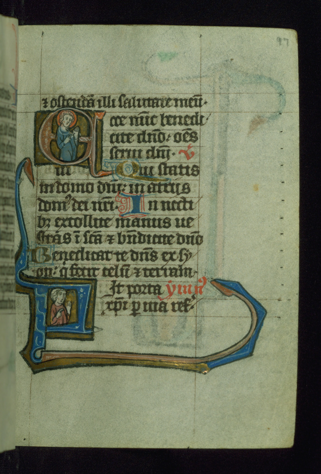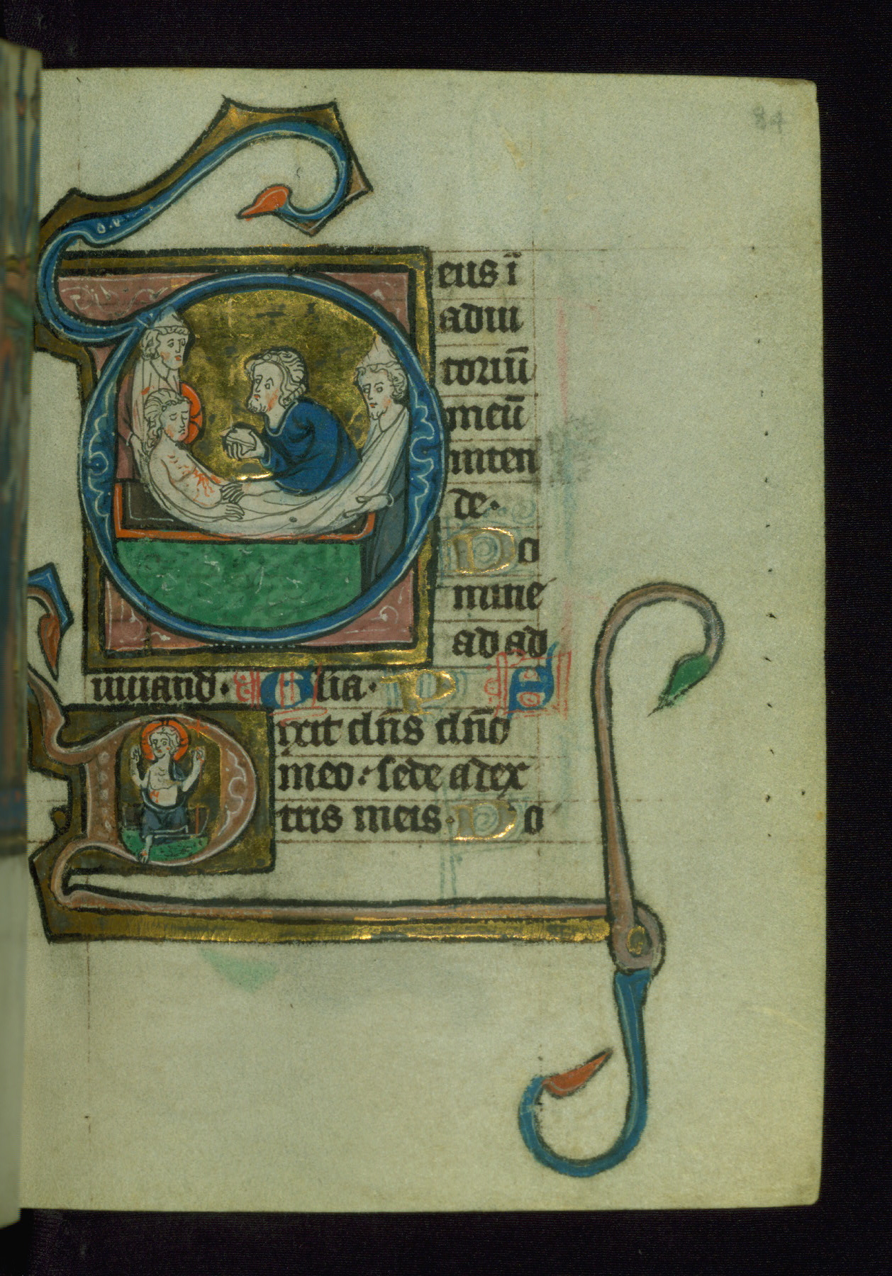 - Decoration note: Full-page miniature and facing large historiated initial lacking after fol. 12, and full-page miniature lacking after fol. 62; full-page miniatures fols. 32v, 48v, 69v, 76v, 83v, and 92v; large historiated initials fols. 33r, 49r, 63r, 70r, 77r, 84r, and 93r; small historiated initials fols. 13r, 14r, 15r-v, 18r, 19r, 20r, 21r, 22r, 23r, 24v, 26r, 27v, 28v, 29v, 30v, 33v, 35r, 36r, 37r, 39r, 40v, 41v, 42r-v, 43r, 44v, 45v, 46r-v, 47r-v, 48r, 49r-v, 50v, 51r, 52r, 53r-v, 58r, 60v, 62r, 63r-v, 64v, 65r, 66r, 67r-v, 68v, 69r, 79r-v, 71v, 72r, 73r, 74v, 75v, 76r, 77r-v, 78v, 79r, 80r-v, 81v, 82v, 83r, 84r, 85r, 86r, 87r, 88r, 89r, 90r-v, 91v, 92r, 93r-v, 94v, 95r, 97r-v, 98r, and 99r-v