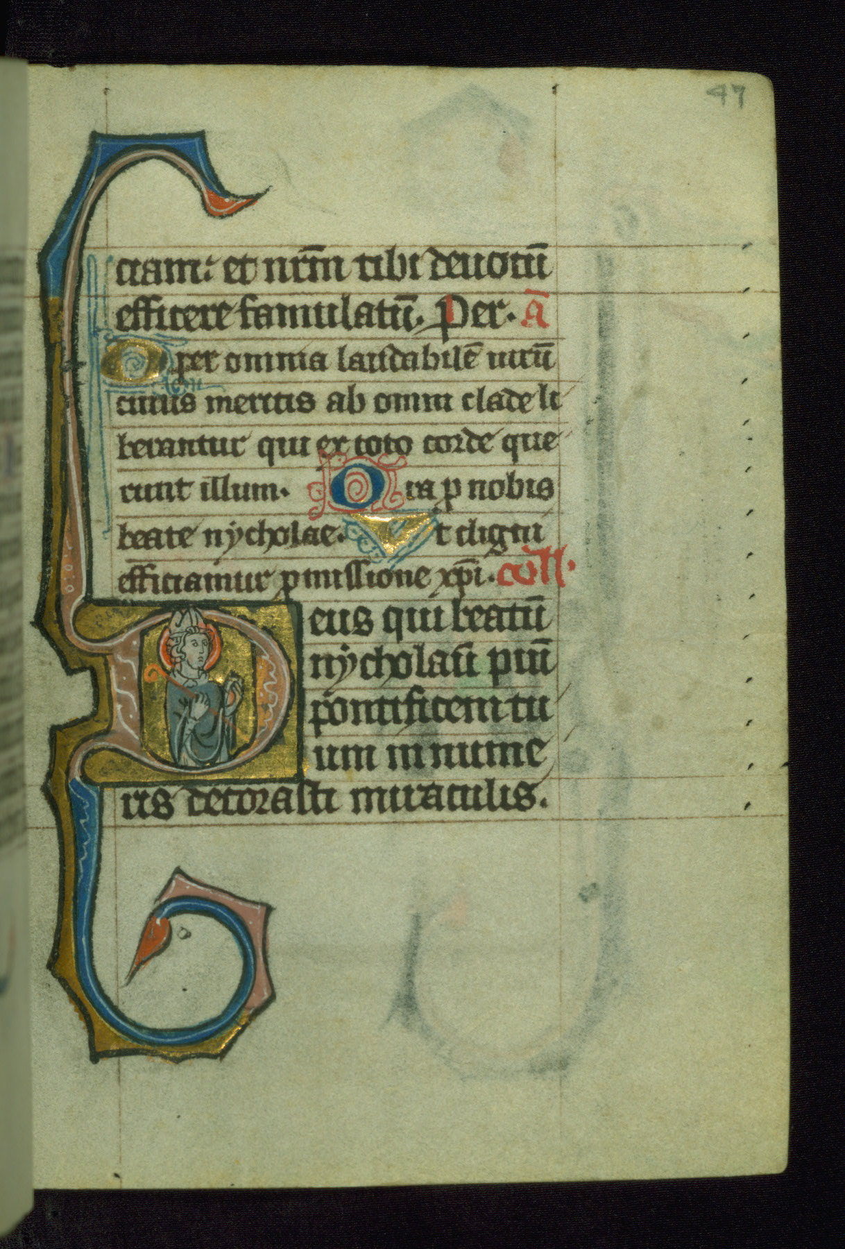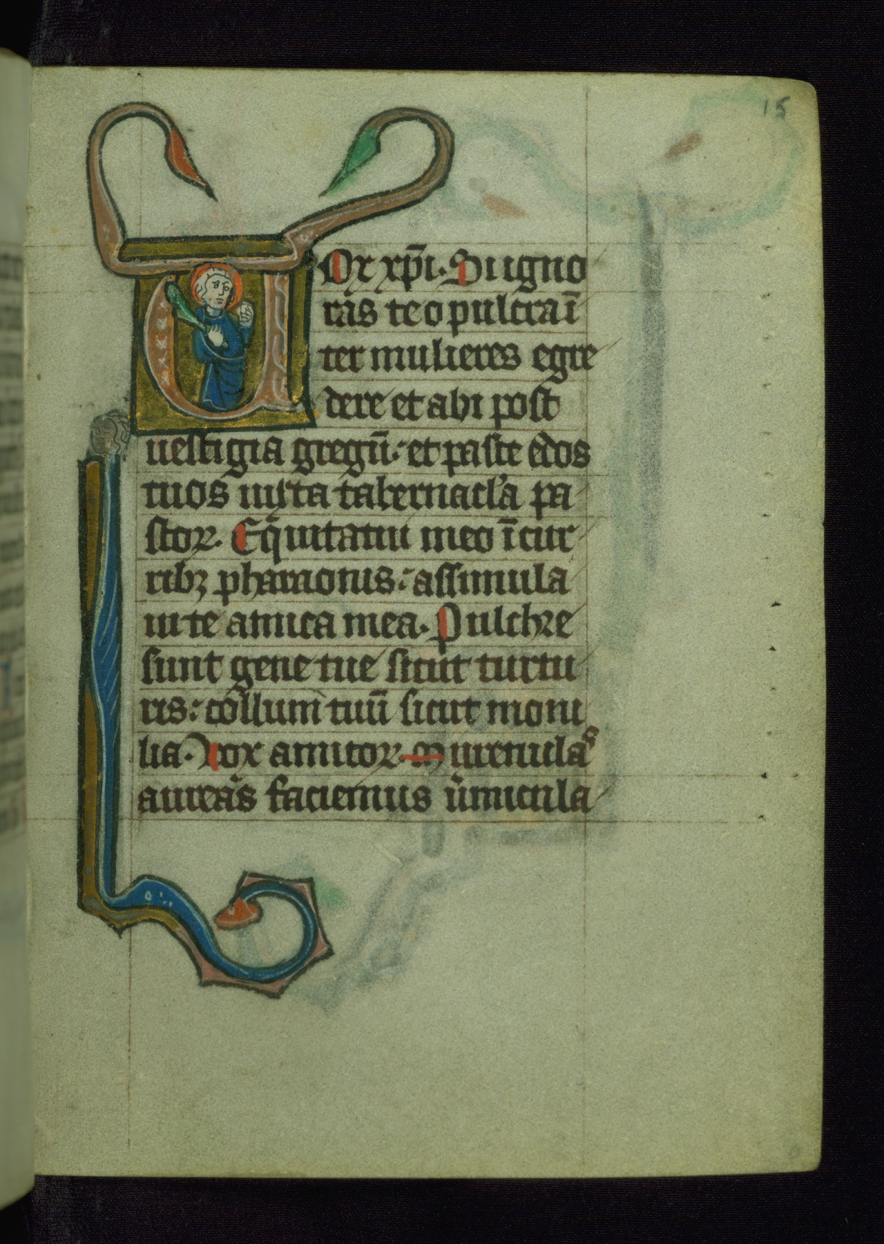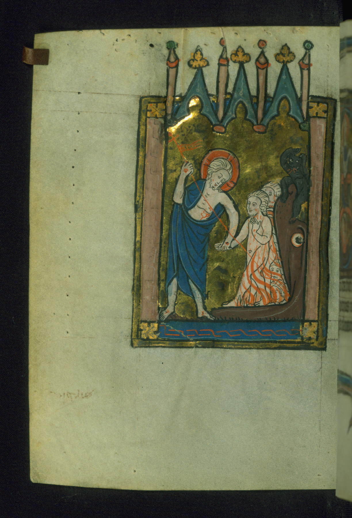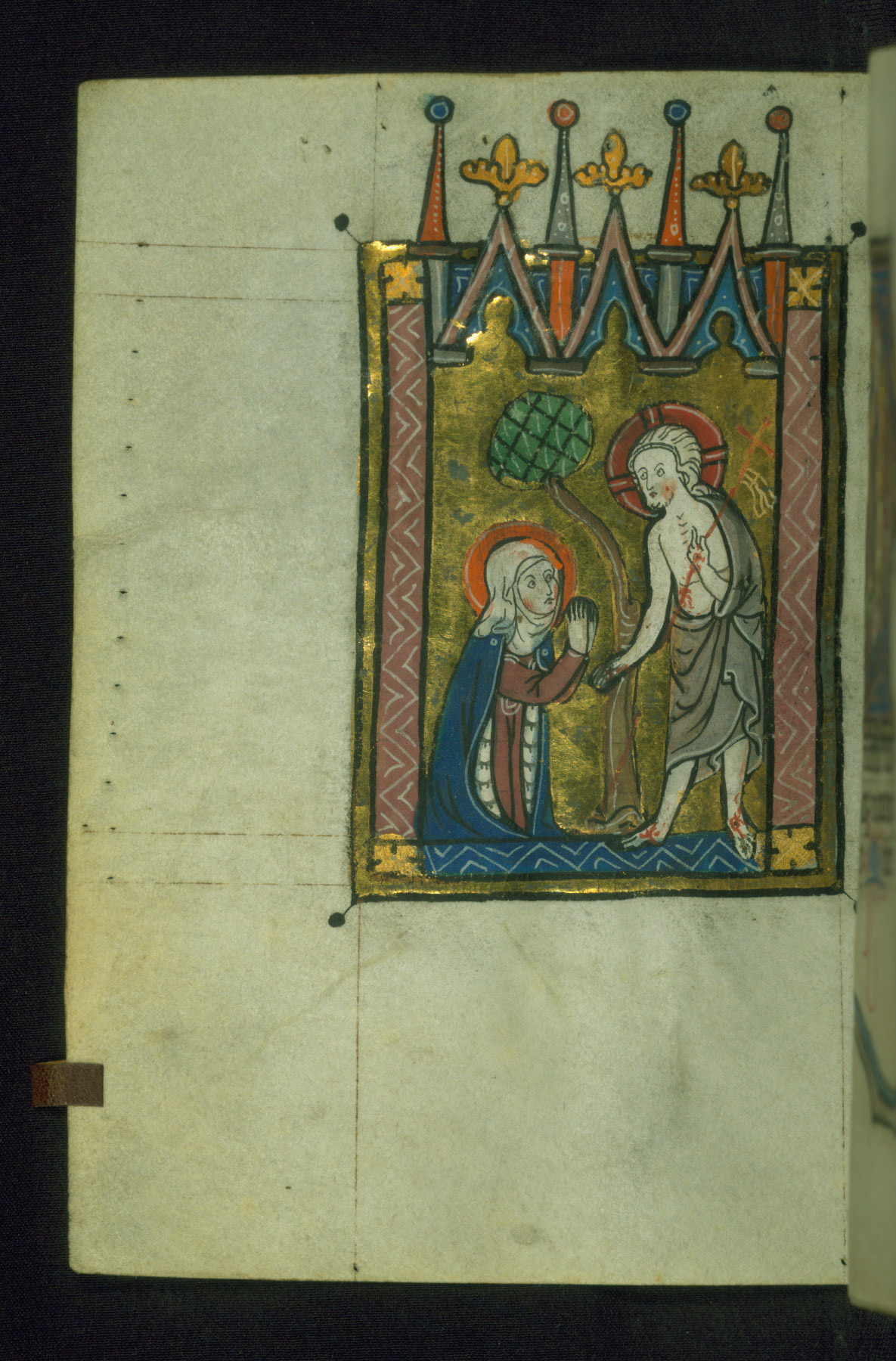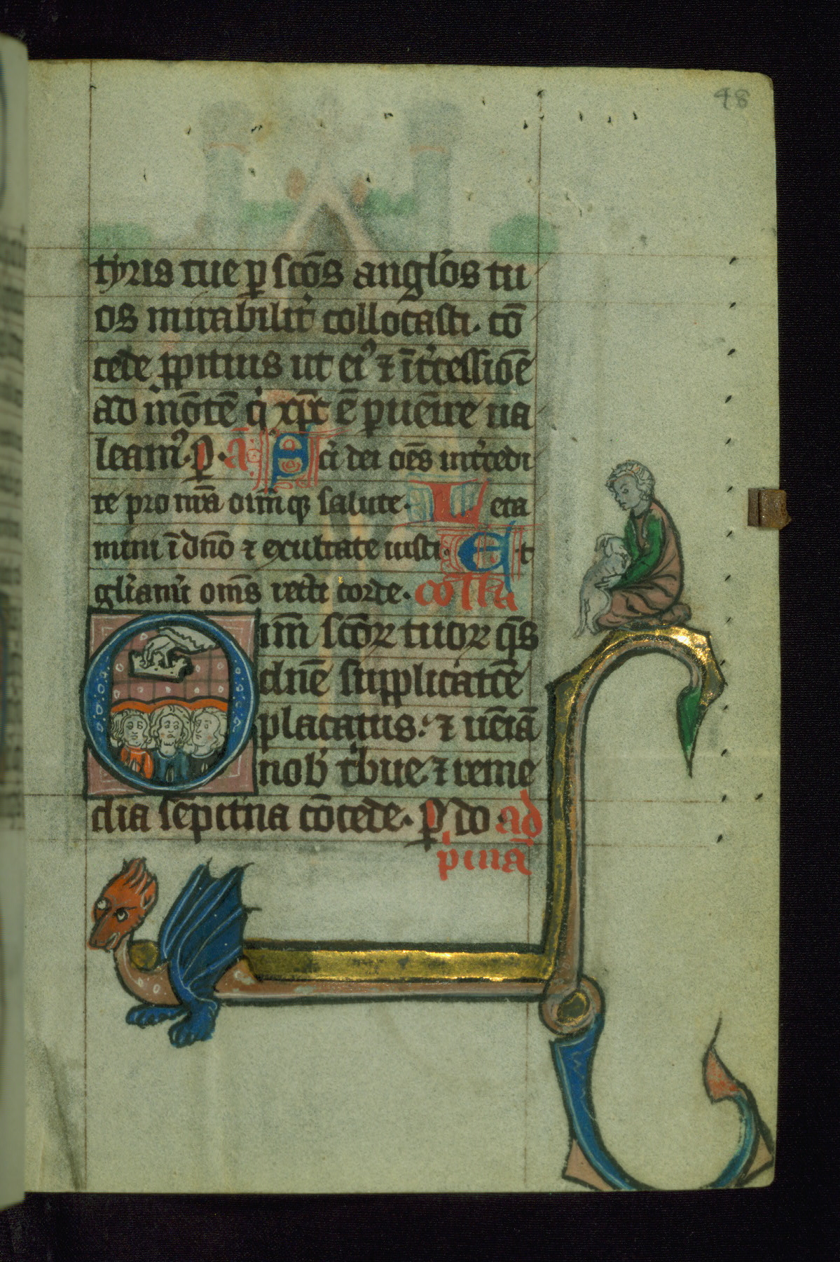- Decoration note: Full-page miniature and facing large historiated initial lacking after fol. 12, and full-page miniature lacking after fol. 62; full-page miniatures fols. 32v, 48v, 69v, 76v, 83v, and 92v; large historiated initials fols. 33r, 49r, 63r, 70r, 77r, 84r, and 93r; small historiated initials fols. 13r, 14r, 15r-v, 18r, 19r, 20r, 21r, 22r, 23r, 24v, 26r, 27v, 28v, 29v, 30v, 33v, 35r, 36r, 37r, 39r, 40v, 41v, 42r-v, 43r, 44v, 45v, 46r-v, 47r-v, 48r, 49r-v, 50v, 51r, 52r, 53r-v, 58r, 60v, 62r, 63r-v, 64v, 65r, 66r, 67r-v, 68v, 69r, 79r-v, 71v, 72r, 73r, 74v, 75v, 76r, 77r-v, 78v, 79r, 80r-v, 81v, 82v, 83r, 84r, 85r, 86r, 87r, 88r, 89r, 90r-v, 91v, 92r, 93r-v, 94v, 95r, 97r-v, 98r, and 99r-v