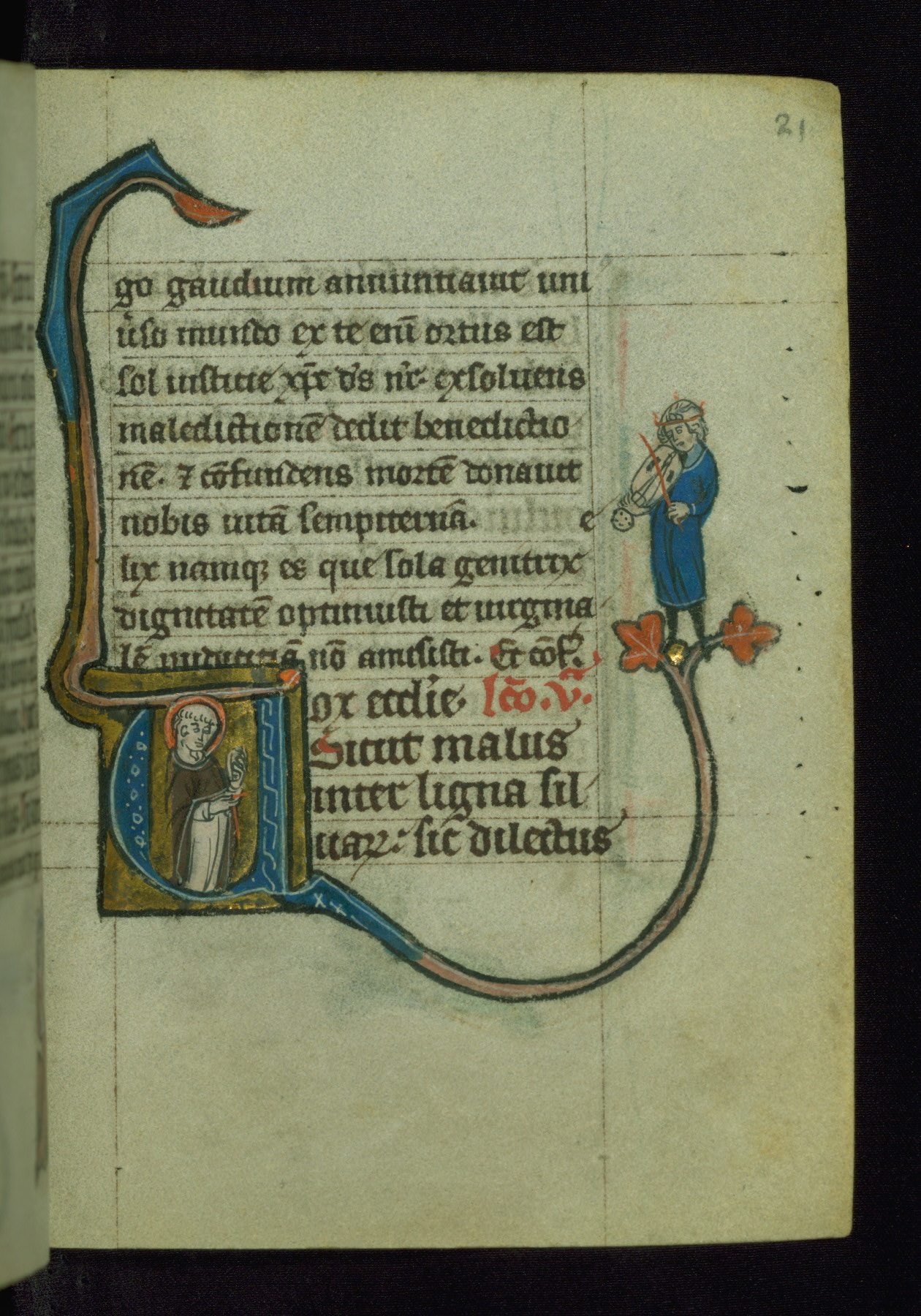 - Title: Above: Initial "P" with main pointing at hand; Below: Initial "L" with saint playing vielle