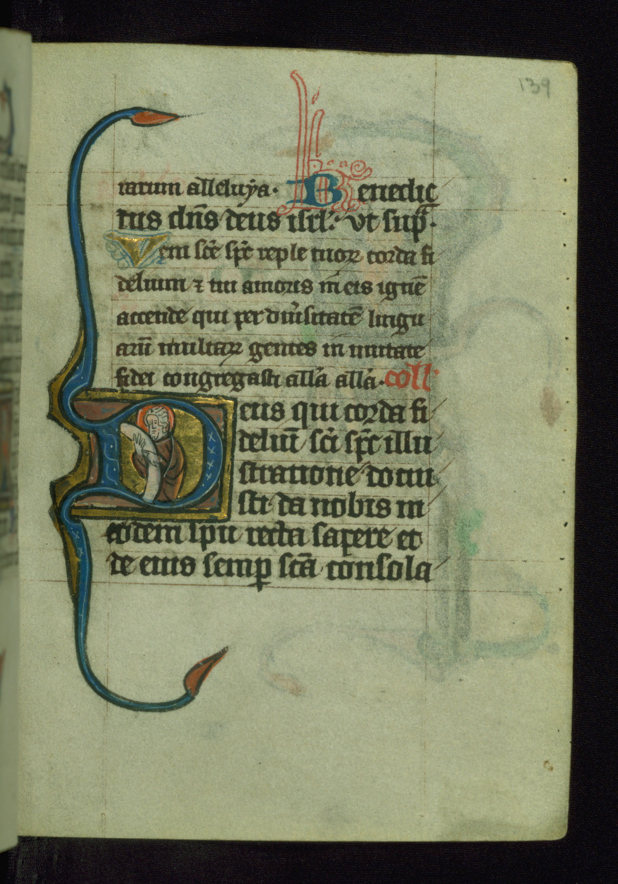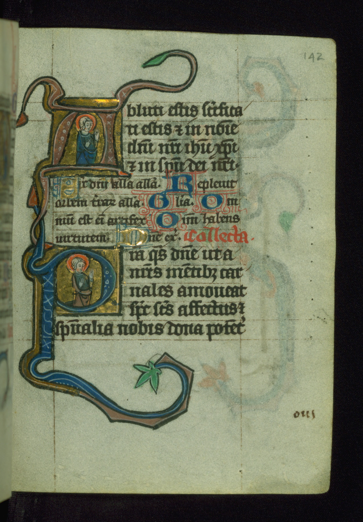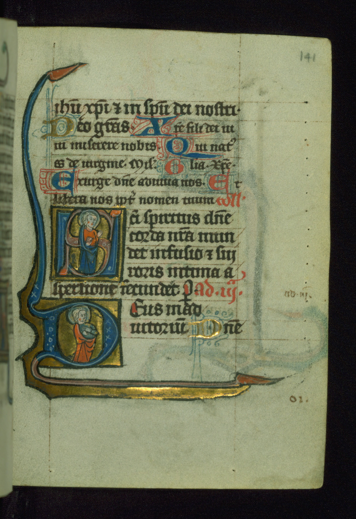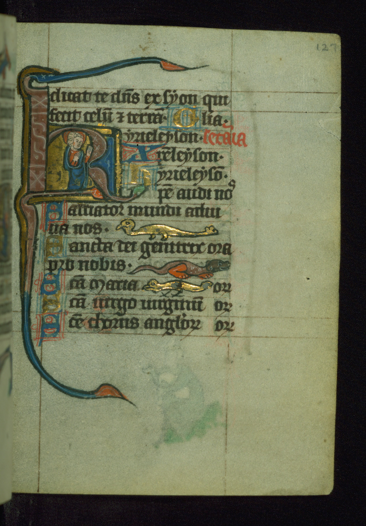 - Contents: Page missing after fol. 128; fols. 127r-129r: litany; fols. 129r-130v: petitions and invocations; fols. 130v-132r: invocations; fols. 132r-134r: four collects; list of confessors and virgins now incomplete with loss of folio after fol. 128; sixteen apostles, from John the Baptist to Luke; thirteen martyrs, which include Lambert, Adalbert, Mengold (connected to Huy), Urban, Dionysius, Donatus, and Romanus; the first confessors listed are Silvester, Leo and Gregory; the last virgins listed are Lucy, Gertrude, Walburga, Euphrasia, Anne, Elizabeth, Mary Magdalene, Mary of Egypt