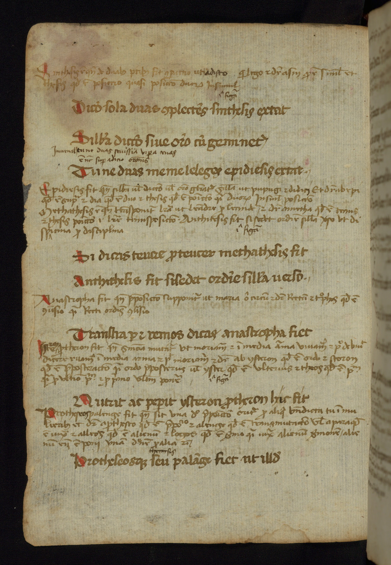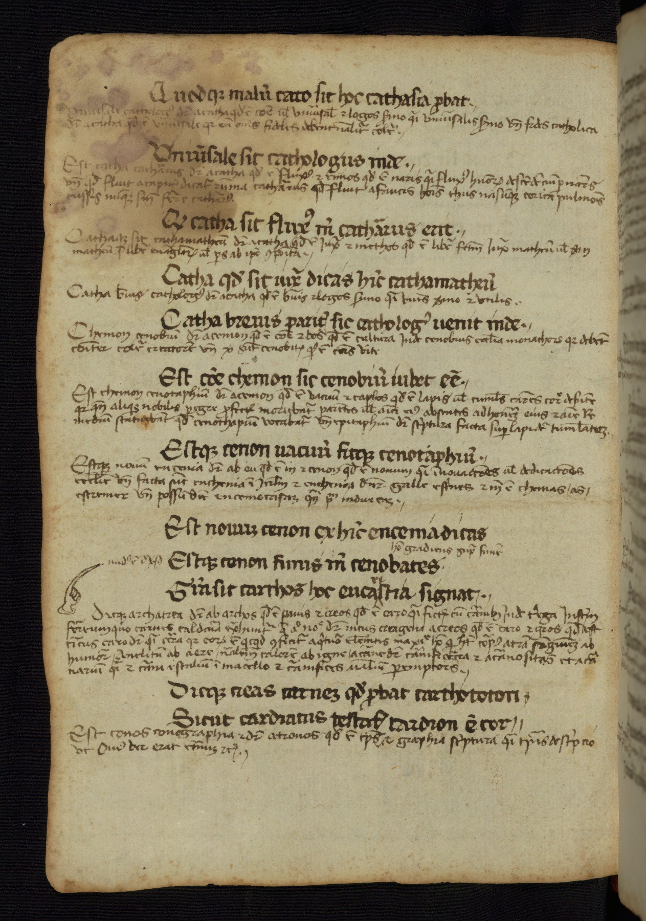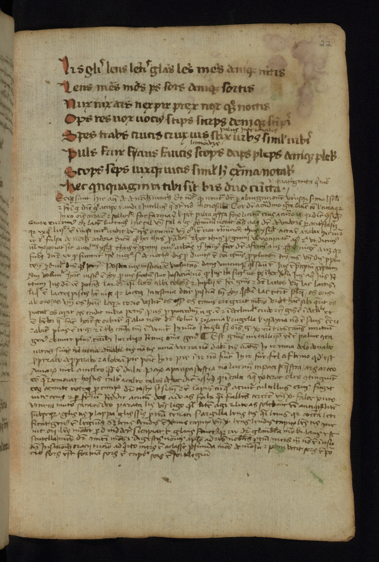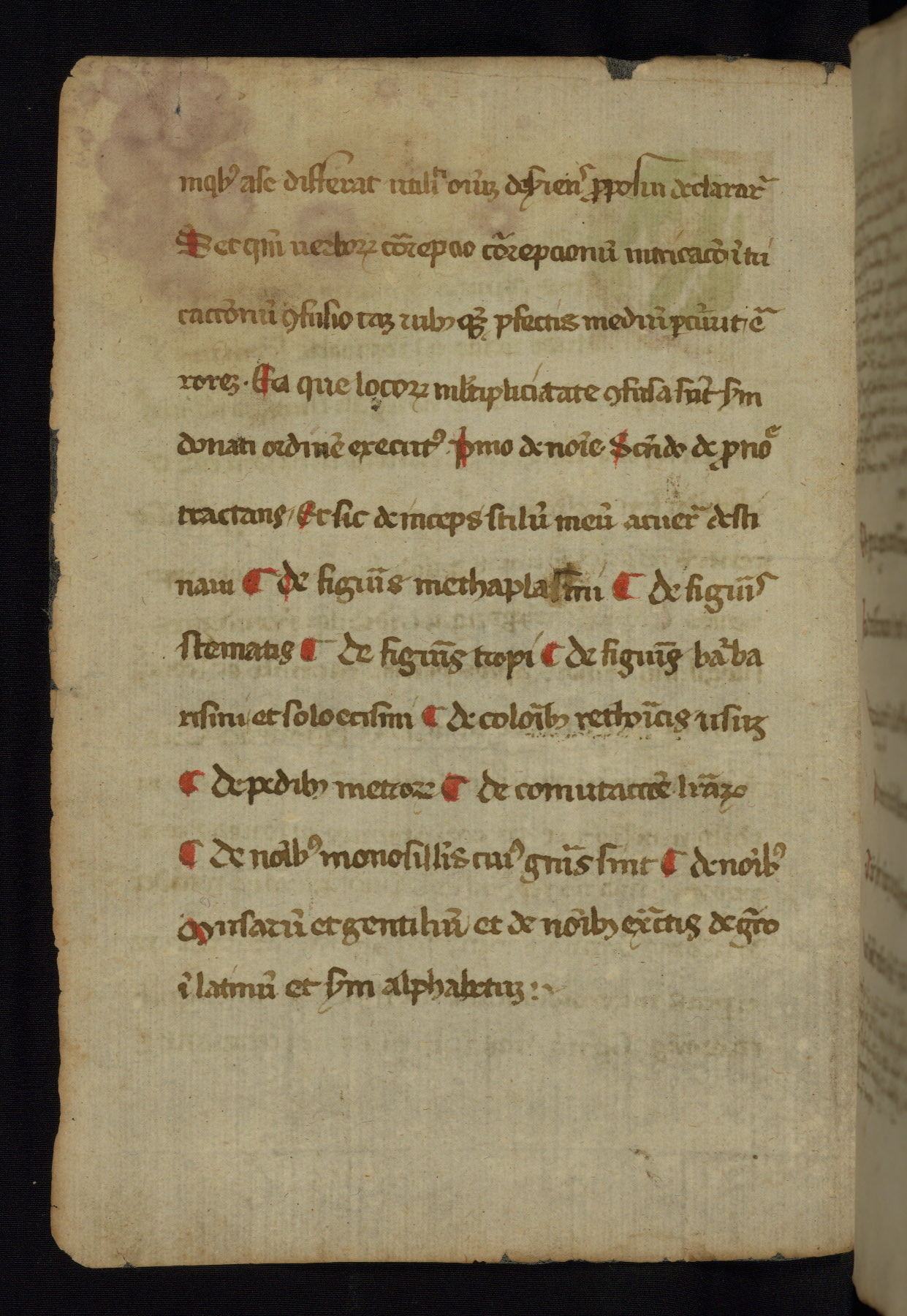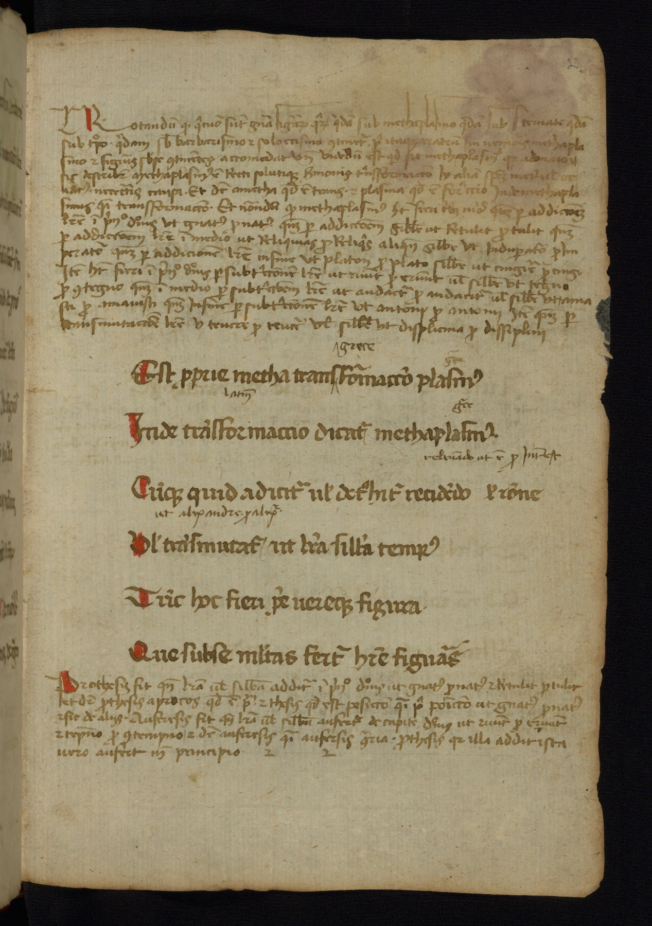 This German manuscript is a copy of Eberhard of Béthune's thirteenth-century grammatical poem Graecismus. The poem is accompanied by an extensive gloss by Jean-Vincent Metulin, a scholar from southern France. Having functioned as a textbook, the manuscript's condition suggests it was well-used by students eager to memorize and comprehend Béthune's ideas on the grammatical usage of Greek words.