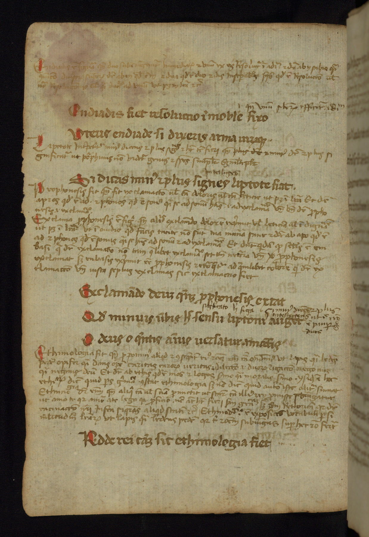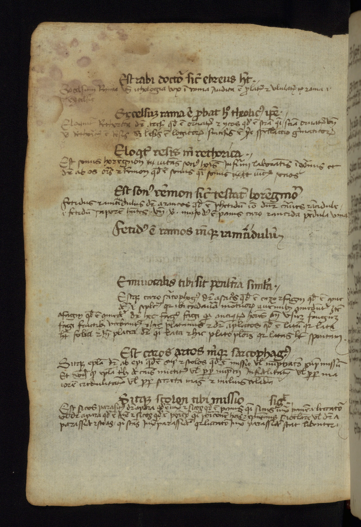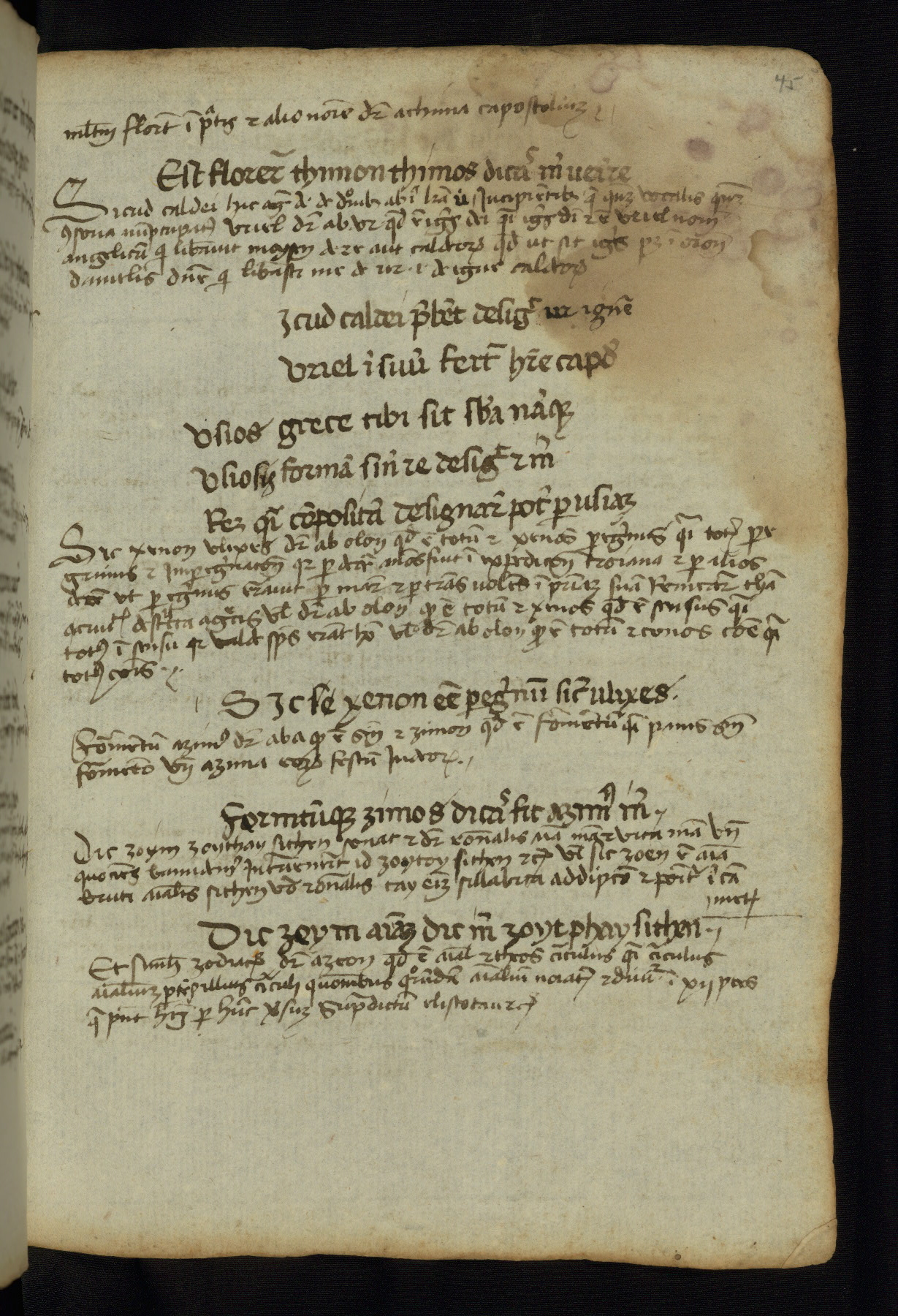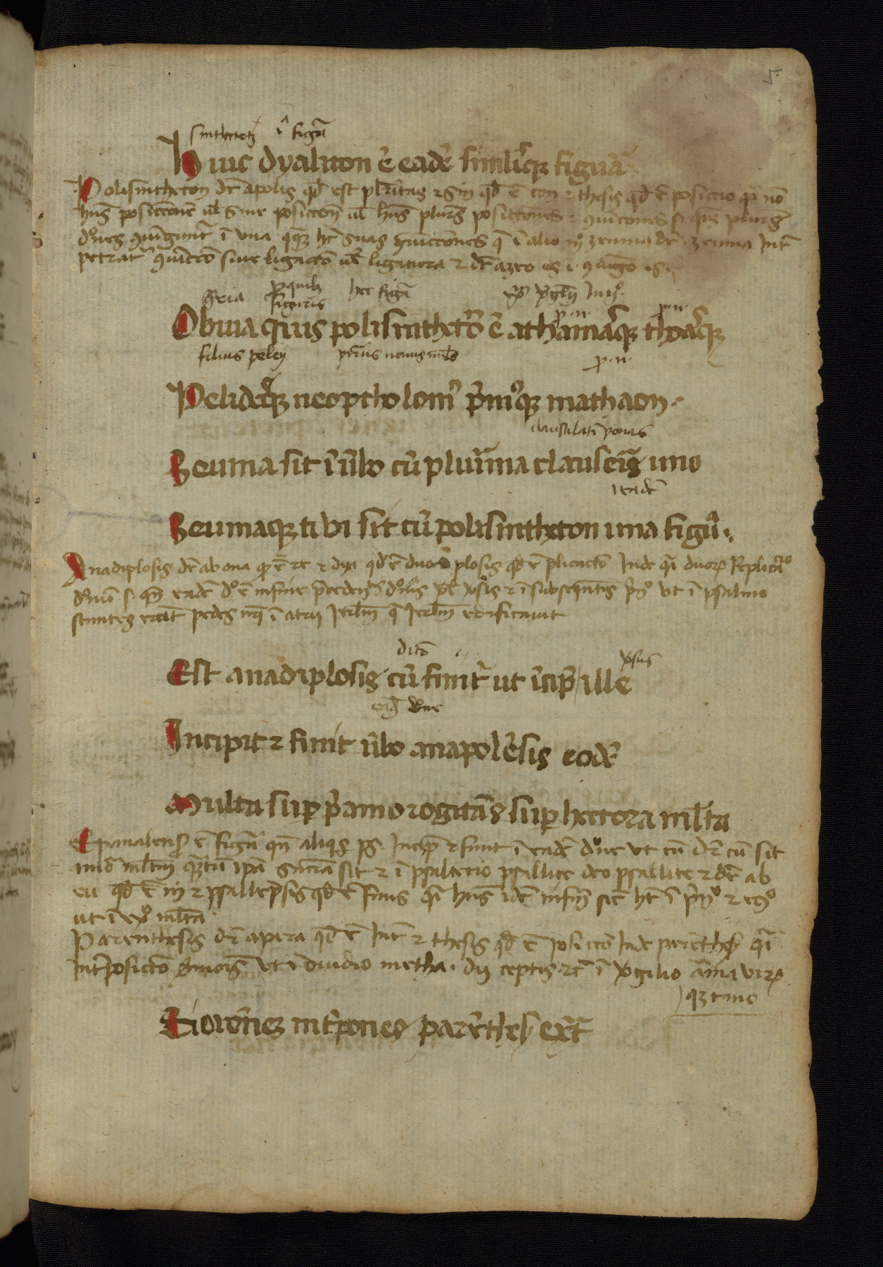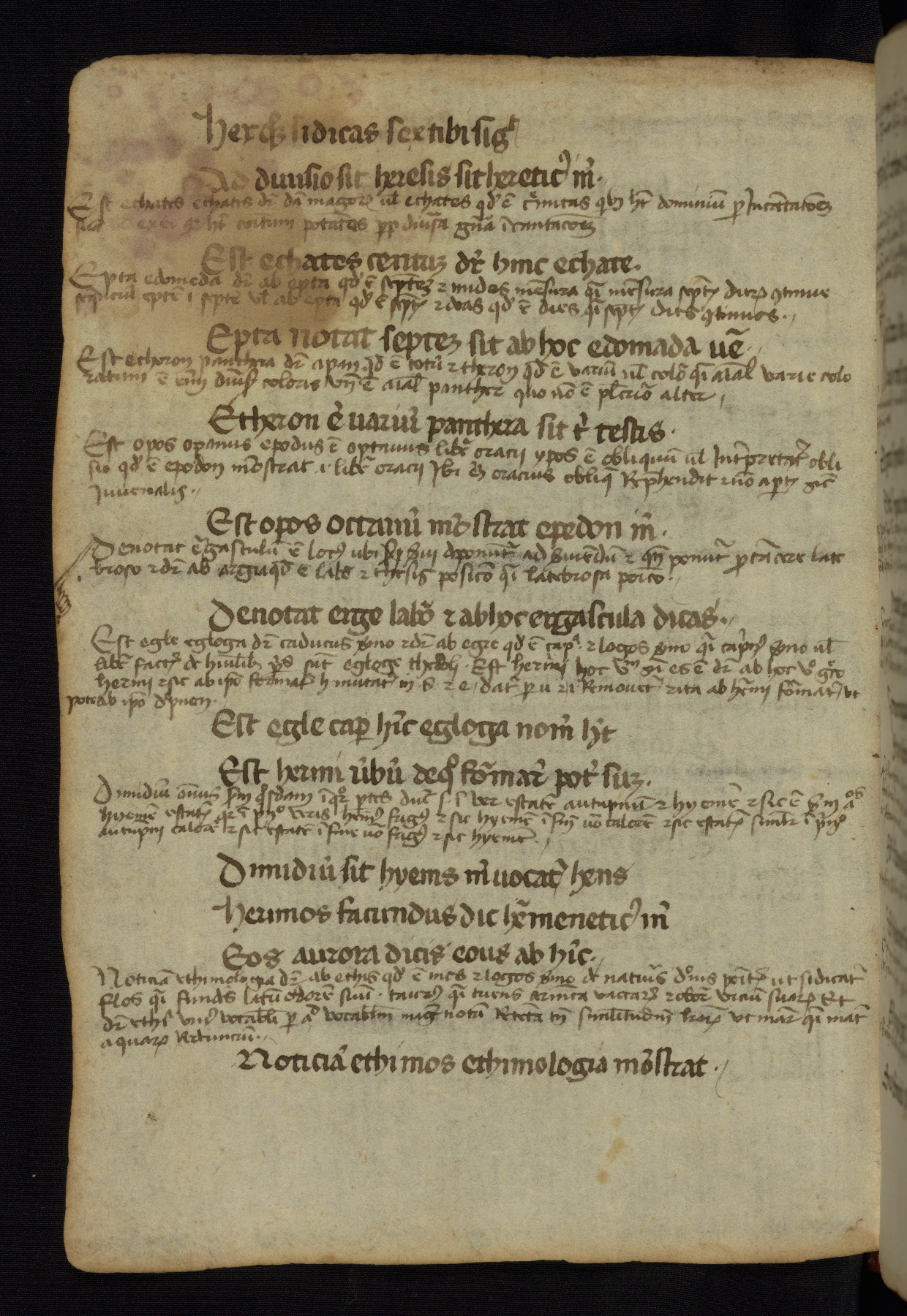 This German manuscript is a copy of Eberhard of Béthune's thirteenth-century grammatical poem Graecismus. The poem is accompanied by an extensive gloss by Jean-Vincent Metulin, a scholar from southern France. Having functioned as a textbook, the manuscript's condition suggests it was well-used by students eager to memorize and comprehend Béthune's ideas on the grammatical usage of Greek words.