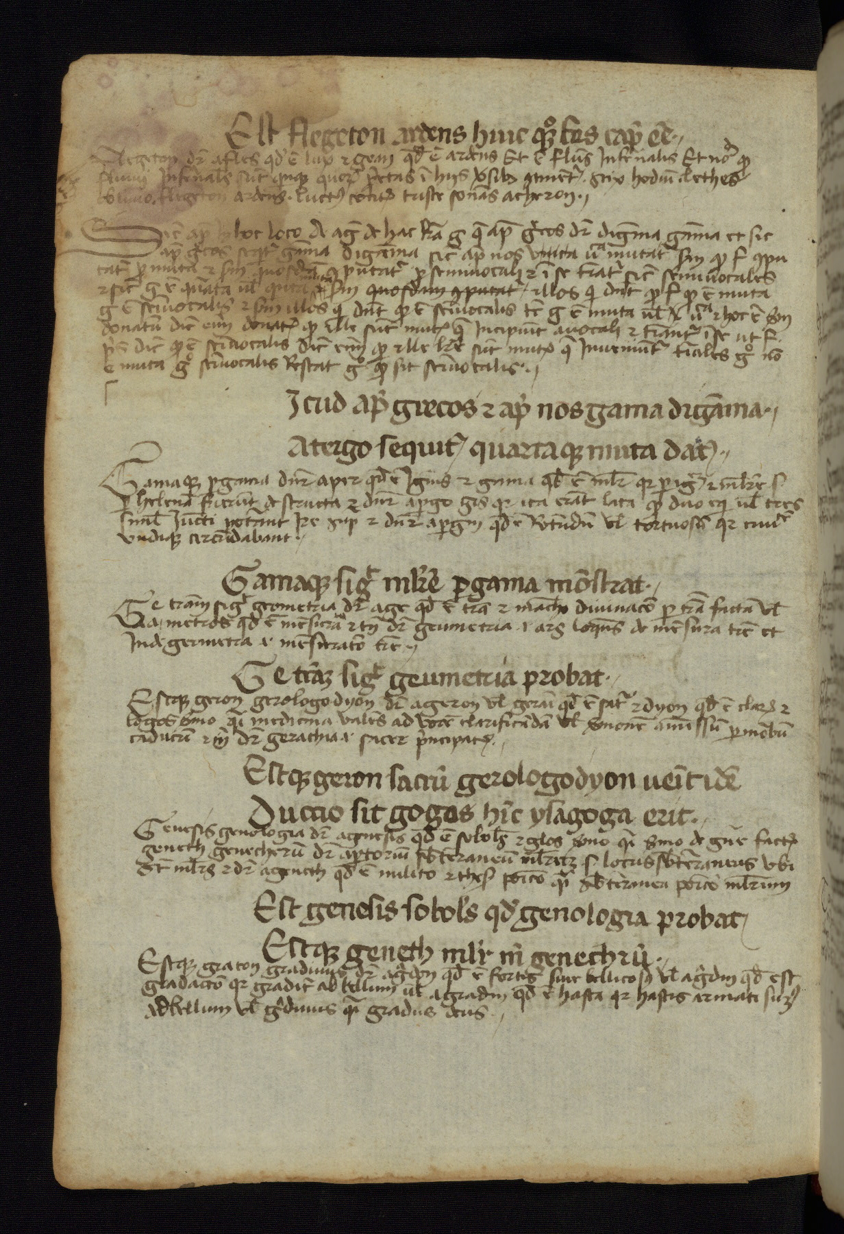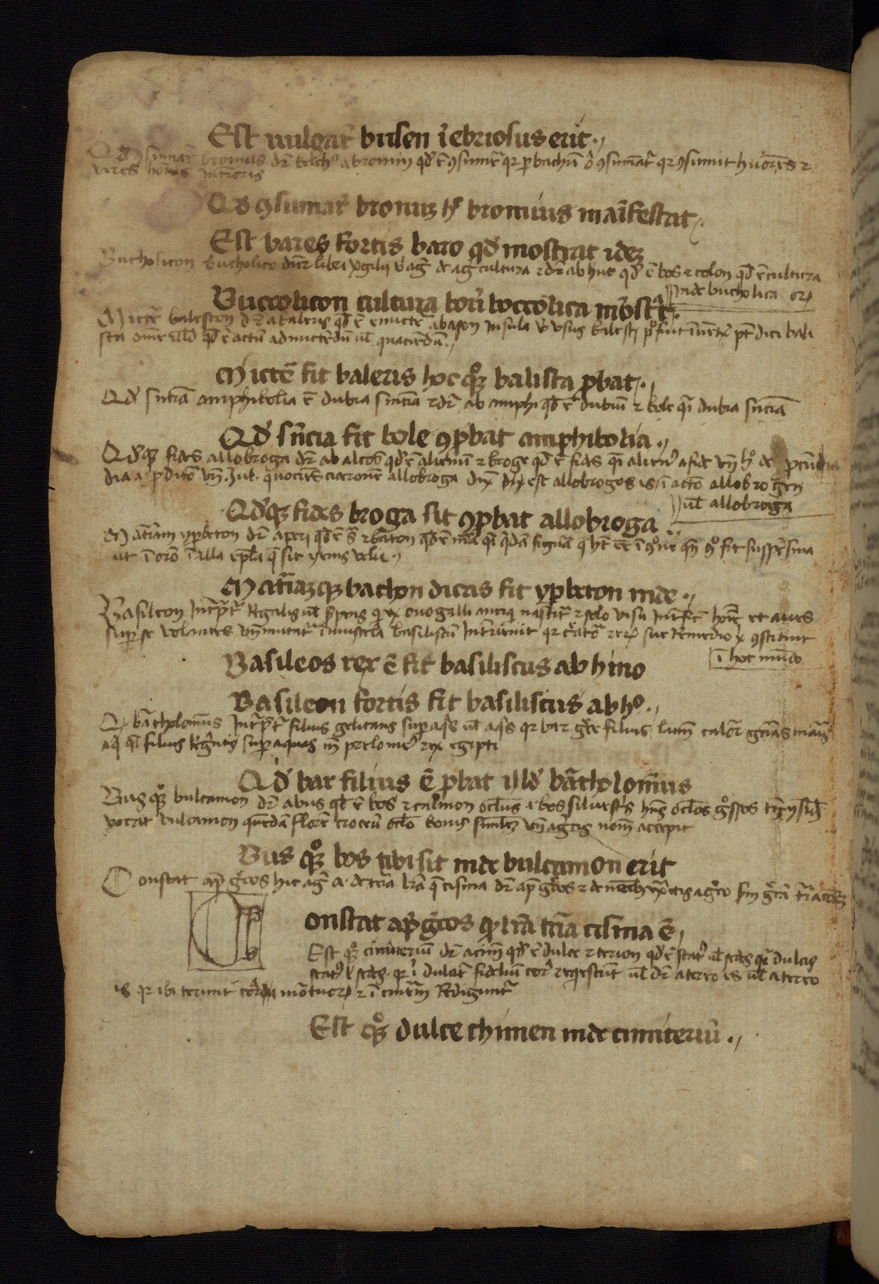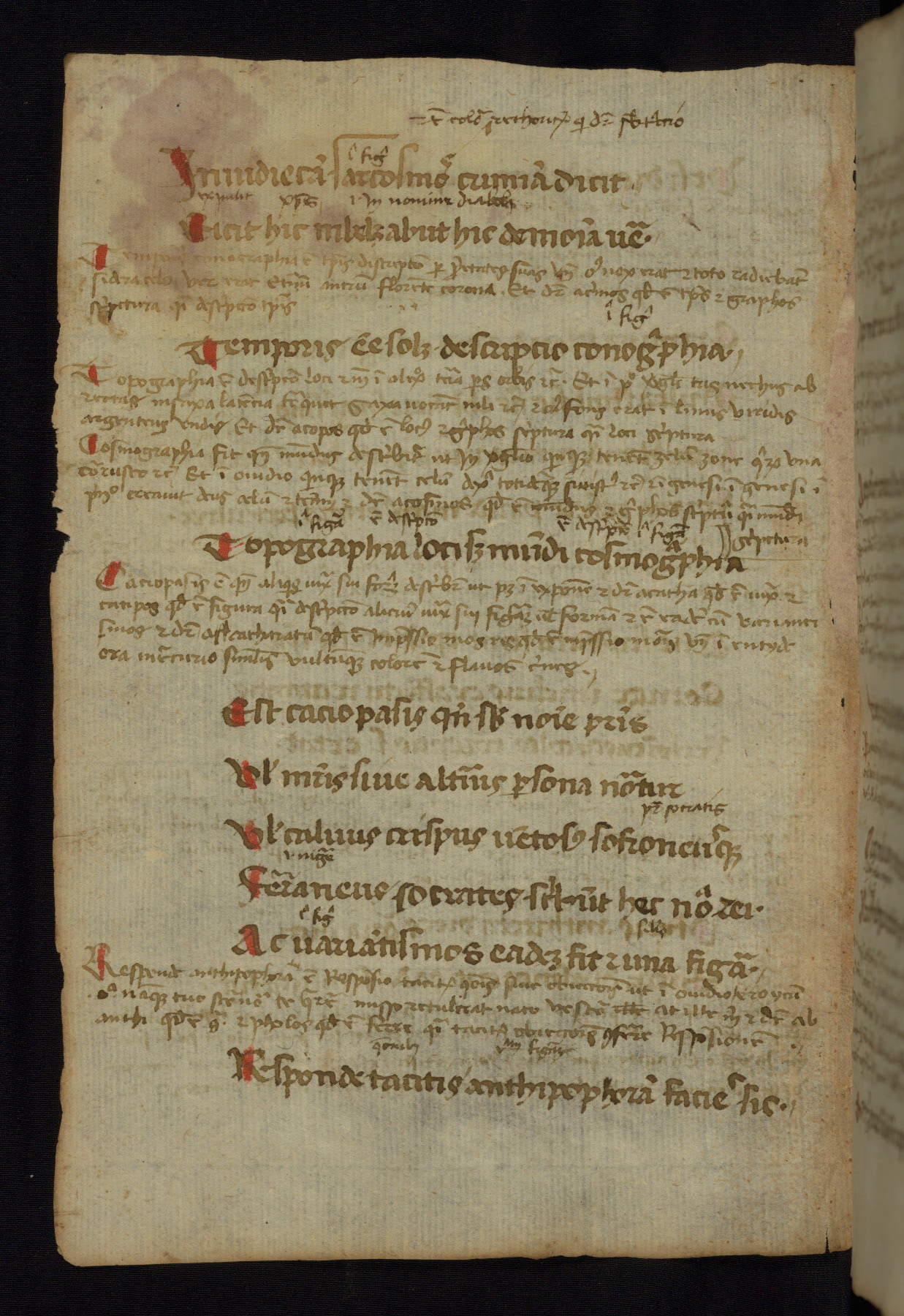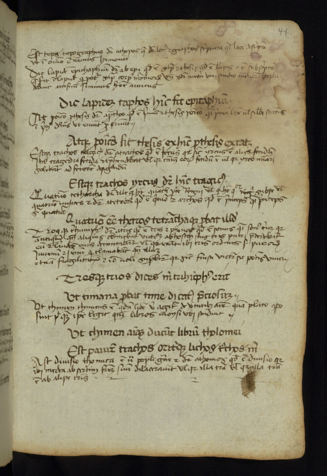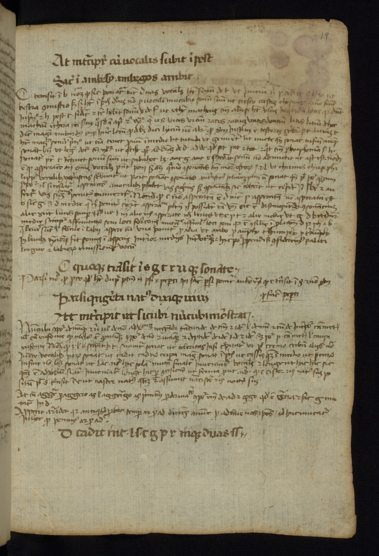 This German manuscript is a copy of Eberhard of Béthune's thirteenth-century grammatical poem Graecismus. The poem is accompanied by an extensive gloss by Jean-Vincent Metulin, a scholar from southern France. Having functioned as a textbook, the manuscript's condition suggests it was well-used by students eager to memorize and comprehend Béthune's ideas on the grammatical usage of Greek words.