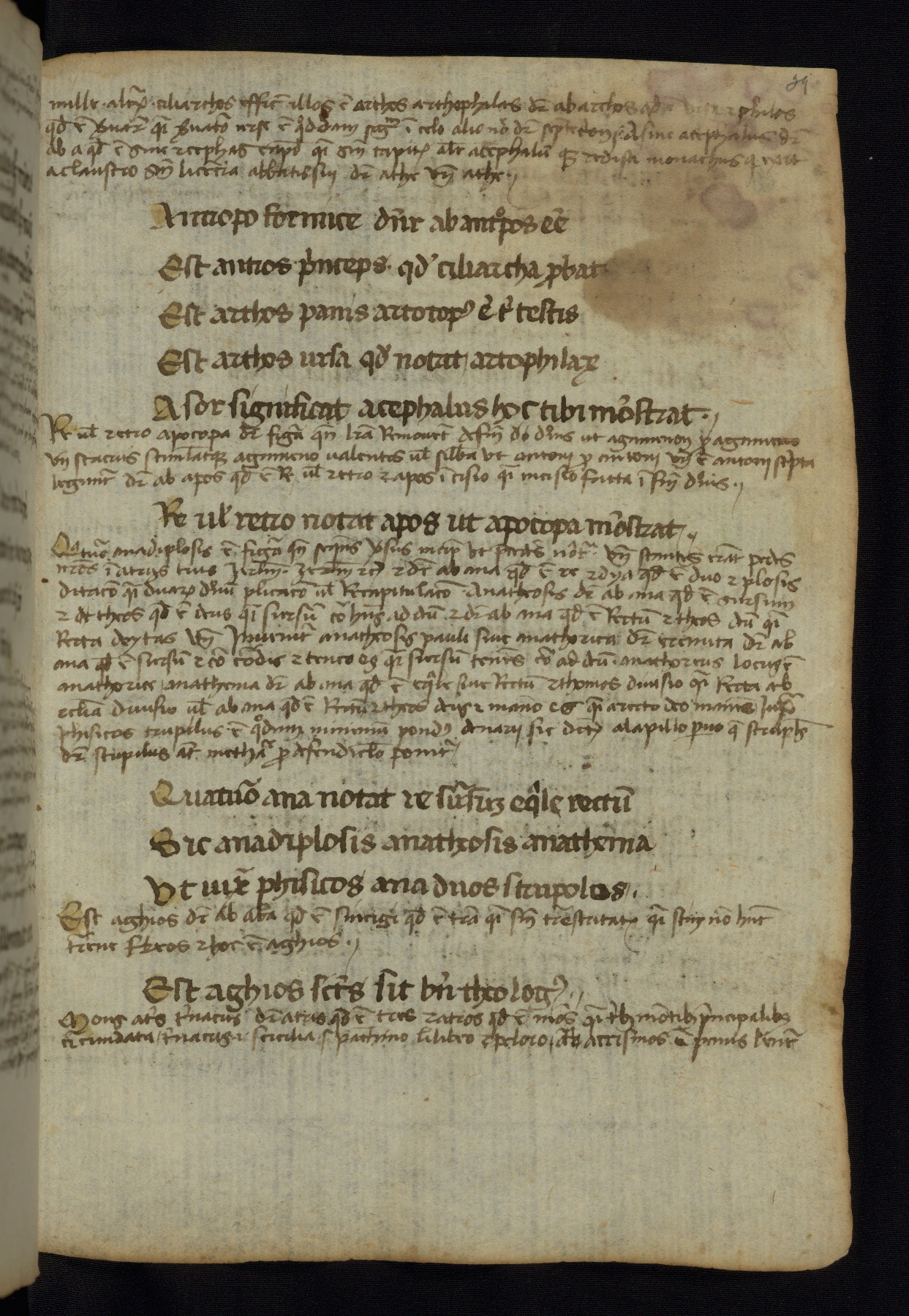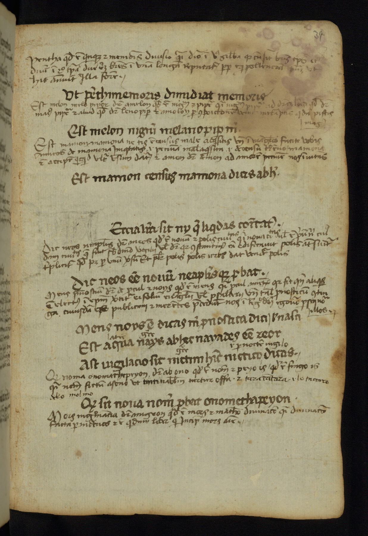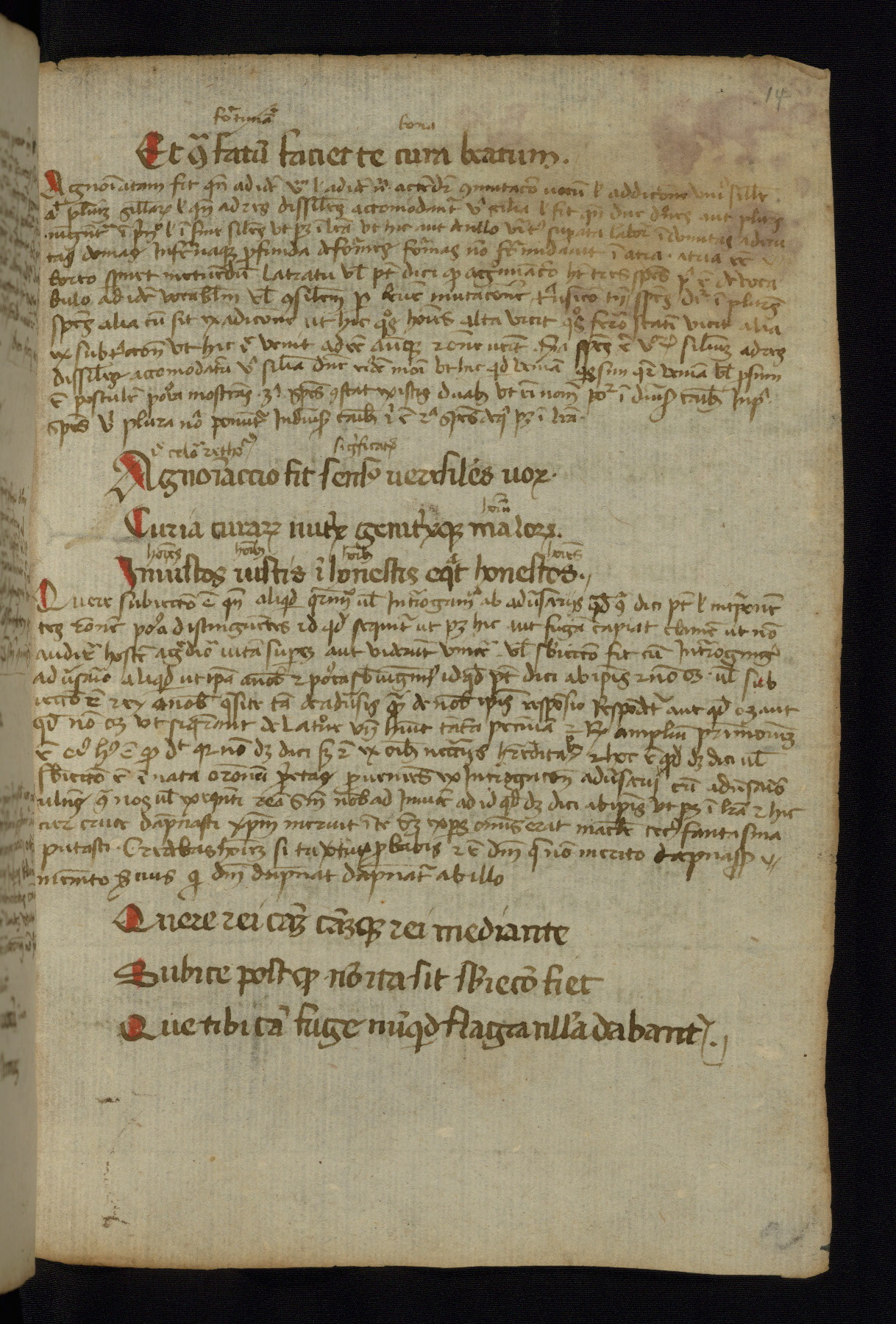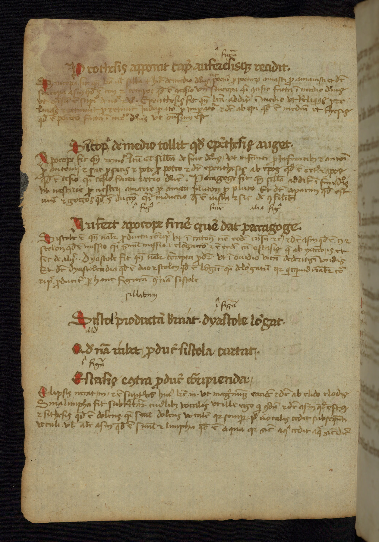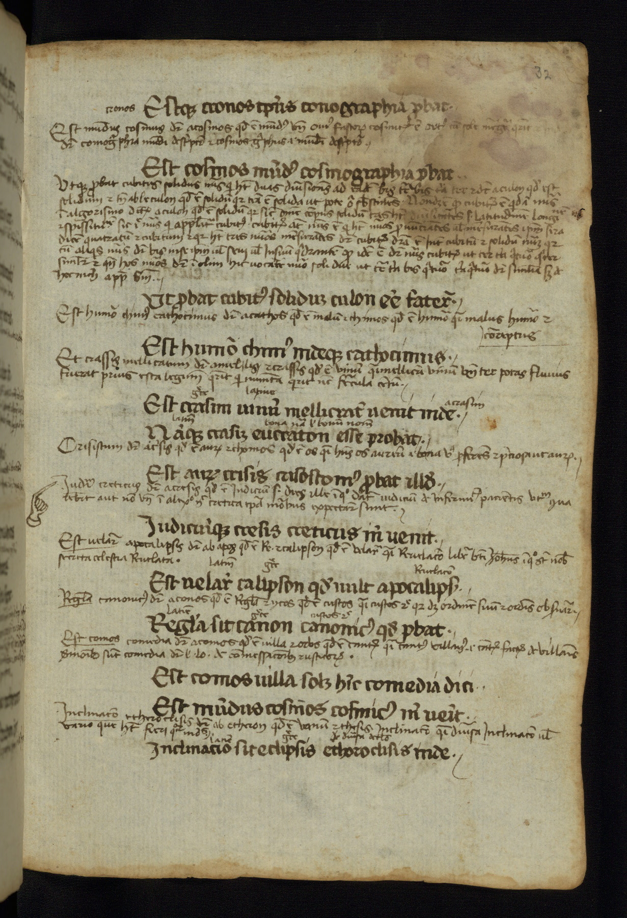This German manuscript is a copy of Eberhard of Béthune's thirteenth-century grammatical poem Graecismus. The poem is accompanied by an extensive gloss by Jean-Vincent Metulin, a scholar from southern France. Having functioned as a textbook, the manuscript's condition suggests it was well-used by students eager to memorize and comprehend Béthune's ideas on the grammatical usage of Greek words.
